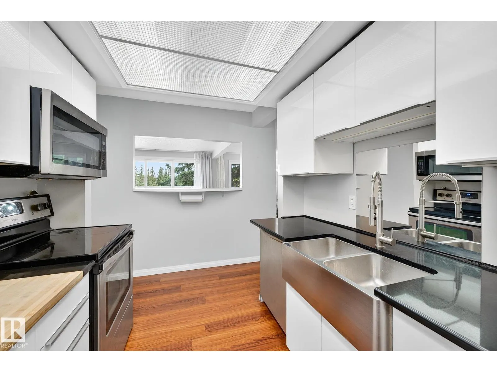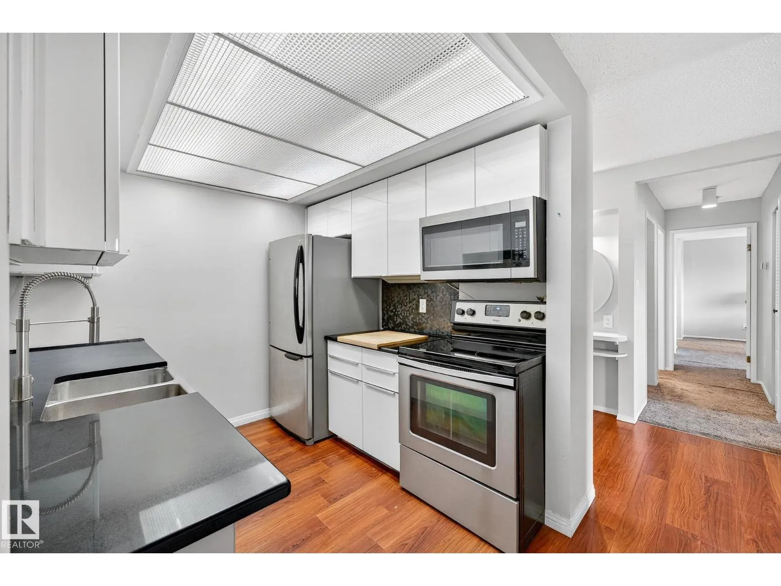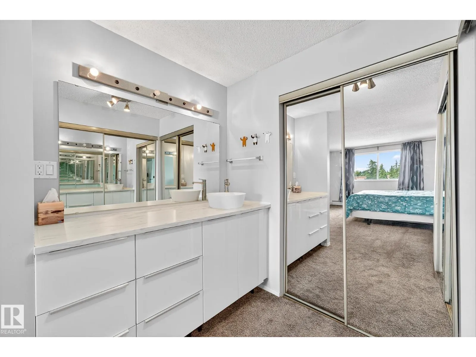 Step into this updated 2-bedroom condo, styled with neutral decor & thoughtful details throughout. The bright, functional kitchen offers stainless steel appliances, quartz countertops, & a sleek, contemporary design. Just off the kitchen is the dining area. The spacious living room boasts updated windows & sliding doors that open to a large balcony. Down the hall, the generous primary bedroom includes a refreshed 2pce ensuite with ample drawer space & double closets with mirrored sliding doors. A 2nd bedroom with double closet & an updated 4pce main bathroom complete the layout. Addt'l highlights include a stackable washer/dryer in a storage closet, newer windows & a well-maintained building. This building offers an indoor pool, hot tub, sauna, gym, party room & deck. Great layout, excellent location, & desirable building amenities - this condo is perfect for students & professionals alike. It is located steps from the Whitemud Creek Ravine, close to the Snow Valley Ski Club, golf, & endless amenities. (id:27476)