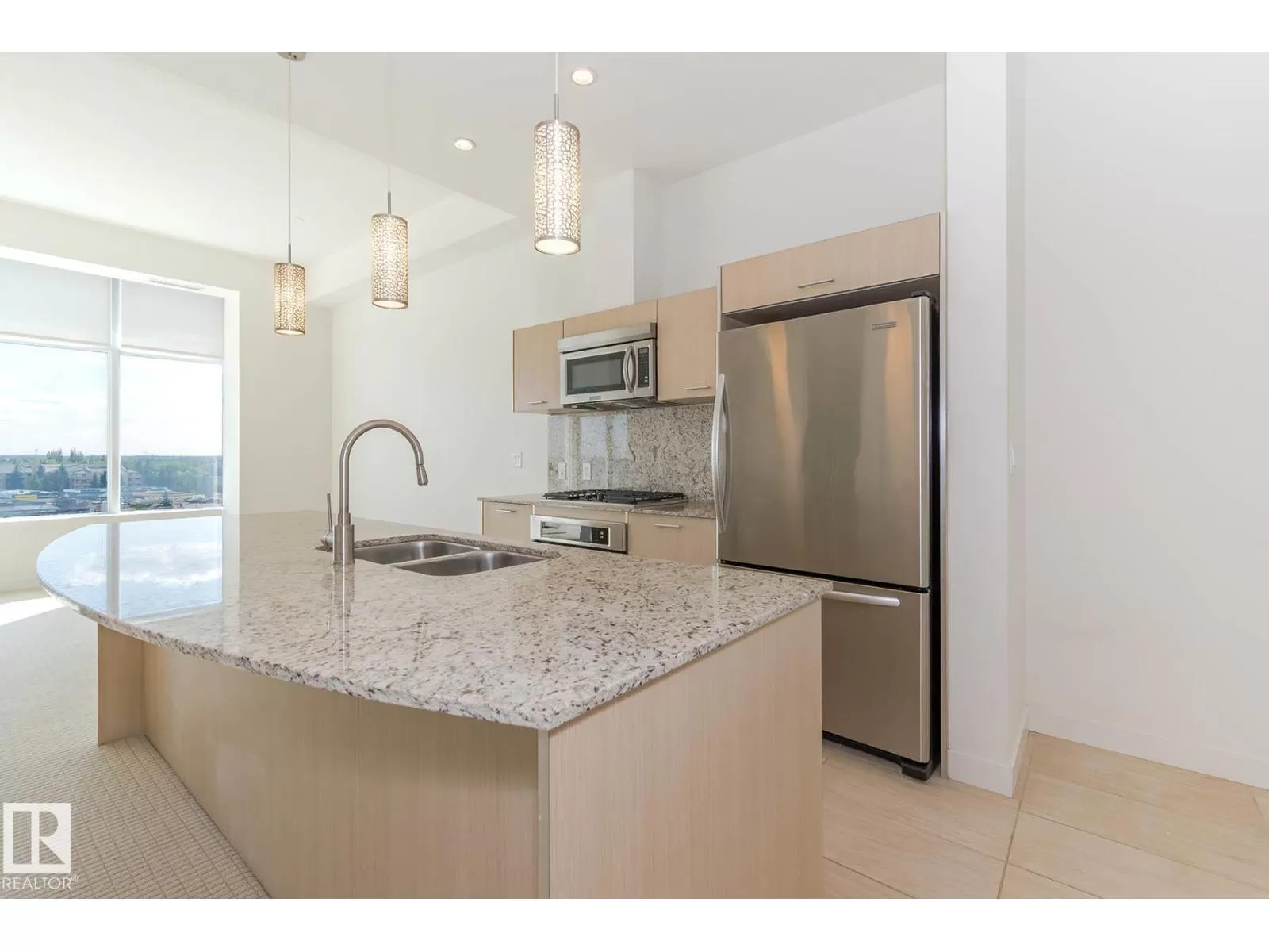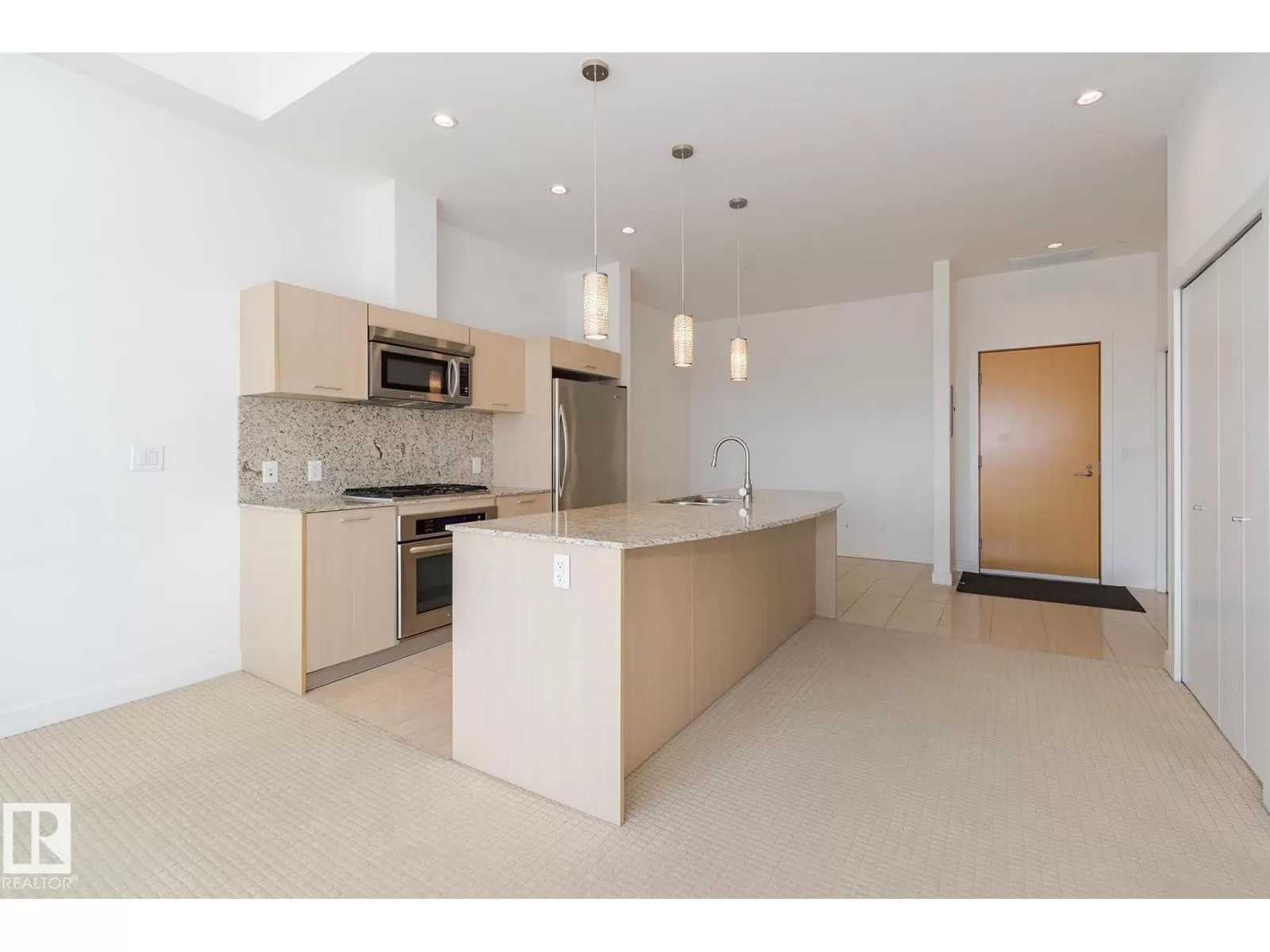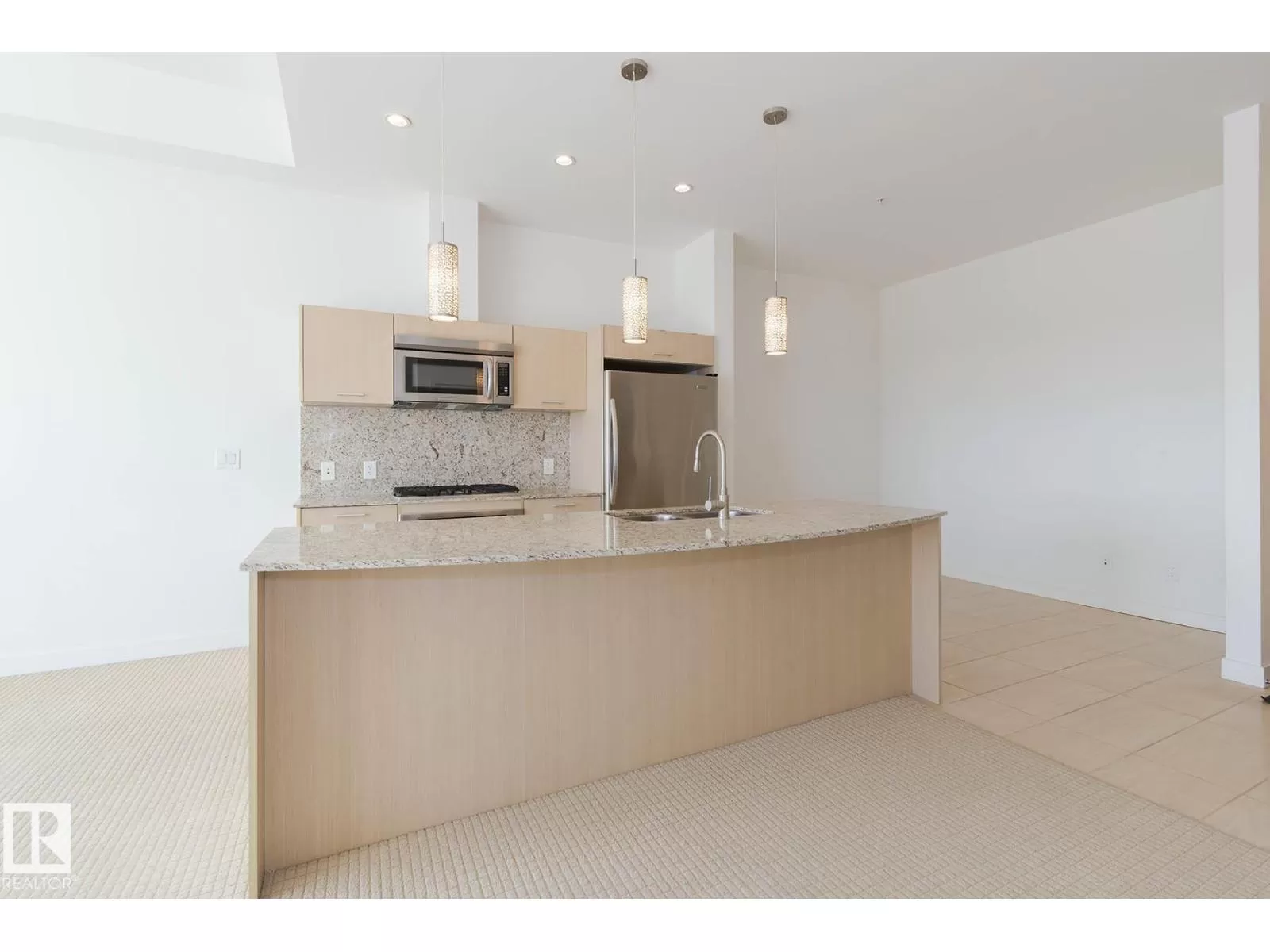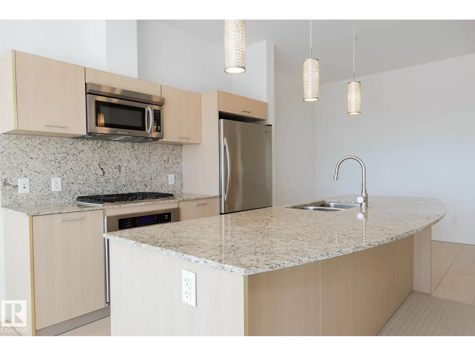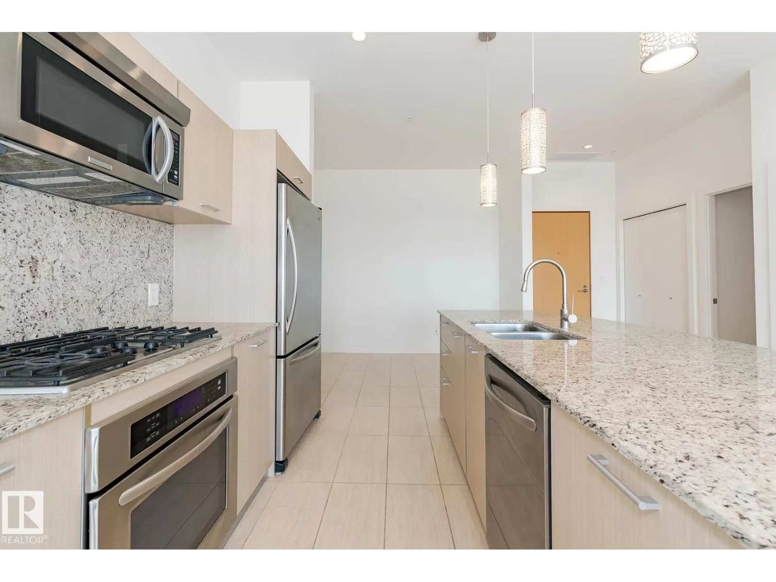 Welcome to One at Century Park, where luxury, comfort, & convenience come together in this stunning top-floor one-bedroom condo located in the sought after south tower. Bathed in natural light from large south facing windows, this home feels airy & spacious with its soaring high ceilings & open concept design. The modern kitchen features light wood cabinetry, granite countertops, stainless steel appliances, & an island with curved seating, perfectly complemented by a generous dining area. The large living room offers plenty of space to relax & enjoy the beautiful views or step out onto your private balcony to soak in the sunshine. The bedroom is well-sized, & elegant bathroom includes high-end finishes. Enjoy the convenience of in-suite laundry, titled underground parking, & a titled storage locker. The secure building features an exercise room & is ideally located close by tons of shopping, restaurants, LRT access, & Anthony Henday Drive. Perfect for professionals or downsizers alike (id:27476)