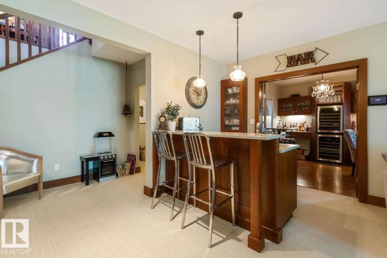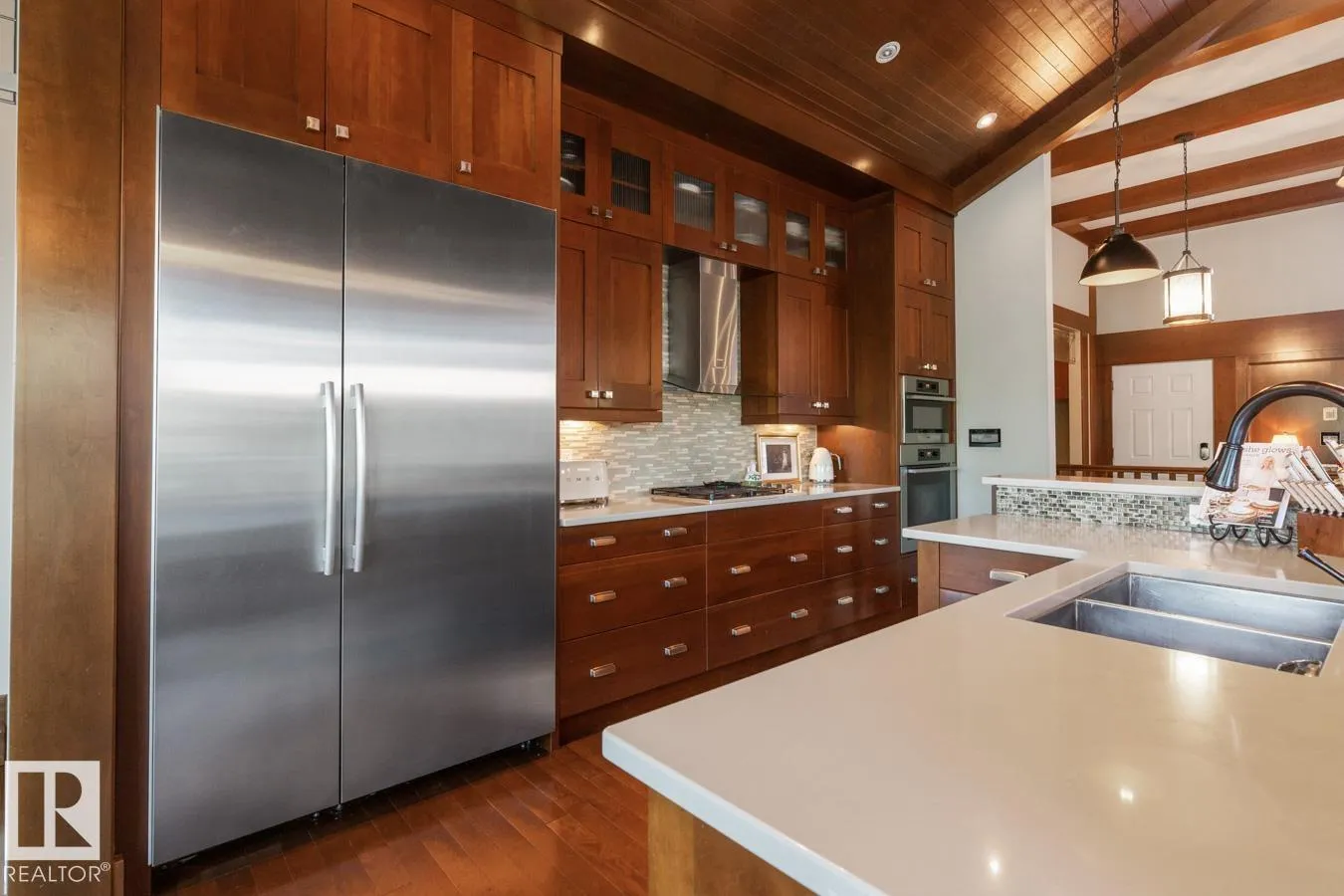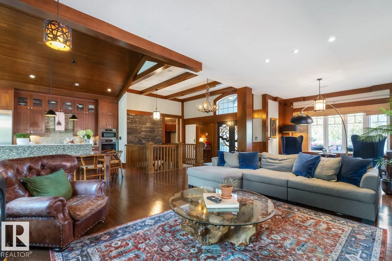 This stunning former Full House Lottery Dream Home offers luxury living in the exclusive Westpointe of Windermere, BACKING ONTO A TRANQUIL RAVINE. Built by Perry Built Homes, this WALKOUT BUNGALOW combines rustic elegance with high-end finishesâfeaturing soaring vaulted ceilings, rich wood and stone accents, and over 3,500 sqft of finished space. Inside you'll find Miele appliances, Control4 system, heated floors (basement + ensuite), a soundproofed theatre room, and a beautifully designed wine cellar. Expansive custom bifold sliding doors on both levels create seamless indoor-outdoor living. The double-sided fireplace anchors the open-concept main floor, while breathtaking landscaping enhances the front and back yards. Every detail of this home has been thoughtfully crafted for refined living and lasting enjoyment. With HardiePlank® siding, oversized garage, and ravine views, this home is a rare find that must be seen in person. (id:27476)