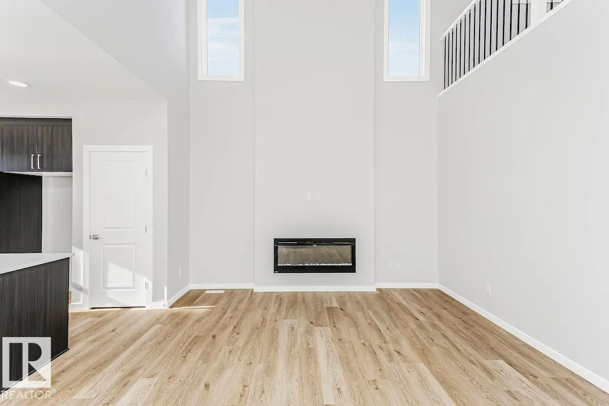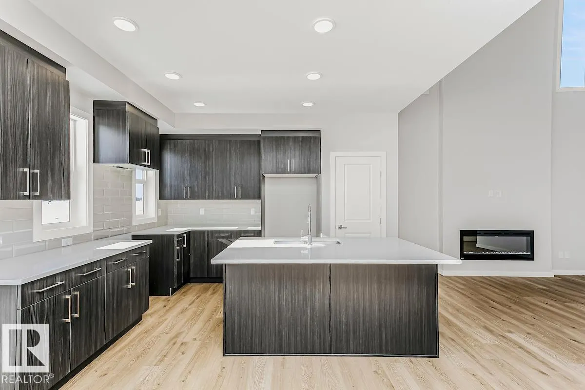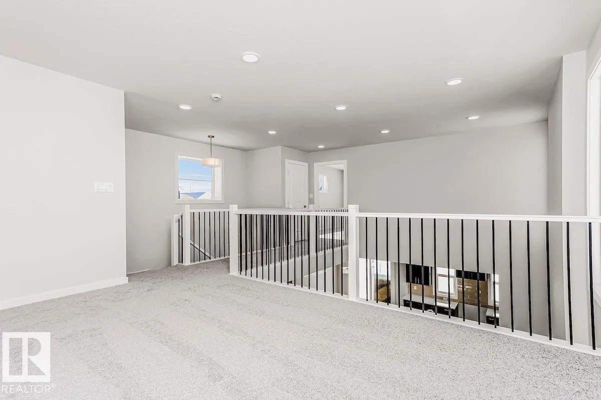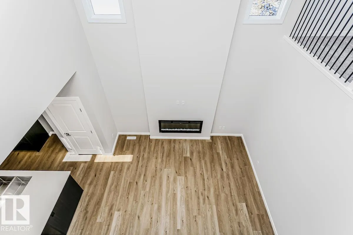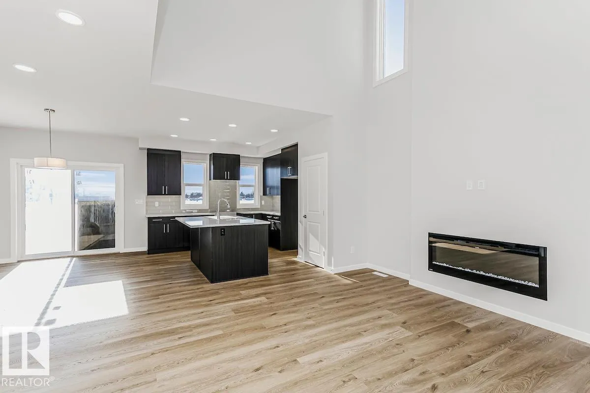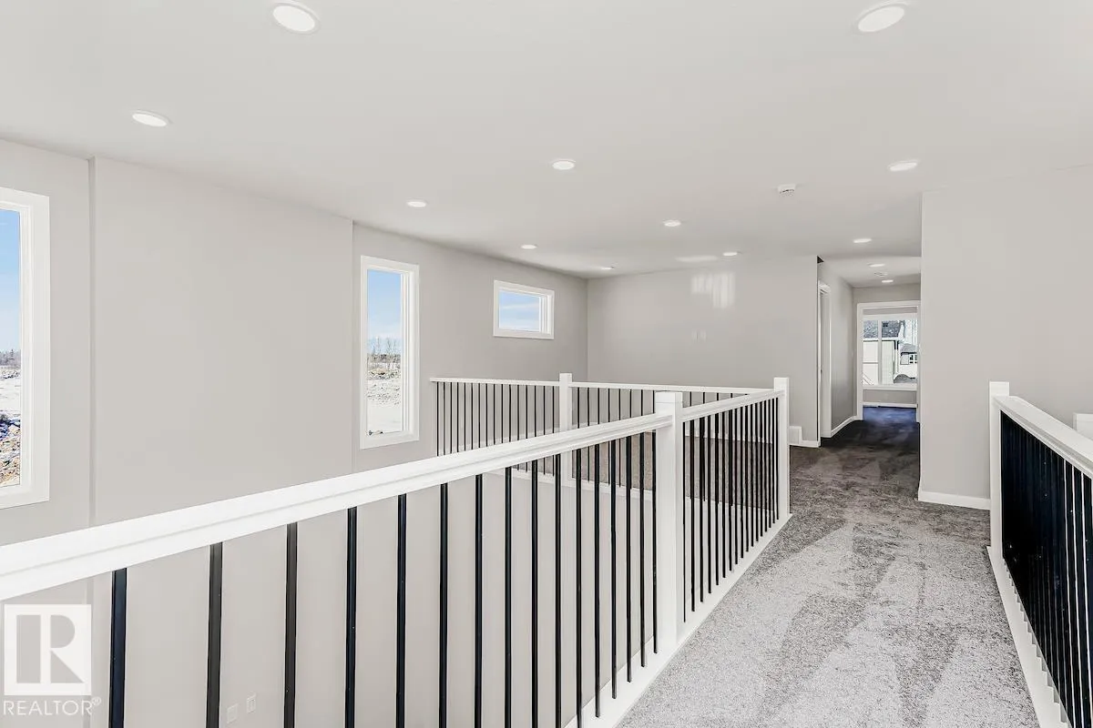 Marquis West is away from the hustle and bustle, yet close to Edmontonâs main ring road for amenities and commuting. Backing onto a park will provide privacy in your backyard. This stunning home has a 9â main floor with an open to above great room which includes a 50â linear electric fireplace. The beautiful L-Shaped kitchen at the rear of the home is bright and features quartz counters and a nice size island. As you reach the second floor, you'll discover a bridge leading over the great room towards the bonus room. A side entrance is included for a potential future development, with the basement ceiling height upgraded to 9â, for a more spacious feel. The flex room on the main floor is perfect for an office or playroom for the little ones. You will find metal spindle railing on the main and second floor. Photos are representative. (id:27476)