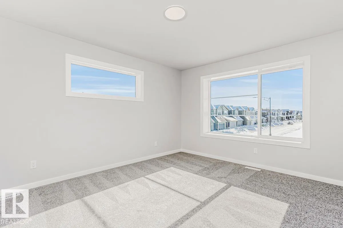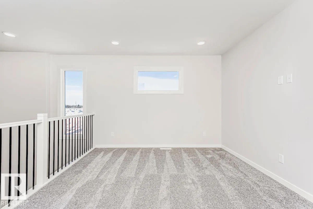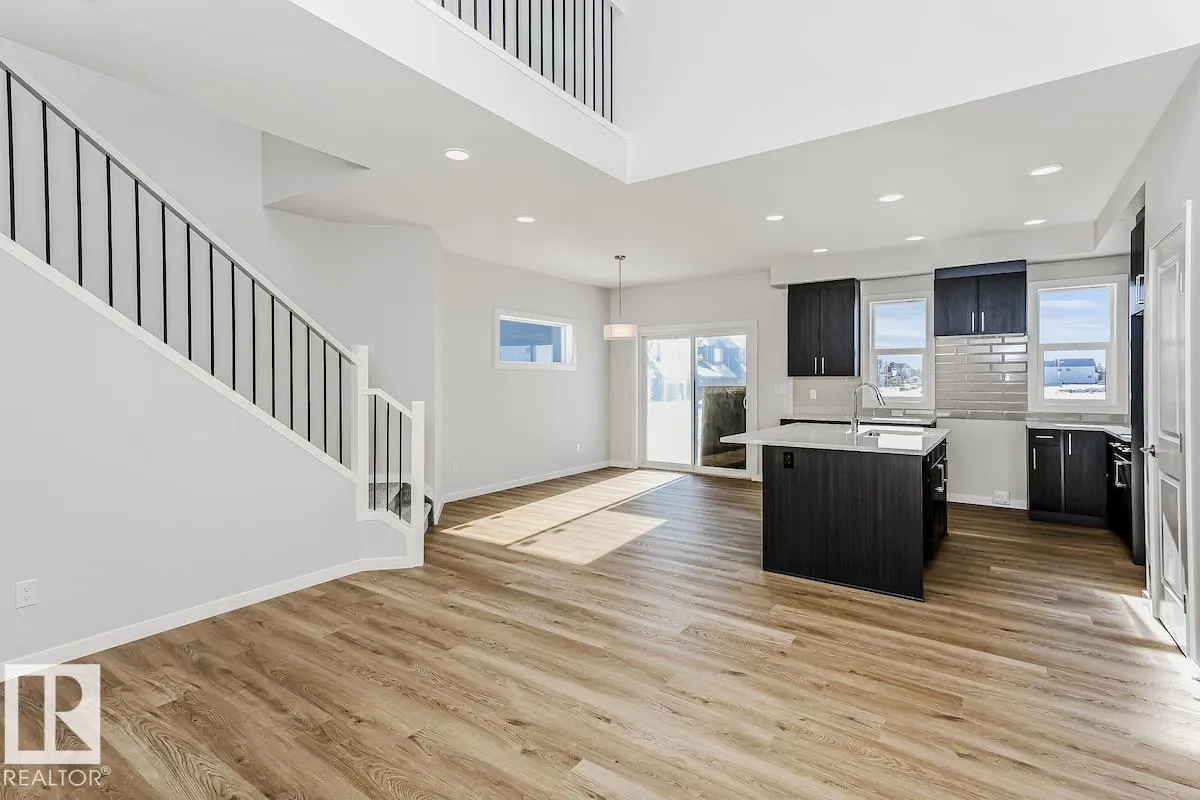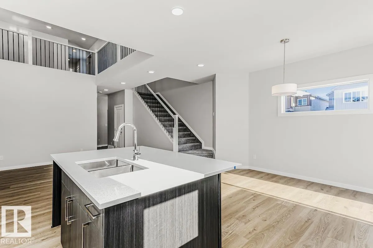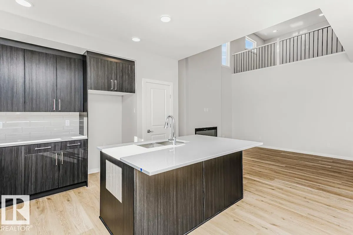 Marquis West is away from the hustle and bustle, yet close to Edmontonâs main ring road for amenities and commuting. Backing onto a park will provide privacy in your backyard. This stunning home has a 9â main floor with an open to above great room which includes a 50â linear electric fireplace. The beautiful L-Shaped kitchen at the rear of the home is bright and features quartz counters and a nice size island. As you reach the second floor, you'll discover a bridge leading over the great room towards the bonus room. A side entrance is included for a potential future development, with the basement ceiling height upgraded to 9â, for a more spacious feel. The flex room on the main floor is perfect for an office or playroom for the little ones. You will find metal spindle railing on the main and second floor. Photos are representative. (id:27476)