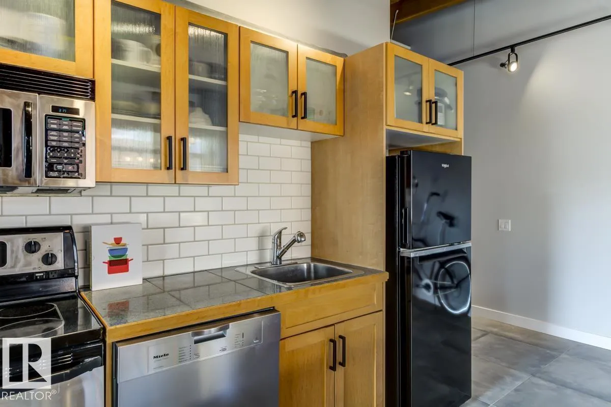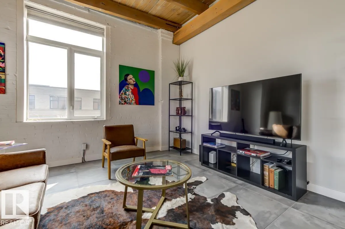 Step inside one of Edmontonâs rarest lofts â a top-floor corner unit in the historic 1929 John Deere Warehouse, reimagined by DUB Architects as Seventh Street Lofts. 945 sqft of wide-open living with soaring 13 ft fir-beam ceilings, exposed brick, and massive south + east windows that pour in natural light. Industrial character meets modern upgrades: imported porcelain tile, fresh paint, a sleek renovated 4-piece bath, and brand-new A/C. The kitchenâs stainless appliances and island are built for gathering, while the private bedroom with full wardrobe keeps life organized. This loft doesnât box you in â it flexes with your lifestyle. In-suite laundry, your own parking stall, and bylaws that welcomes Airbnb mean freedom, not restrictions. In the heart of downtownâs Ice District, steps to MacEwan, cafés, the farmers market, nightlife, and the future LRT, this isnât just a loft. Itâs a piece of Edmontonâs story, built for the way you actually live. (id:27476)