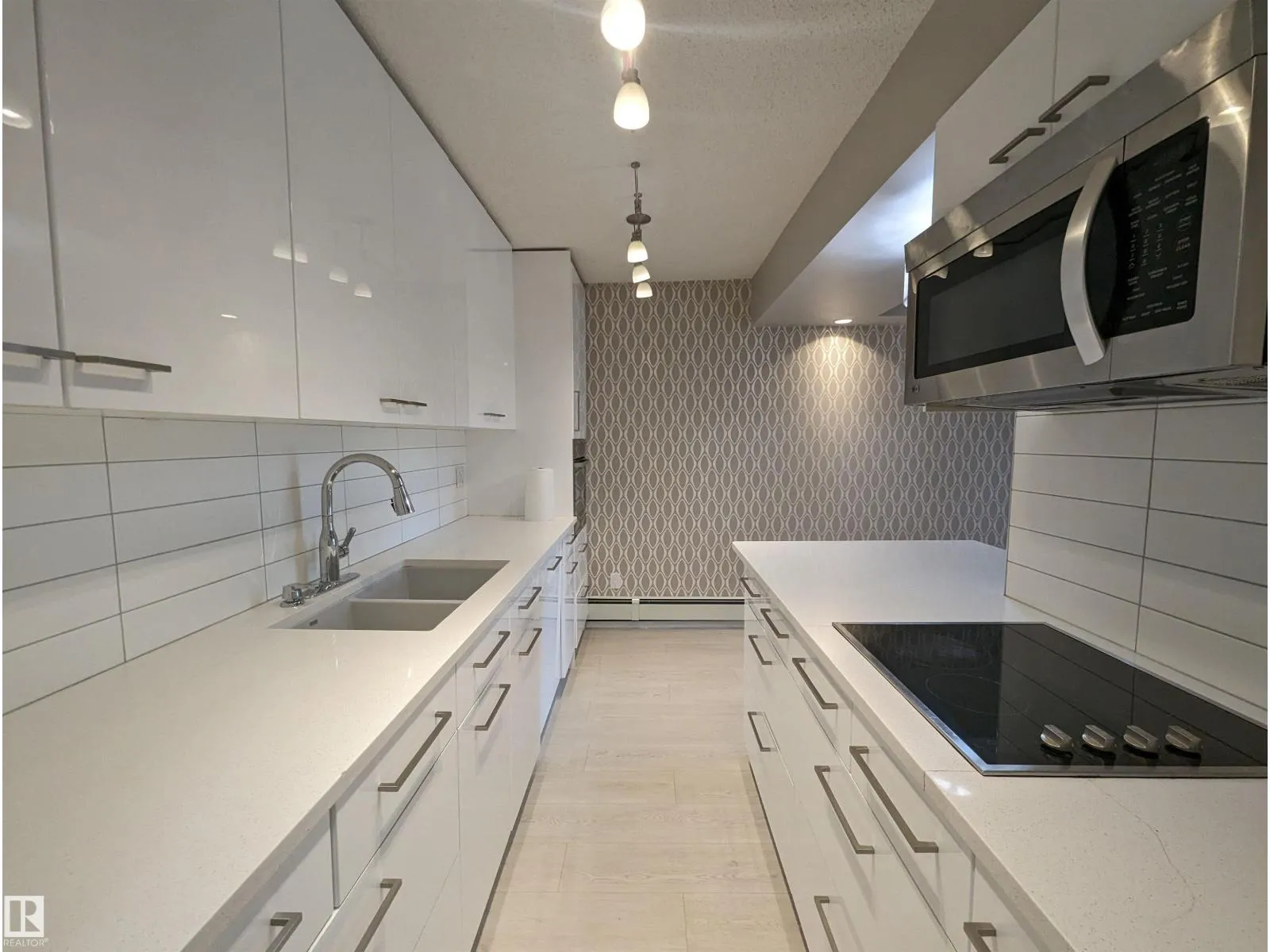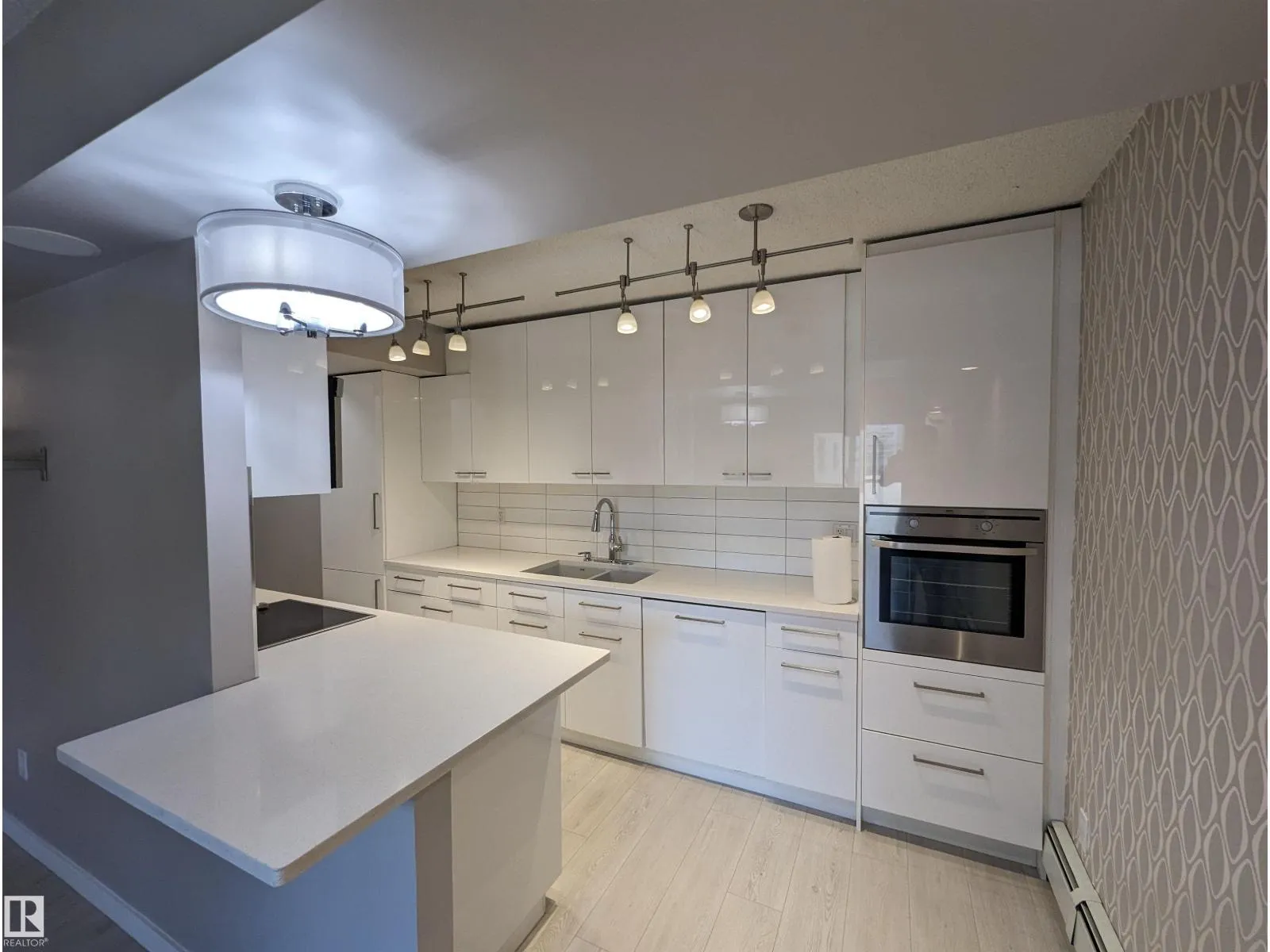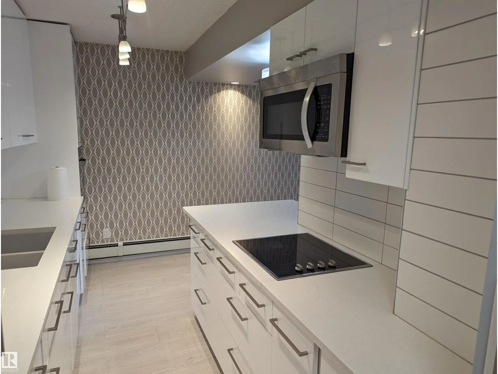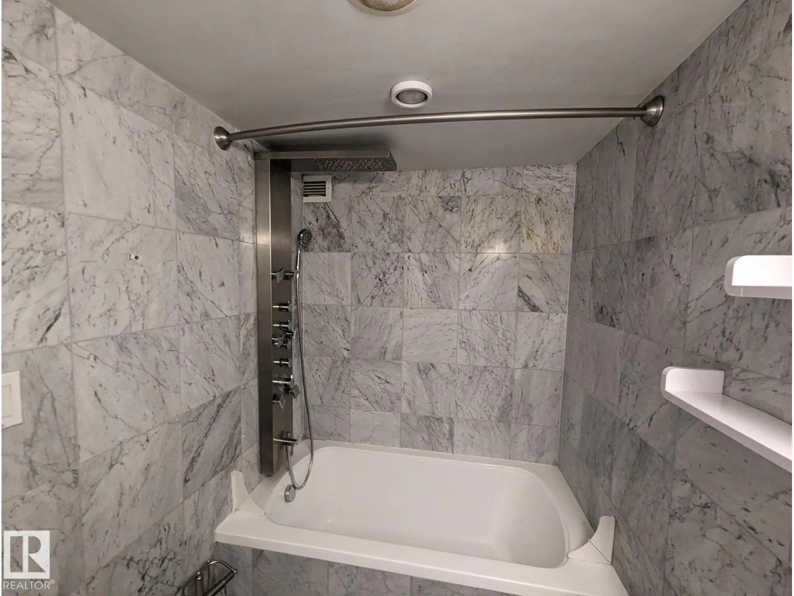 Welcome to The Fifteen! Located on the second level, just off Jasper Ave & blocks away from the BREWERY & ICE DISTRICT! Prime location, residents easy access to superb shopping, dining, the University of Alberta & Grant MacEwan. This sleek unit boasts a modern design with pristine white tile floors, white kitchen featuring Quartz countertops, eating bar, & stainless steel appliances. The spacious layout includes a bright living room, dining area, dedicated office space, convenient in-suite laundry facilities, and an impressive 4-piece marble bathroom equipped with a high-end multi-body spray nozzle shower and luxurious soaker tub. The master bedroom features a walk-in closet for added convenience. Complete with air conditioning, a parking stall, and a covered patio, this unit offers both comfort and functionality. Residents of this well-managed building also enjoy access to top-floor amenities including an exercise/yoga area and a rooftop deck boasting breathtaking 360-degree views of downtown/Oliver. (id:27476)