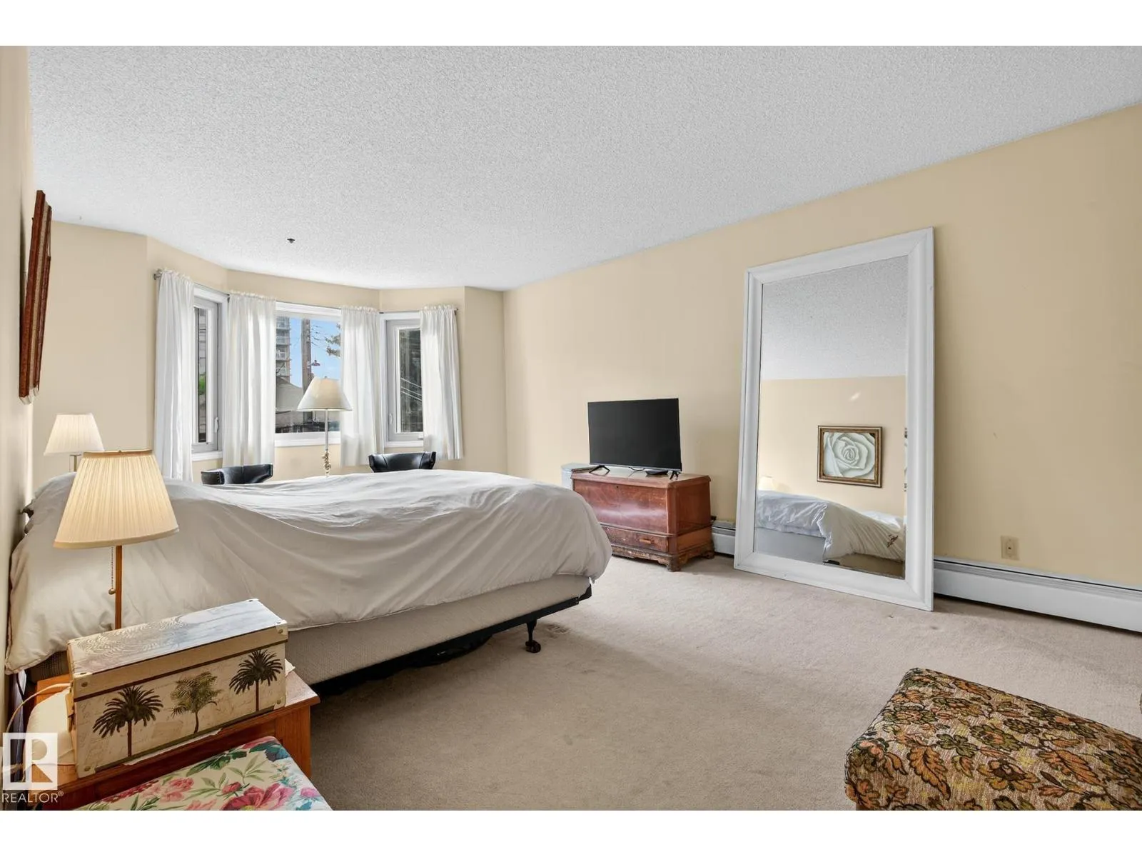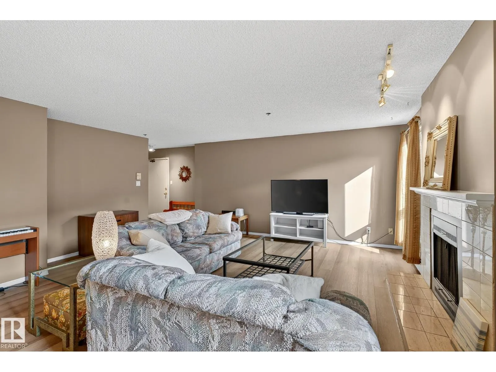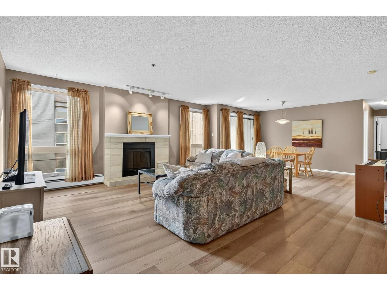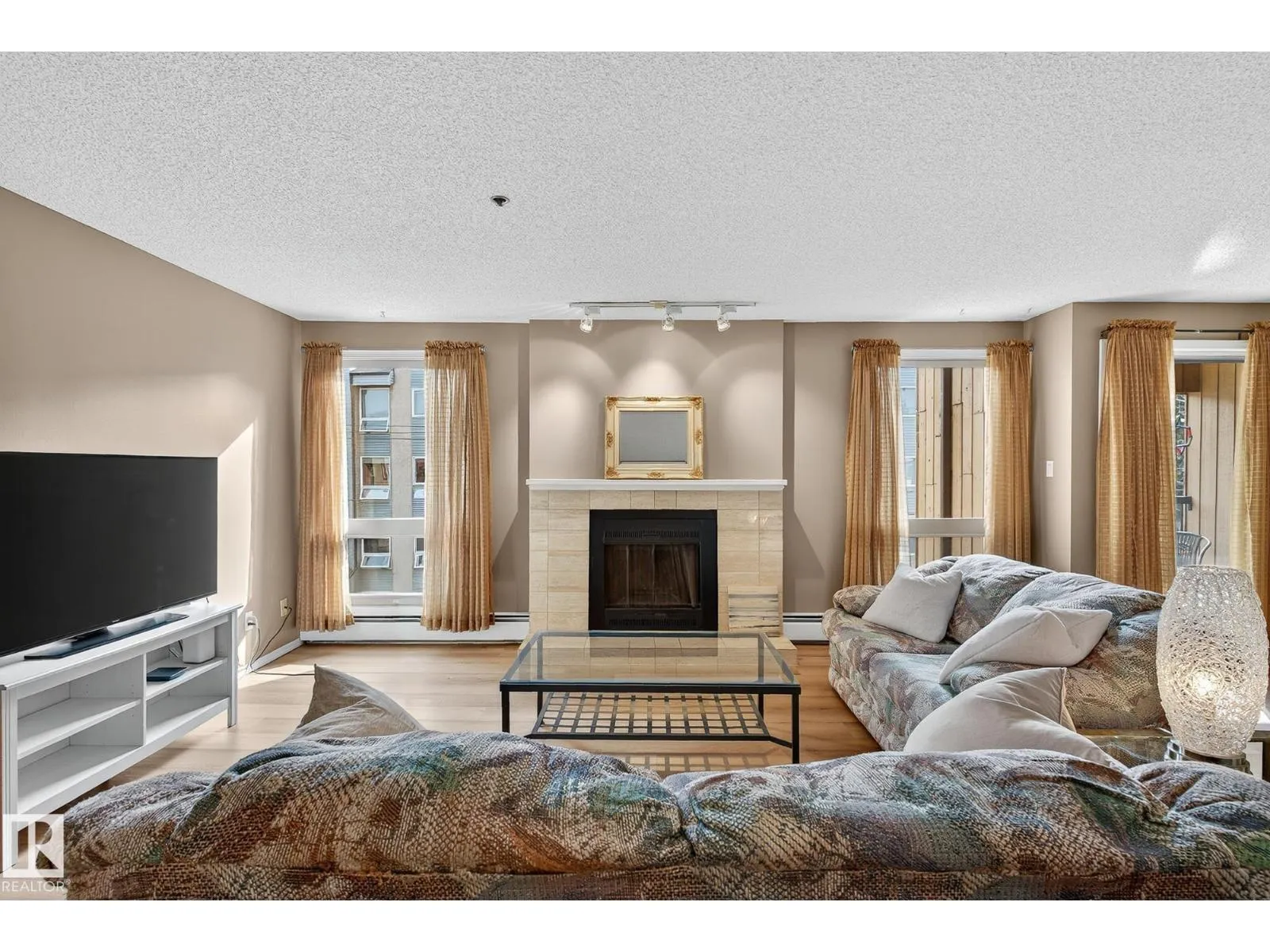 Looking for something with more character than the average condo? This rare 1,200+ sq ft downtown gem is bigger, brighter, and packed with features you wonât find elsewhere. The fireplace adds cozy charm for nights in, while the sunny covered balcony is the perfect spot for morning coffee, studying, or unwinding after work. The to dining kitchen has ample work space with a large laundry and storage room adjacent. There is plenty of space to dine with friends, relax and watch movies, or host games night. Youâll love the in-suite laundry with newer appliances, new vinyl flooring, and bright spacious rooms with bow windows. With 2 spacious rooms, the primary suite has its own 4-piece ensuite with large tub, plus thereâs a second 3pc bath for roommates or guests to compliment the large 2nd bedroom. Underground parking means no winter scraping, and the quiet complex is just steps from Jasper Avenueâclose to coffee shops, nightlife, and transit, but tucked away enough to feel private. (id:27476)