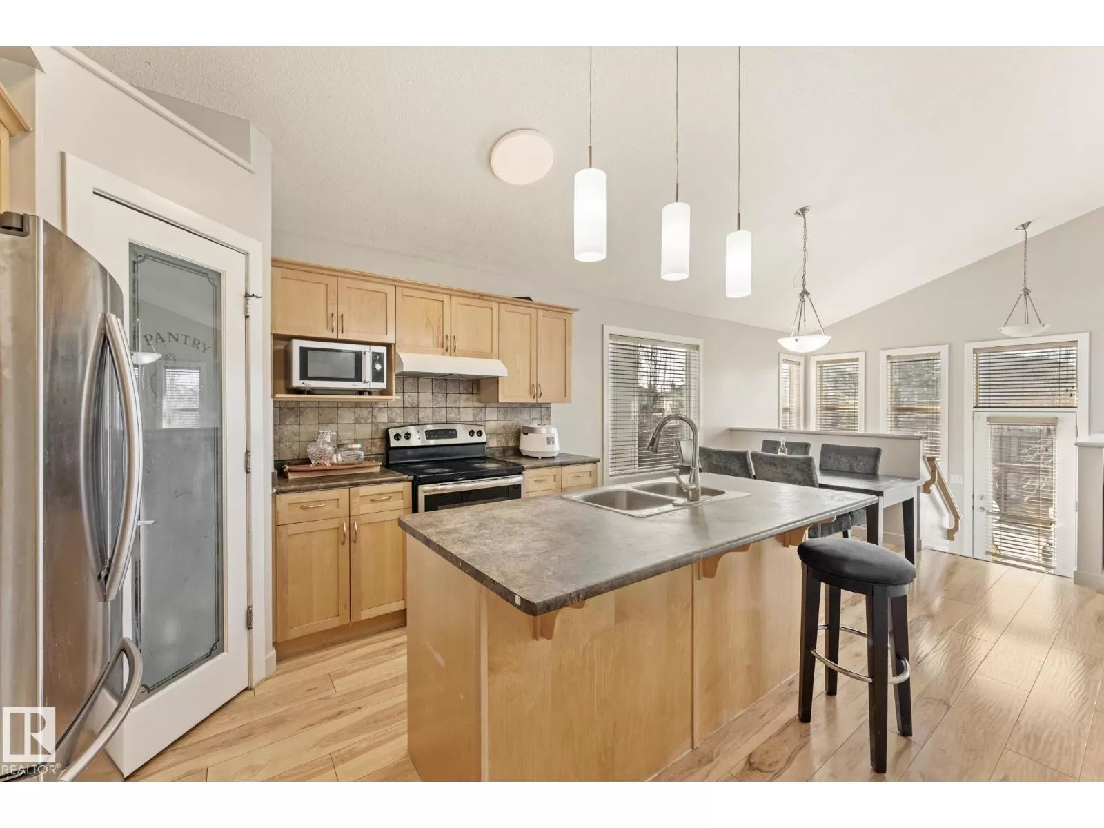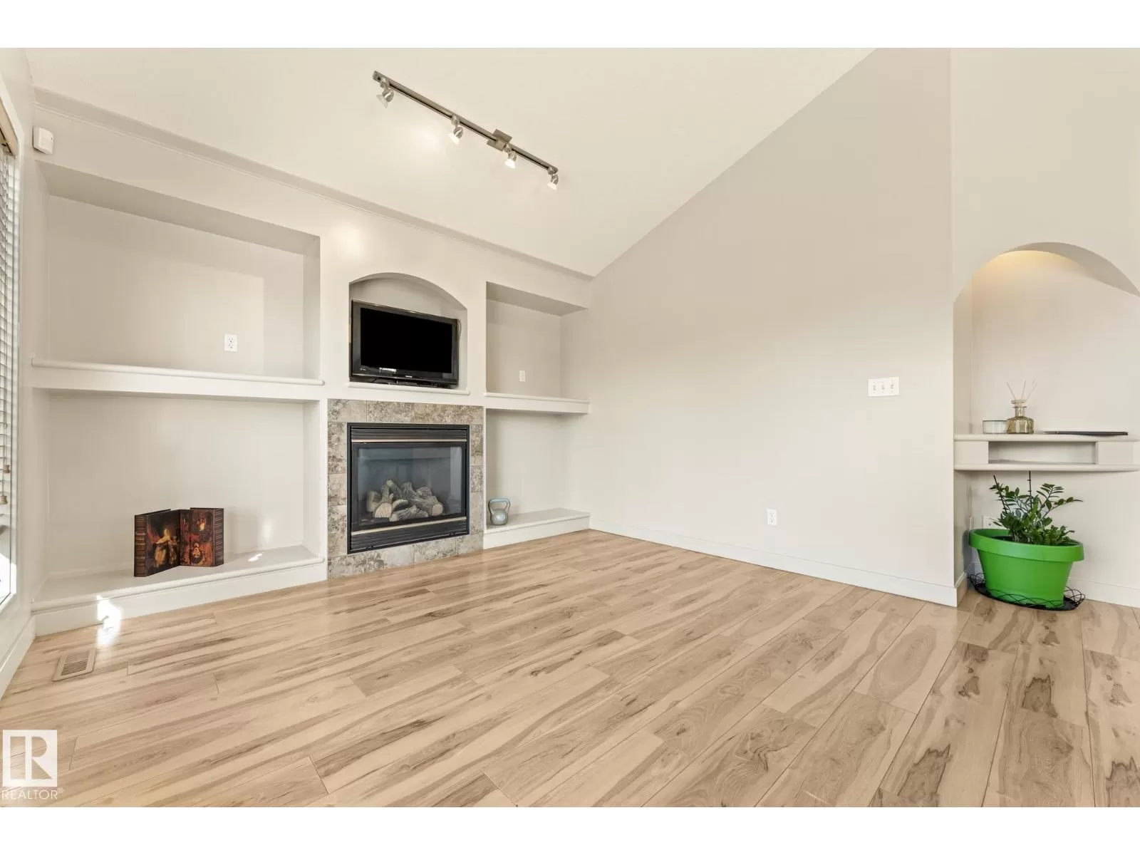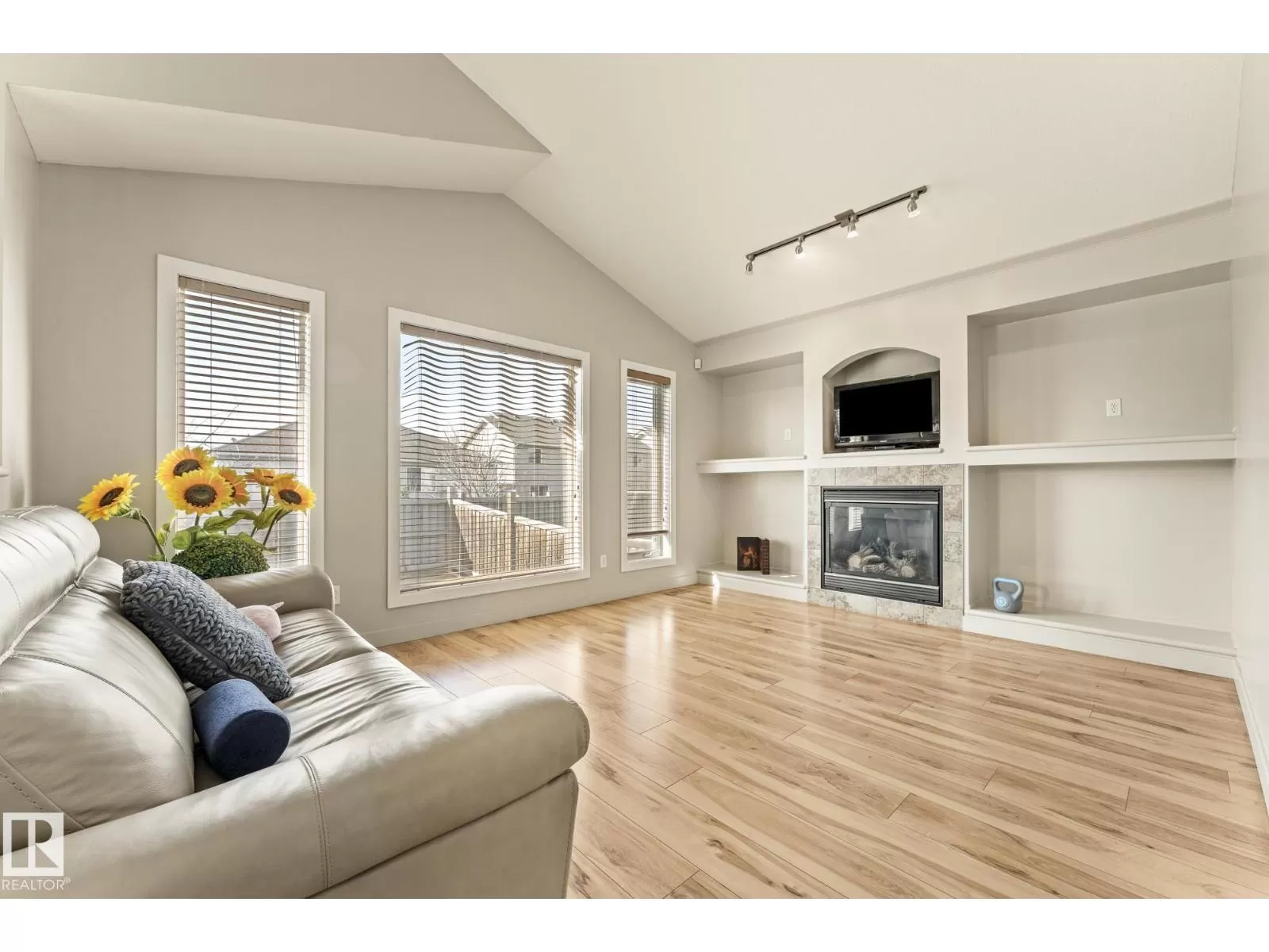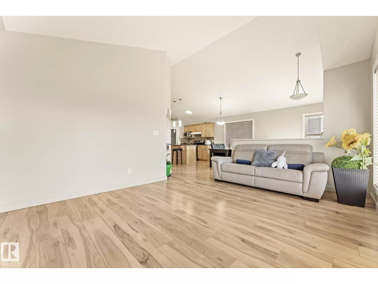 Welcome to this beautifully finished 1,419 sq. ft. bi-level home in the desirable community of MacEwan, offering modern style. Brand new shingles 2025! This bright, open-concept layout features vaulted ceilings, maple laminate flooring, and a spacious great room with a gas fireplace and built-in entertainment shelving. South-facing windows fill the space with natural light, overlooking the sunny backyard. The kitchen boasts maple cabinetry, a ceramic tile backsplash, center island, corner pantry, and track lighting, flowing seamlessly into the dining nook. Upstairs, the 361 sq. ft. primary suite offers a walk-in closet and luxurious ensuite with soaker tub, separate shower, and private toilet. The partially finished basement includes a large family/rec room and is framed for two additional bedrooms and a bathroom, offering future development potential. A double attached garage and great location close to parks, schools, trails, and shopping make this the perfect family home. (id:27476)