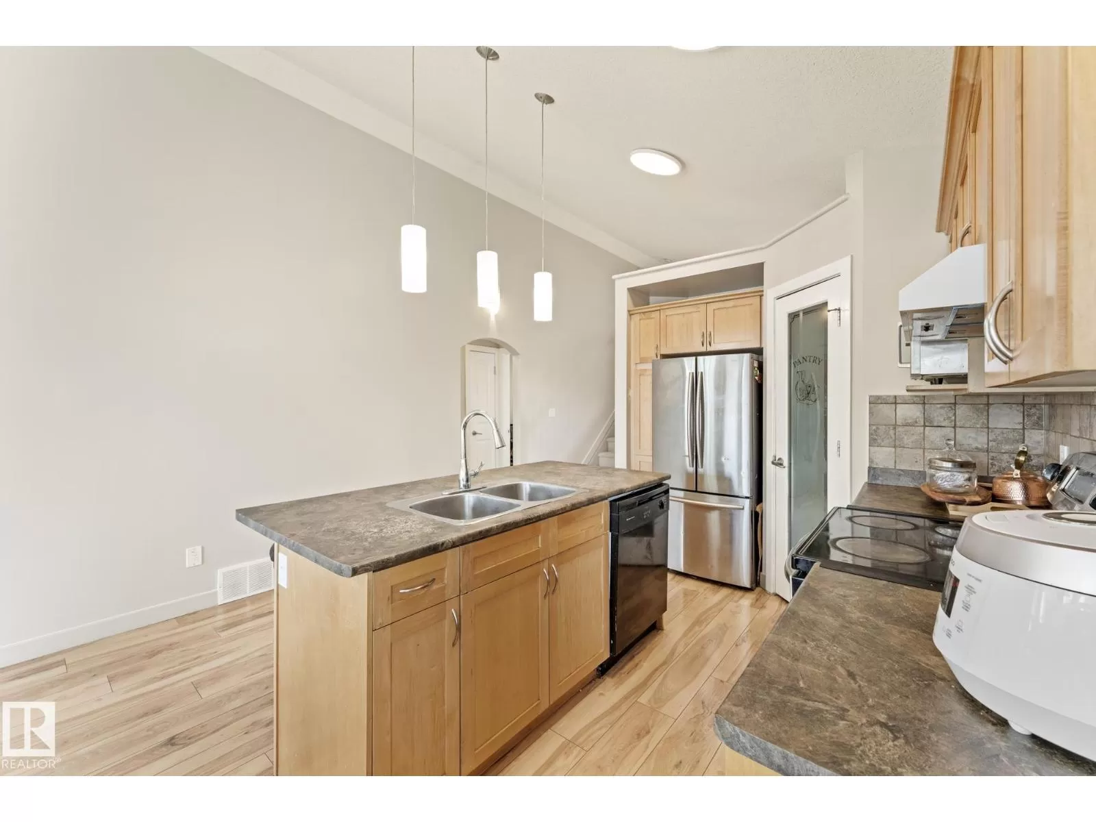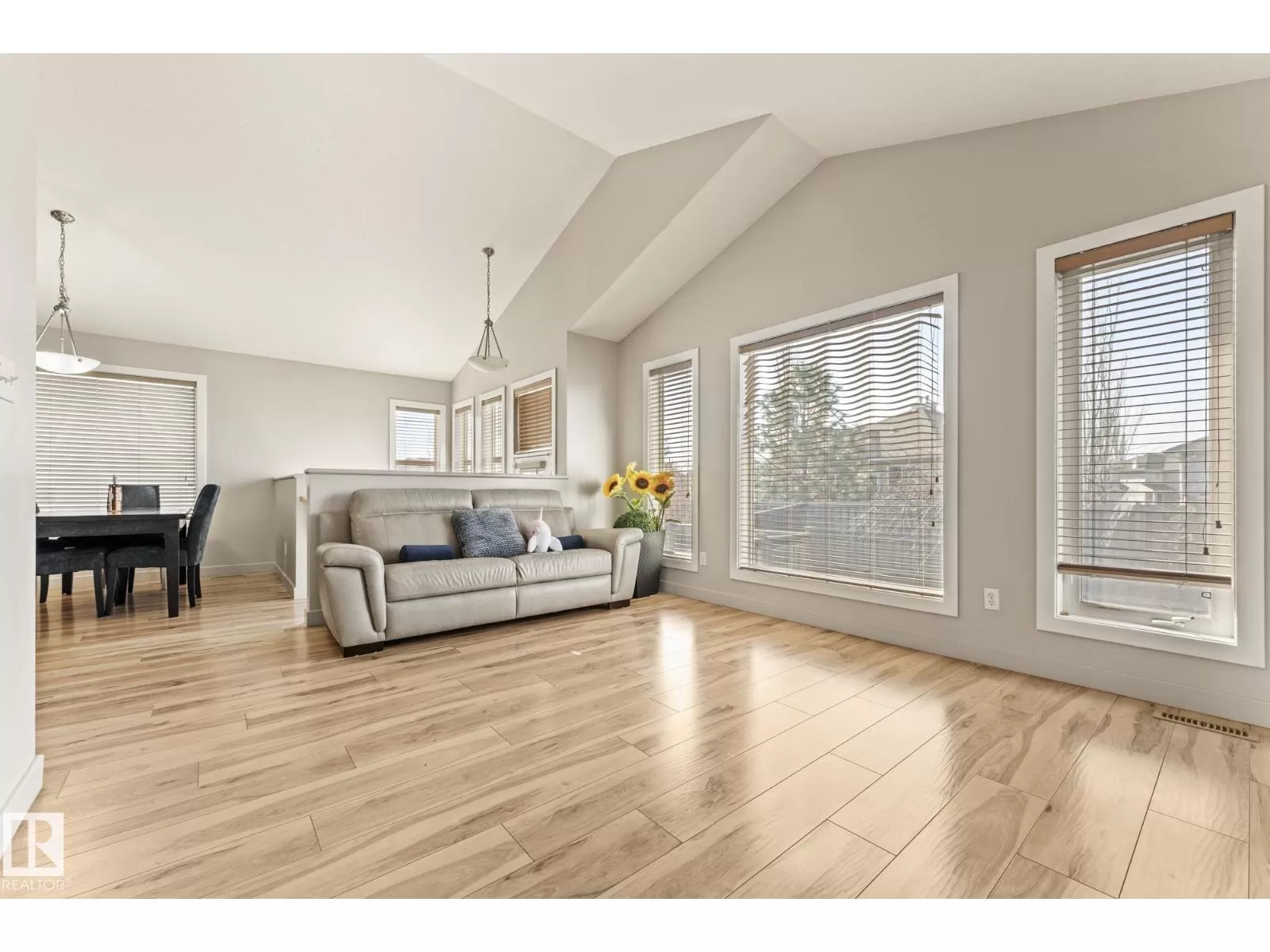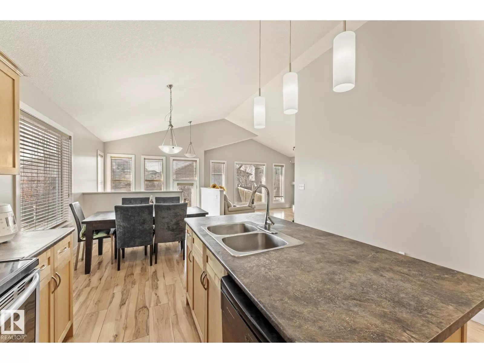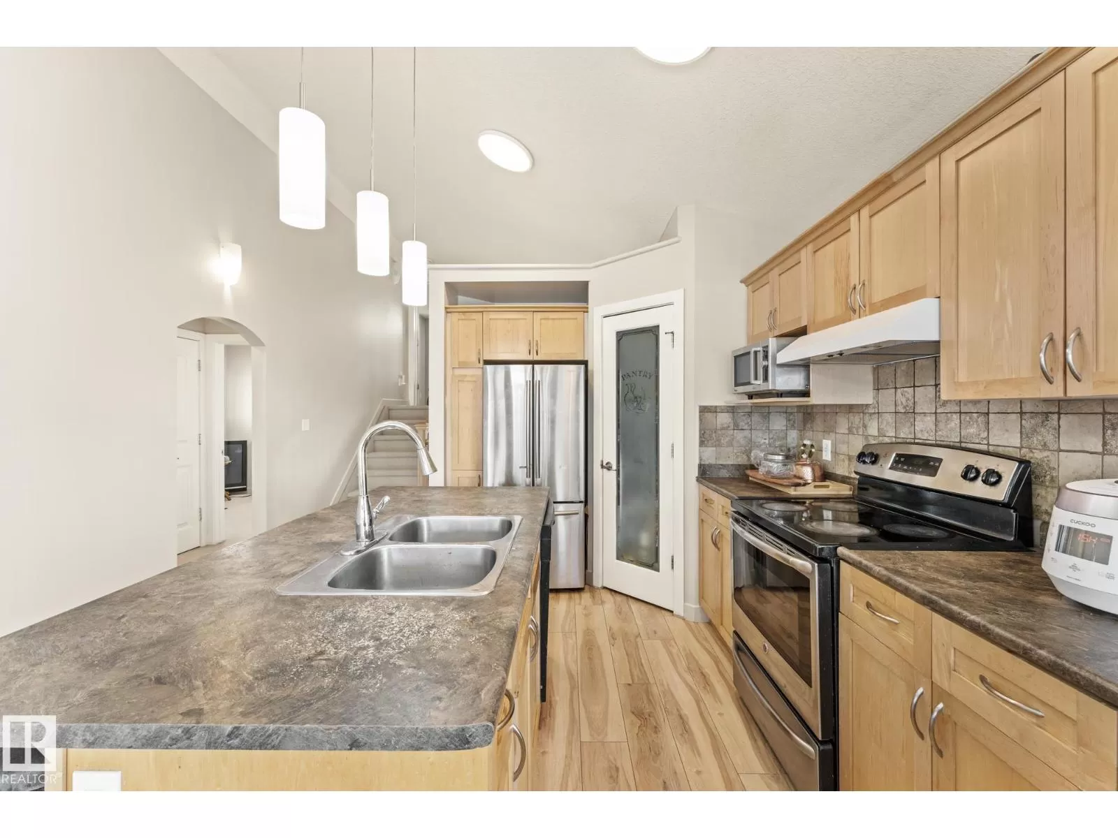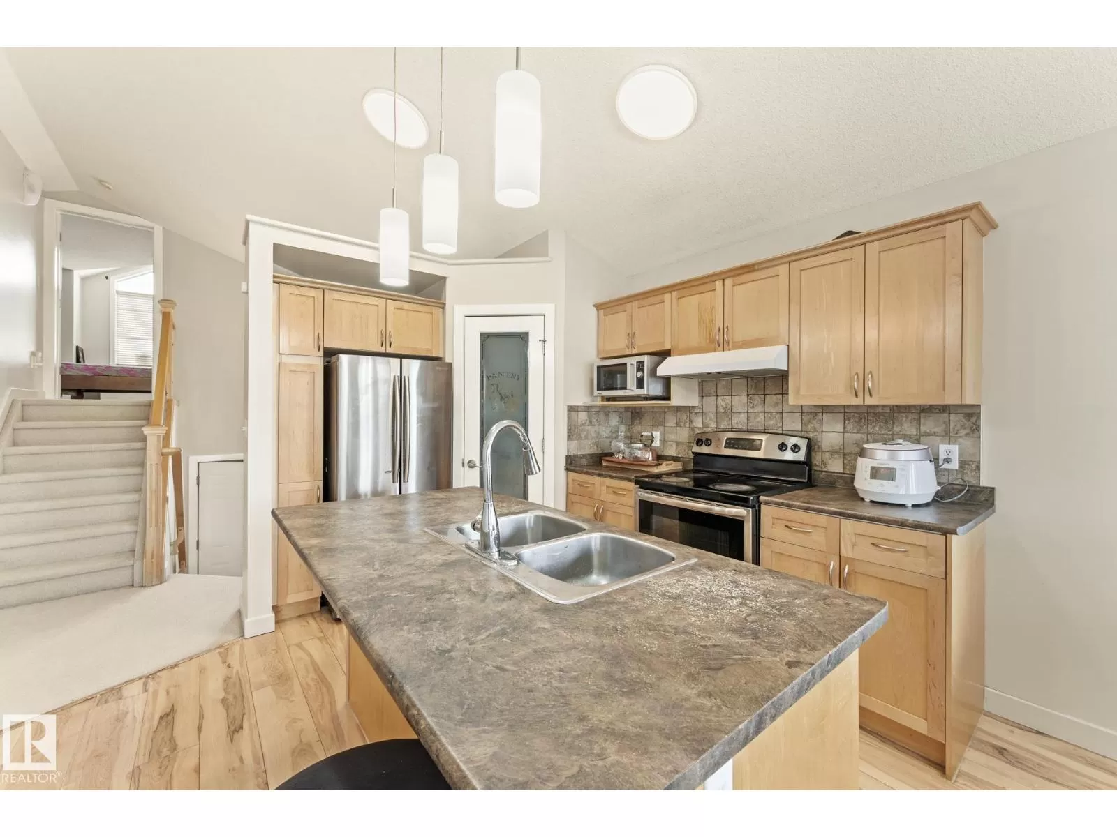Welcome to this beautifully finished 1,419 sq. ft. bi-level home in the desirable community of MacEwan, offering modern style. Brand new shingles 2025! This bright, open-concept layout features vaulted ceilings, maple laminate flooring, and a spacious great room with a gas fireplace and built-in entertainment shelving. South-facing windows fill the space with natural light, overlooking the sunny backyard. The kitchen boasts maple cabinetry, a ceramic tile backsplash, center island, corner pantry, and track lighting, flowing seamlessly into the dining nook. Upstairs, the 361 sq. ft. primary suite offers a walk-in closet and luxurious ensuite with soaker tub, separate shower, and private toilet. The partially finished basement includes a large family/rec room and is framed for two additional bedrooms and a bathroom, offering future development potential. A double attached garage and great location close to parks, schools, trails, and shopping make this the perfect family home. (id:27476)
