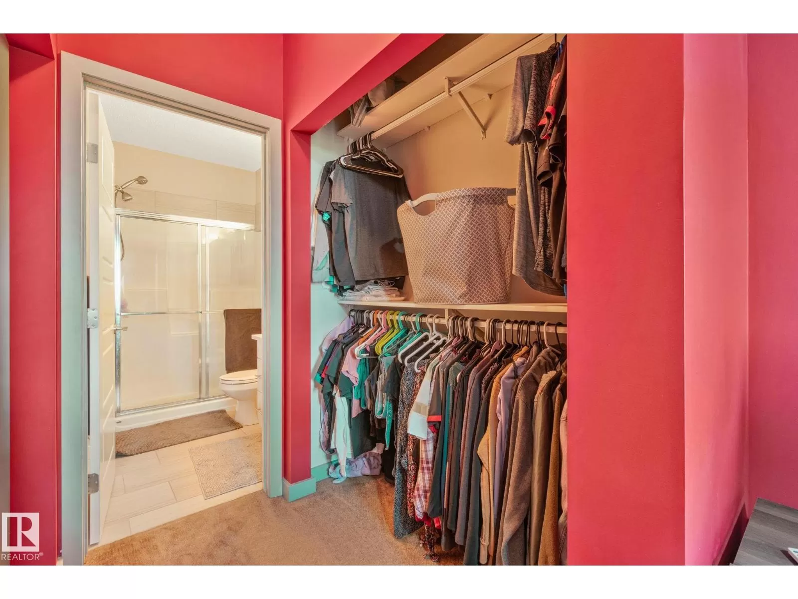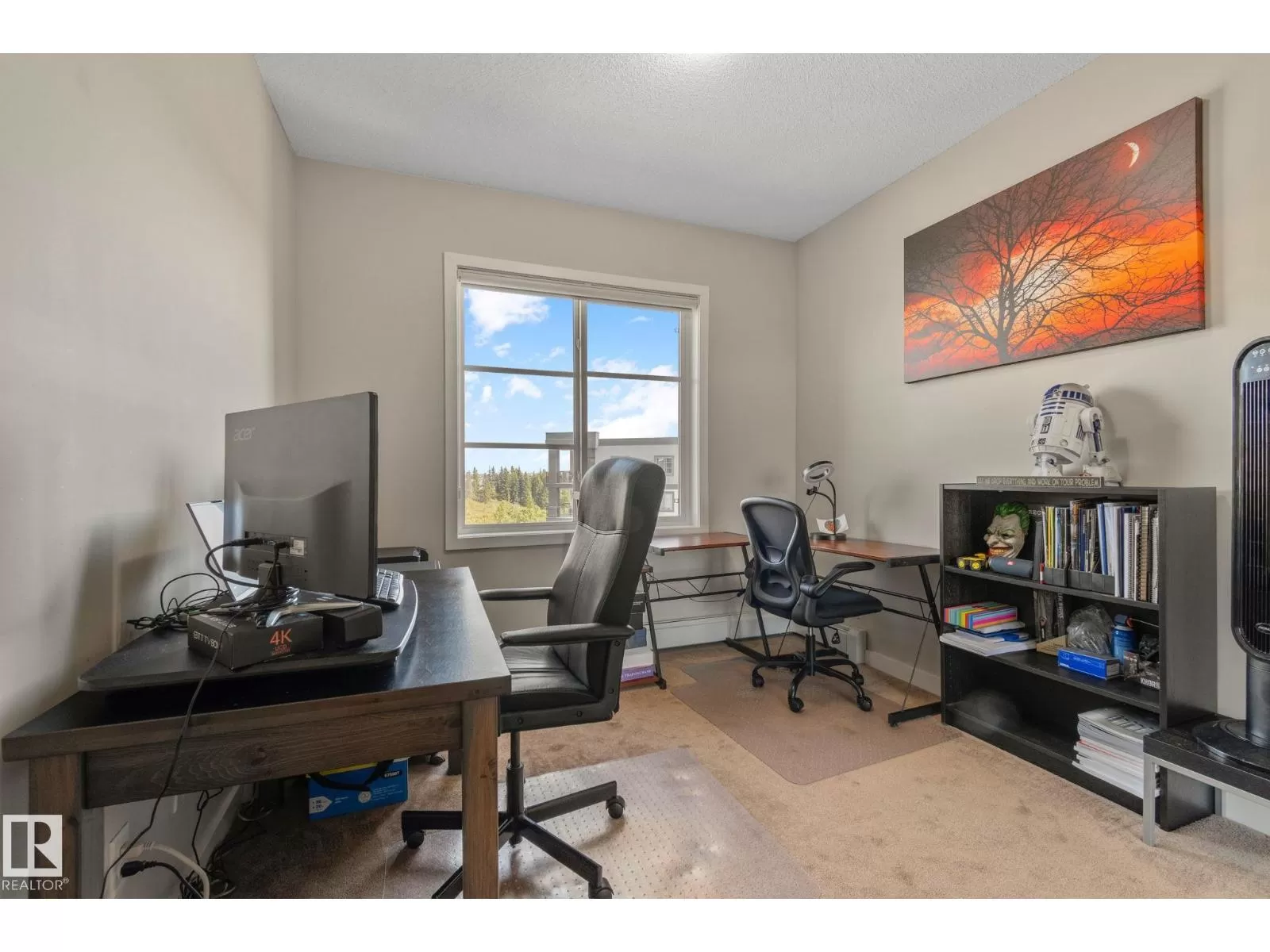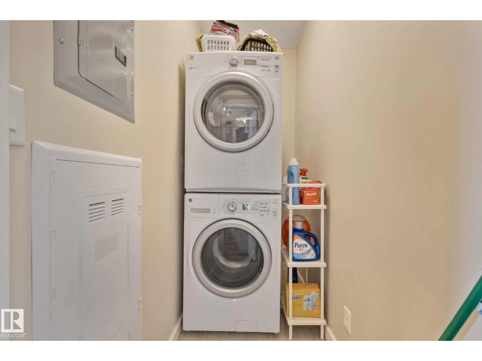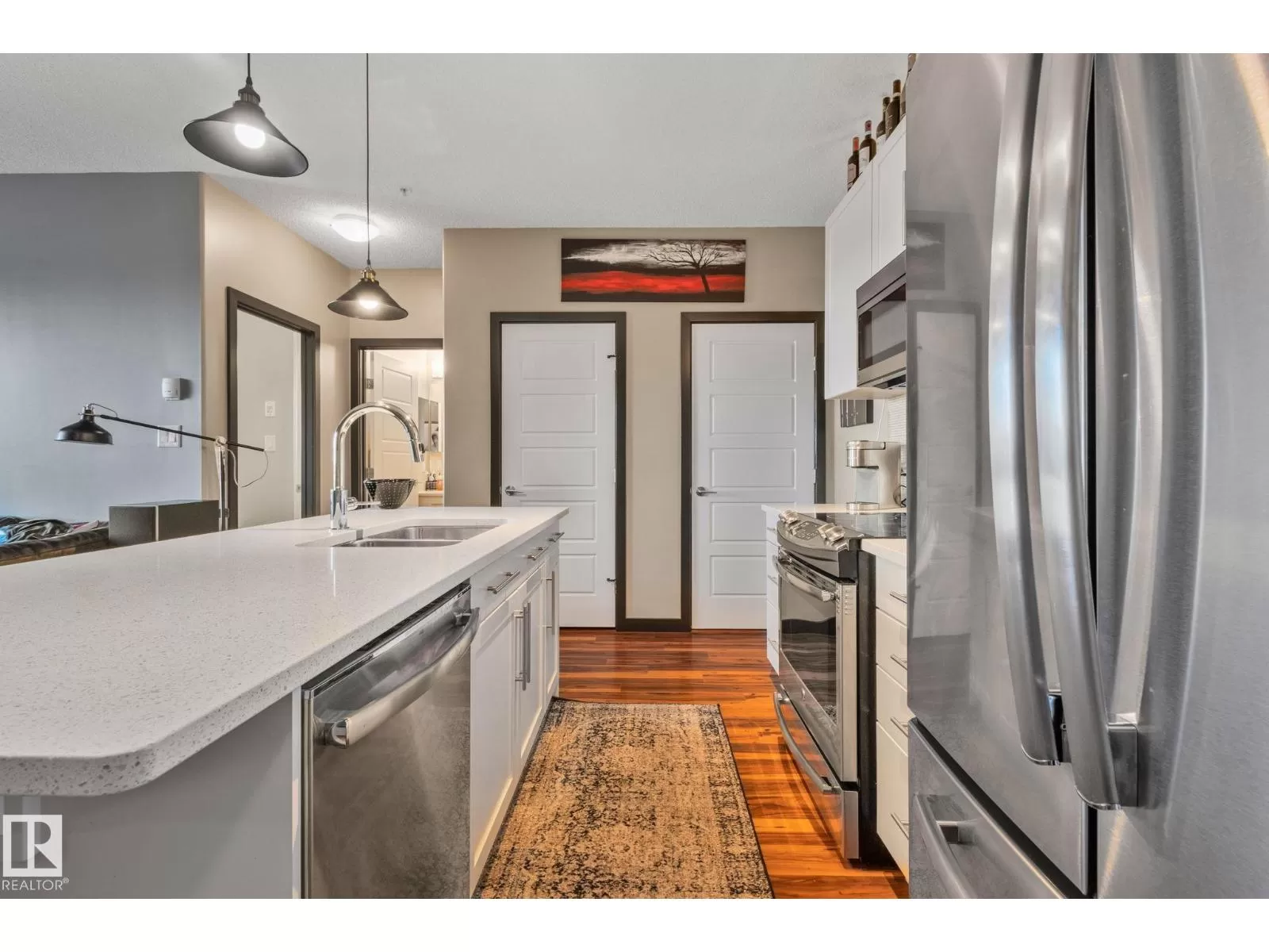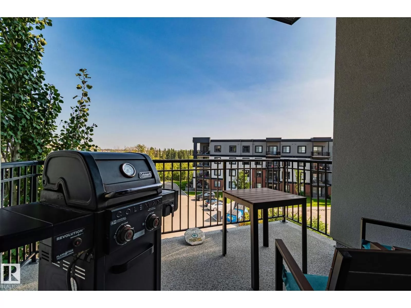 Welcome to top-floor living in the sought-after Elan Building. This bright and spacious two bedroom two bath suite features 9' ceilings, quartz counter tops throughout, maple cabinets, stainless steel appliances, glass tile backsplash, walnut laminate flooring, pendant lighting, convenient in-suite laundry, a pantry and a built in tech centre with extra storage. The primary suite includes a walk-through closet and 4-pc ensuite, while the second bedroom is ideal for children or guest. Unit comes with a titled heated underground parking stall and storage cage. The building features a social room with wet bar and pool table and a well equipped fitness room. Unit also has view of Blackmud Creek Ravine, just minutes from the Anthony Henday, shopping, walking trails, public transit and schools! Elan Condo consistently awarded recognition by Edmonton Police Service for maintaining security standards in accordance with crime-free multi-housing program. (id:27476)