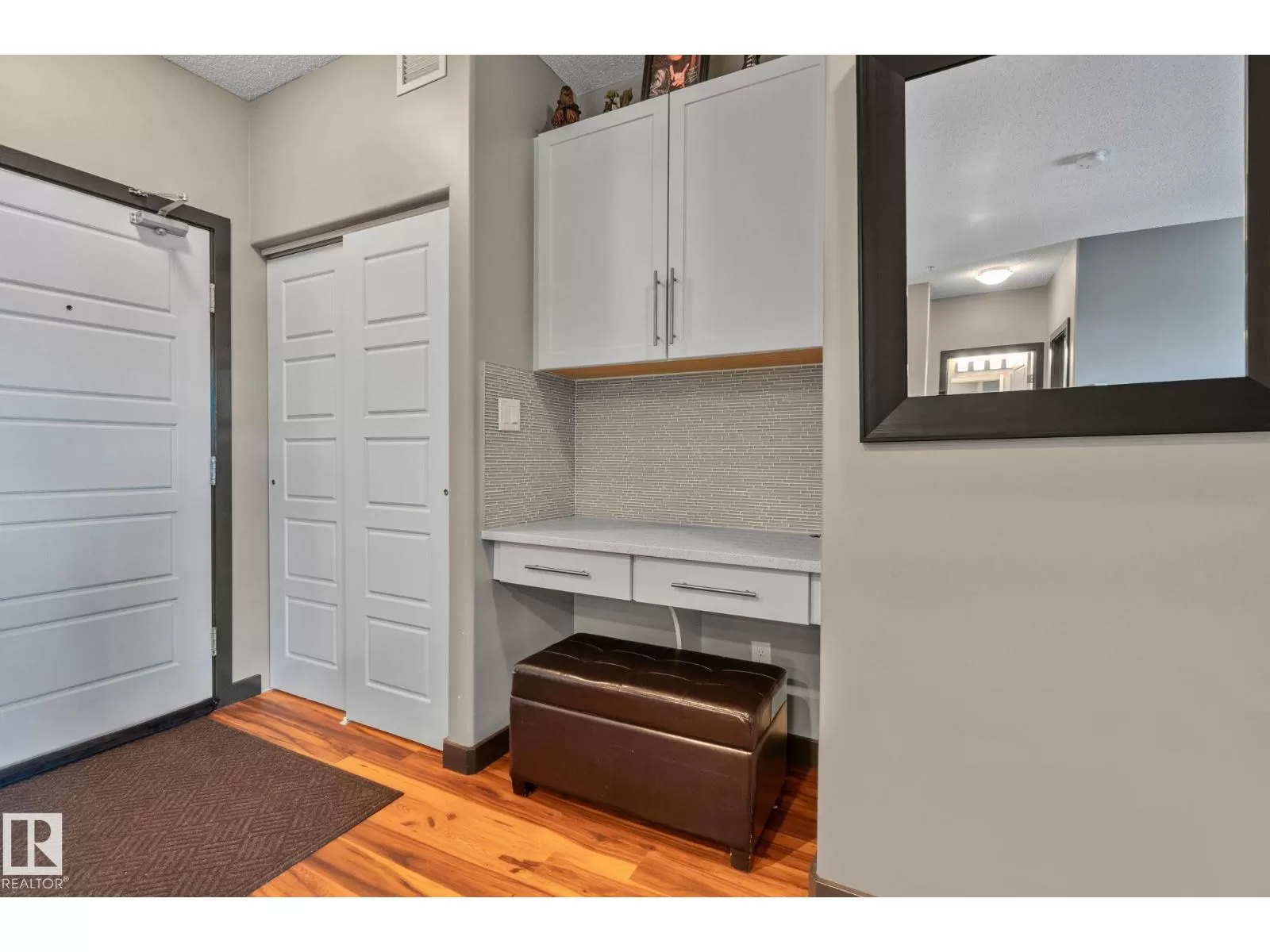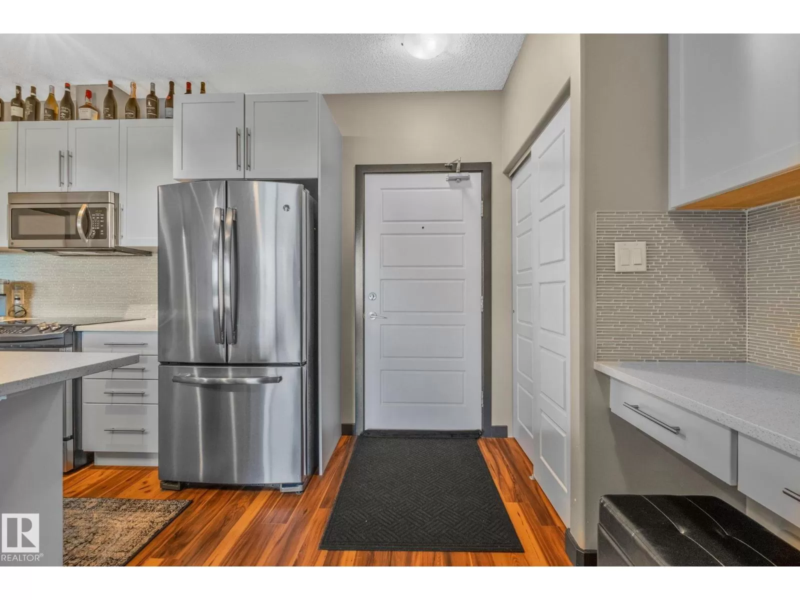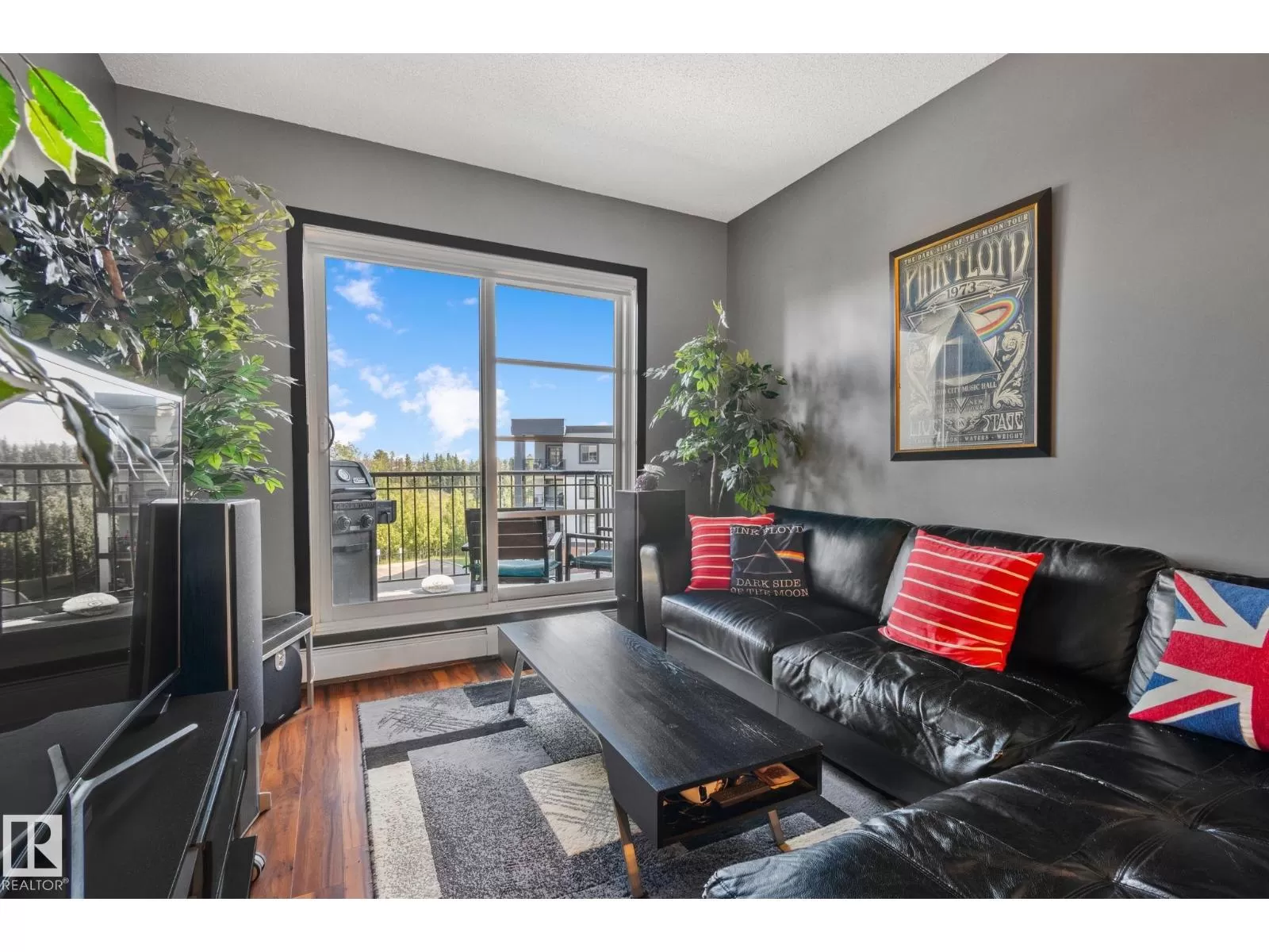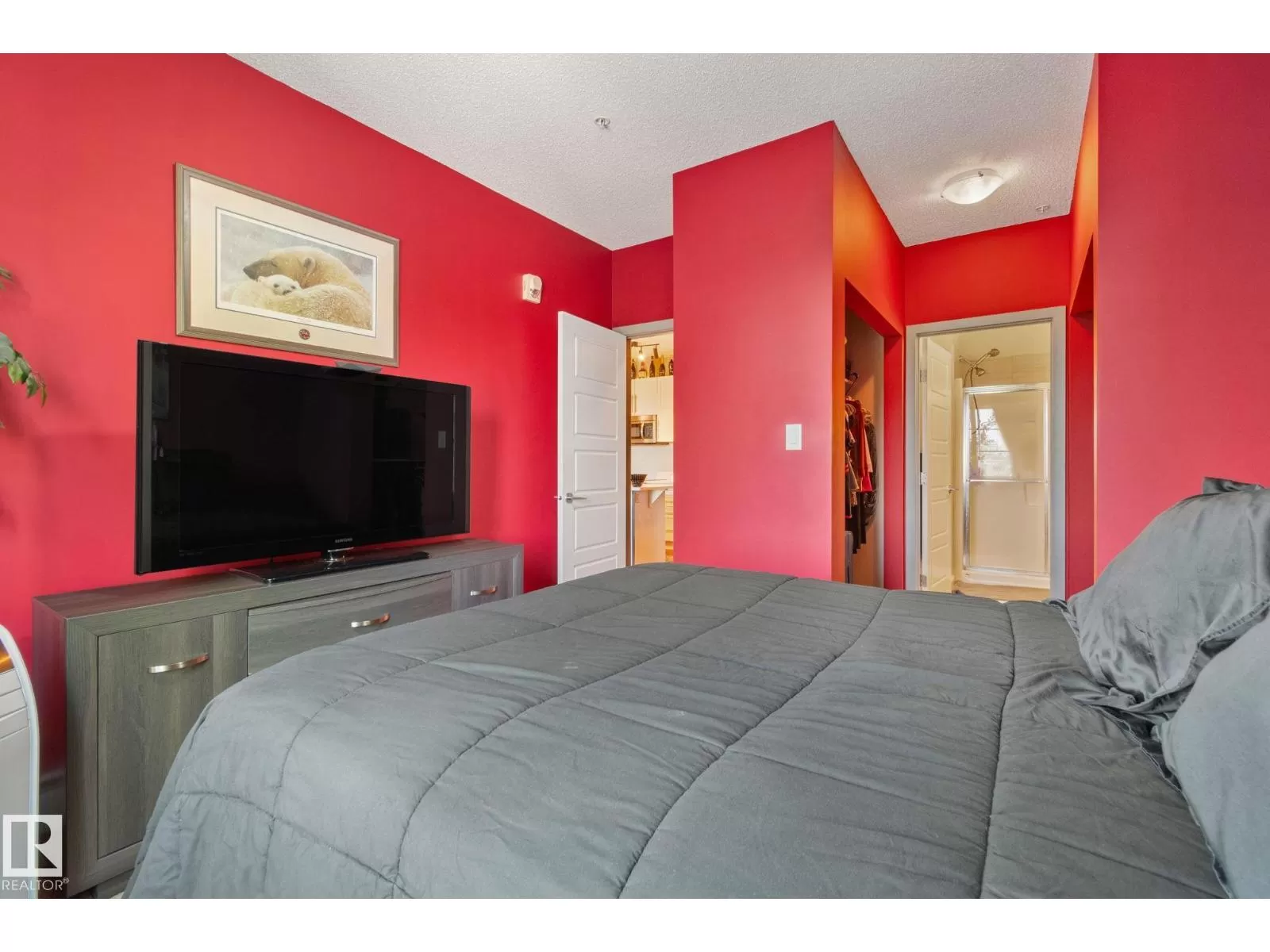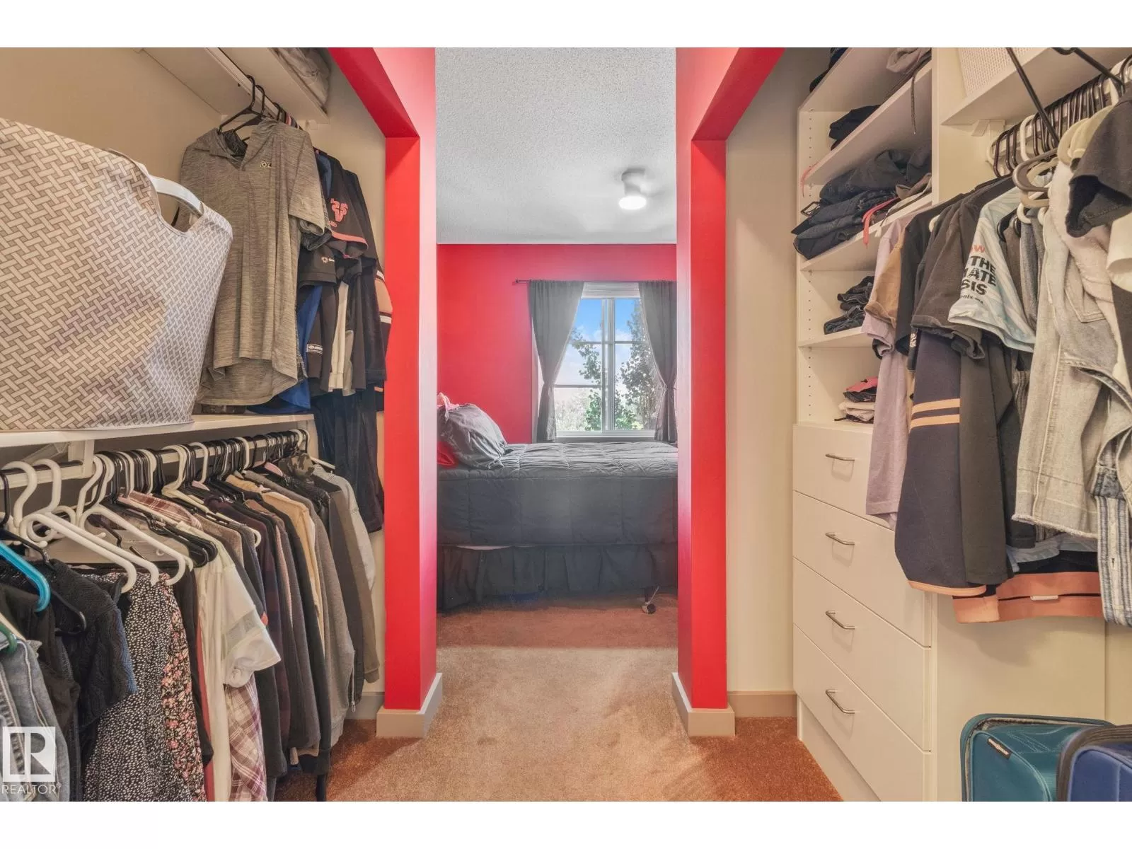 Welcome to top-floor living in the sought-after Elan Building. This bright and spacious two bedroom two bath suite features 9' ceilings, quartz counter tops throughout, maple cabinets, stainless steel appliances, glass tile backsplash, walnut laminate flooring, pendant lighting, convenient in-suite laundry, a pantry and a built in tech centre with extra storage. The primary suite includes a walk-through closet and 4-pc ensuite, while the second bedroom is ideal for children or guest. Unit comes with a titled heated underground parking stall and storage cage. The building features a social room with wet bar and pool table and a well equipped fitness room. Unit also has view of Blackmud Creek Ravine, just minutes from the Anthony Henday, shopping, walking trails, public transit and schools! Elan Condo consistently awarded recognition by Edmonton Police Service for maintaining security standards in accordance with crime-free multi-housing program. (id:27476)