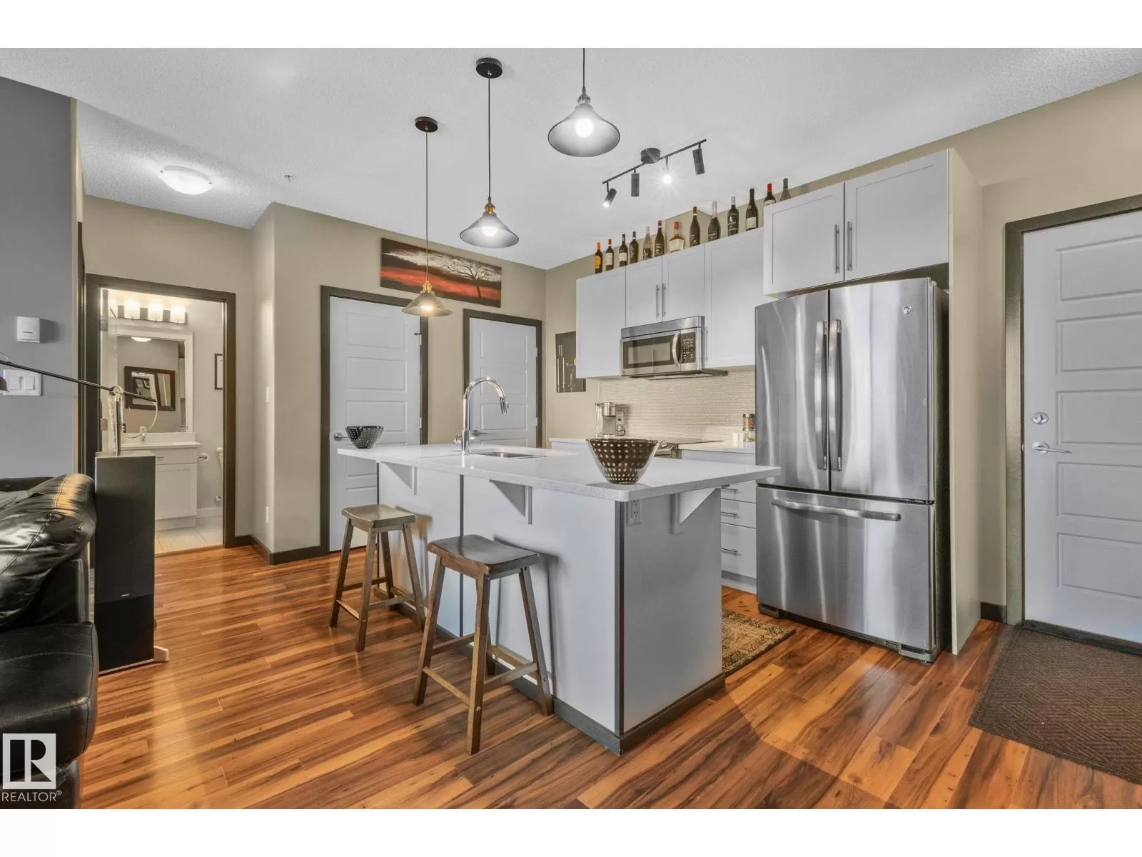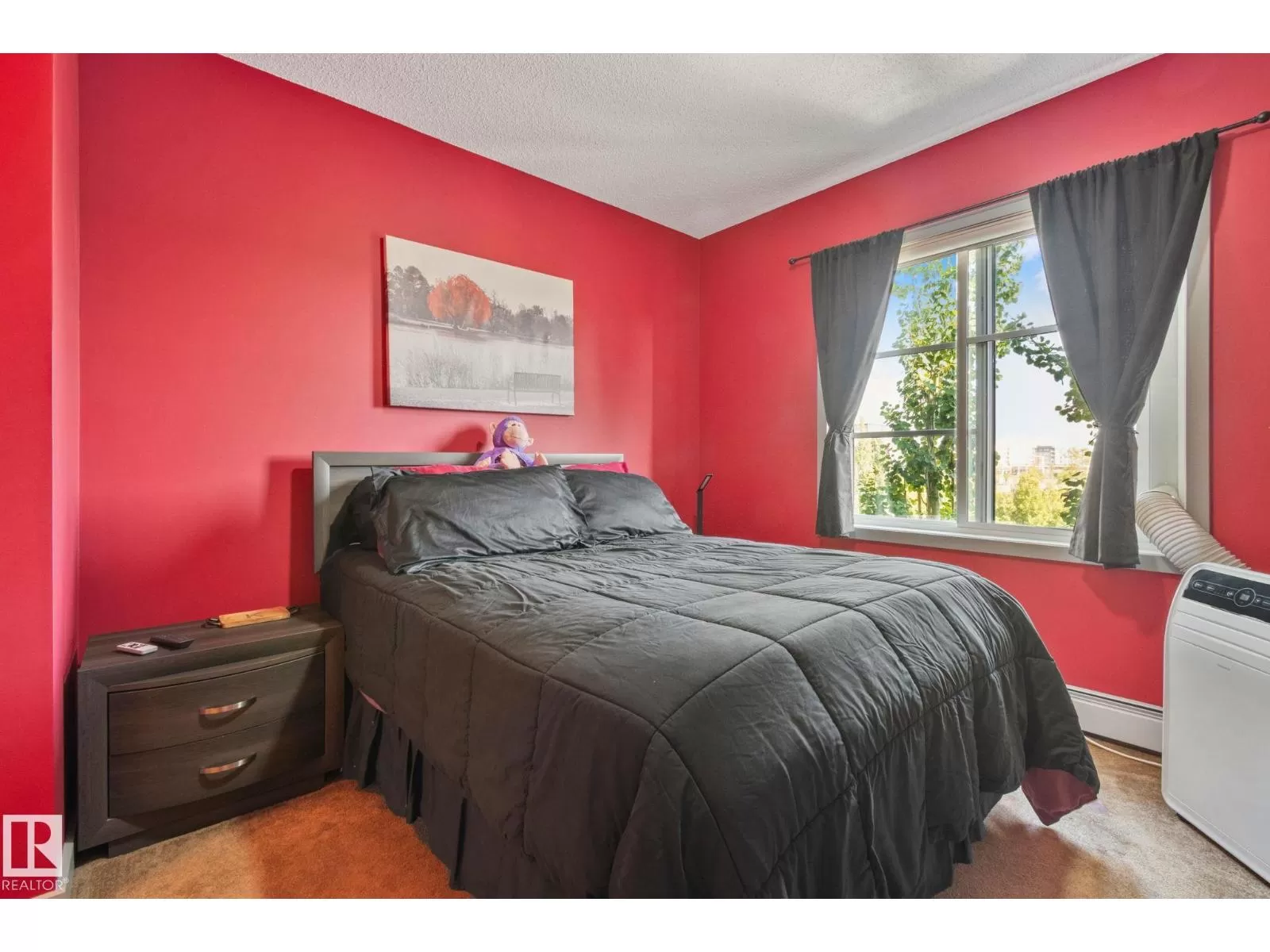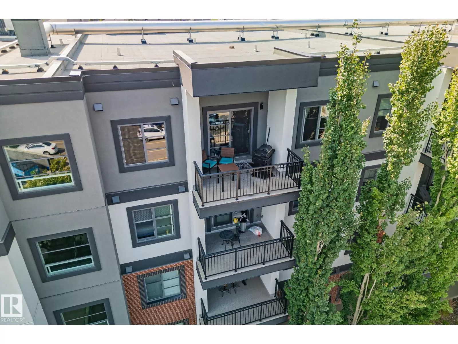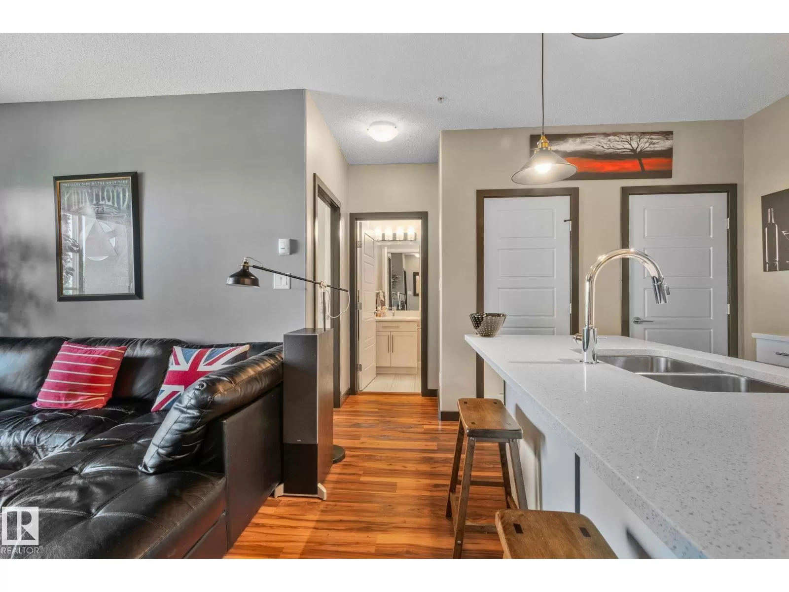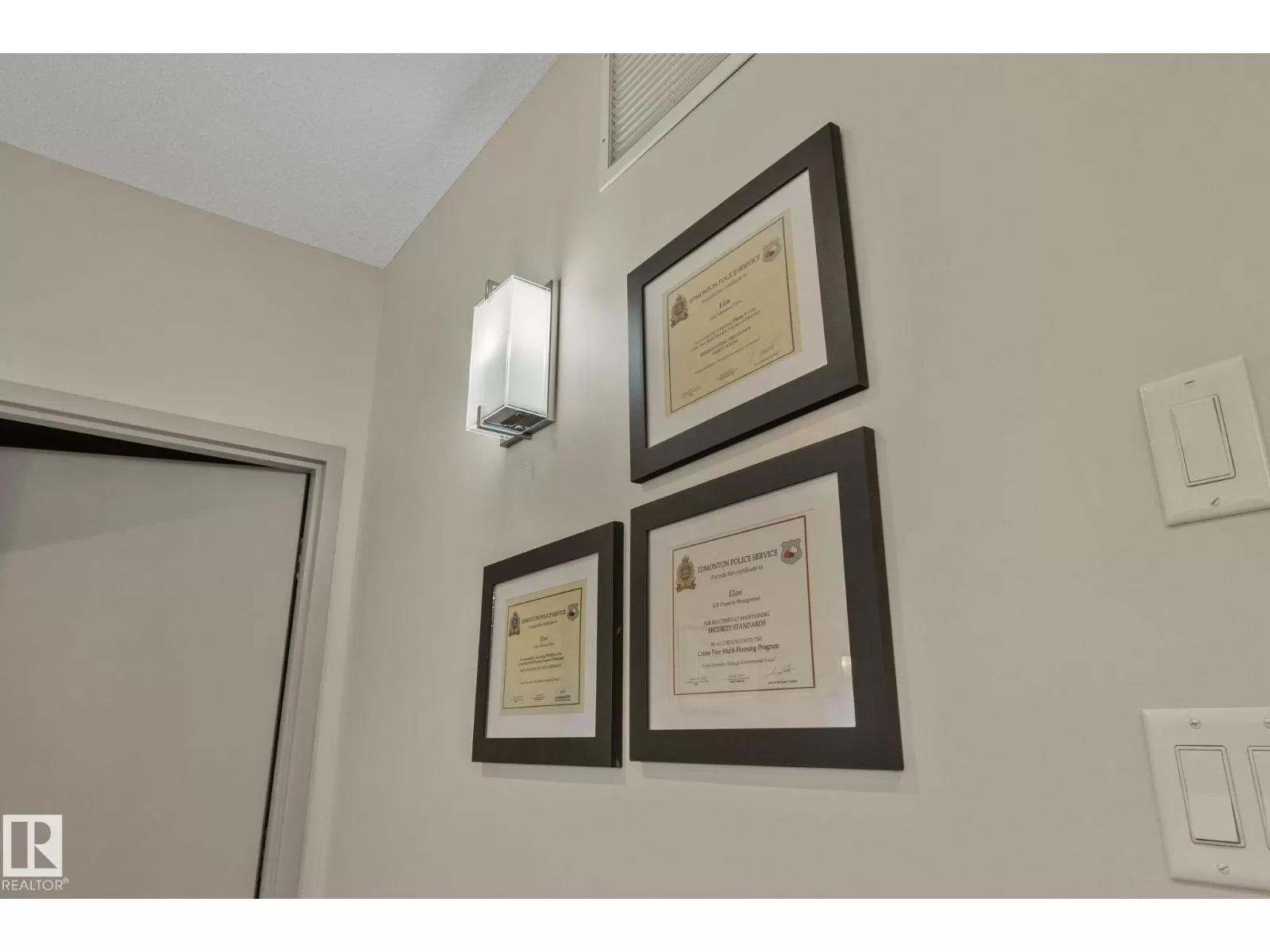 Welcome to top-floor living in the sought-after Elan Building. This bright and spacious two bedroom two bath suite features 9' ceilings, quartz counter tops throughout, maple cabinets, stainless steel appliances, glass tile backsplash, walnut laminate flooring, pendant lighting, convenient in-suite laundry, a pantry and a built in tech centre with extra storage. The primary suite includes a walk-through closet and 4-pc ensuite, while the second bedroom is ideal for children or guest. Unit comes with a titled heated underground parking stall and storage cage. The building features a social room with wet bar and pool table and a well equipped fitness room. Unit also has view of Blackmud Creek Ravine, just minutes from the Anthony Henday, shopping, walking trails, public transit and schools! Elan Condo consistently awarded recognition by Edmonton Police Service for maintaining security standards in accordance with crime-free multi-housing program. (id:27476)