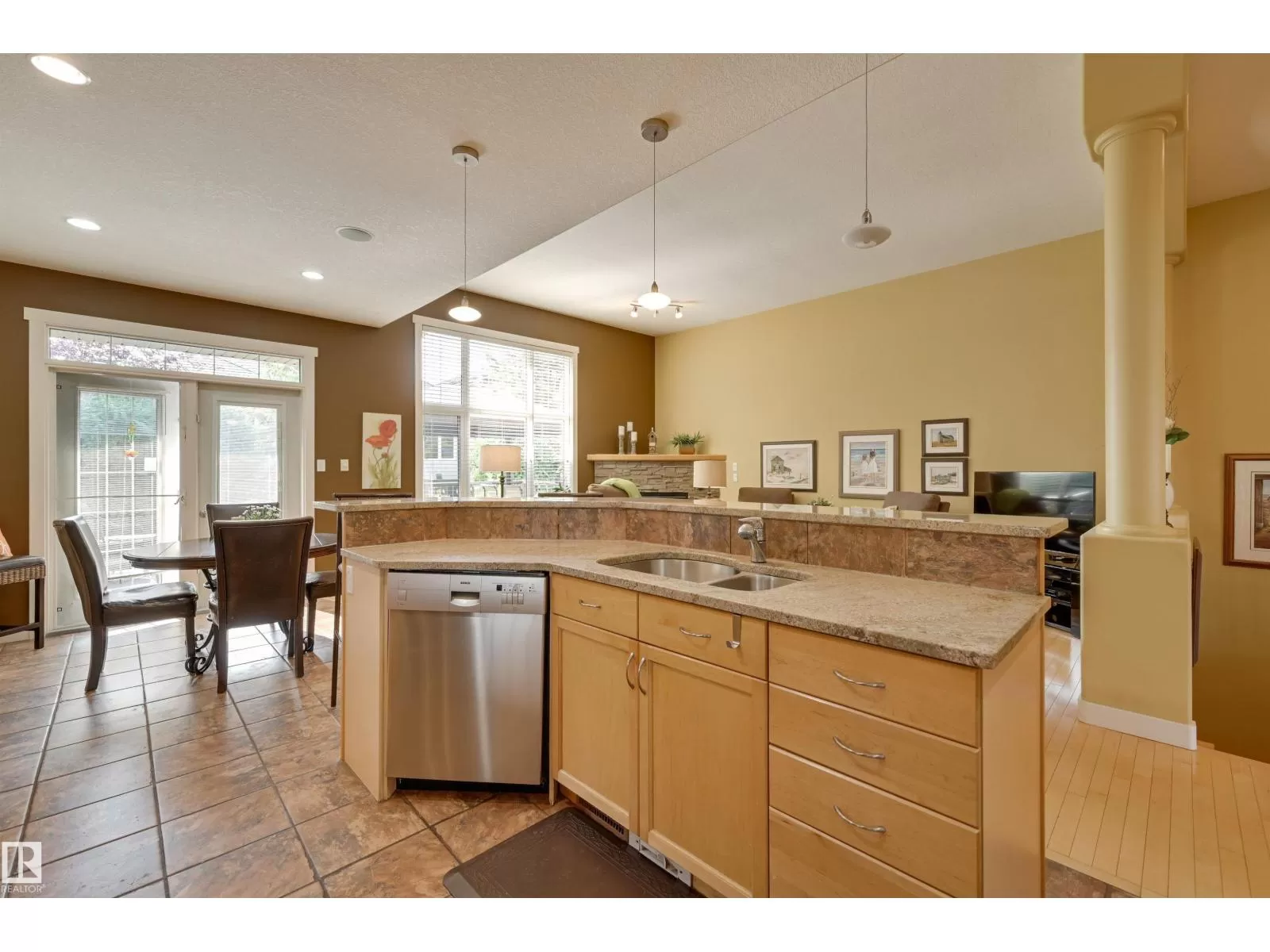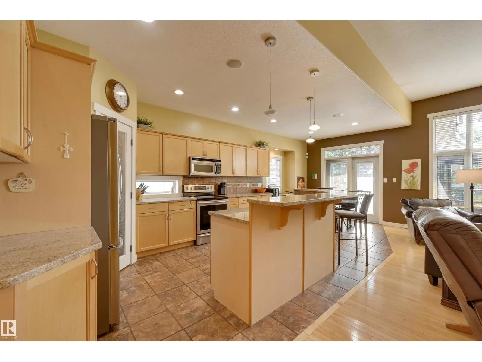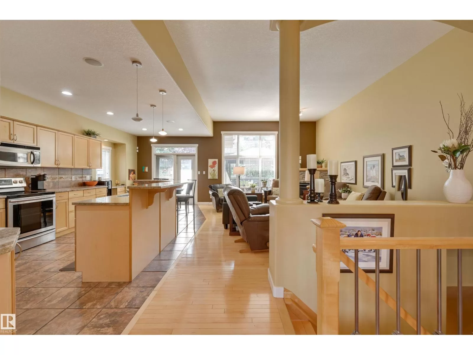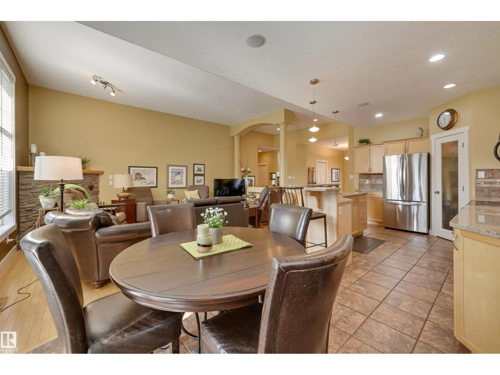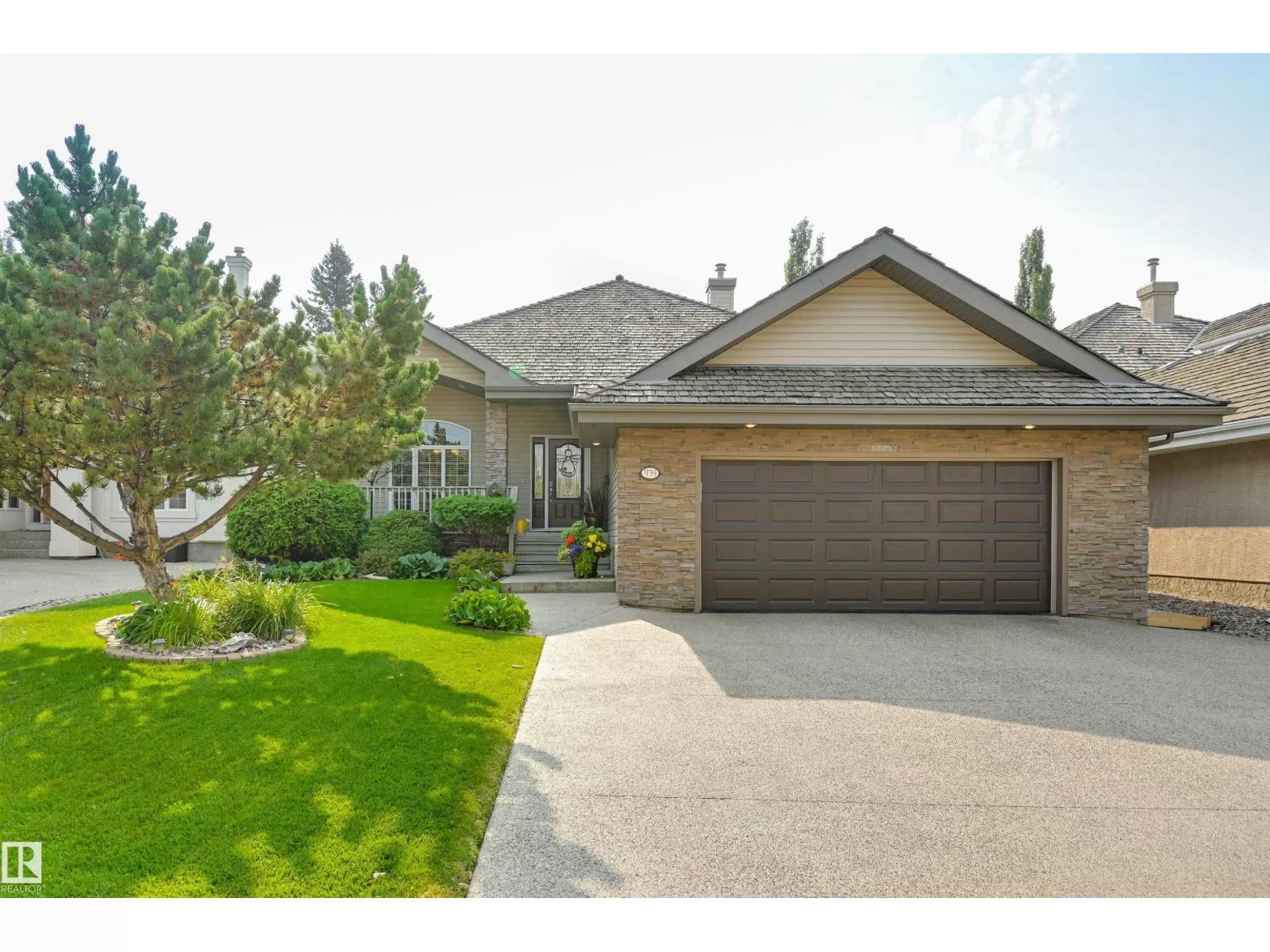 Located in College Woods, this fully finished home offers over 3,000 sq.ft. of living space with thoughtful upgrades throughout. The front veranda welcomes you & hardwood leads past formal dining room into the open concept kitchen with island & breakfast bar, granite counters, pantry, SS appliances, & breakfast nook overlooking the maintenance-free deck & sunny south-facing backyard. You will enjoy the natural light while sitting in the great room with gas fireplace. Enjoy the beautiful backyard view also from your primary bedroom with walk-in closet & 4-pc ensuite. Spacious second bedroom, & full bath, plus laundry complete the main floor. The lower level is perfect for entertaining: wet bar, family/TV room, games area with pool table, two additional bedrooms, & full bath. Enjoy 9 ft ceilings on both levels, abundance of natural light, A/C & in-floor heat, & U/G sprinklers, aggregate driveway. The fully finished double garage has a rubber floor. Quiet location close to trails, parks, & all amenities. (id:27476)