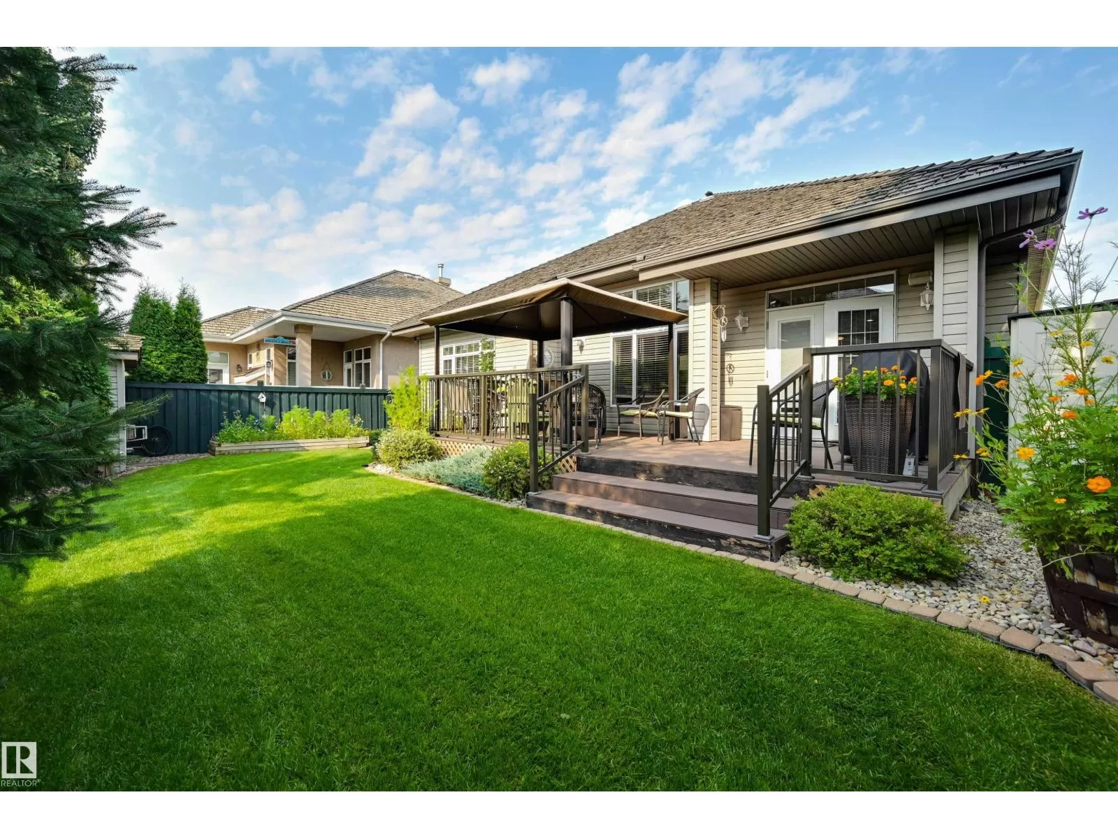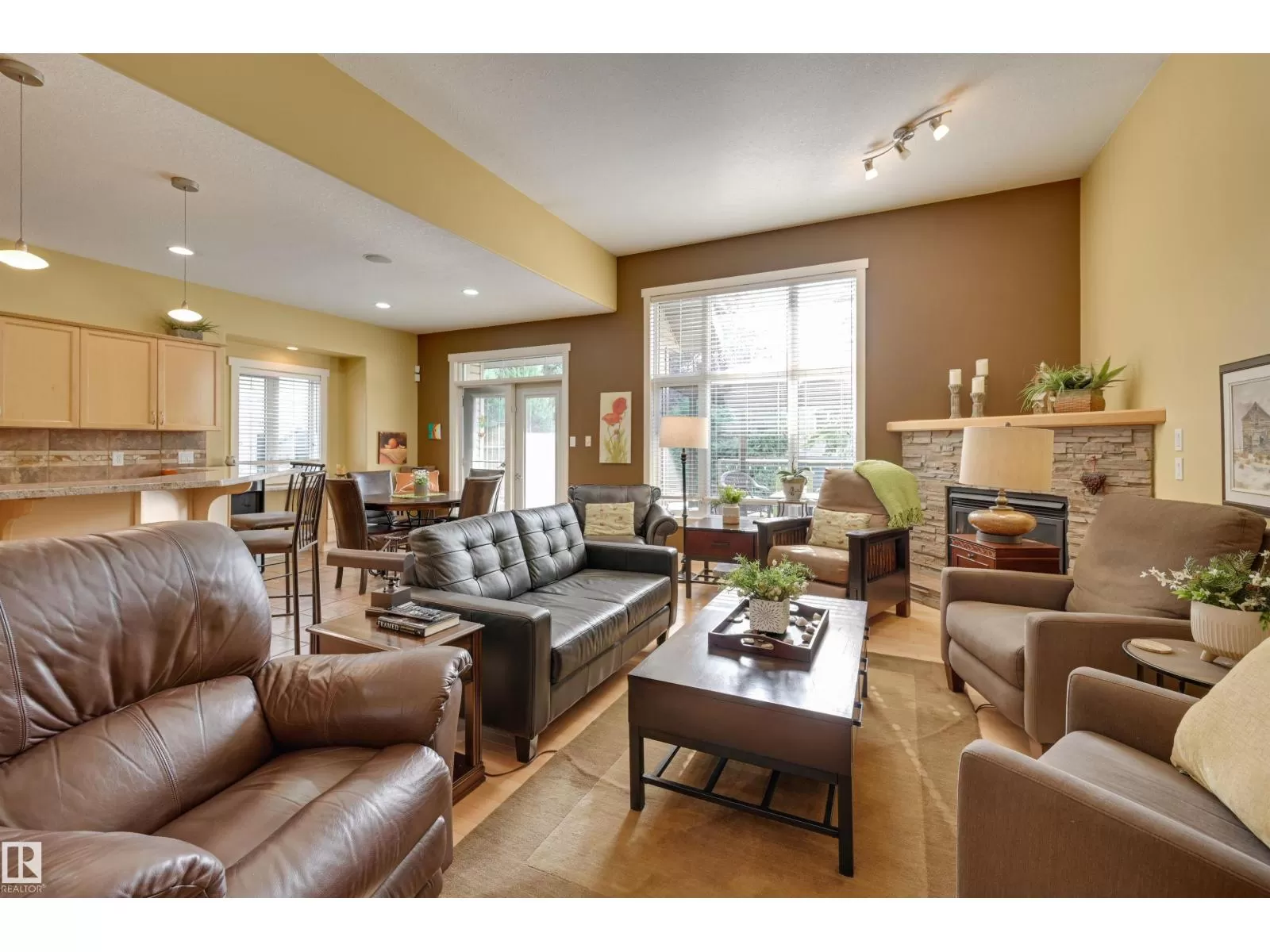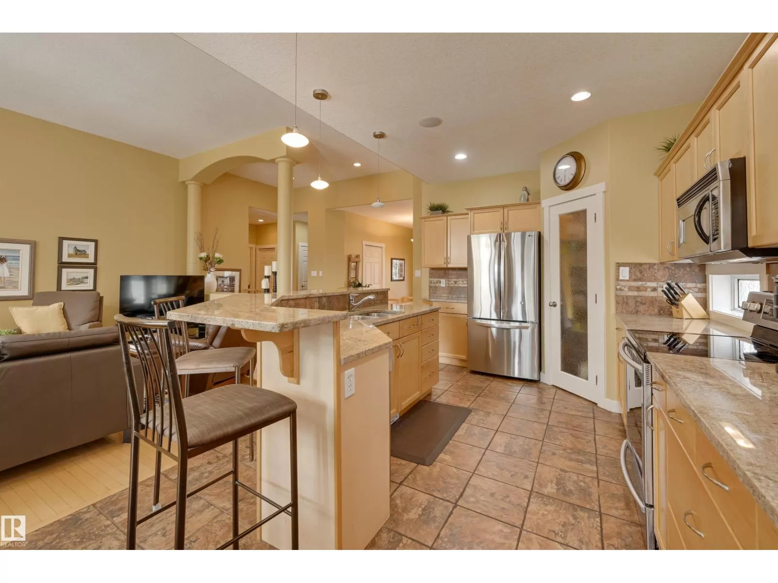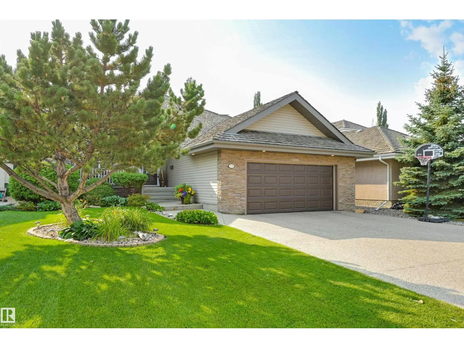 Located in College Woods, this fully finished home offers over 3,000 sq.ft. of living space with thoughtful upgrades throughout. The front veranda welcomes you & hardwood leads past formal dining room into the open concept kitchen with island & breakfast bar, granite counters, pantry, SS appliances, & breakfast nook overlooking the maintenance-free deck & sunny south-facing backyard. You will enjoy the natural light while sitting in the great room with gas fireplace. Enjoy the beautiful backyard view also from your primary bedroom with walk-in closet & 4-pc ensuite. Spacious second bedroom, & full bath, plus laundry complete the main floor. The lower level is perfect for entertaining: wet bar, family/TV room, games area with pool table, two additional bedrooms, & full bath. Enjoy 9 ft ceilings on both levels, abundance of natural light, A/C & in-floor heat, & U/G sprinklers, aggregate driveway. The fully finished double garage has a rubber floor. Quiet location close to trails, parks, & all amenities. (id:27476)