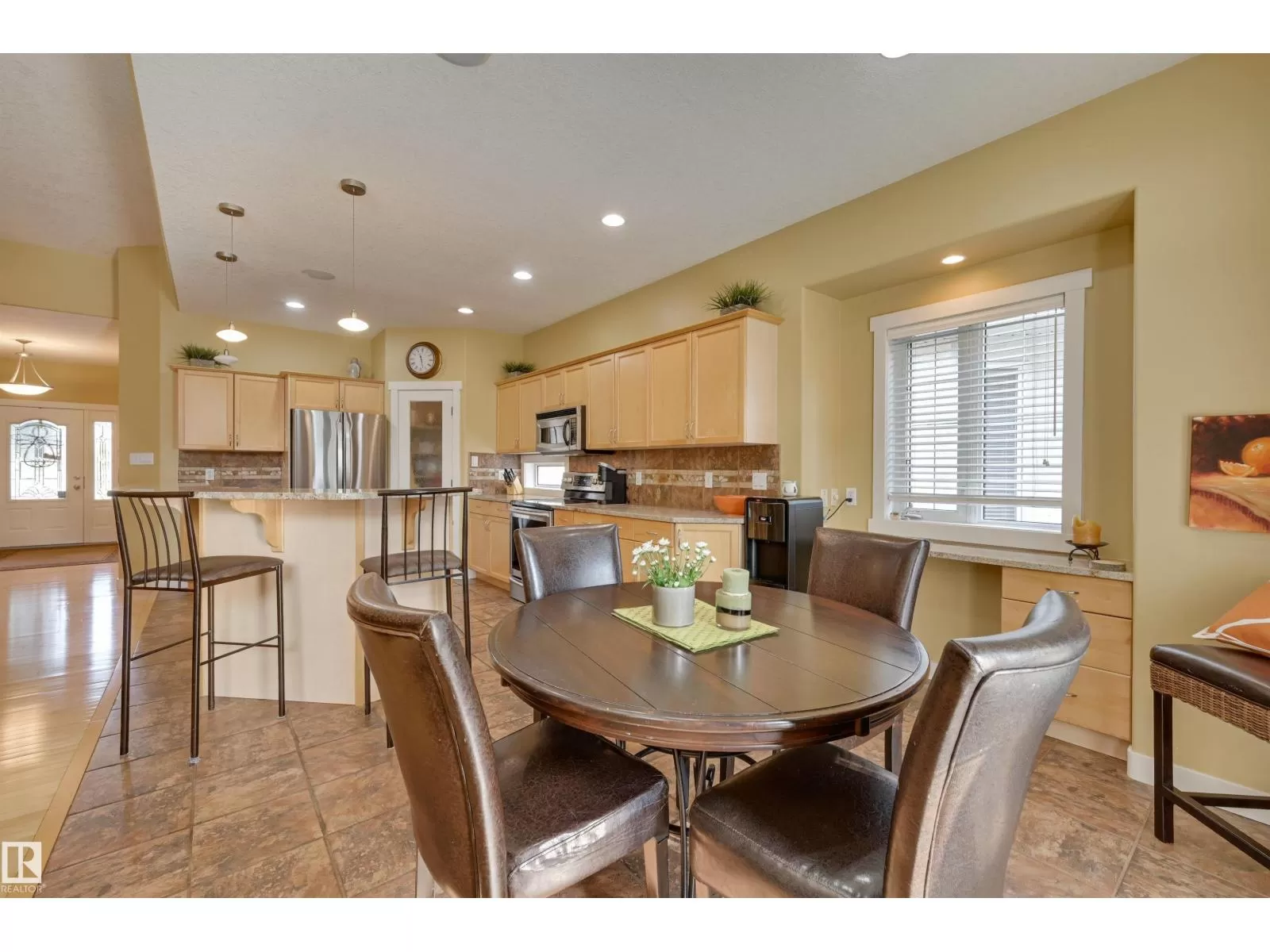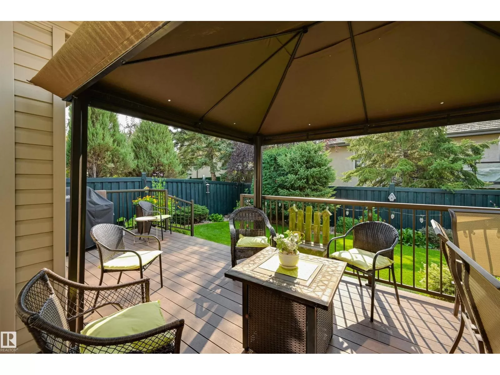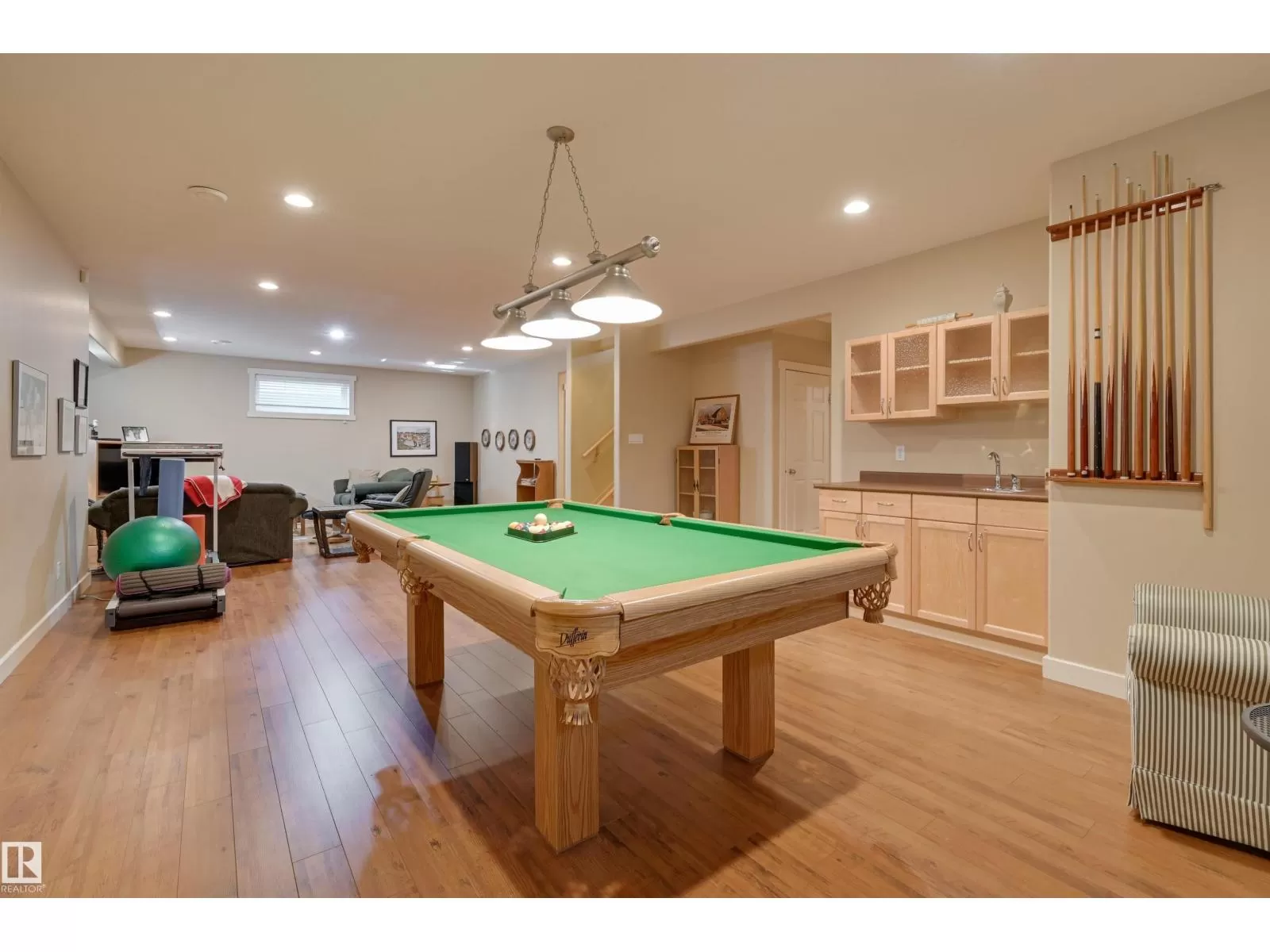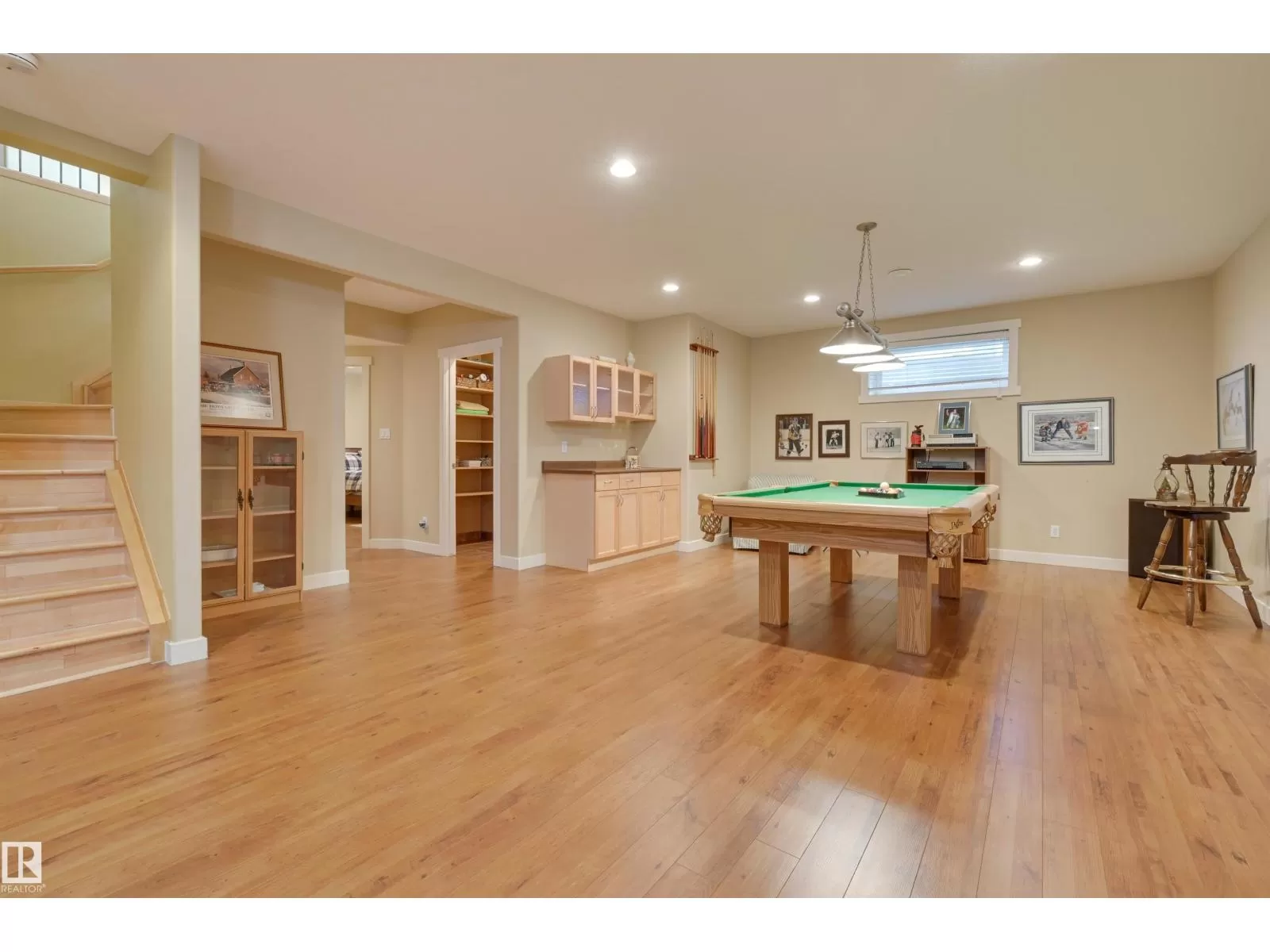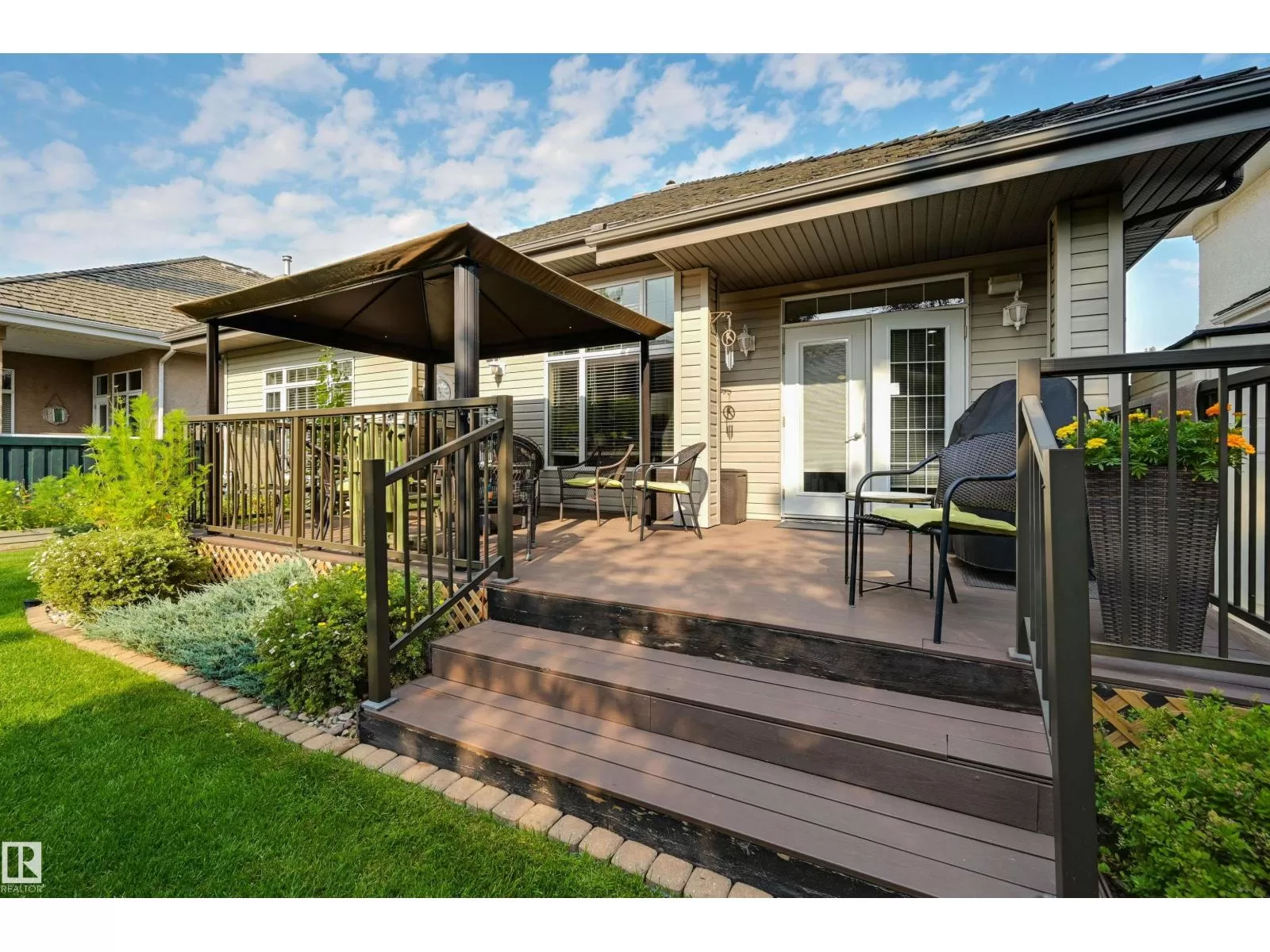 Located in College Woods, this fully finished home offers over 3,000 sq.ft. of living space with thoughtful upgrades throughout. The front veranda welcomes you & hardwood leads past formal dining room into the open concept kitchen with island & breakfast bar, granite counters, pantry, SS appliances, & breakfast nook overlooking the maintenance-free deck & sunny south-facing backyard. You will enjoy the natural light while sitting in the great room with gas fireplace. Enjoy the beautiful backyard view also from your primary bedroom with walk-in closet & 4-pc ensuite. Spacious second bedroom, & full bath, plus laundry complete the main floor. The lower level is perfect for entertaining: wet bar, family/TV room, games area with pool table, two additional bedrooms, & full bath. Enjoy 9 ft ceilings on both levels, abundance of natural light, A/C & in-floor heat, & U/G sprinklers, aggregate driveway. The fully finished double garage has a rubber floor. Quiet location close to trails, parks, & all amenities. (id:27476)