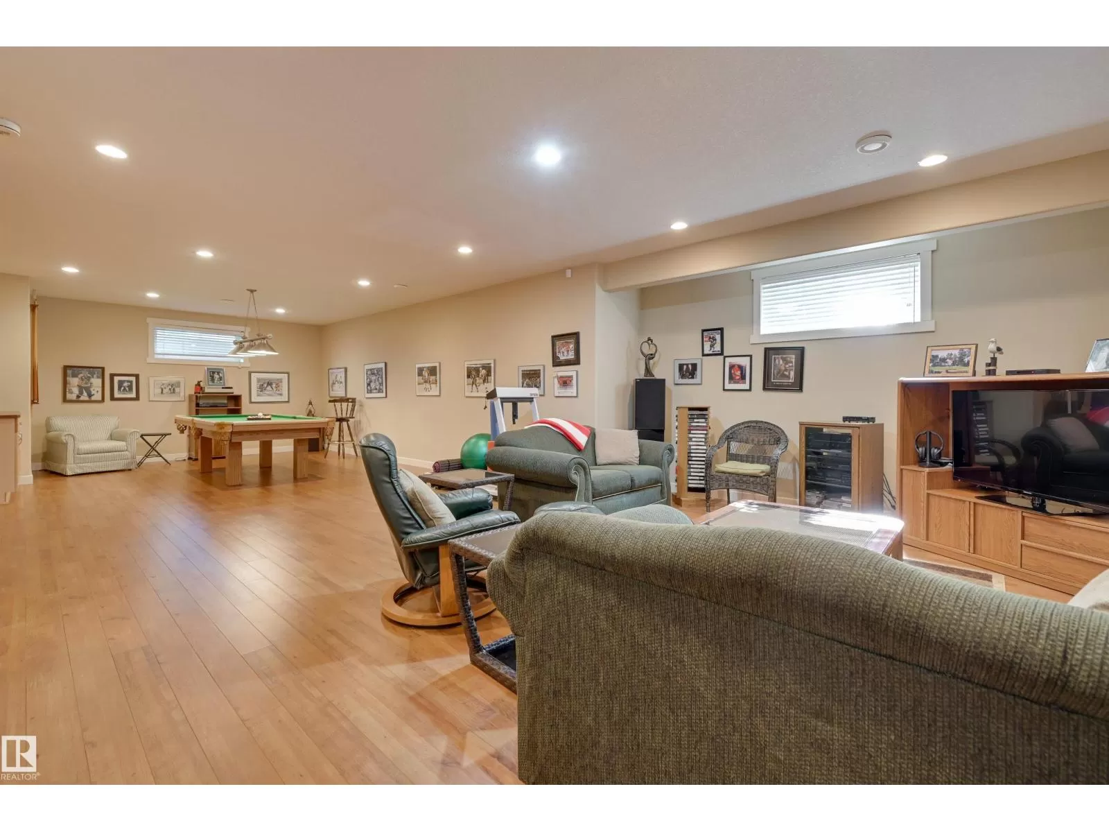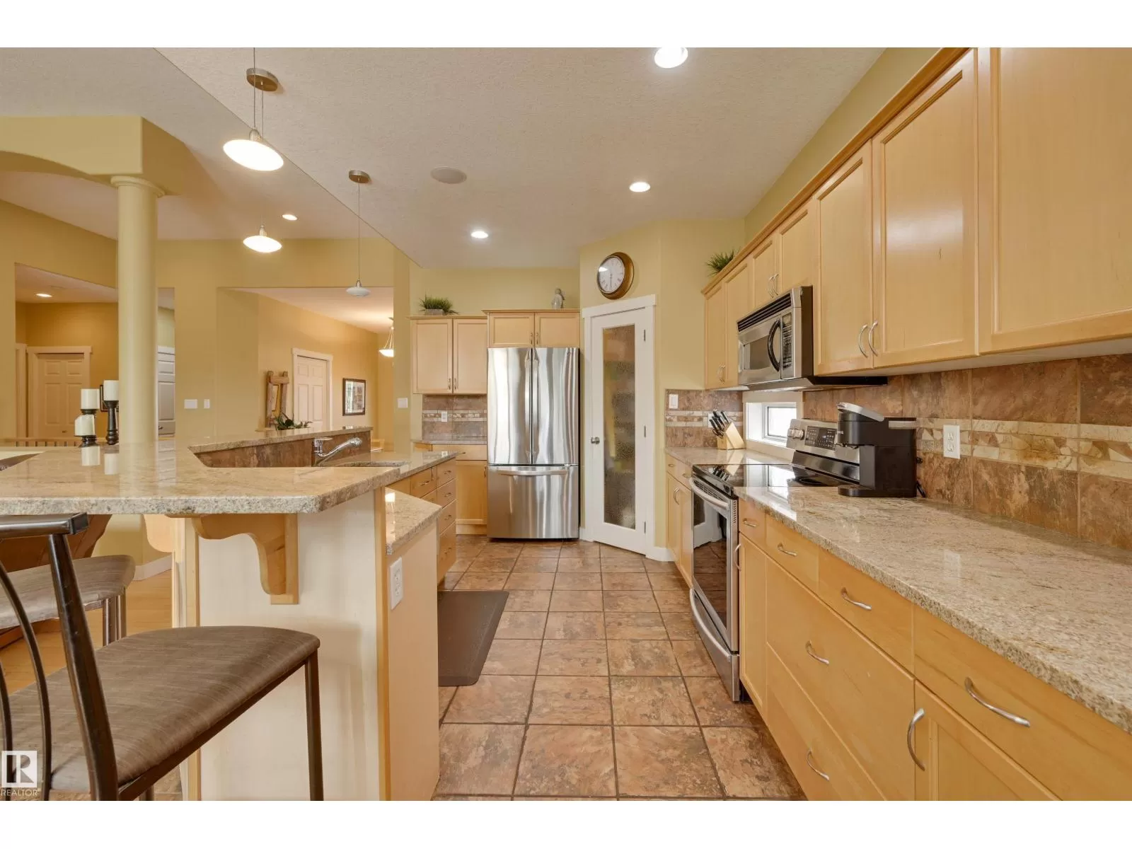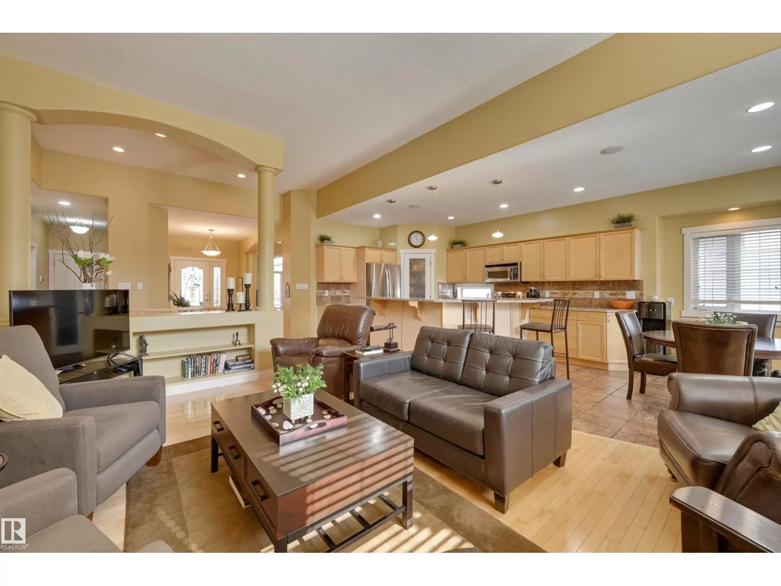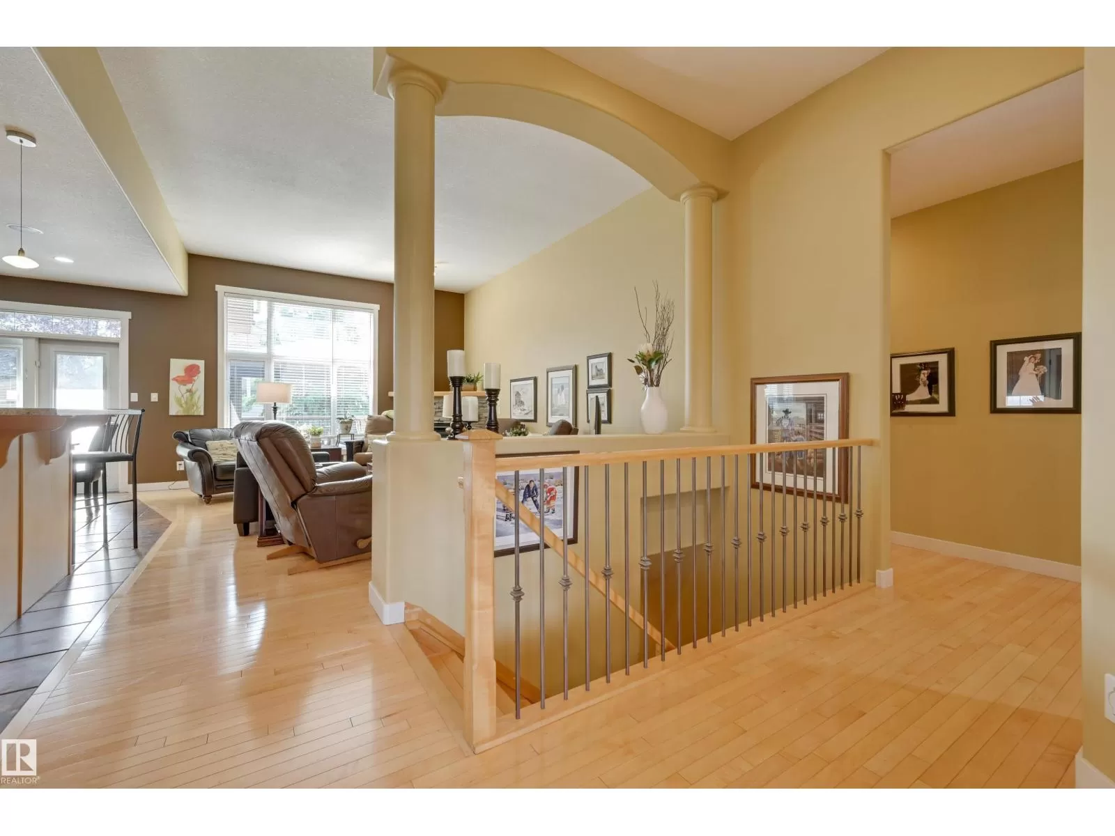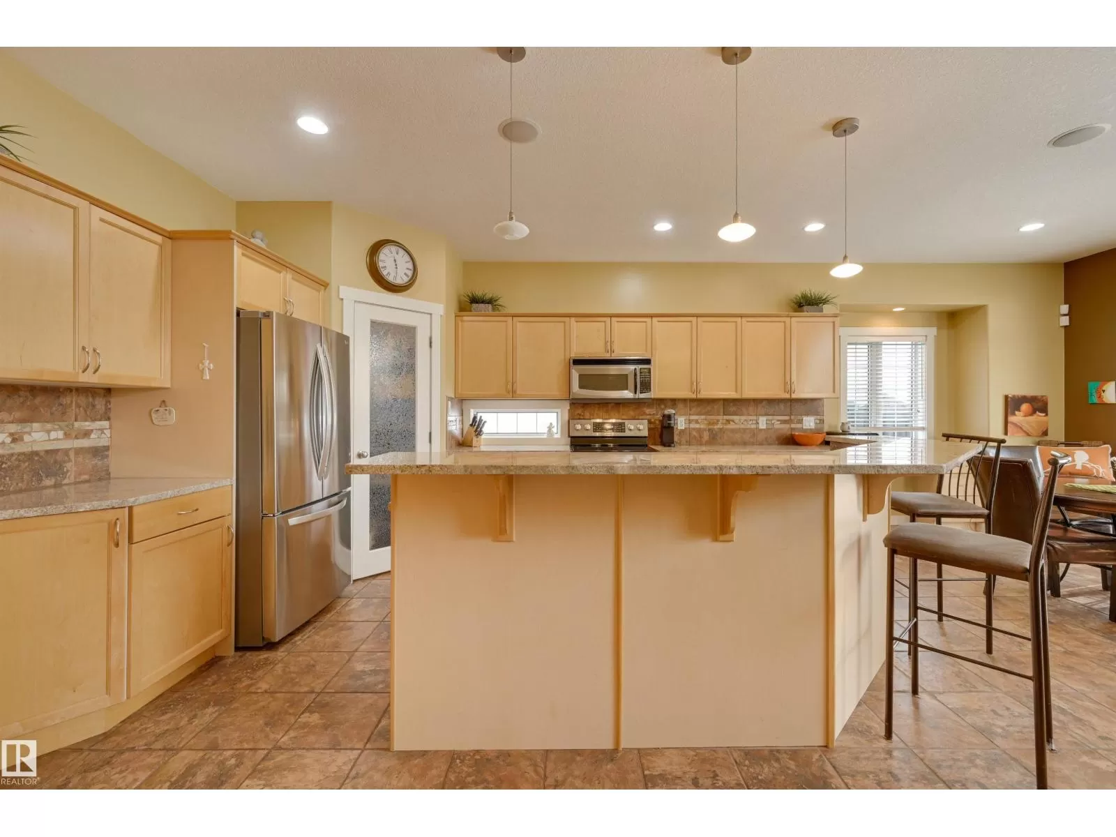 Located in College Woods, this fully finished home offers over 3,000 sq.ft. of living space with thoughtful upgrades throughout. The front veranda welcomes you & hardwood leads past formal dining room into the open concept kitchen with island & breakfast bar, granite counters, pantry, SS appliances, & breakfast nook overlooking the maintenance-free deck & sunny south-facing backyard. You will enjoy the natural light while sitting in the great room with gas fireplace. Enjoy the beautiful backyard view also from your primary bedroom with walk-in closet & 4-pc ensuite. Spacious second bedroom, & full bath, plus laundry complete the main floor. The lower level is perfect for entertaining: wet bar, family/TV room, games area with pool table, two additional bedrooms, & full bath. Enjoy 9 ft ceilings on both levels, abundance of natural light, A/C & in-floor heat, & U/G sprinklers, aggregate driveway. The fully finished double garage has a rubber floor. Quiet location close to trails, parks, & all amenities. (id:27476)