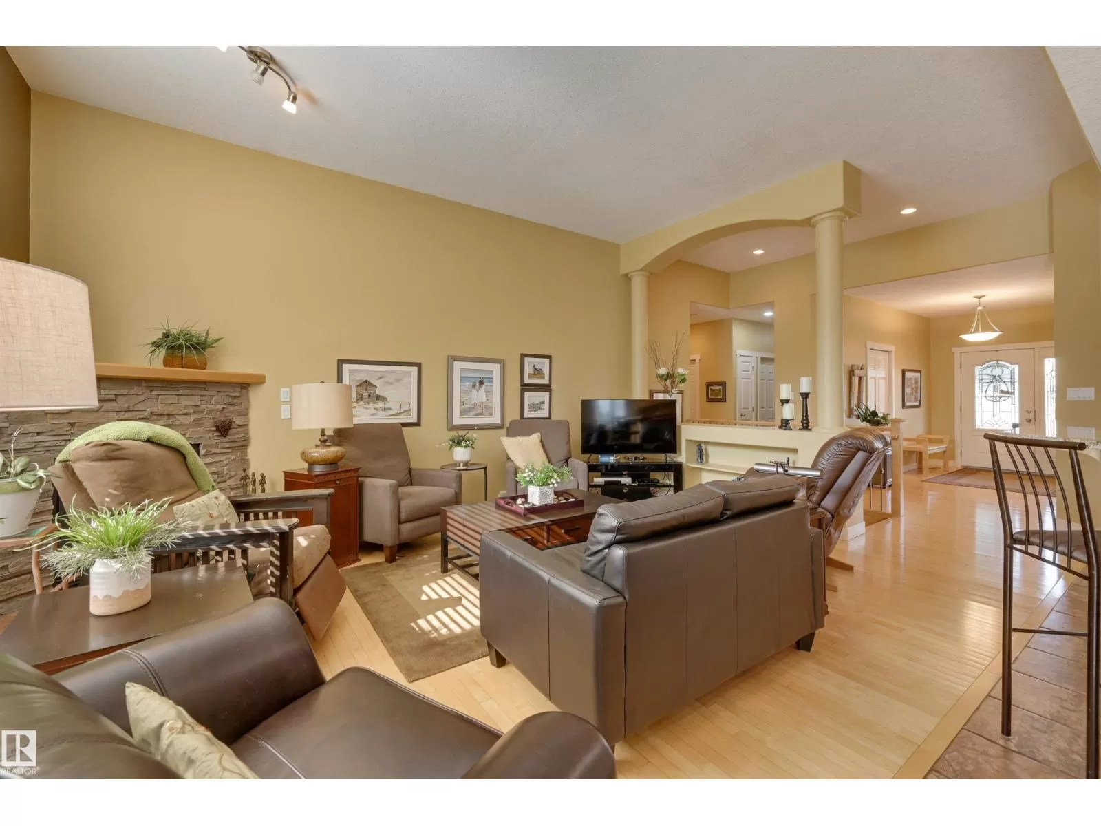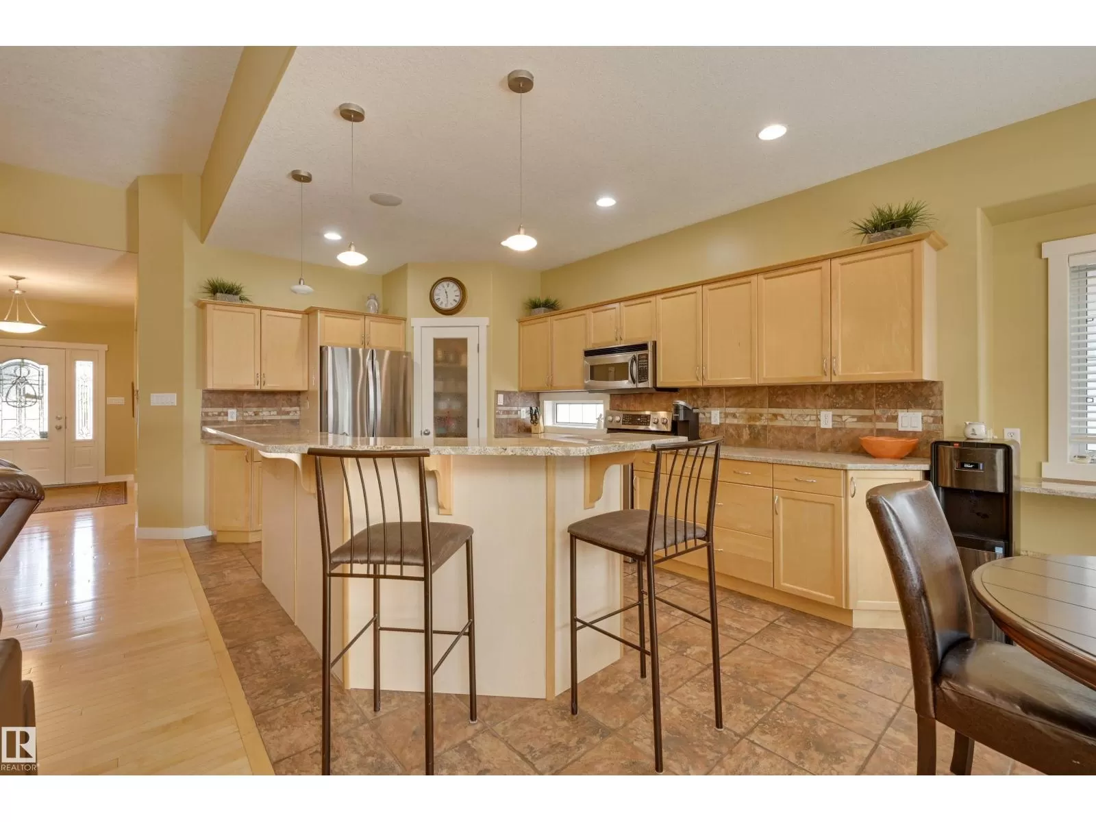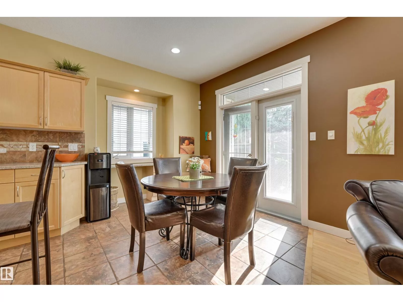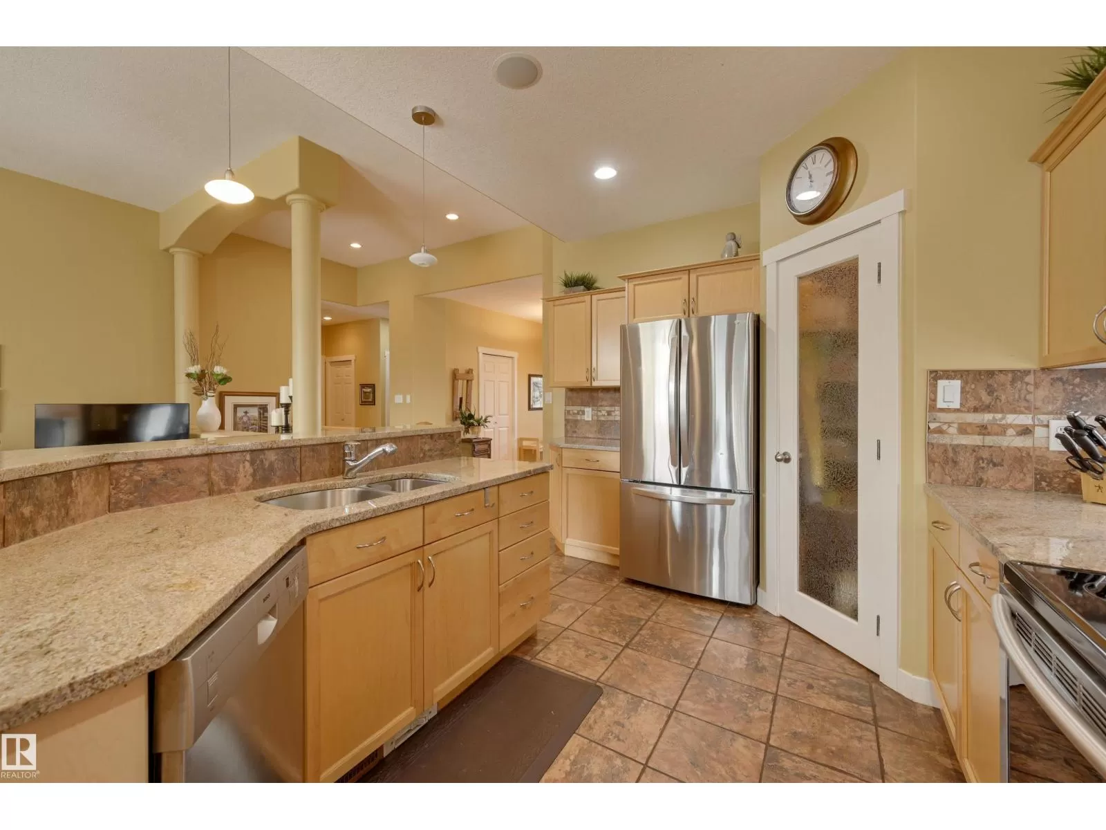 Located in College Woods, this fully finished home offers over 3,000 sq.ft. of living space with thoughtful upgrades throughout. The front veranda welcomes you & hardwood leads past formal dining room into the open concept kitchen with island & breakfast bar, granite counters, pantry, SS appliances, & breakfast nook overlooking the maintenance-free deck & sunny south-facing backyard. You will enjoy the natural light while sitting in the great room with gas fireplace. Enjoy the beautiful backyard view also from your primary bedroom with walk-in closet & 4-pc ensuite. Spacious second bedroom, & full bath, plus laundry complete the main floor. The lower level is perfect for entertaining: wet bar, family/TV room, games area with pool table, two additional bedrooms, & full bath. Enjoy 9 ft ceilings on both levels, abundance of natural light, A/C & in-floor heat, & U/G sprinklers, aggregate driveway. The fully finished double garage has a rubber floor. Quiet location close to trails, parks, & all amenities. (id:27476)