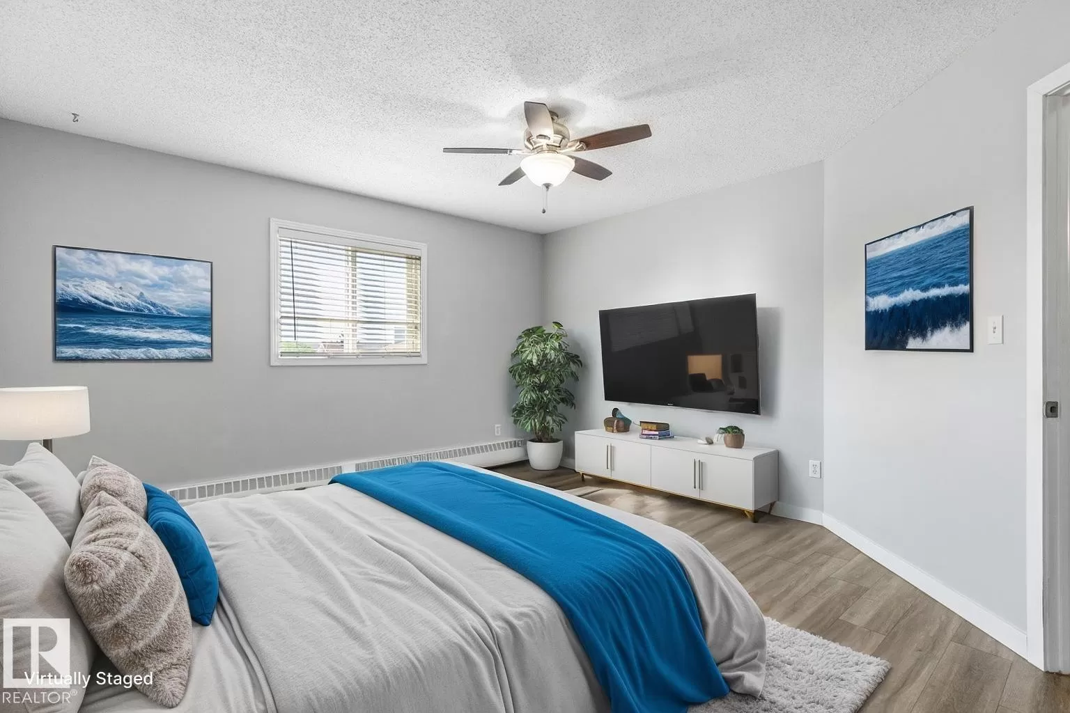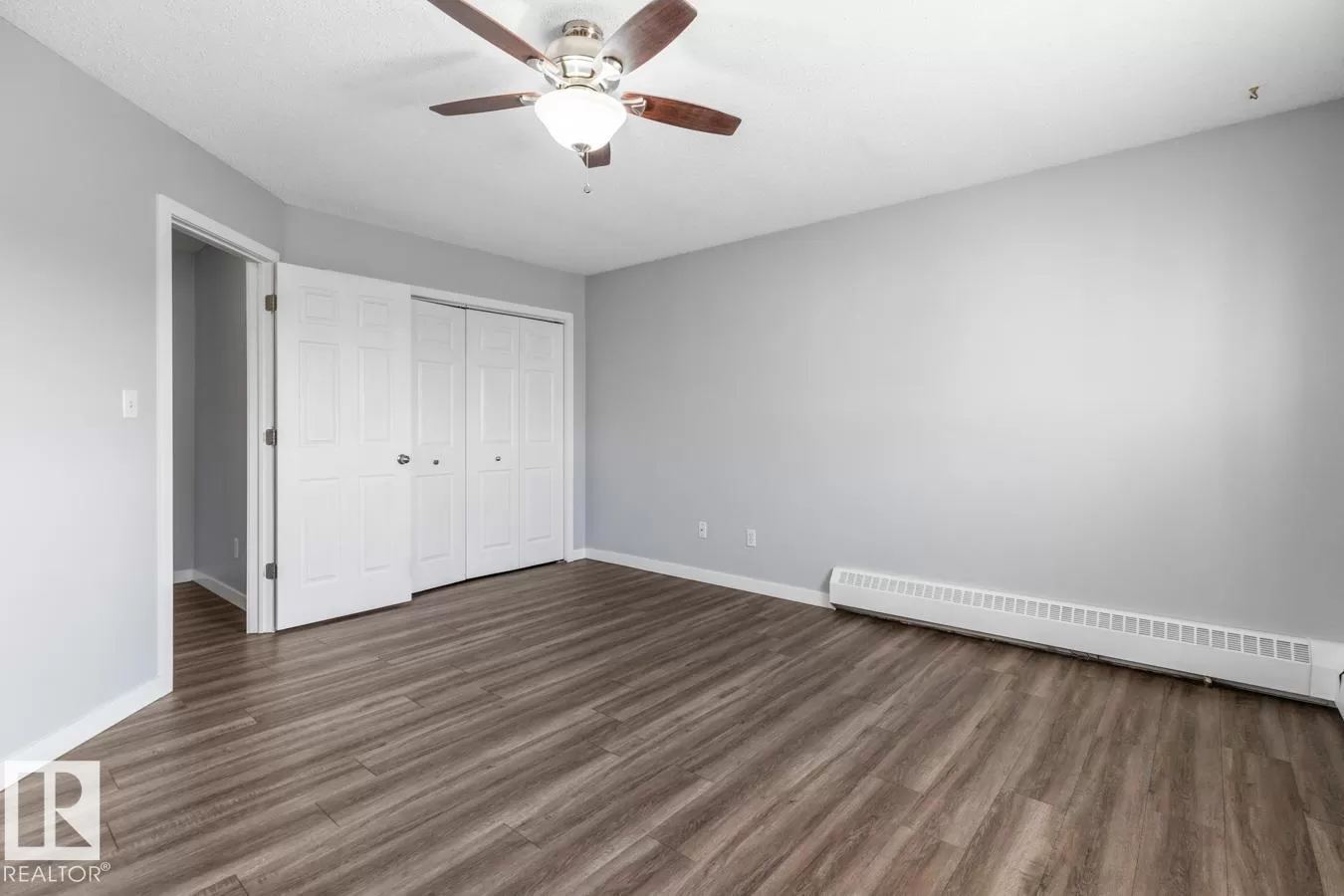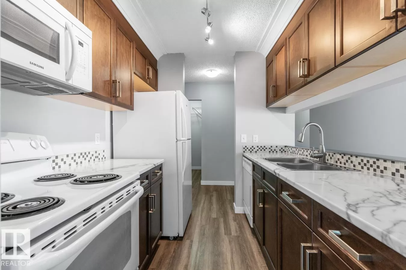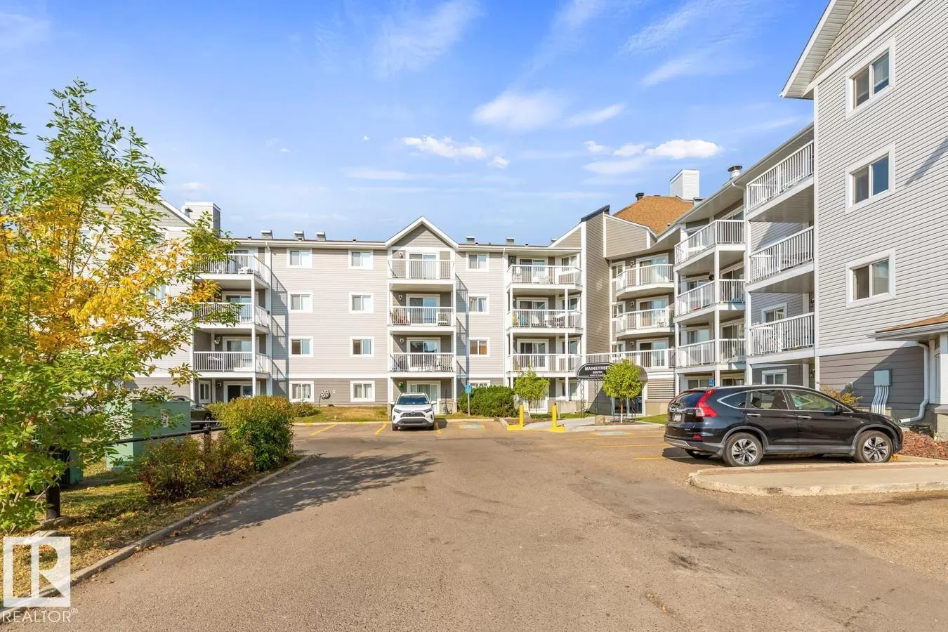 This top-floor 2 bedroom, 1 bath condo in Mainstreet South is sure to impress! Ideally located just minutes from all amenities, this home features vinyl plank flooring throughout a bright and spacious layout. The kitchen offers ample cabinetry, white appliances, and overlooks the dining area and living room, complete with AC and access to the sunny southwest-facing patio. Two king-sized bedrooms, a 4pc bath, in-suite laundry, and extra storage complete the space. Enjoy low condo fees that include heat & water in this well-managed, pet-friendly complex. Move-in ready, welcome to your new Home Sweet Home! (id:27476)