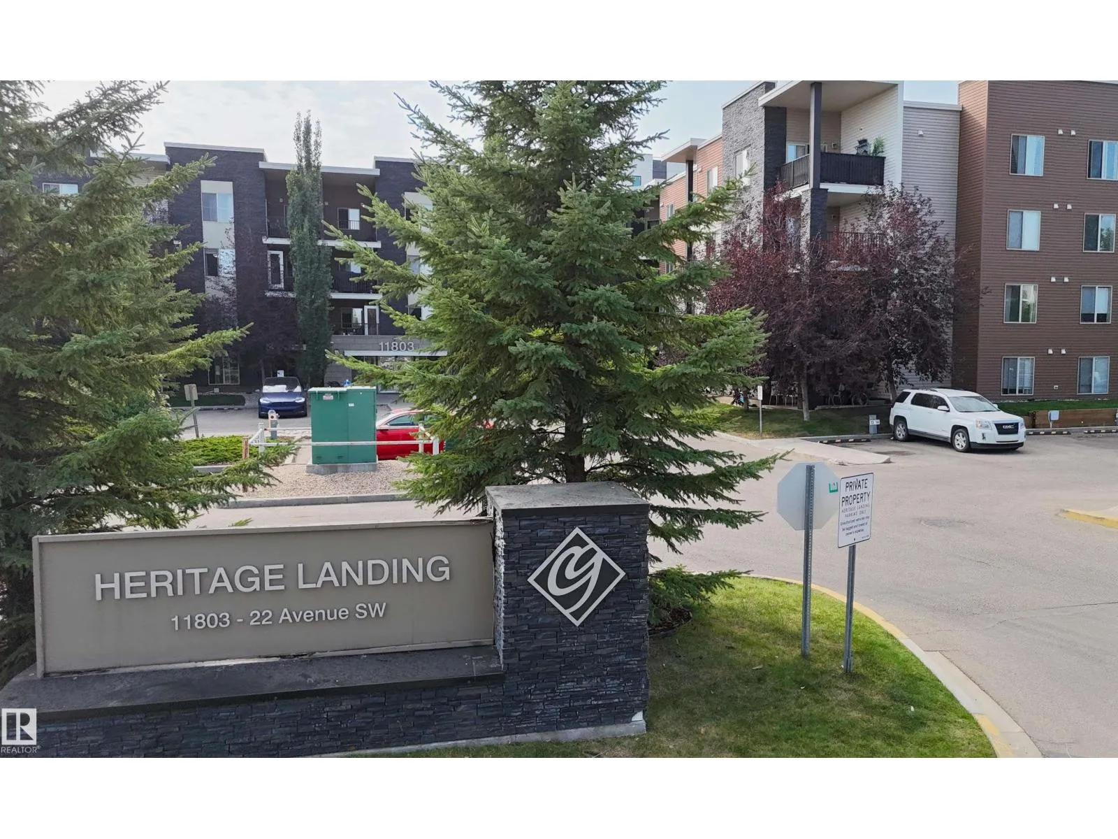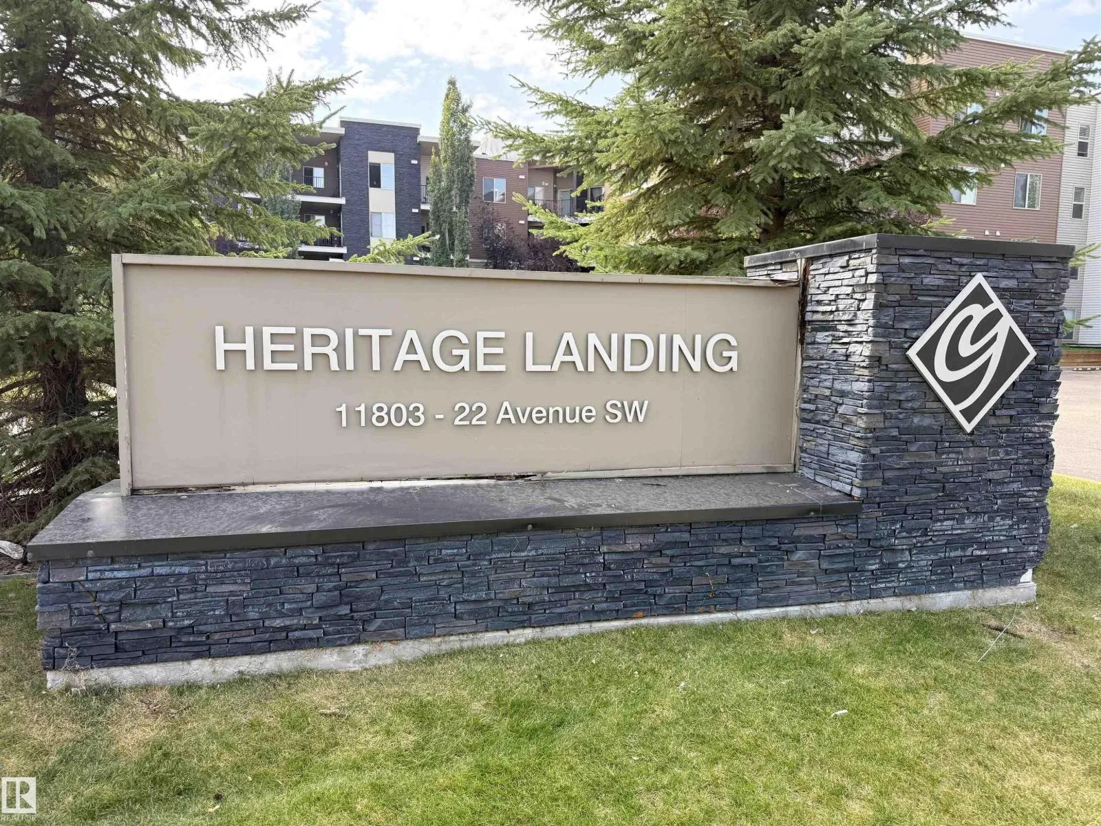 Ground floor CORNER UNIT in Heritage Landing, a beautiful 2013-built condo complex, steps to a large pond with walking trail in Heritage Valley Town Centre. This 971 square foot home features an in-suite laundry room, air conditioning, two full bathrooms and 2 bedrooms including the ownerâs suite with walk-through closet & 4-piece ensuite. The open concept main living area boasts a kitchen with eat-up peninsula & granite counters, centrally located dining area with ceiling fan, bright living room with large south-east & south-west facing windows, sliding door access to a covered concrete patio and an additional flex space that makes a perfect home office. Parking includes a titled stall with 10â x 5â locked storage room in the heated underground parkade. Great location a short walk to Superstore, library, shopping and many walking trails. A short 15 minute drive to the Edmonton International Airport, easy access to QE Highway 2 and Anthony Henday Drive. Fantastic opportunity! (id:27476)