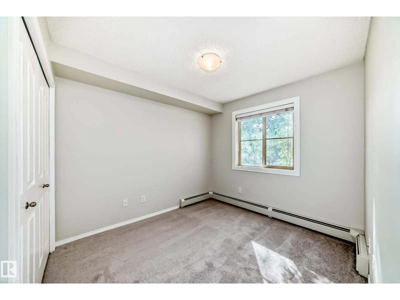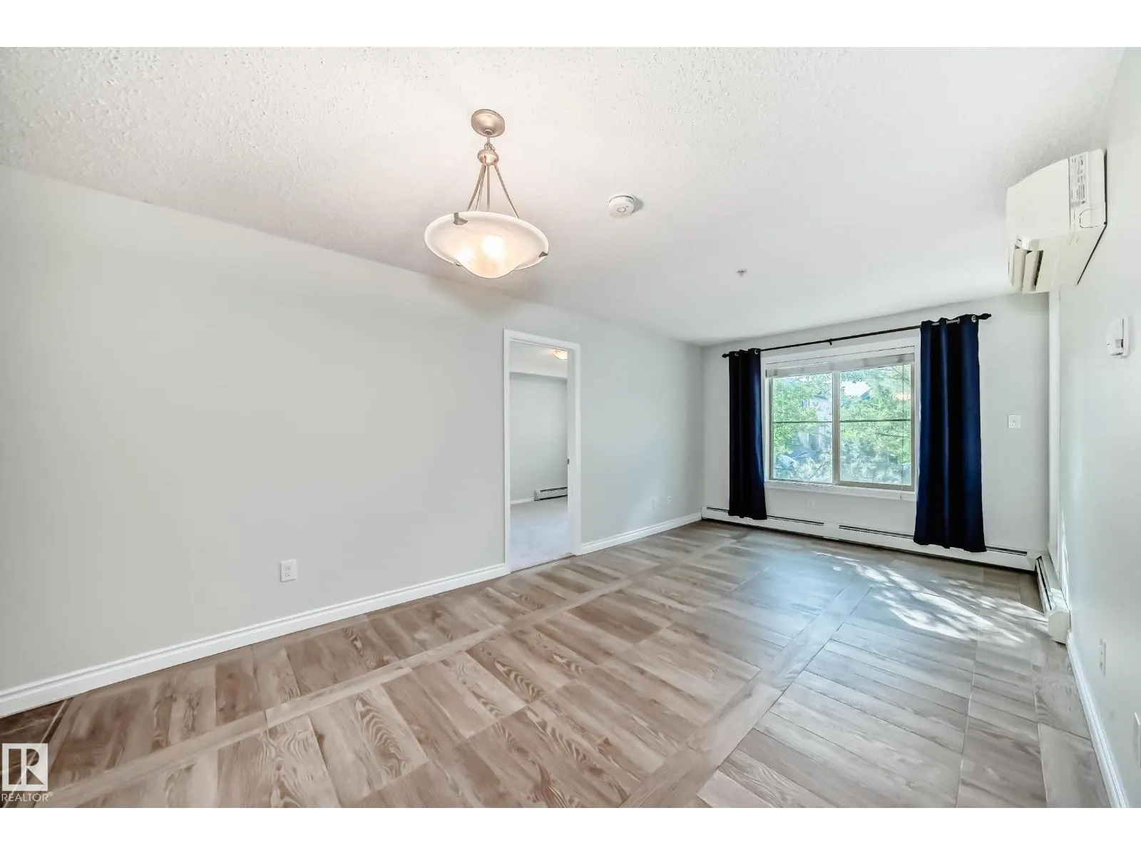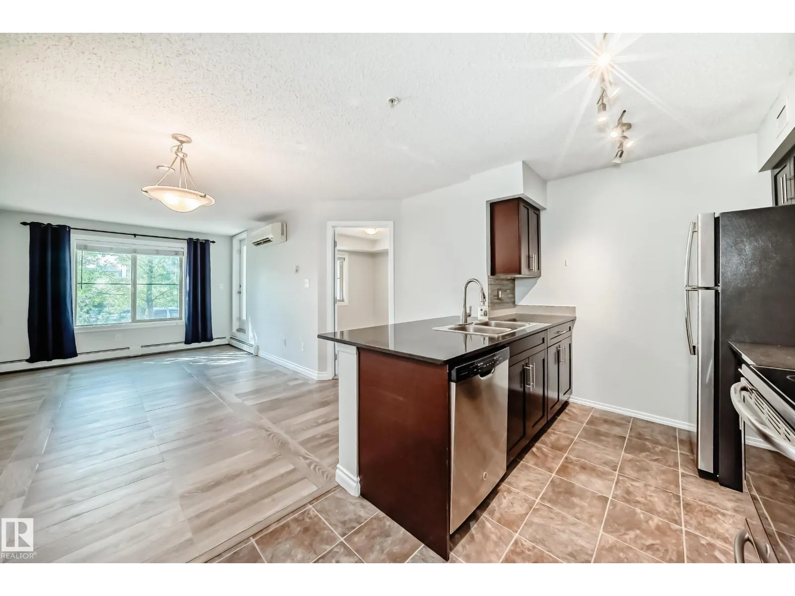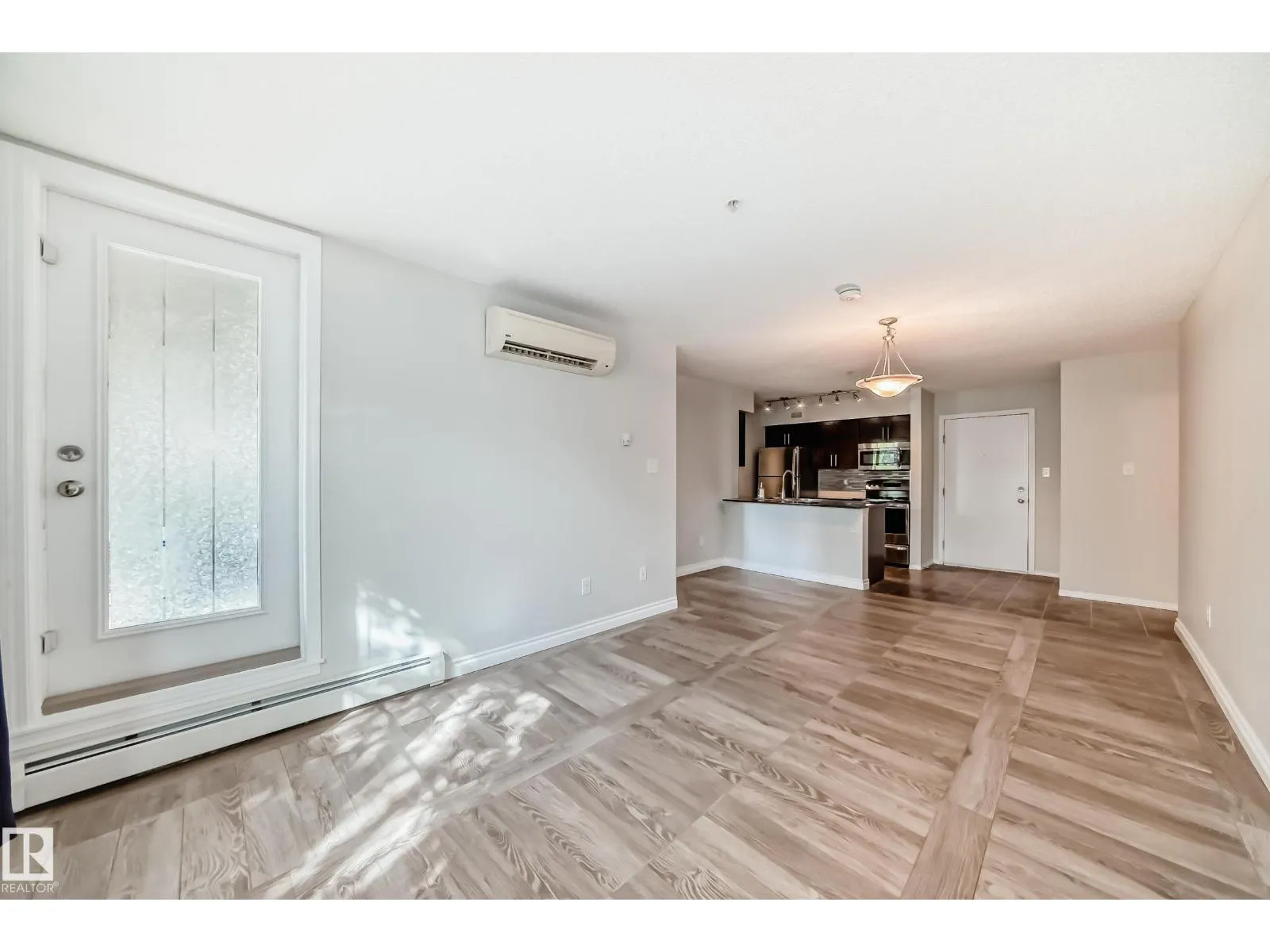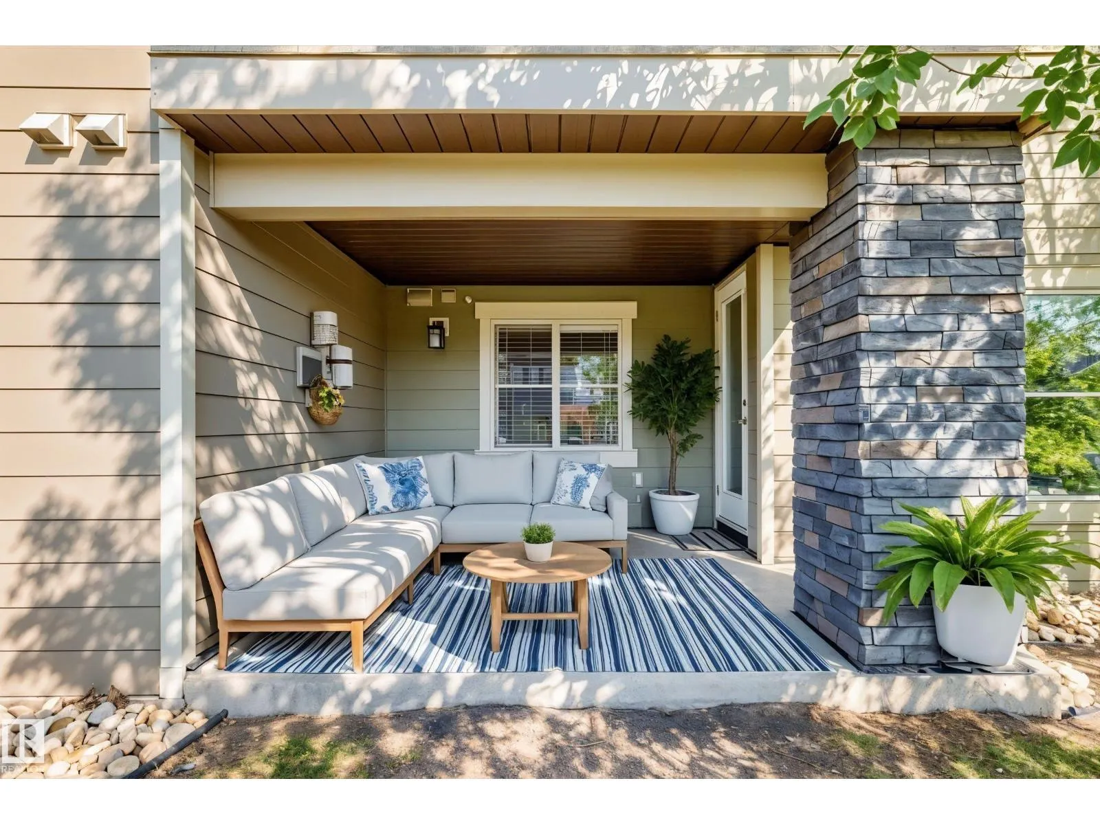 Welcome to McConachie - this is the one! Spacious 763 sq.ft main floor unit with 2 bedrooms, 2 bathrooms, den, 2 parking stalls, in-suite laundry and A/C, all in one stylish package! Enter this well-maintained unit and you are greeted with an open and bright floor plan, new flooring, and window view of mature trees. The kitchen boasts a peninsula style island with s/s appliances. The living and dining areas blend seamlessly together offering easy access to the south-facing covered patio. This unit faces McConachie Dr., providing the added benefit of convenient street parking and direct access to the unit perfect for you and your guests. The primary bedroom has a walk-through closet and private 4-piece ensuite with tiled shower. The second bedroom is also a good size able to fit a queen size bed. Complete the package with the heated underground and surface parking stalls. The complex is pet-friendly and within walking distance of schools, bus stops, & more amenities by vehicle including the Anthony Henday. (id:27476)