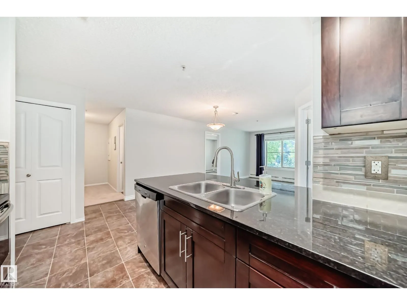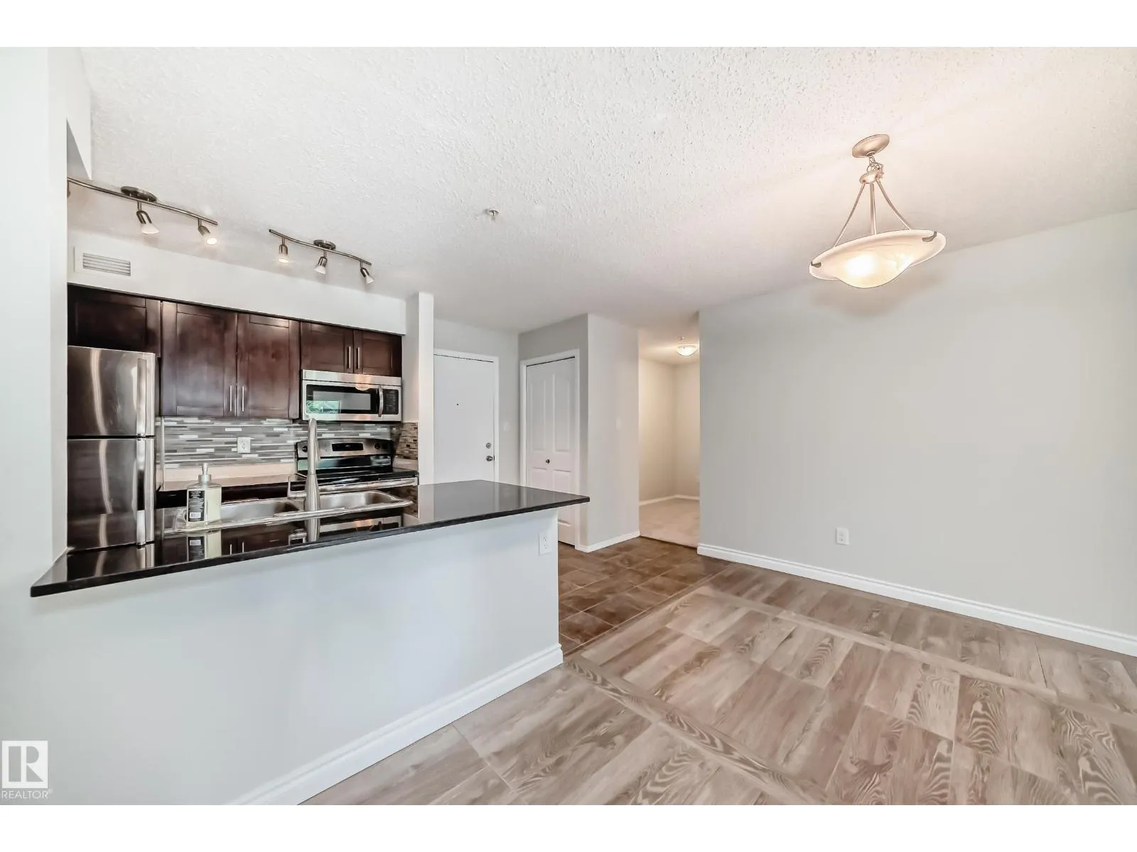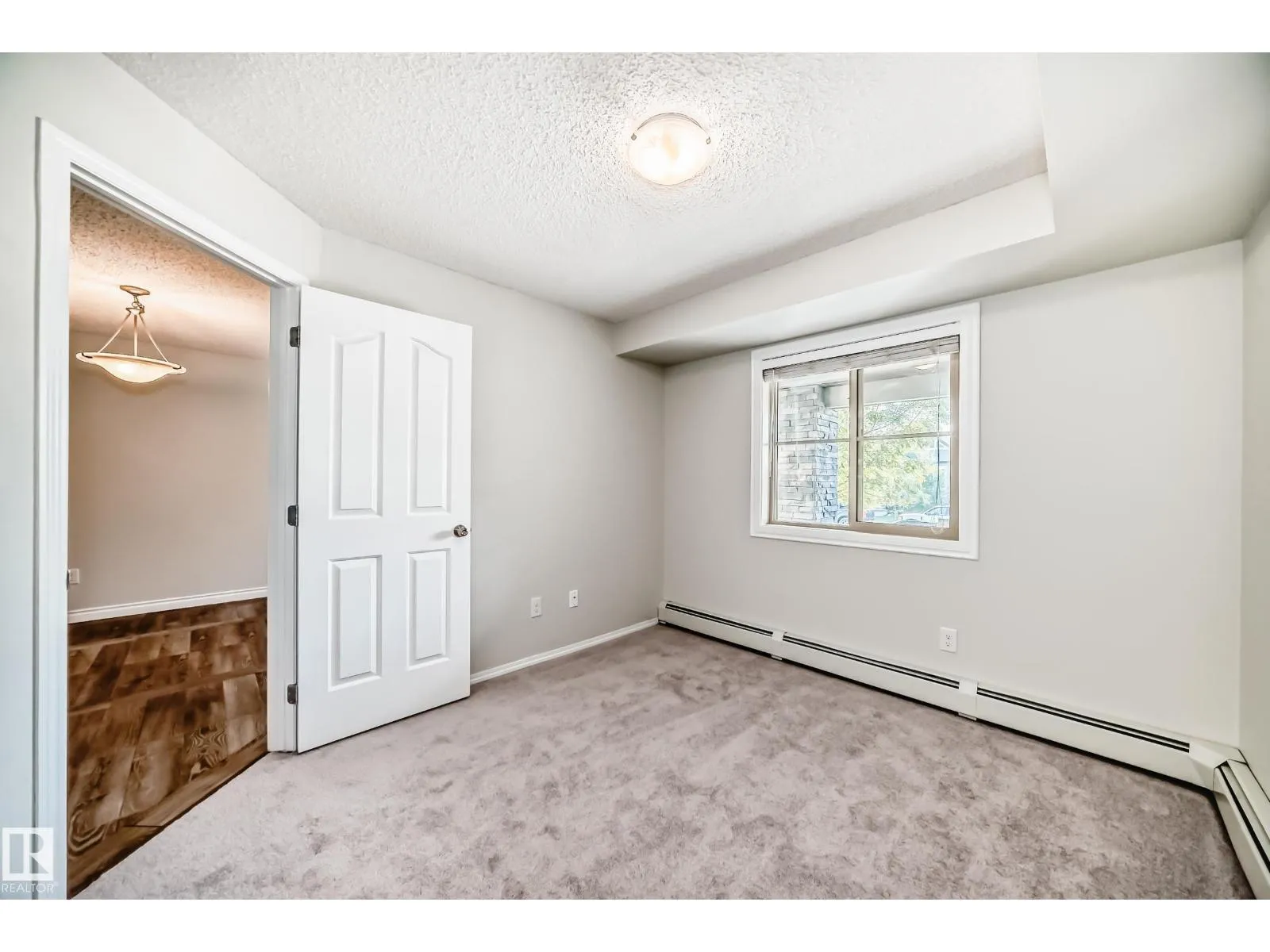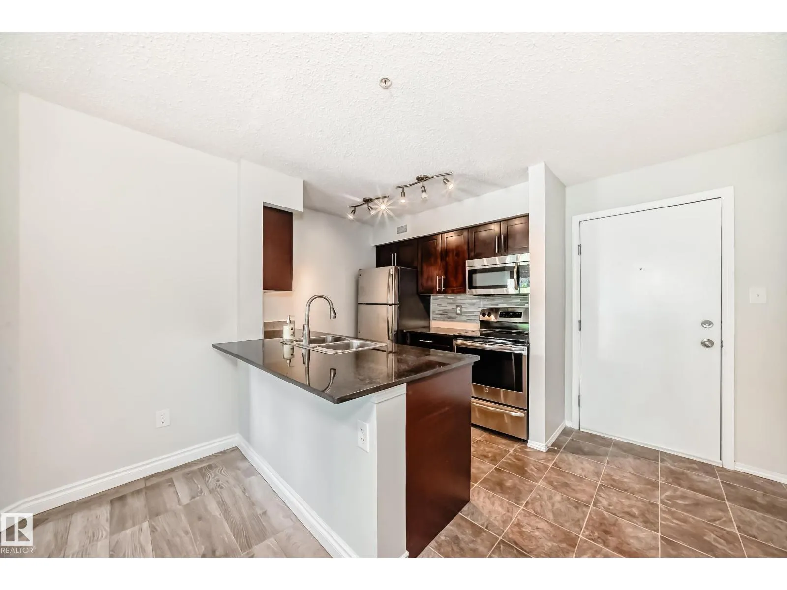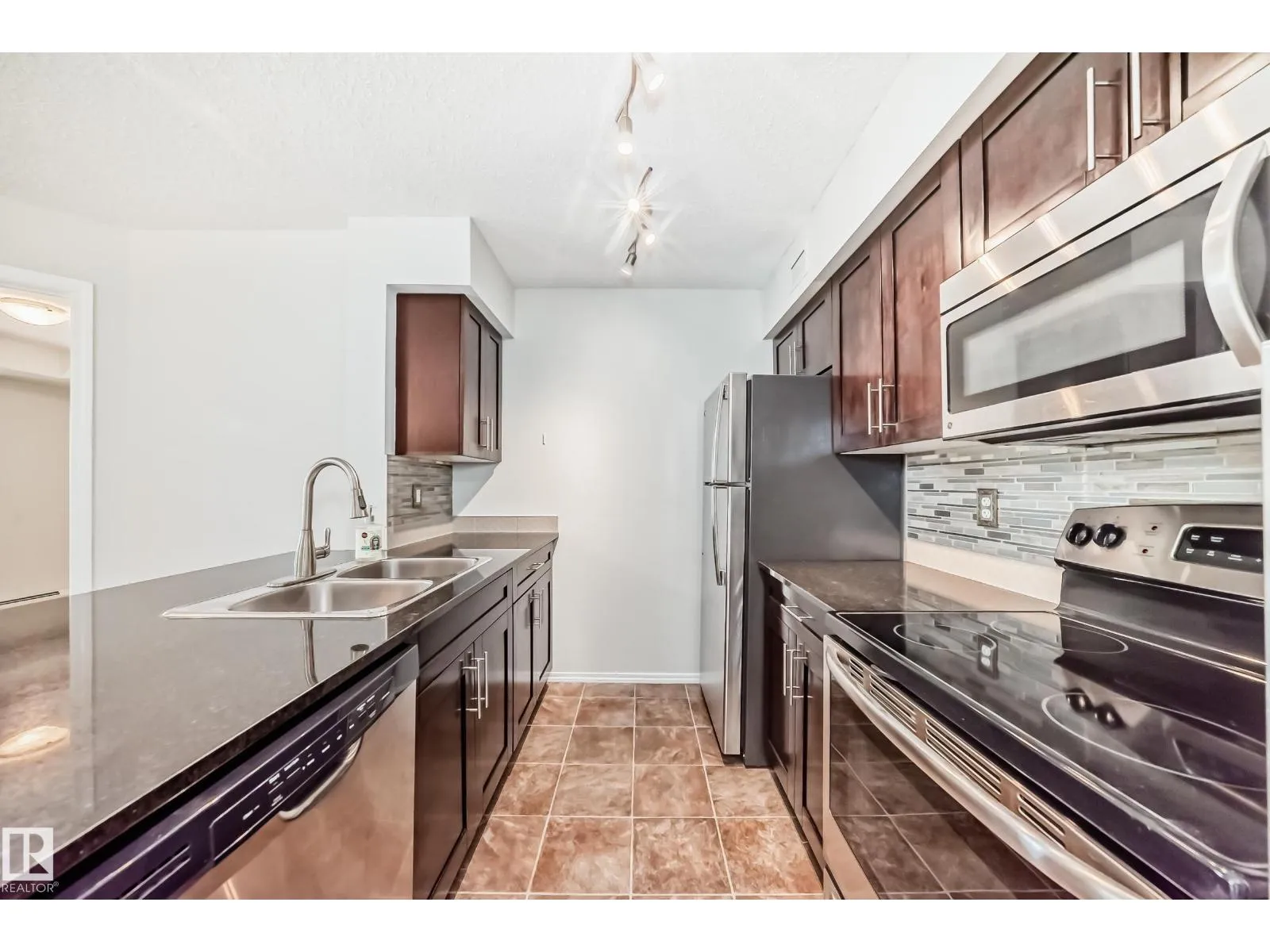 Welcome to McConachie - this is the one! Spacious 763 sq.ft main floor unit with 2 bedrooms, 2 bathrooms, den, 2 parking stalls, in-suite laundry and A/C, all in one stylish package! Enter this well-maintained unit and you are greeted with an open and bright floor plan, new flooring, and window view of mature trees. The kitchen boasts a peninsula style island with s/s appliances. The living and dining areas blend seamlessly together offering easy access to the south-facing covered patio. This unit faces McConachie Dr., providing the added benefit of convenient street parking and direct access to the unit perfect for you and your guests. The primary bedroom has a walk-through closet and private 4-piece ensuite with tiled shower. The second bedroom is also a good size able to fit a queen size bed. Complete the package with the heated underground and surface parking stalls. The complex is pet-friendly and within walking distance of schools, bus stops, & more amenities by vehicle including the Anthony Henday. (id:27476)