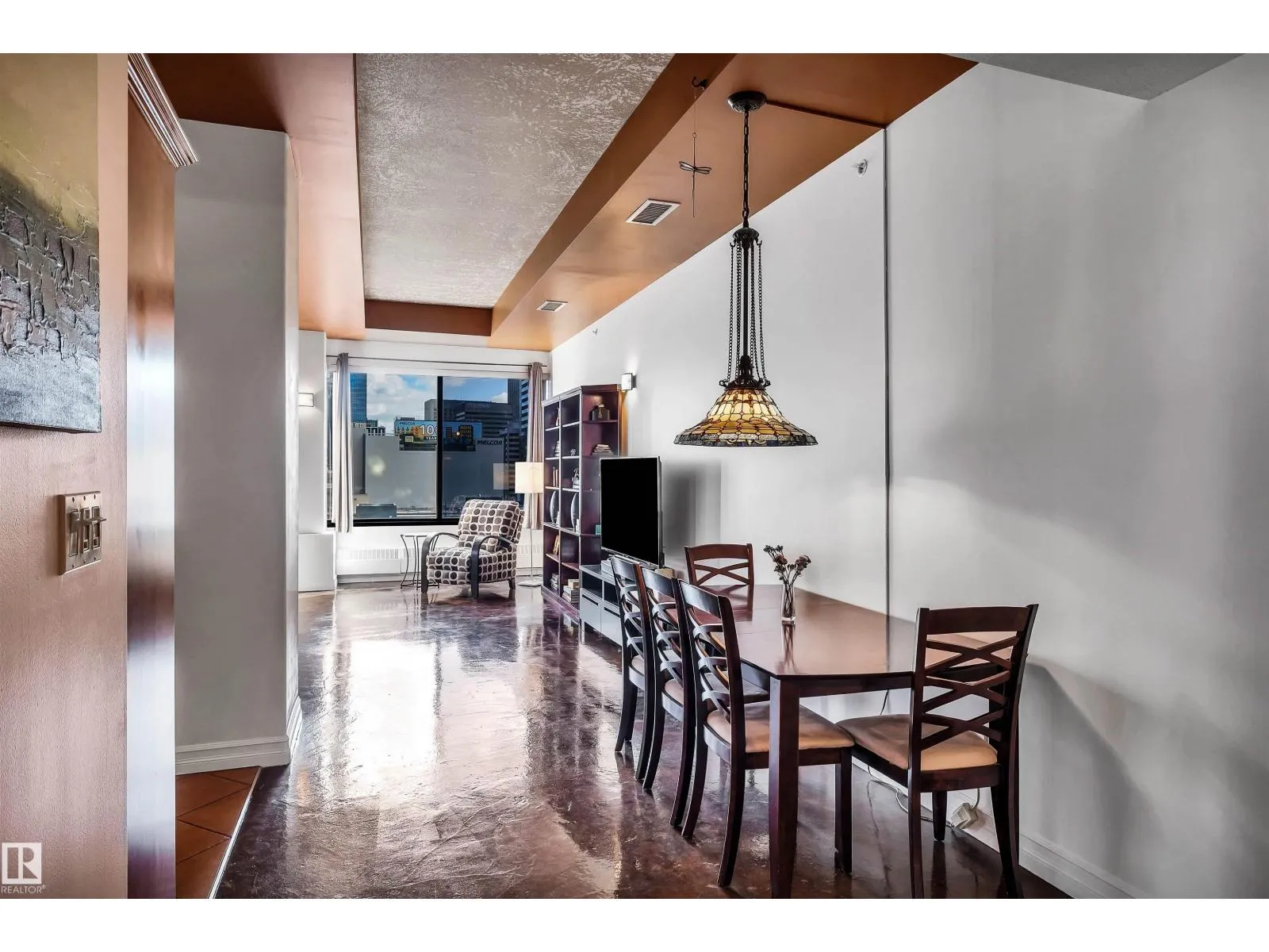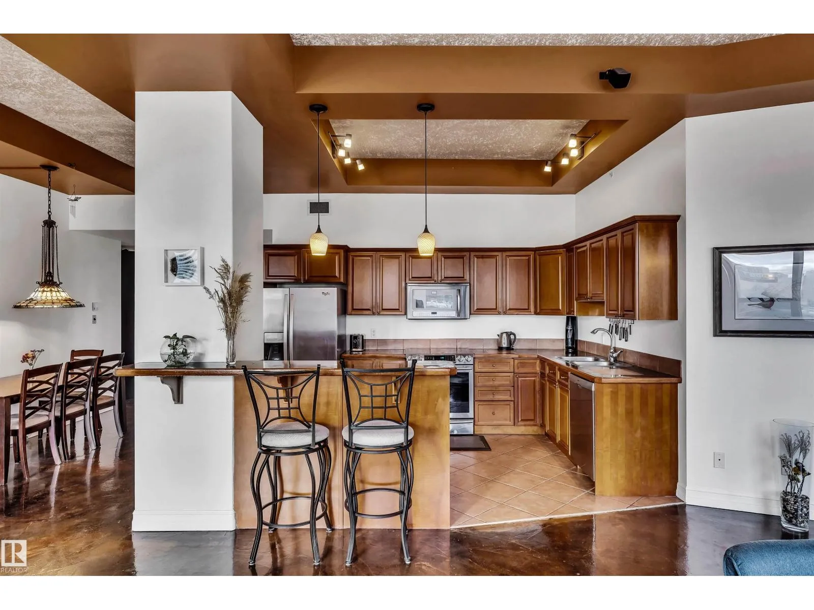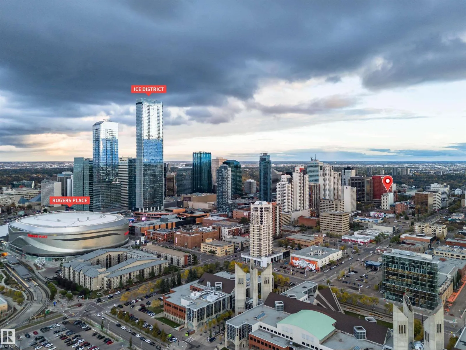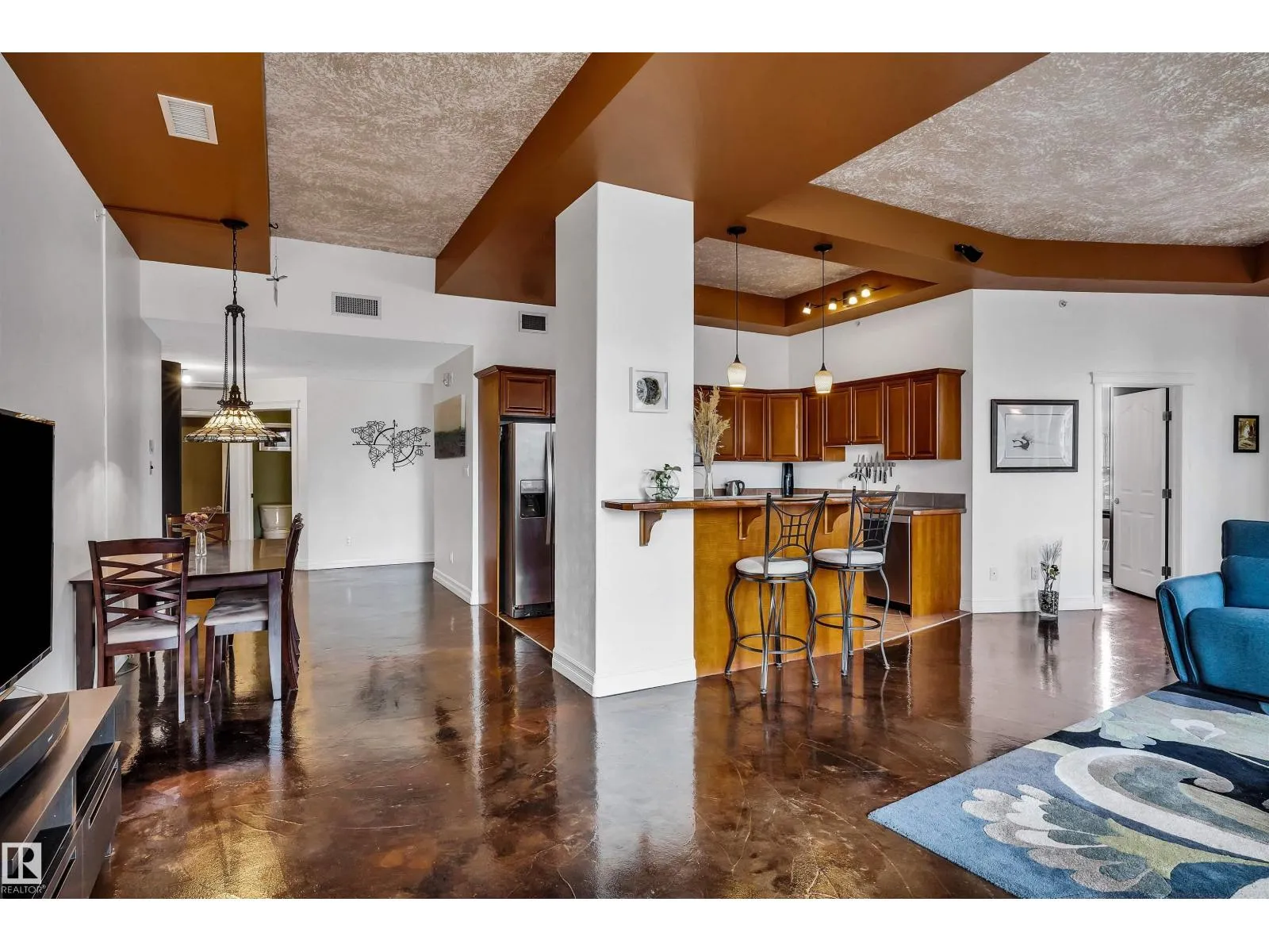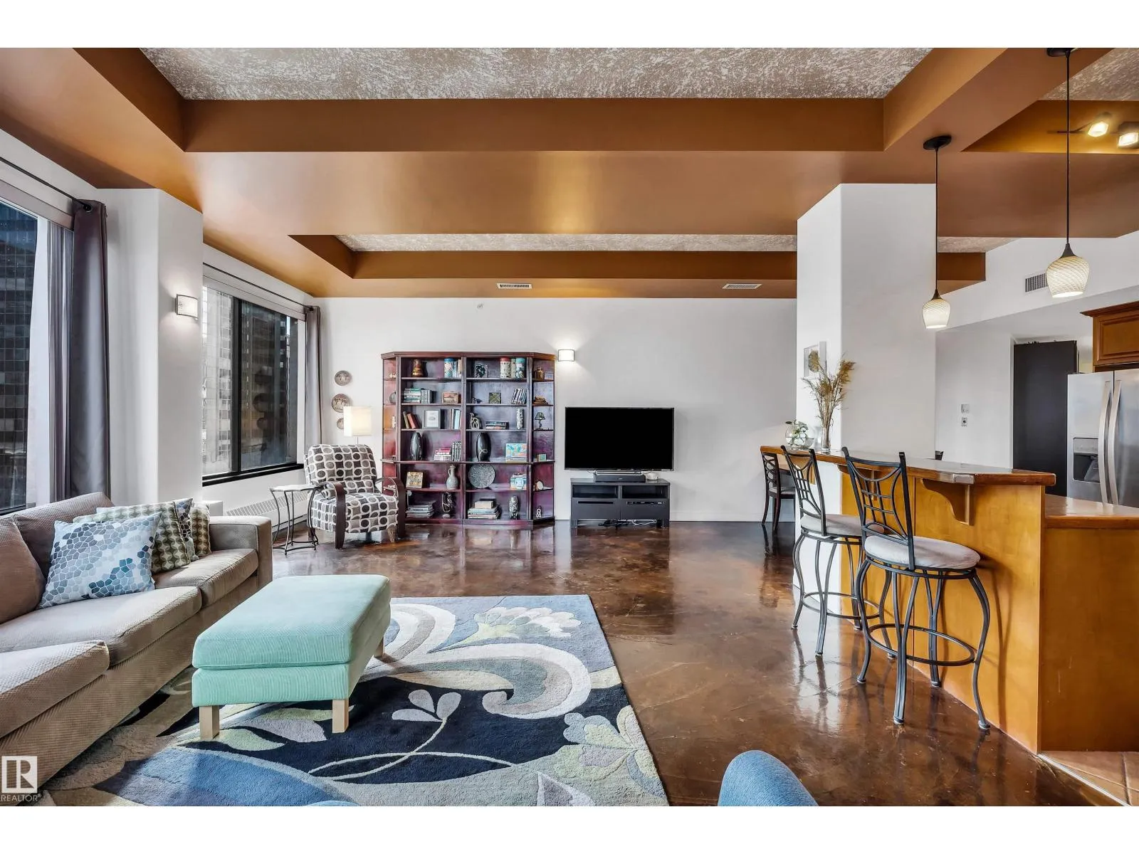 OPEN CONCEPT LOFT! 2 BEDROOMS + 2 BATHS. This 1,539 sq ft, 8th floor unit features an open layout with polished concrete & ceramic tile flooring, soaring 10 ft ceilings, and breathtaking panoramic views of downtown Edmonton. The spacious living room flows into an impressive kitchen, complete with a center island that seats two, an abundance of cabinets and ample counter space, all adjacent to the dining area - perfect for entertaining or intimate dinners. The primary bedroom includes a 4-pce ensuite bath & walk-in closet. The 2nd bedroom with a Murphy Bed can double as an office if required. The unit is finished with a second 3-pce bathroom and in-suite laundry for added convenience. 1 stall in parkade. Located across from a park currently being expanded and revitalized by the City, providing a beautiful outdoor space for relaxation. Enjoy great access to public transportation, allowing you to easily navigate the city, as well as proximity to excellent post-secondary schools & much more! ONLY $175,000 (id:27476)