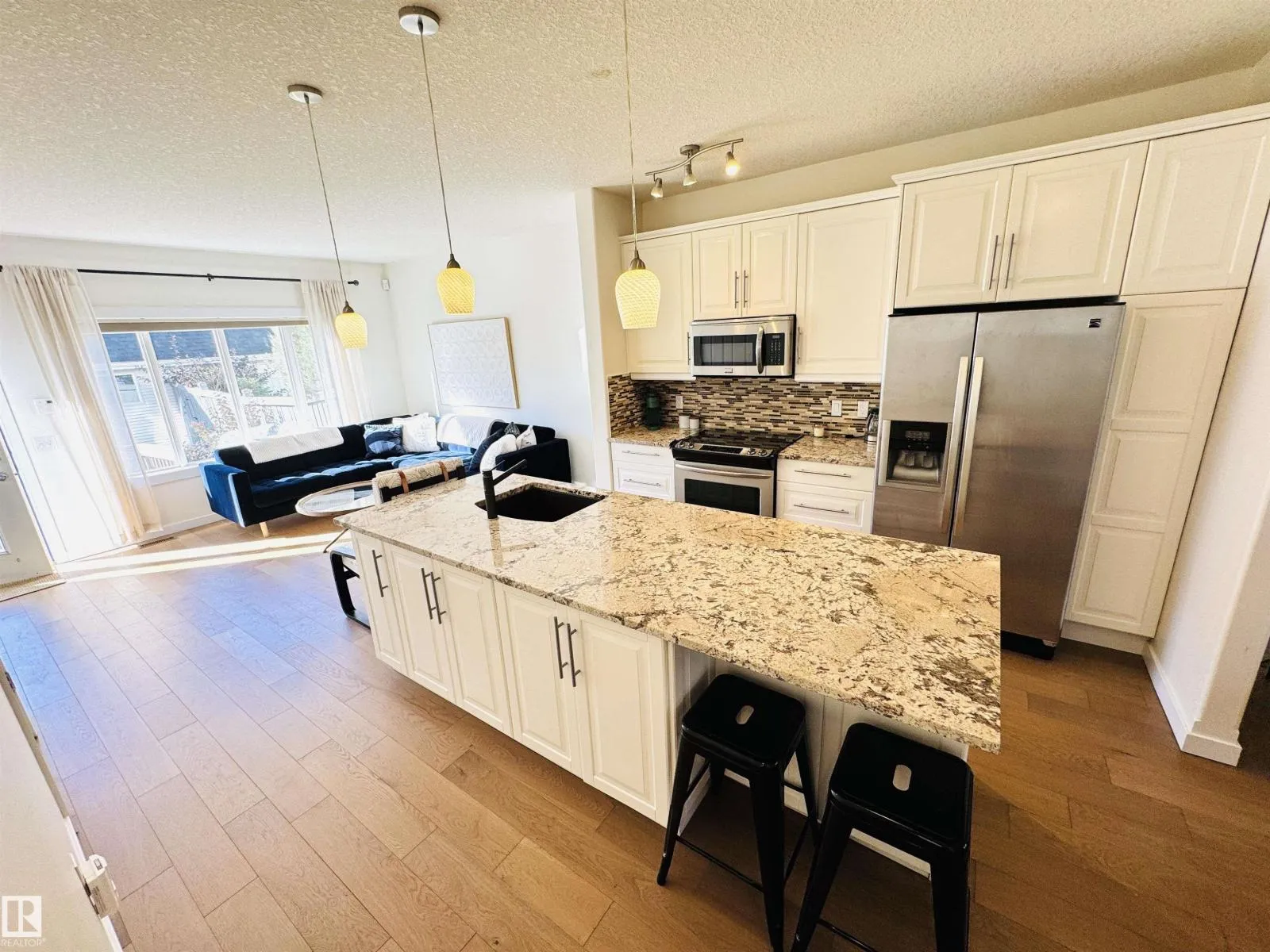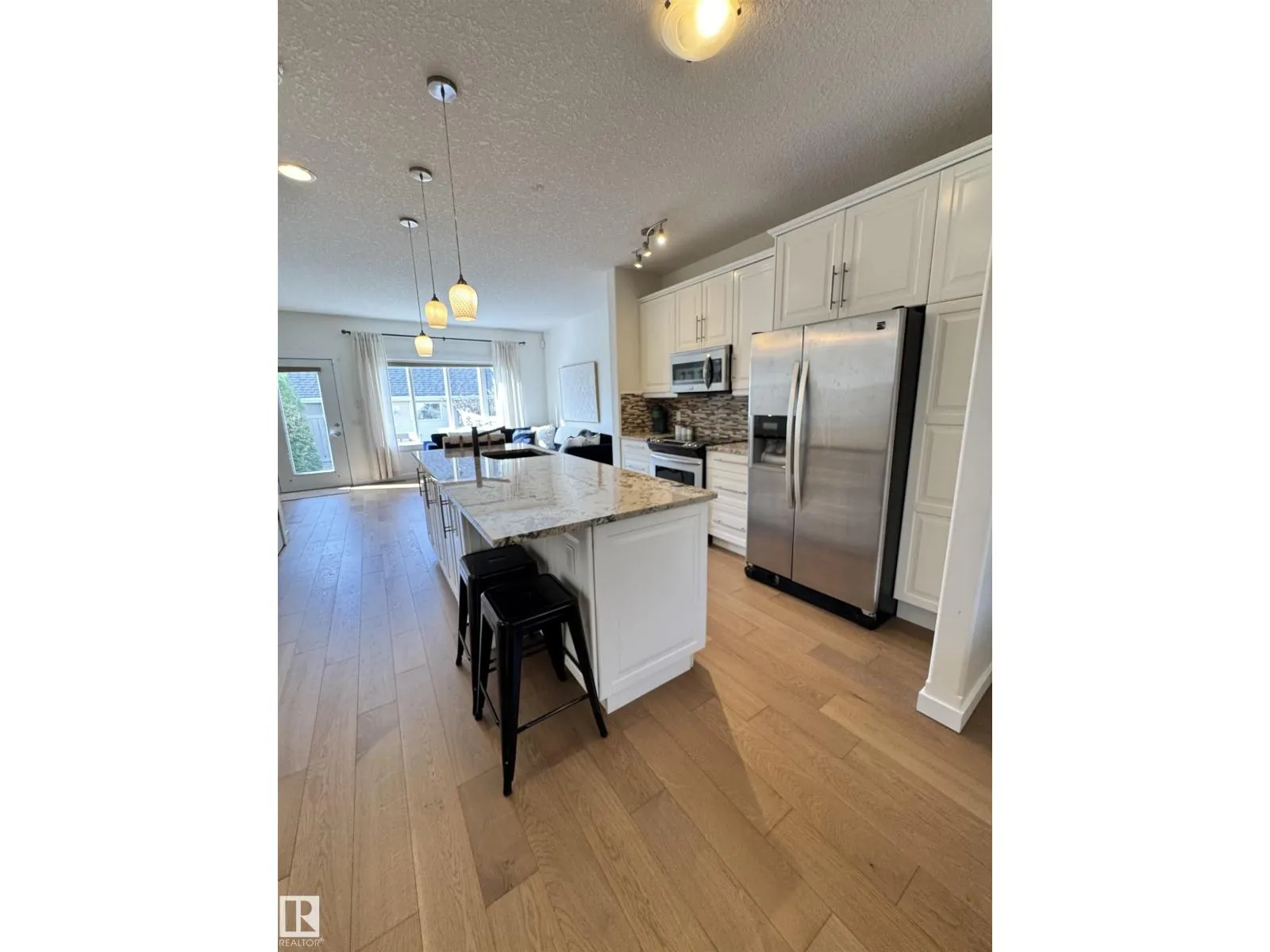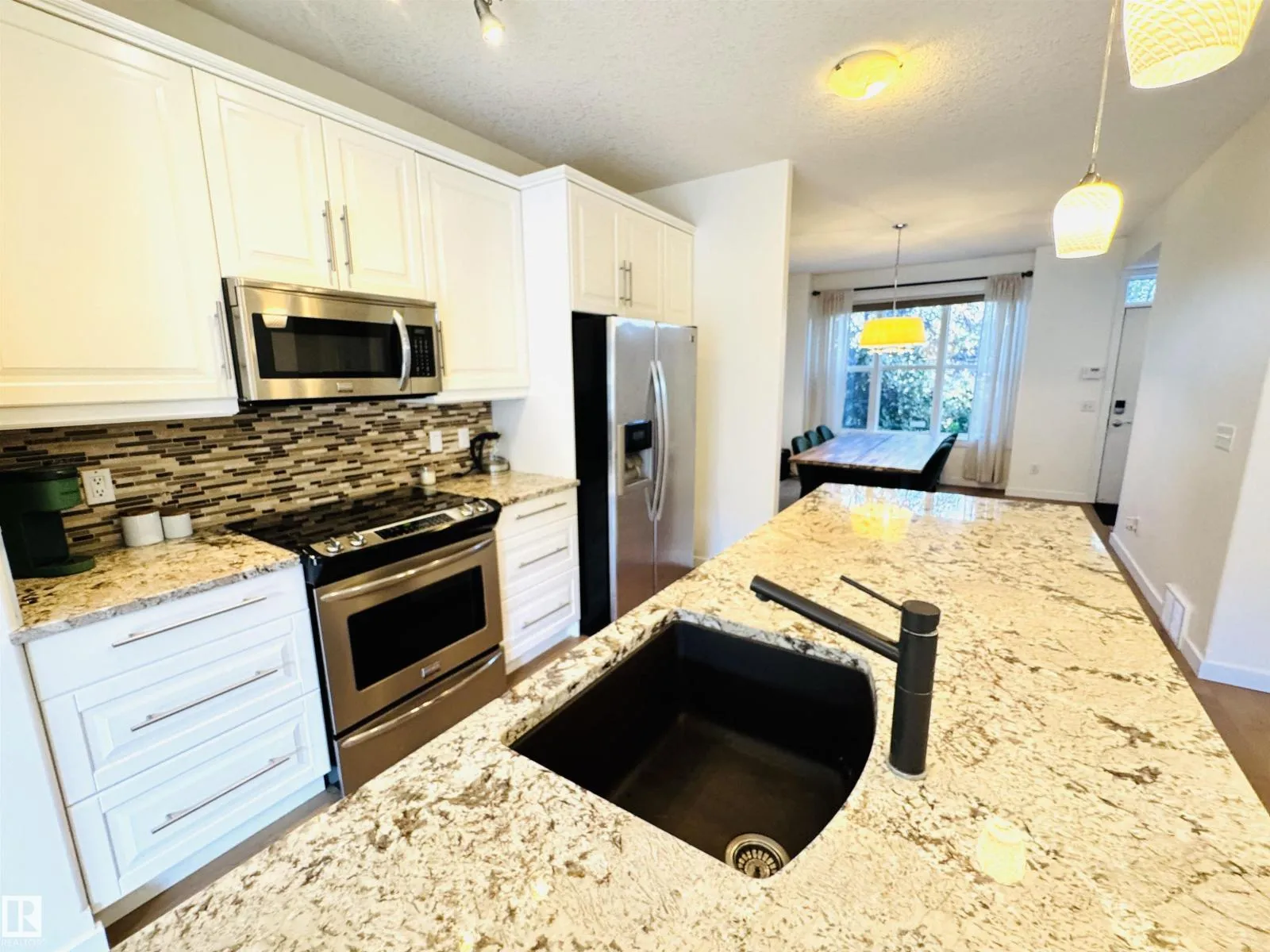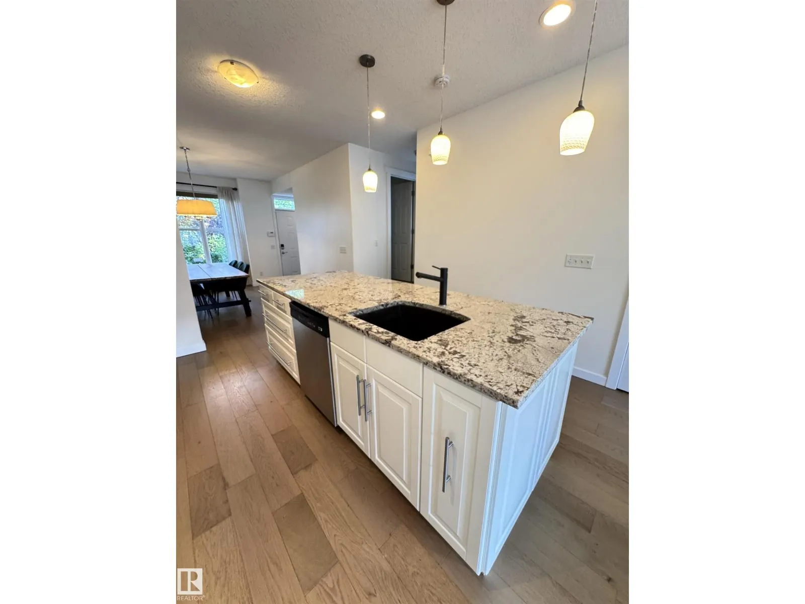 This BEAUTIFUL, BRIGHT END UNIT townhome in award wining Griesbach features over 2600sqft of total living space with a wonderfully executed floorpan. Upon entering, youâre greeted with a huge dining area and newly upgraded wide plank engineered oak hardwood floor. An upgraded open concept kitchen with granite and stainless steel appliances separates the sun-lit dining and living room which leads to a wonderful WEST facing, landscaped backyard & double detached garage. A cozy gas fireplace and a 2pc bath are also conveniently tucked away to make this first floor a warm, cozy space youâll love. The second level features a HUGE FAMILY ROOM (which could also be an office or bedroom), a large bedroom with walk-in closet and 4pc ensuite, as well as laundry. The third level is the PRIMARY SUITE with sitting area, vaulted ceilings, walk-in closet and an expansive ensuite with double sinks, soaker tub and separate stand-up shower. FULLY FINISHED basement w/ bonus room & wet bar and a flex/storage space. (id:27476)