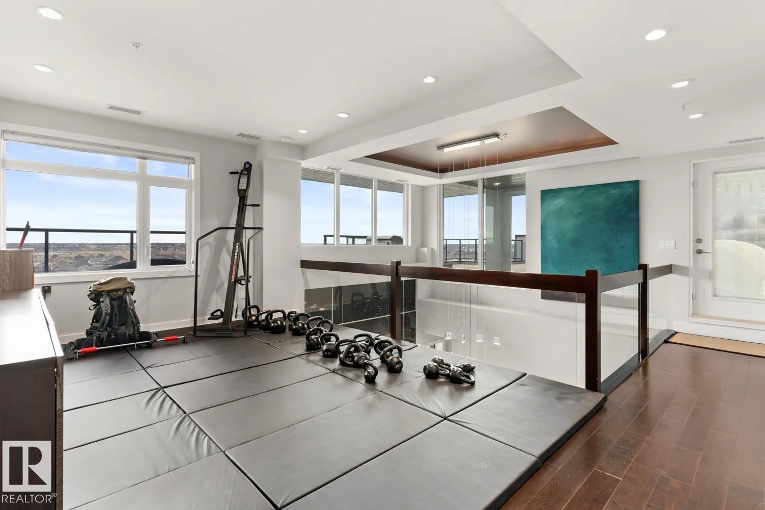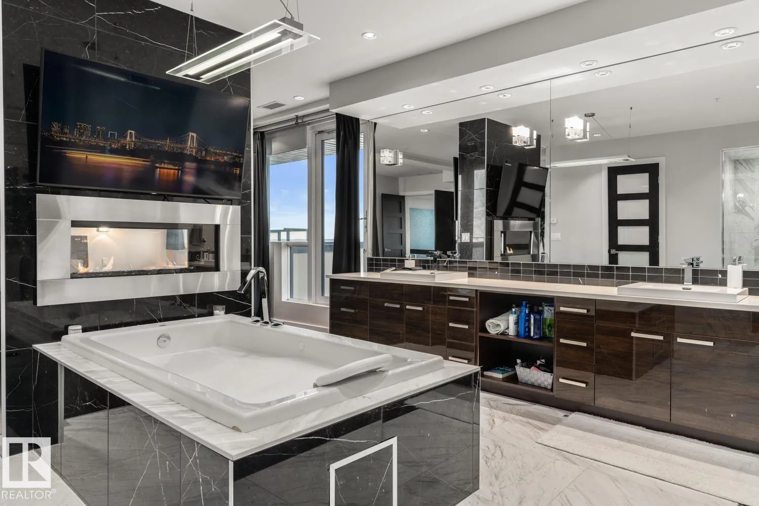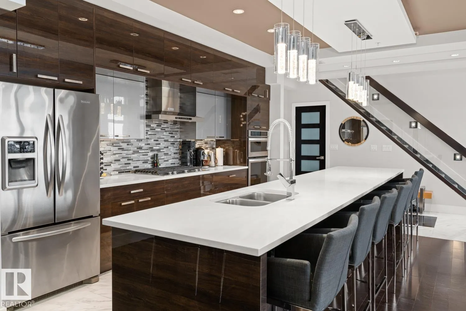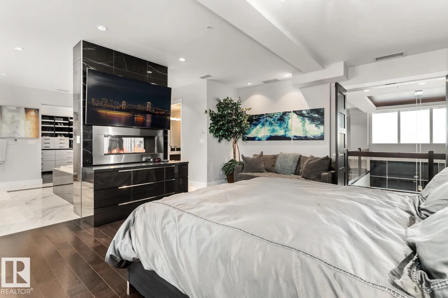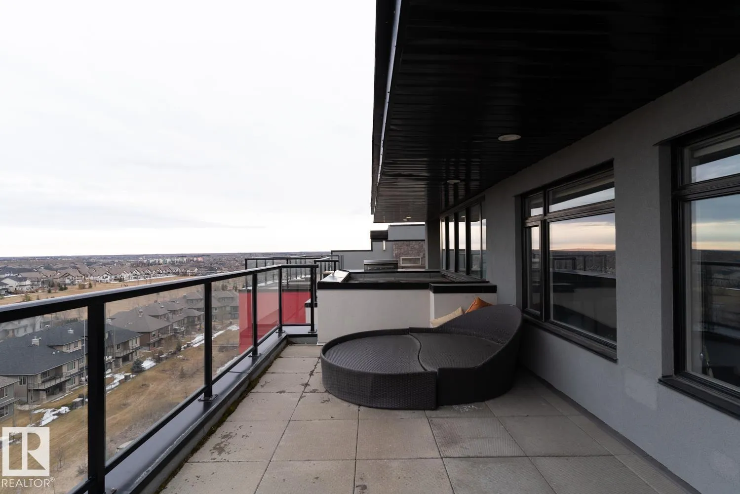 Welcome to the pinnacle of luxury living in Windermere! This stunning penthouse offers a sophisticated loft-style design with panoramic city views from two private balconies. The chef-inspired kitchen boasts a massive island with eating bar, modern finishes, and high-end appliancesâperfect for entertaining. The open-concept living space is bright and inviting, while the main floor also features a den plus a bedroom with walk-through closet and private ensuite. Upstairs, the lavish master suite impresses with a double-sided fireplace, jet tub, steam shower, water closet, and an oversized walk-in closet. Two additional bedrooms and a laundry room complete the upper level. With two titled parking stalls and access to a fully equipped fitness centre, this penthouse is the perfect blend of elegance, comfort, and convenience in one of Edmontonâs most desirable communities. Donât miss your chance to call this exceptional penthouse home! (id:27476)
