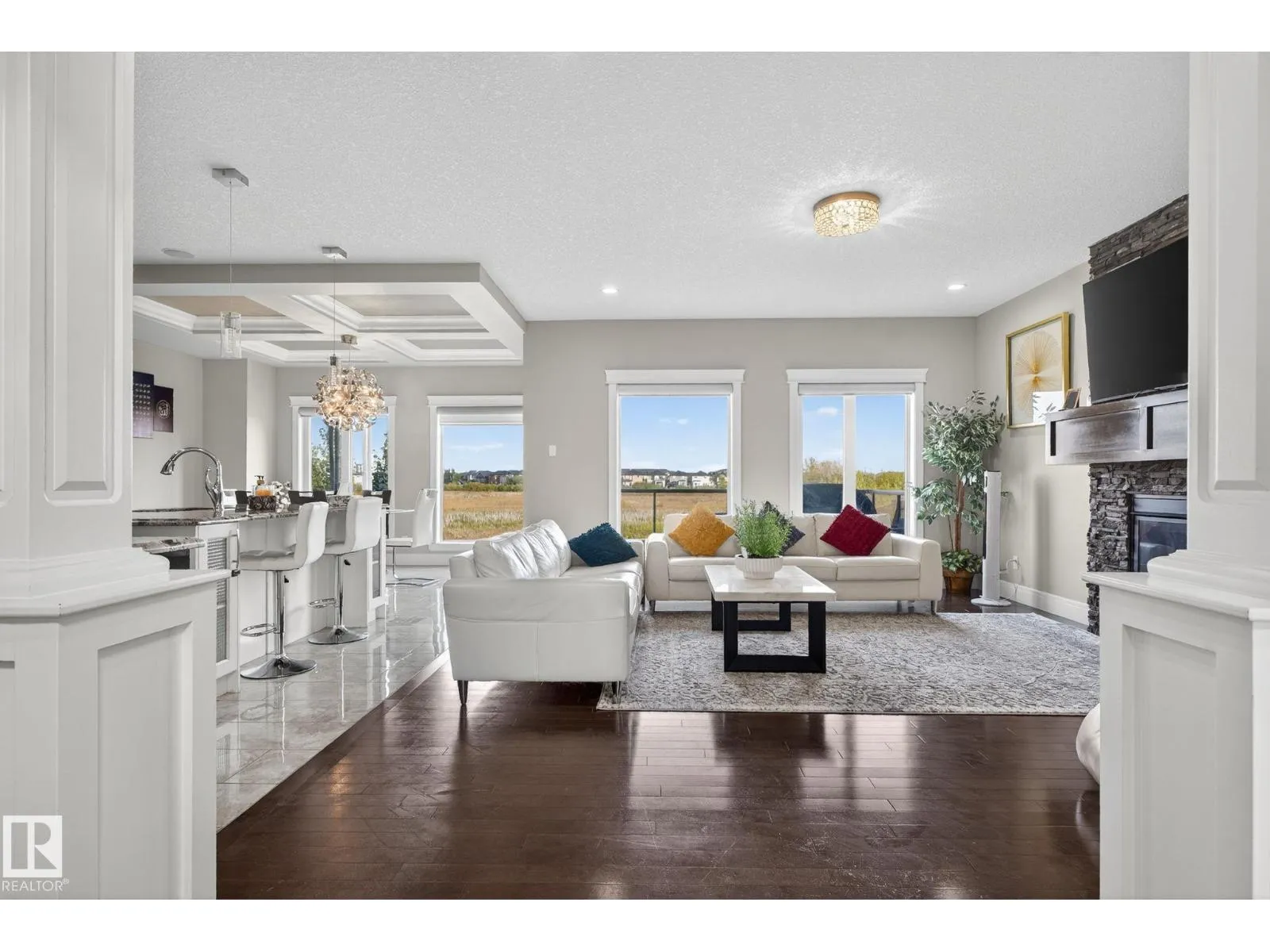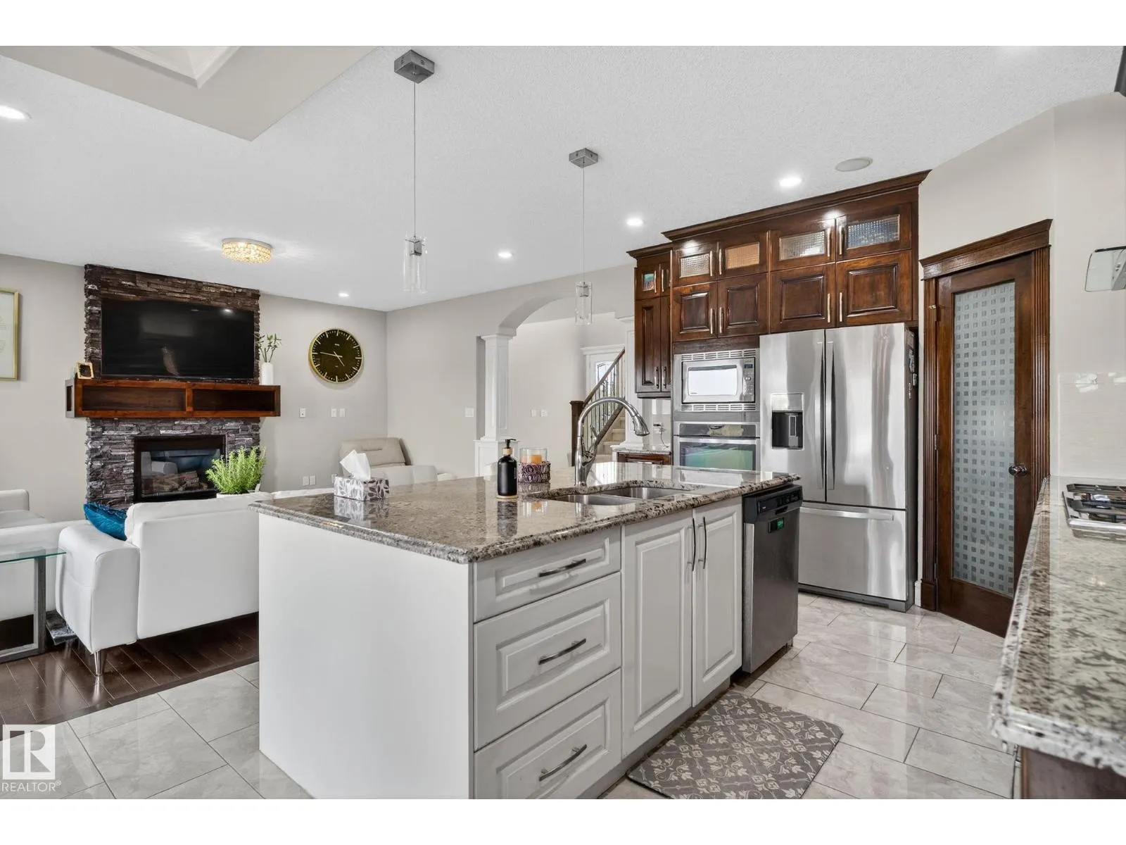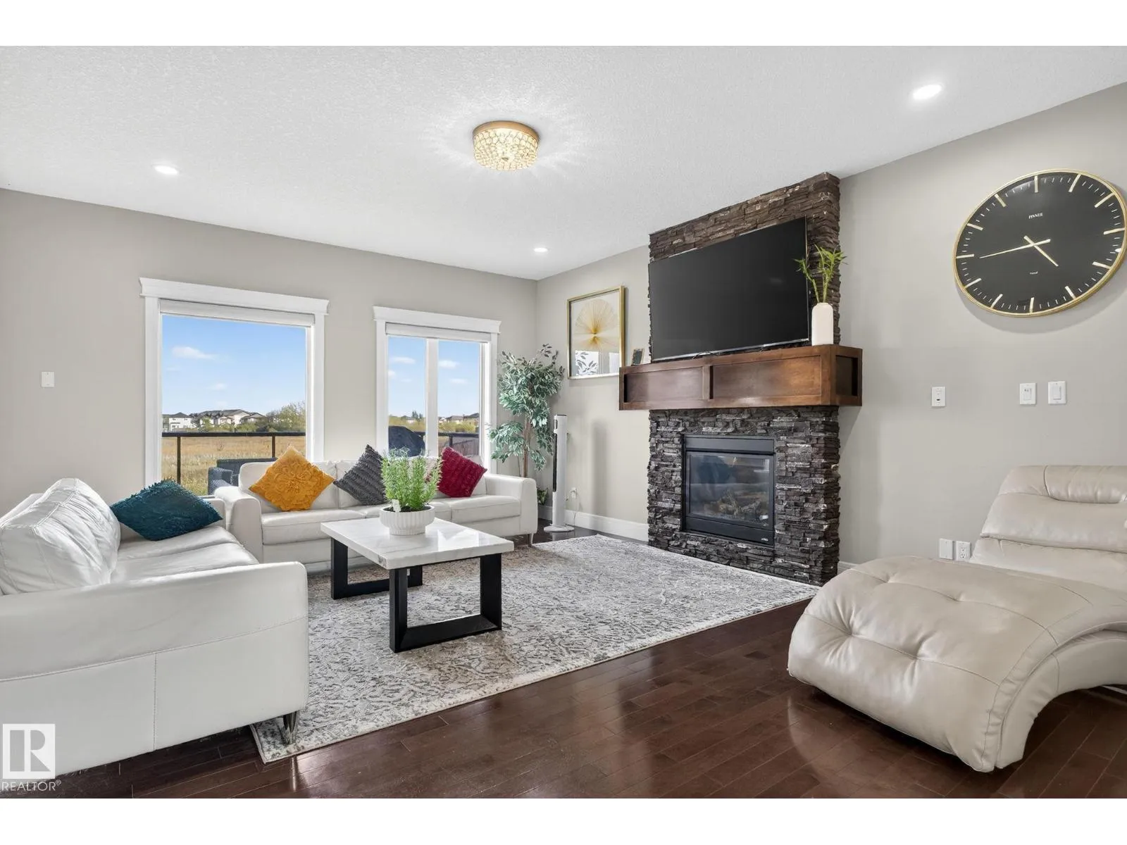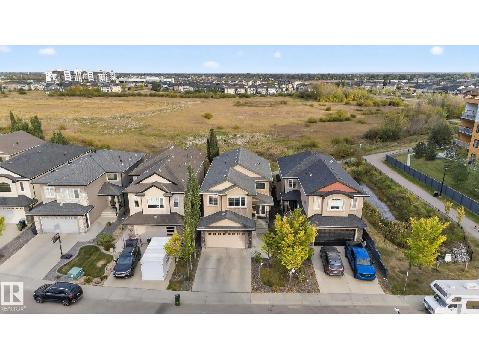 Step into luxury with this stunning, meticulously designed home that offers style, comfort, & functionality. Greeted by elegant double doors, youâll enter a bright, light-filled space. The main floor features a spacious, modern gourmet kitchen with granite countertops, SS appliances, under-cabinet lighting, & ample workspace. The open-concept living & dining areas are centered around a brick fireplace, while a dedicated home office provides the perfect work-from-home setup. Upstairs, the primary suite offers breathtaking views, a spa-inspired ensuite, and a generous walk-in closet. Two additional well-sized bedrooms, a family bathroom, & same-floor laundry complete the level. Find your fully finished basement complete with a bathroom and 2 bedrooms. Additional highlights include upgraded lighting, central A/C, premium finishes throughout, and a fully landscaped yardâall backing onto no rear neighbors for added privacy and tranquility. Only a 4-min drive to the Henday, Walmart, Sobeys, Starbucks, and more! (id:27476)