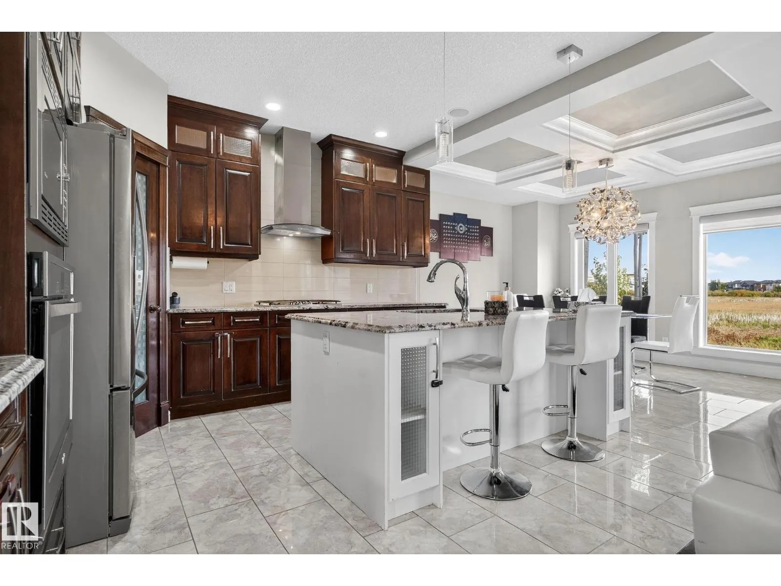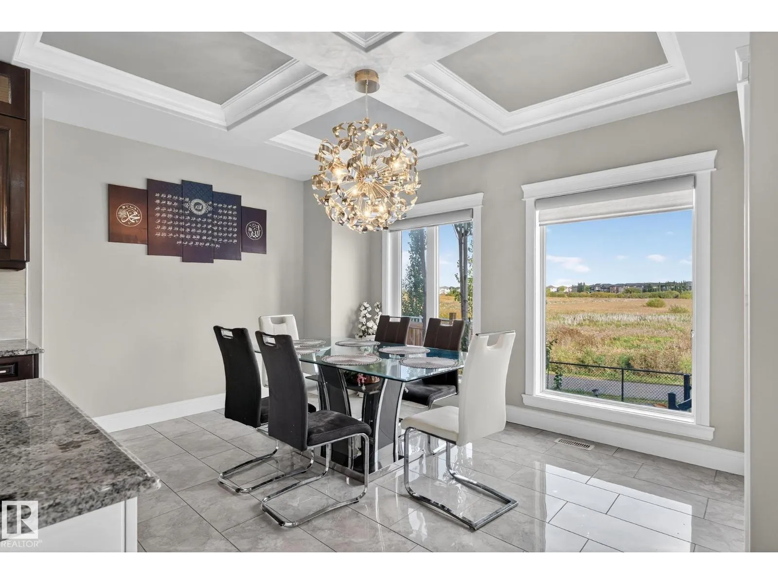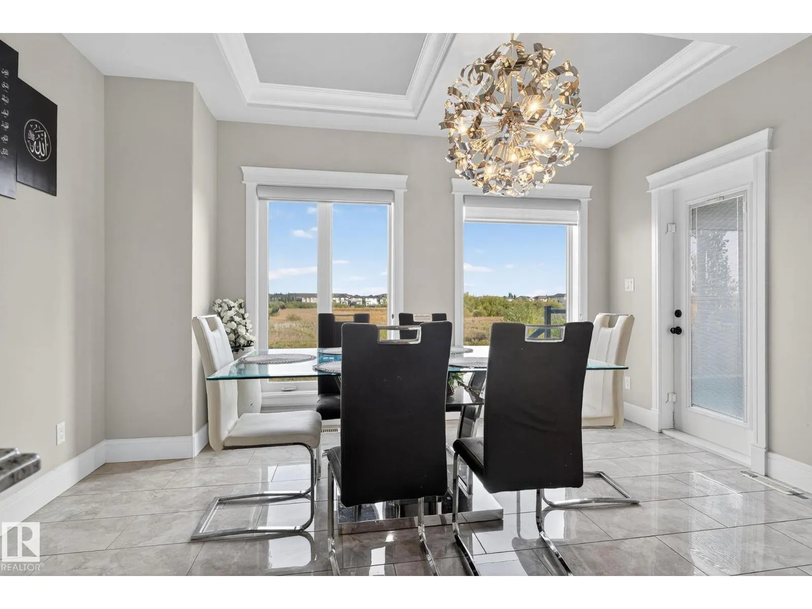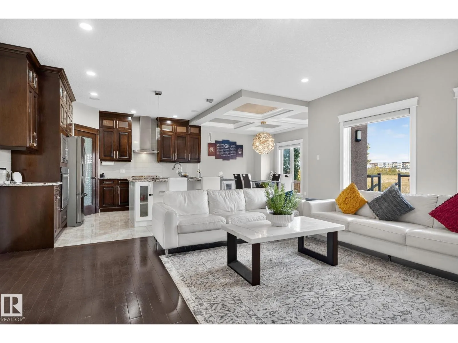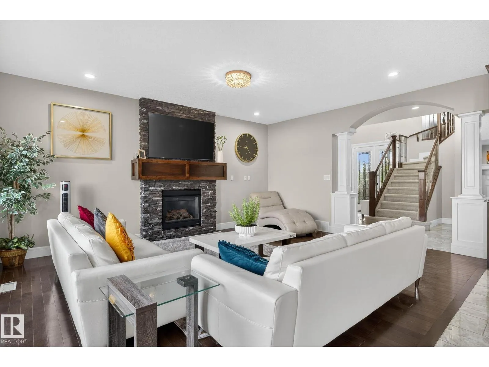 Step into luxury with this stunning, meticulously designed home that offers style, comfort, & functionality. Greeted by elegant double doors, youâll enter a bright, light-filled space. The main floor features a spacious, modern gourmet kitchen with granite countertops, SS appliances, under-cabinet lighting, & ample workspace. The open-concept living & dining areas are centered around a brick fireplace, while a dedicated home office provides the perfect work-from-home setup. Upstairs, the primary suite offers breathtaking views, a spa-inspired ensuite, and a generous walk-in closet. Two additional well-sized bedrooms, a family bathroom, & same-floor laundry complete the level. Find your fully finished basement complete with a bathroom and 2 bedrooms. Additional highlights include upgraded lighting, central A/C, premium finishes throughout, and a fully landscaped yardâall backing onto no rear neighbors for added privacy and tranquility. Only a 4-min drive to the Henday, Walmart, Sobeys, Starbucks, and more! (id:27476)
