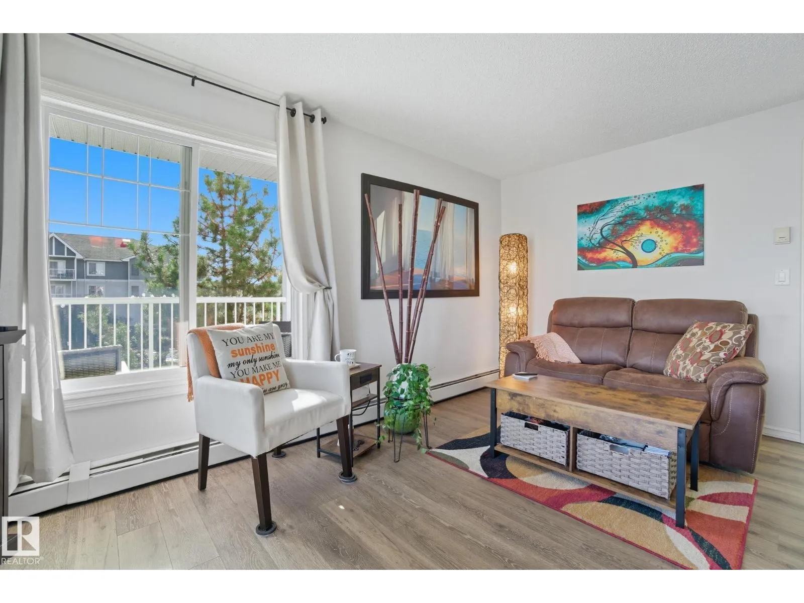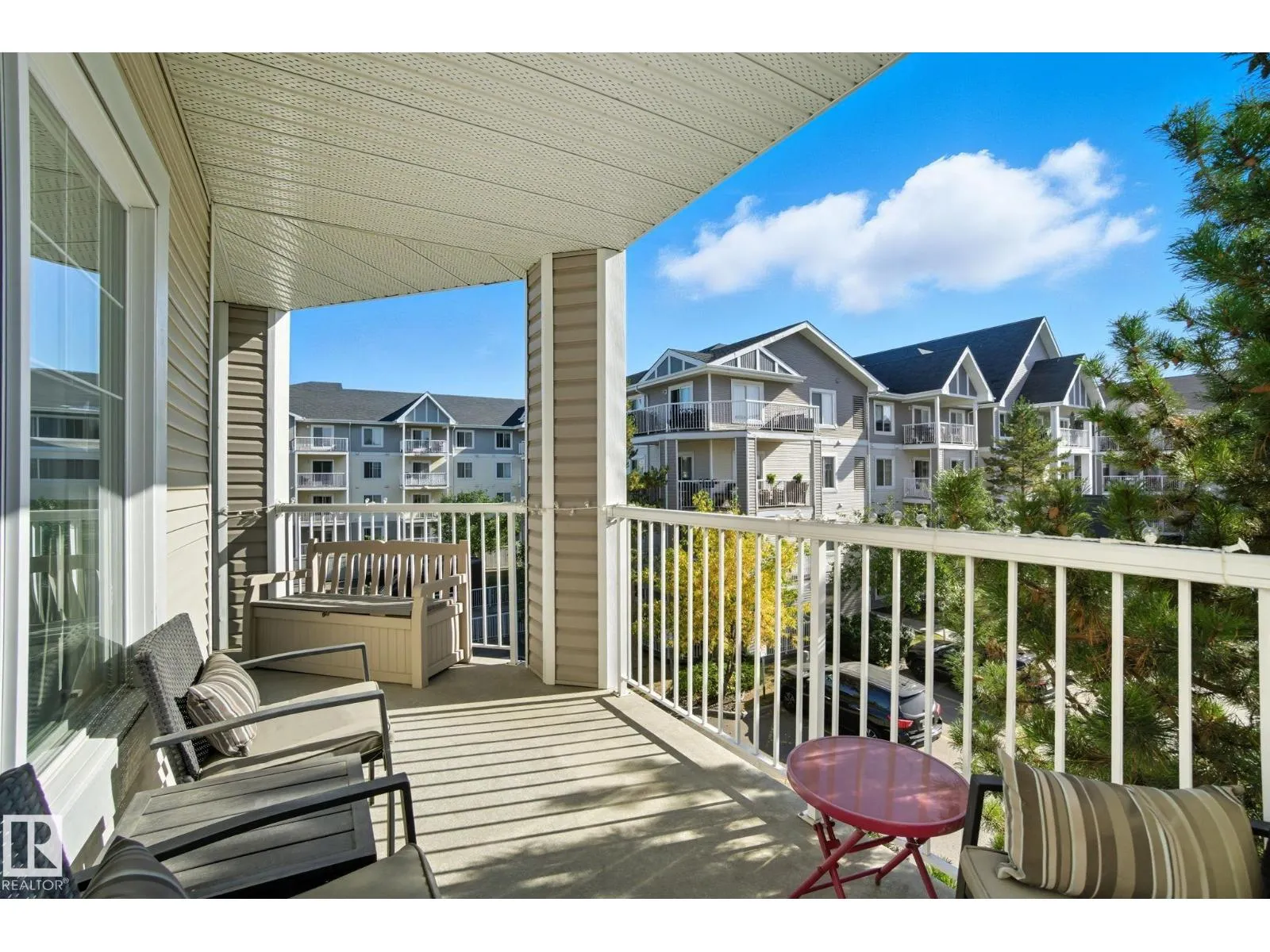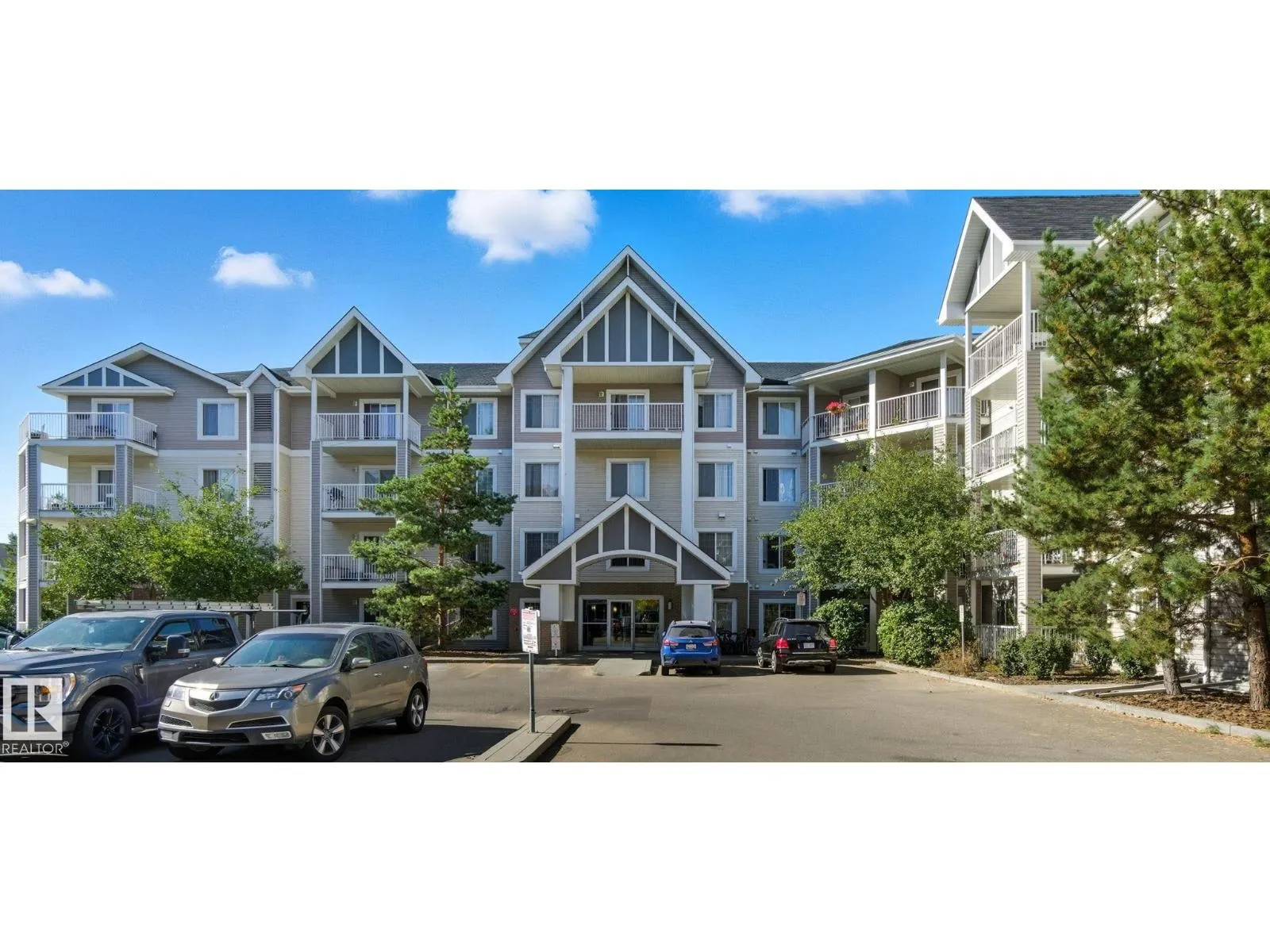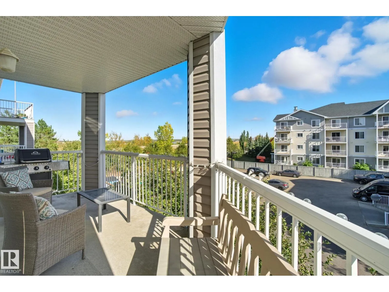 LOCATION! Bright CORNER executive condo with large wraparound balcony! All the conveniences just steps from shopping, parks, transportation, Whitemud & Henday. Fabulous open floorplan with surrounding bright South and East windows and sunny views in each room.Renovated with designer colors and gorgeous vinyl plank flooring throughout. Beautiful maple kitchen w/ plenty of cabinets and counters enjoying East morning views out window over sink. Dining area is off kitchen and good sized relaxing living room that walks onto amazing covered corner balcony with gas BBQ hookups to relax the summer and fall away. Kingsized master bedroom has him/her walk through closets and full ensuite. Good sized 2nd bedroom enjoys sunny south views, 4pc bath and insuite laundry complete the main floor. Assigned same floor extra storage area also included for extra room. ALSO, 2 TITLED parking stalls: 1 underground and 1 surface stall. Complex includes fitness centre. This RARE CORNER condo is bright an has is ALL! (id:27476)