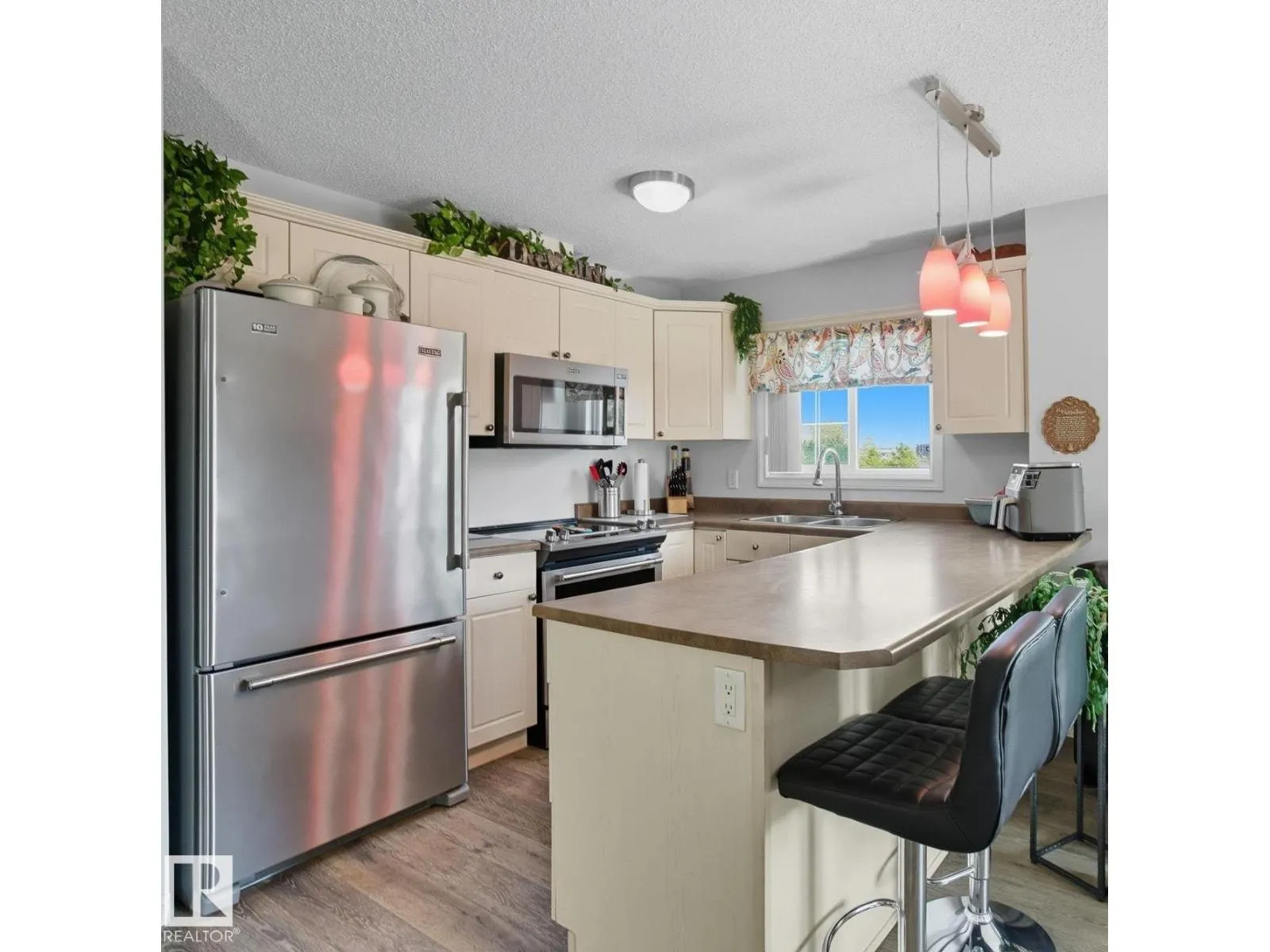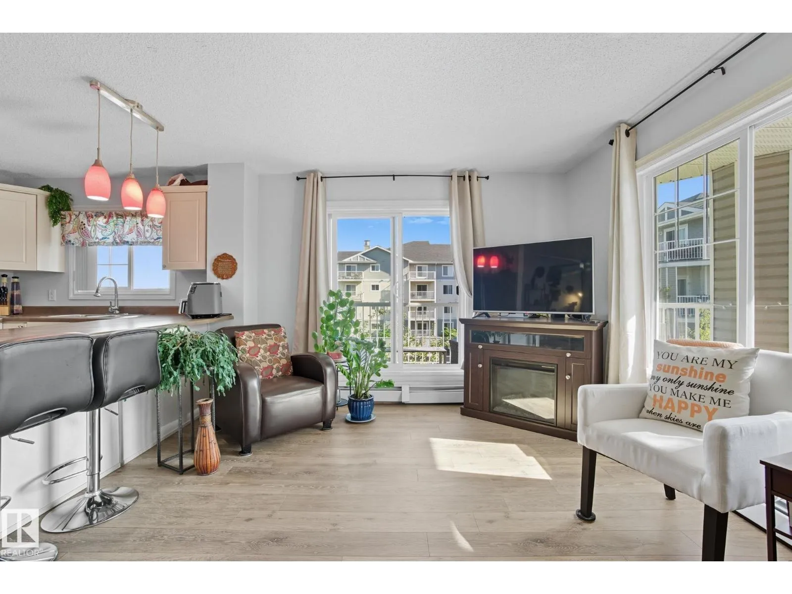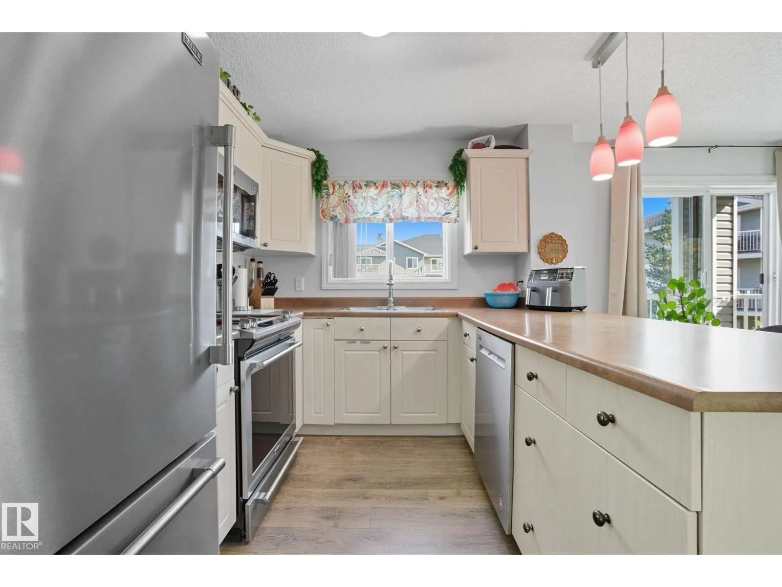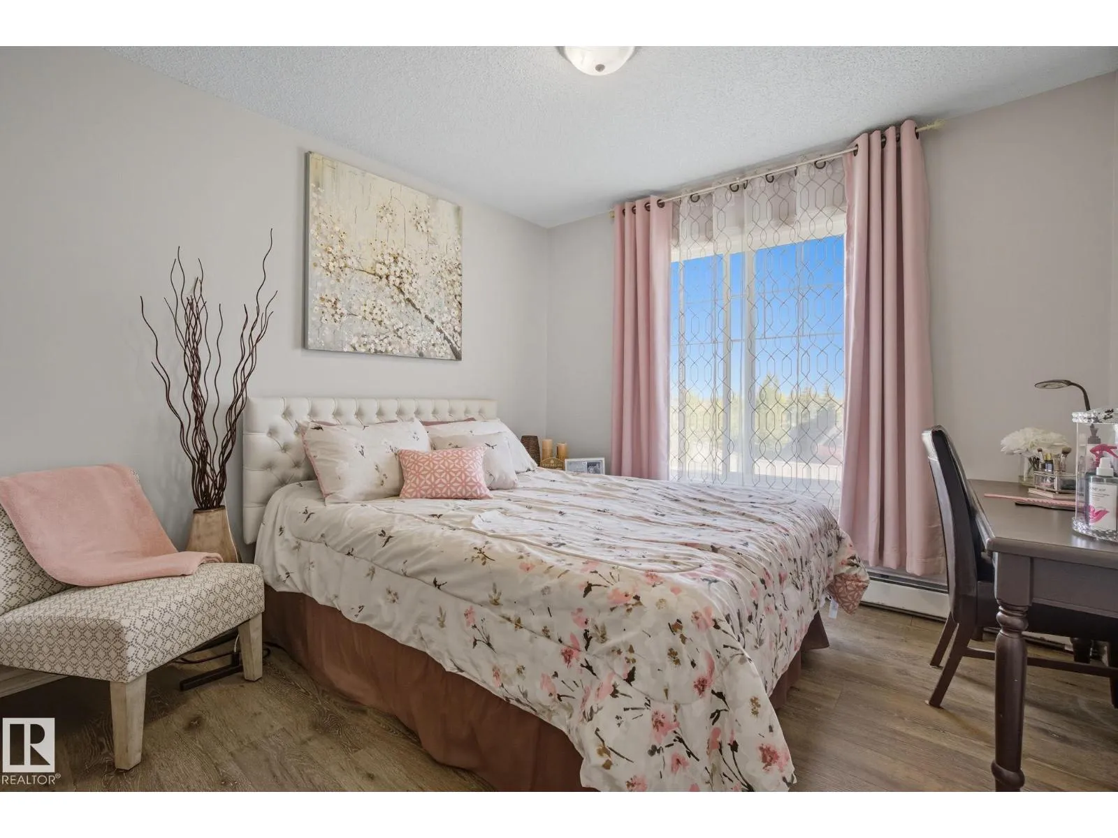 LOCATION! Bright CORNER executive condo with large wraparound balcony! All the conveniences just steps from shopping, parks, transportation, Whitemud & Henday. Fabulous open floorplan with surrounding bright South and East windows and sunny views in each room.Renovated with designer colors and gorgeous vinyl plank flooring throughout. Beautiful maple kitchen w/ plenty of cabinets and counters enjoying East morning views out window over sink. Dining area is off kitchen and good sized relaxing living room that walks onto amazing covered corner balcony with gas BBQ hookups to relax the summer and fall away. Kingsized master bedroom has him/her walk through closets and full ensuite. Good sized 2nd bedroom enjoys sunny south views, 4pc bath and insuite laundry complete the main floor. Assigned same floor extra storage area also included for extra room. ALSO, 2 TITLED parking stalls: 1 underground and 1 surface stall. Complex includes fitness centre. This RARE CORNER condo is bright an has is ALL! (id:27476)