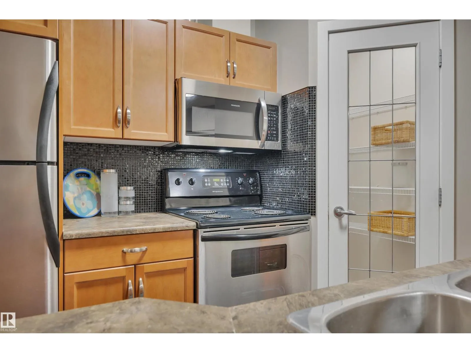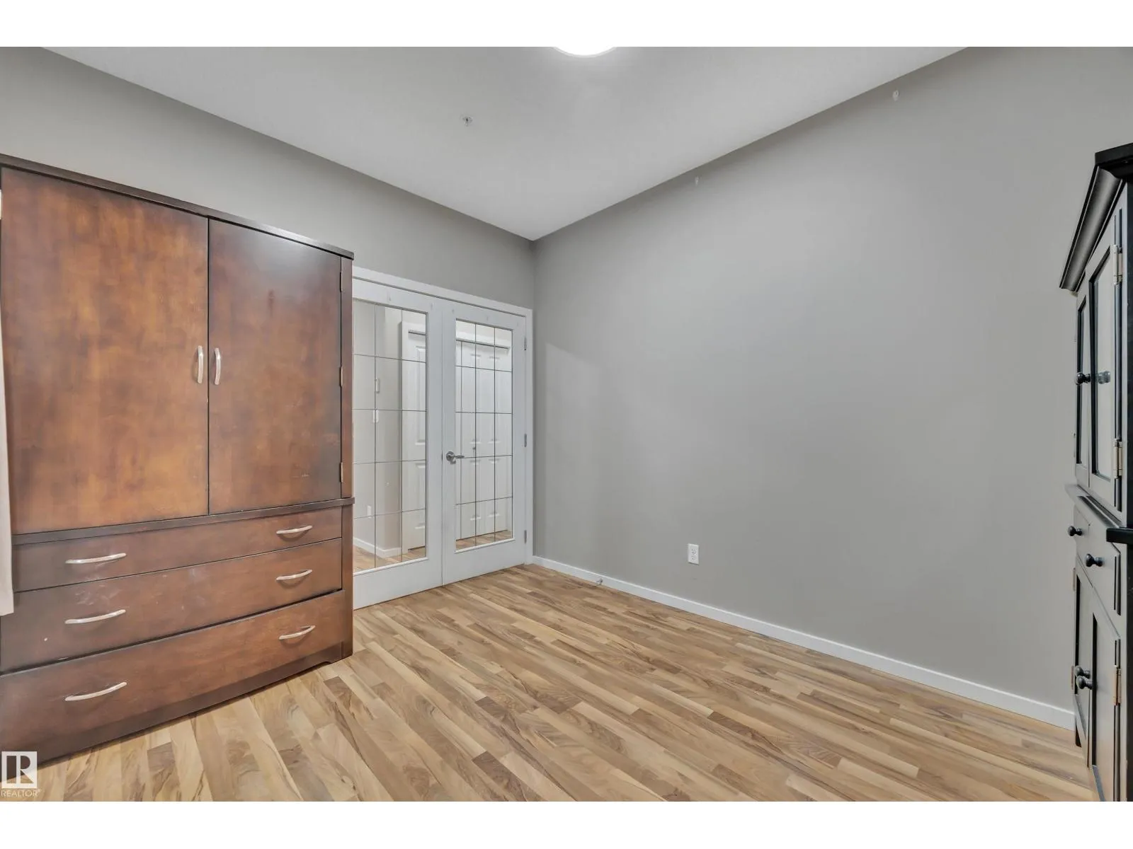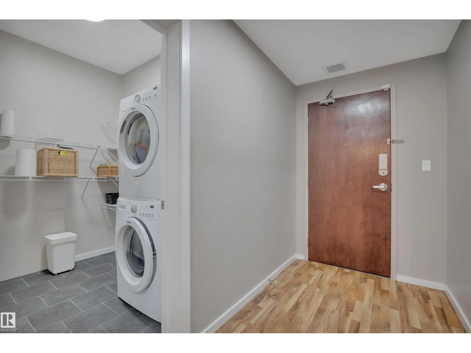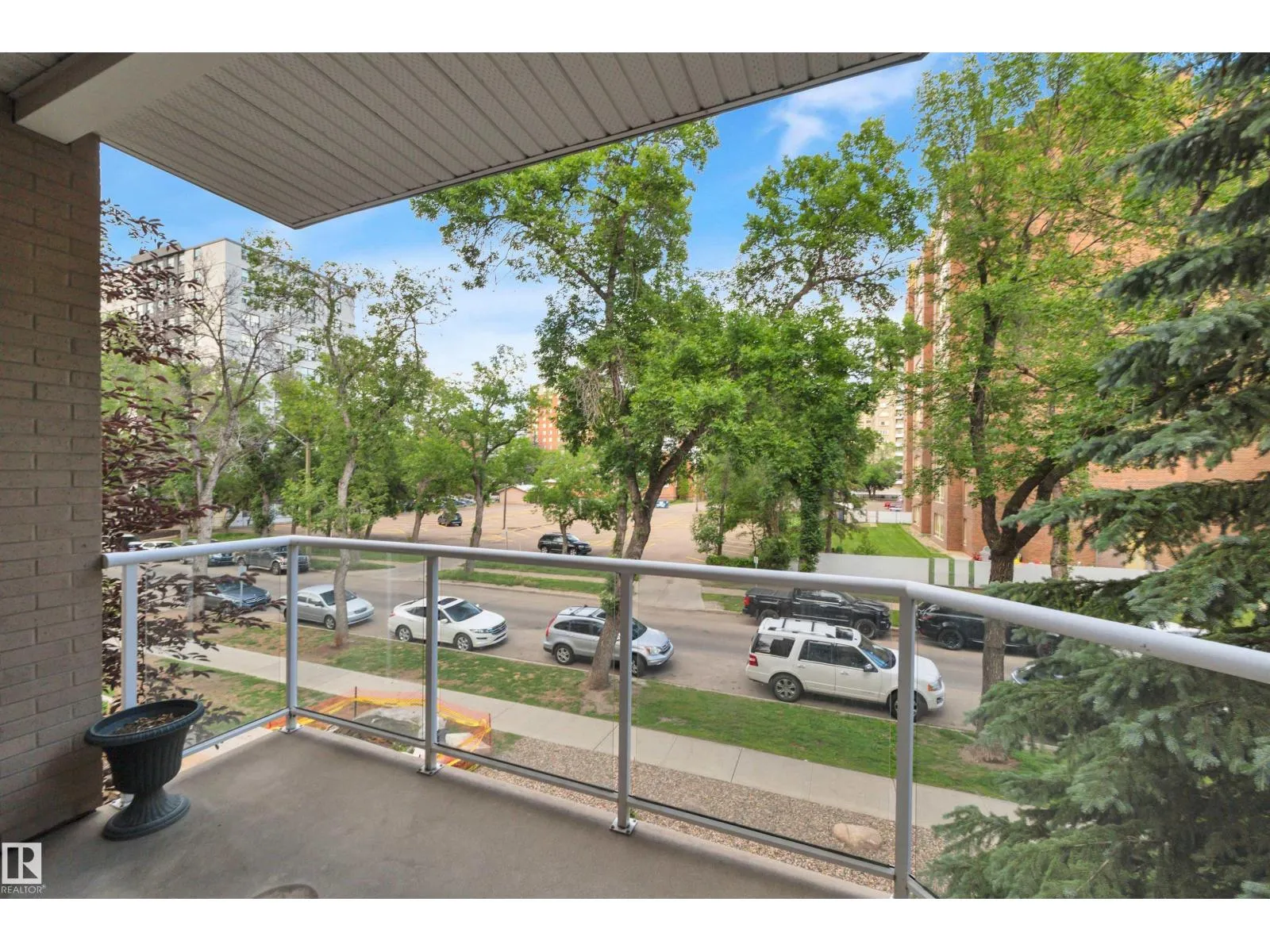 Gorgeous renovated 2-bedroom*, 2-bath condo with titled heated underground parking on a quiet, tree-lined street. Freshly painted with new LED lighting, custom mirrored closet doors, upgraded faucets, and modern hardware throughout. Over 1,000 sqft with 9-ft ceilings, this bright unit is filled with natural light from large windows. The kitchen features stainless steel appliances, slate tile, a walk-in pantry, and a raised eating bar. The living room is centrally located, with the primary suite and 4-pc ensuite on one side and a den with French doors (includes armoire, used as a bedroom) on the other for added privacy. Slate tile in kitchen, laundry, and baths; laminate in living, dining, and bedrooms; plus in-floor heating throughout. Enjoy elegant downtown living close to all amenitiesâjust 230m to the LRT and minutes to the University. (id:27476)