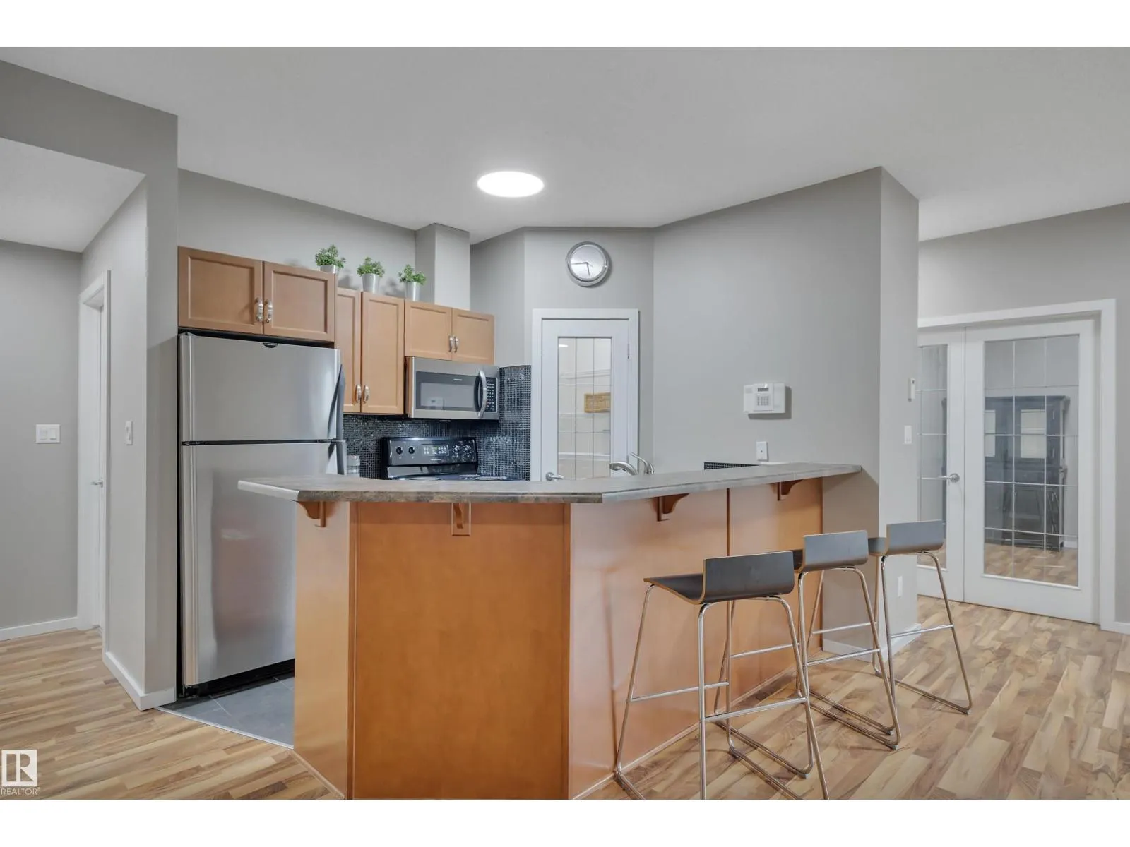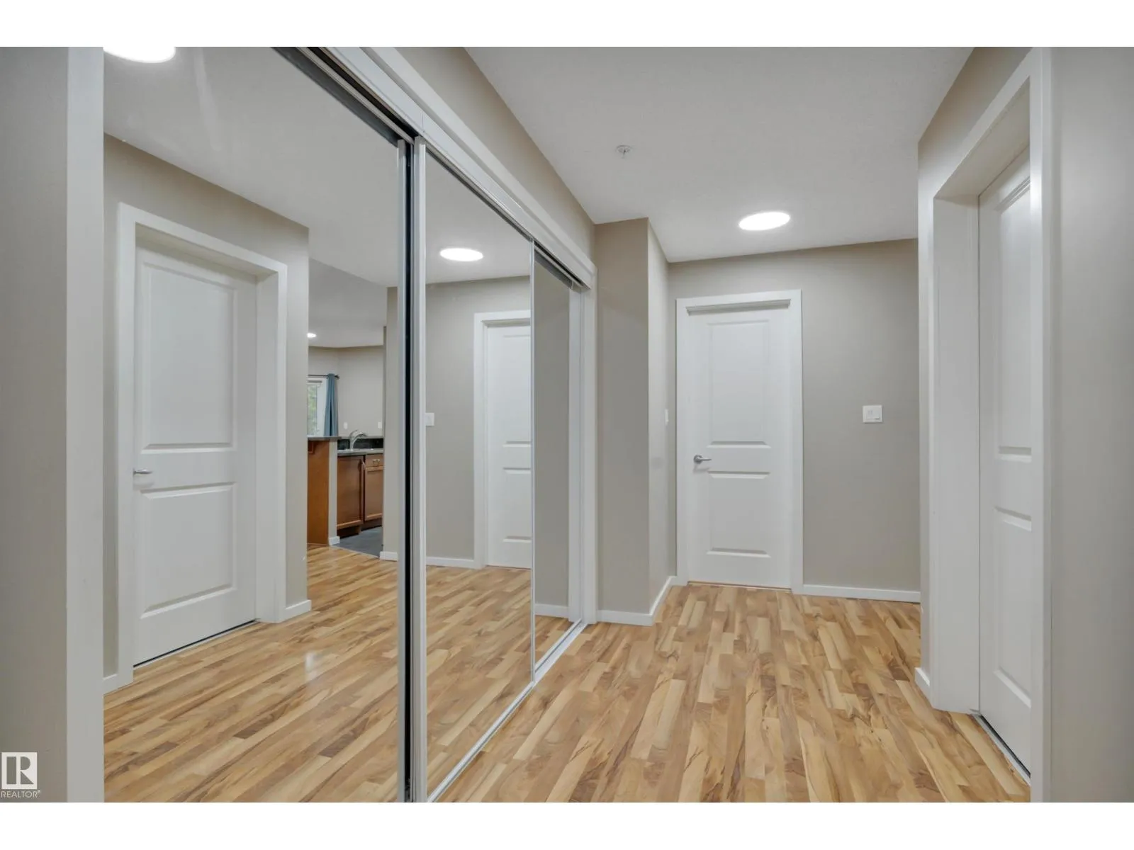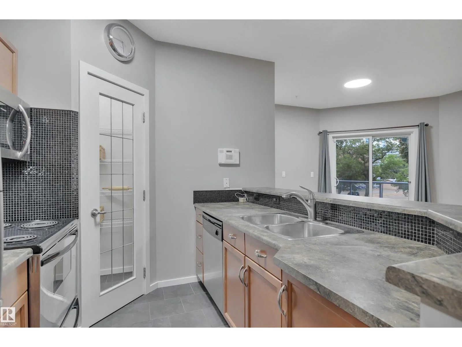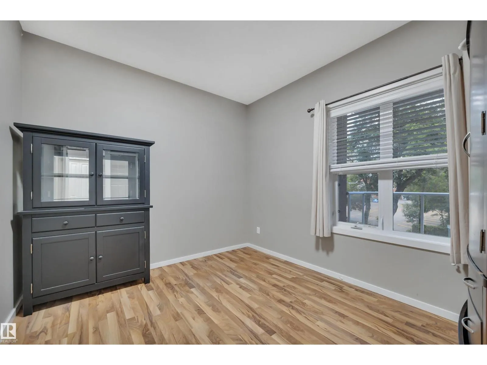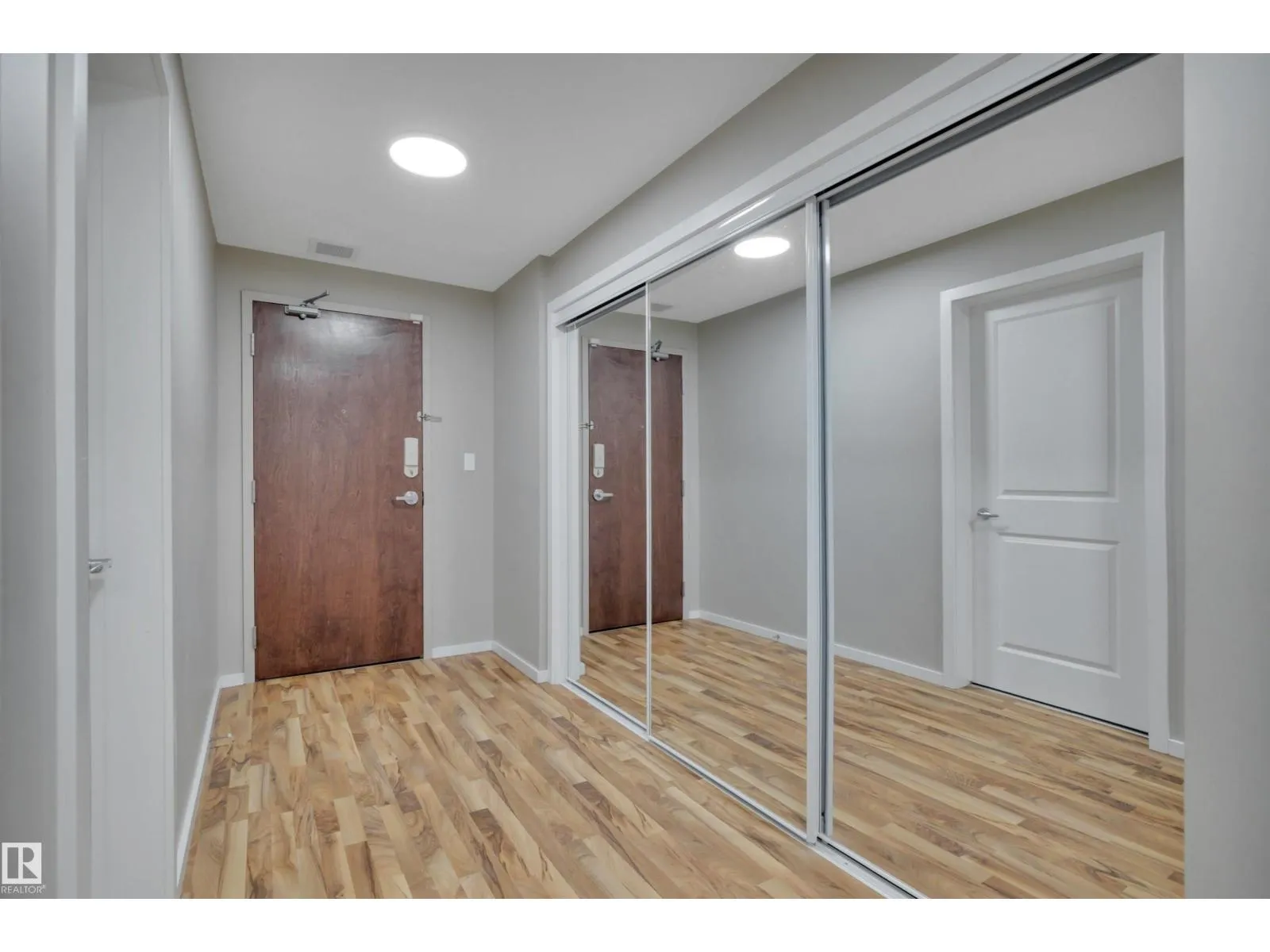 Gorgeous renovated 2-bedroom*, 2-bath condo with titled heated underground parking on a quiet, tree-lined street. Freshly painted with new LED lighting, custom mirrored closet doors, upgraded faucets, and modern hardware throughout. Over 1,000 sqft with 9-ft ceilings, this bright unit is filled with natural light from large windows. The kitchen features stainless steel appliances, slate tile, a walk-in pantry, and a raised eating bar. The living room is centrally located, with the primary suite and 4-pc ensuite on one side and a den with French doors (includes armoire, used as a bedroom) on the other for added privacy. Slate tile in kitchen, laundry, and baths; laminate in living, dining, and bedrooms; plus in-floor heating throughout. Enjoy elegant downtown living close to all amenitiesâjust 230m to the LRT and minutes to the University. (id:27476)