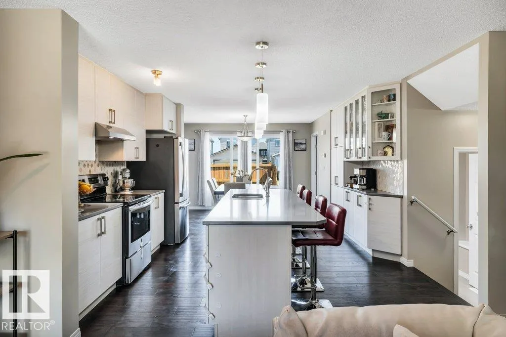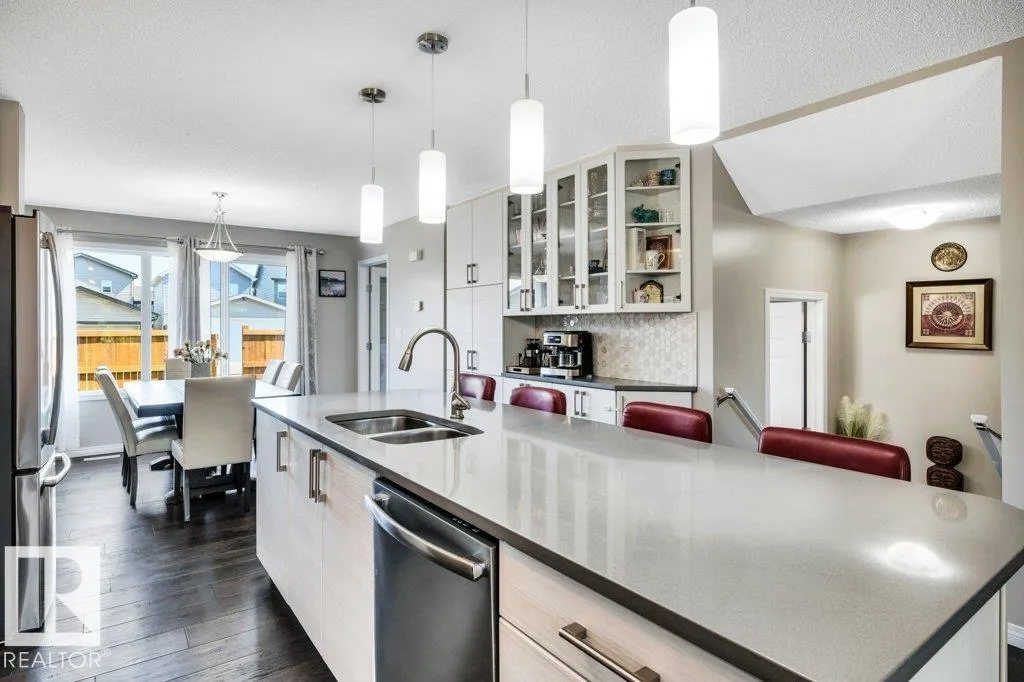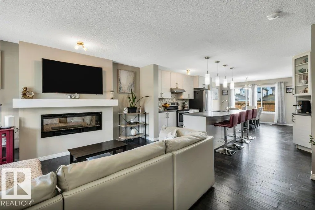 AFFORDABLE DETACHED home in desirable SW Edmonton! Stylish Open-Concept Layout! This beautifully designed 3-bedroom, 2.5 bath home offers a modern living space with a stunning open concept main floor featuring a glass-enclosed foyer, oversized QUARTZ kitchen island, ceiling-height cabinetry, additional full wall of cabinets perfect for coffee bar and updated stainless appliances, this Brookfield built home is designed for both functionality and style, modern linear fireplace is the centre point of the cozy living room, dining area a good size, 1/2 bath and laundry room complete the main level. Upstairs, the generously sized primary bedroom includes a walk-in closet for added convenience and full bath, additonal 2 bedrooms share a 4 piece bath, lower level unspoiled and ready for your development. Backyard is fully fenced and landscaped with deck, full double concrete parking pad and additional space to park toys put a shed etc. This is NOT a zero lot line property. Wonderful location shows 10/10! (id:27476)
