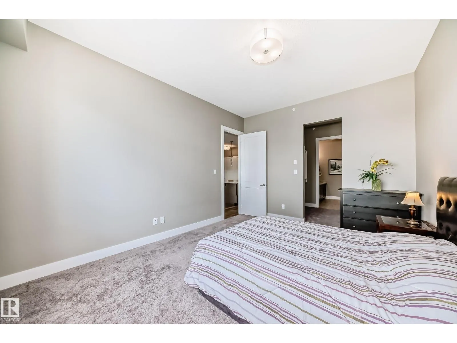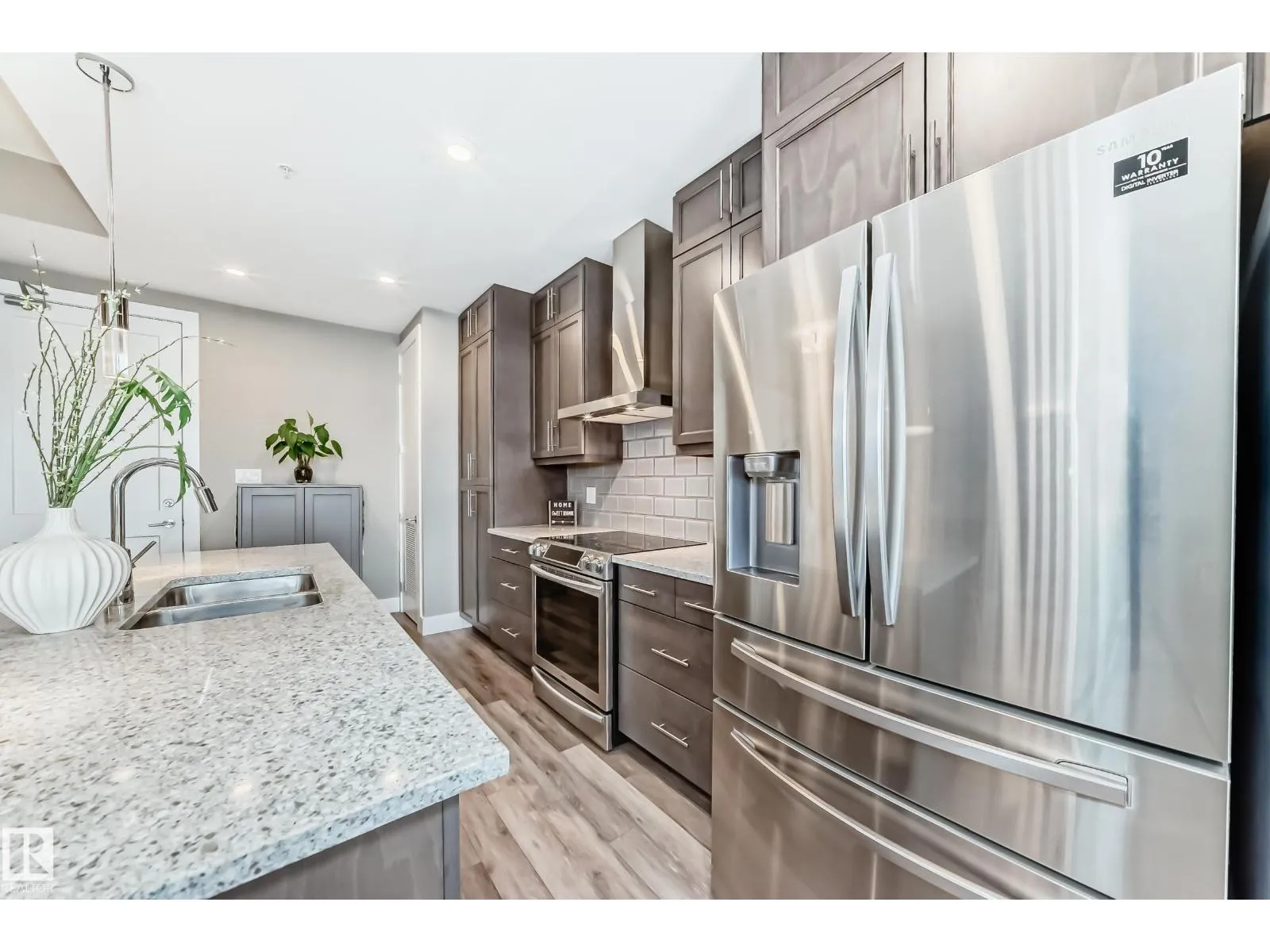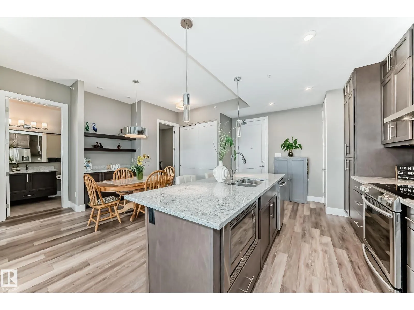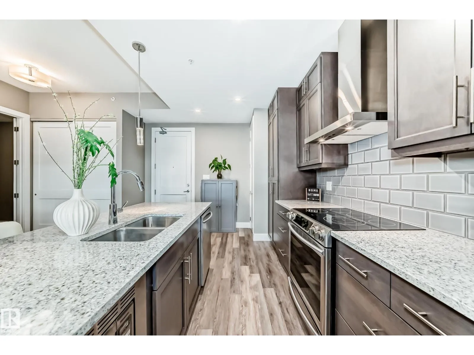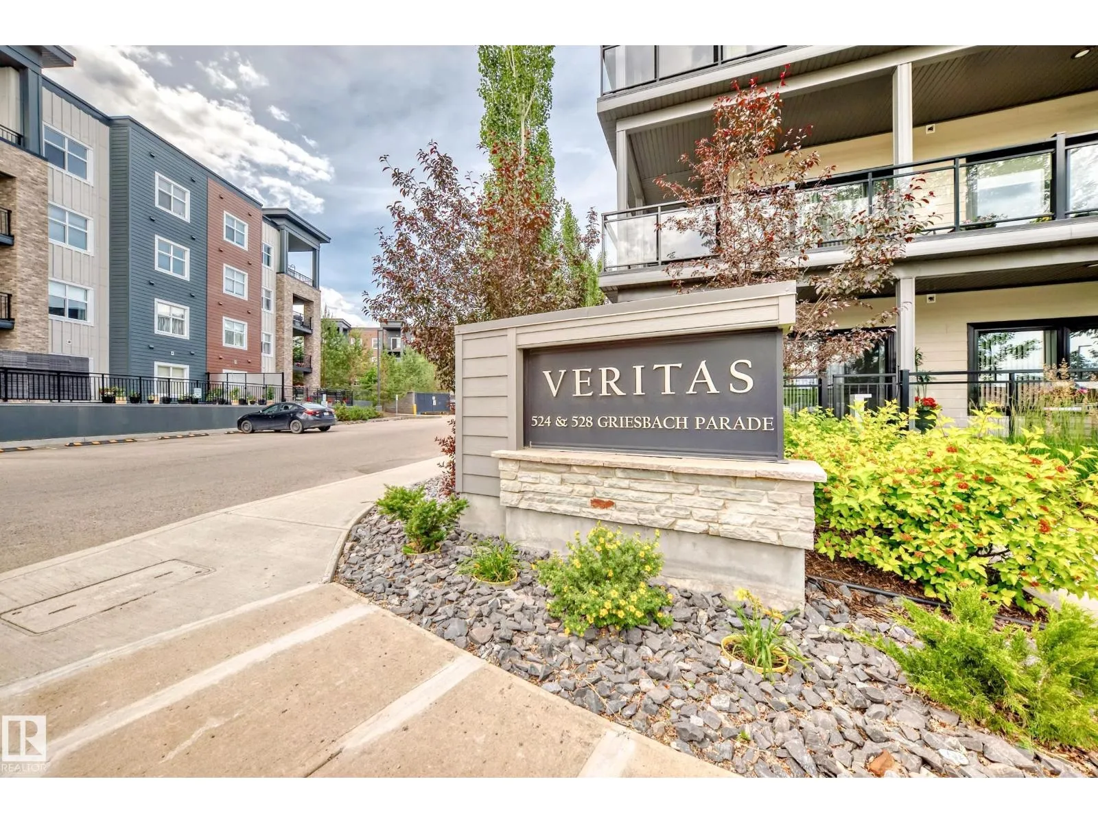 Welcome to this Superior Curb Appeal top floor, 2 bedrooms, 2 bathrooms condo offers Unparalleled Value and Build Quality, situated in the desirable Griesbach community! only steps to Lakes, Park, Playground, Walking-trail, K-9 School, Shopping, shops, restaurants, Northgate ETS, etc... Features open concept, large & bright 10 ft ceiling living room with luxury vinyl plank floorings throughout enhance the sophistication & elevate the allure of this home! Great balcony offers beautify downtown view & perfect for summer BBQ! Spacious kitchen boasts SS appliances, large kitchen island, quartz countertops & an abundance of cabinets. 2 sizable bedrooms & a 4 piece bathroom. King-sized master bedroom c/w a 4pc en-suite & walk-through closet. An in-suite laundry with high-end front load washer & dryer. Title heated underground parking stall with a storage cage. Building amenities including fitness room, guest suite & social room. Shows 10/10! Quick possession available. Just move-in & ENJOY! (id:27476)