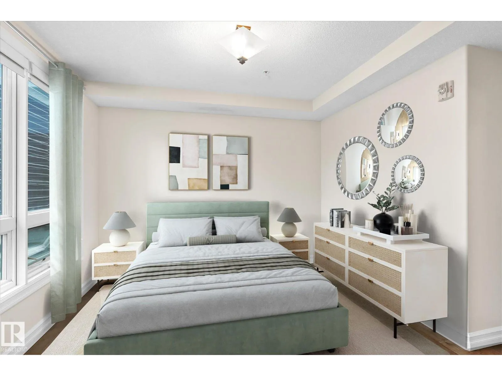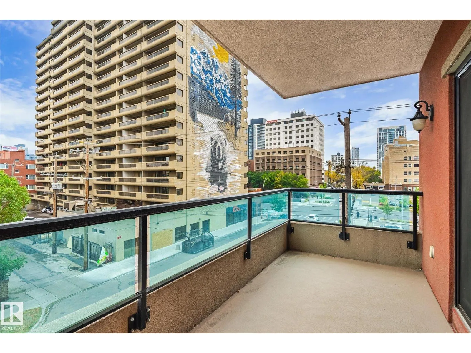 Experience refined urban living in this 3rd floor CORNER UNIT at the spectacular MERIDIAN PLAZA. Designed for entertaining, the open-concept layout showcases hardwood floors, 9' ceilings, a cozy gas fireplace, and an elegant living and dining area bathed in NATURAL LIGHT from south-facing windows & patio doors to the balcony. The well-appointed kitchen features granite countertops, stainless steel appliances, and a stylish breakfast bar. The primary suite offers a spa-inspired 5pc ensuite with dual vanities, soaker tub, glass shower, and a spacious walk-in closet. A second generous bedroom and full bath are privately situated on the opposite side of the suite. Additional highlights include in-suite laundry with storage, TITLED UNDERGOUND PARKING, and access to PREMIUM AMENITIES: a Mediterranean-style atrium, fitness centre, owners' lounge, event space with a full kitchen, & bike storage. Just one block to Jasper Ave and steps from restaurants, trails, shopping conveniences, & the Ice District. (id:27476)