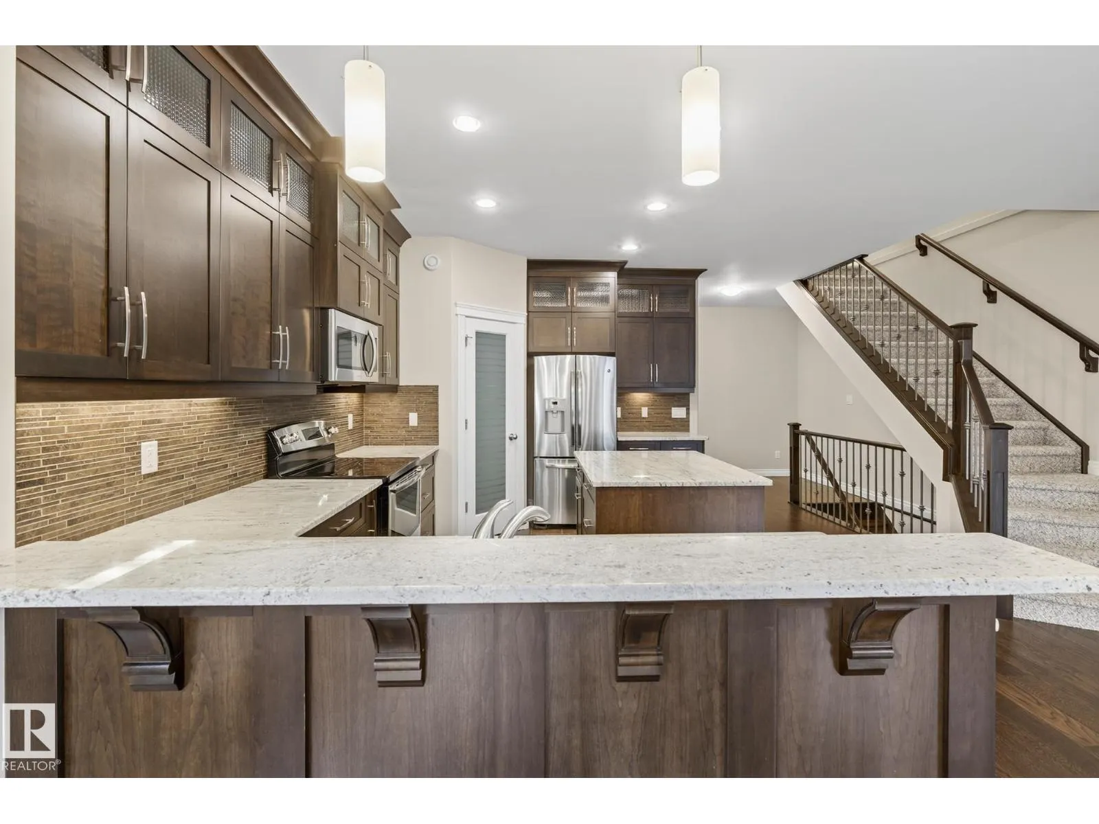 Welcome to McKernan! This beautifully built 3-bedroom, 2-storey half duplex offers over 1,830 sq. ft. of elegant living space steps from the University of Alberta. Thoughtfully designed and energy efficient, the exterior walls are foam-insulated, plus 1 rigid foam exterior insulation for the acrylic stucco R40 value energy efficiency. Featuring 9-foot ceilings, rich oak hardwood, and a cozy gas fireplace on the main floor. The gorgeous kitchen showcases mocha-stained maple cabinetry, granite counters, a large island, stainless steel appliances, and a corner pantry. A main floor den is perfect for a home office or guest room. Upstairs, the spacious primary suite includes a 5-piece ensuite and walk-in closet, with laundry conveniently nearby. Enjoy a maintenance-free composite deck, brick patio, and detached garage with extra parking. With quality finishes and timeless style, this home offers comfort and value in one of Edmontonâs most sought-after central neighbourhoods. (Some photos virtually staged) (id:27476)