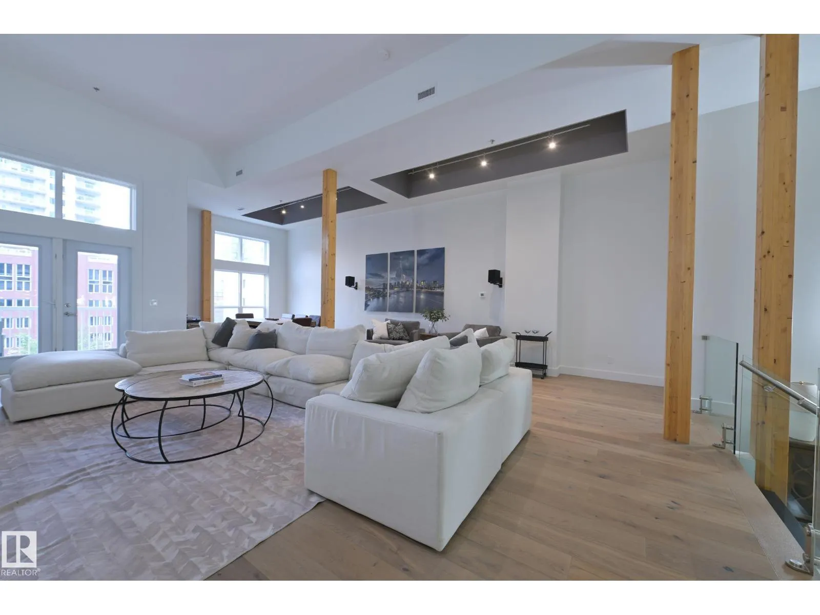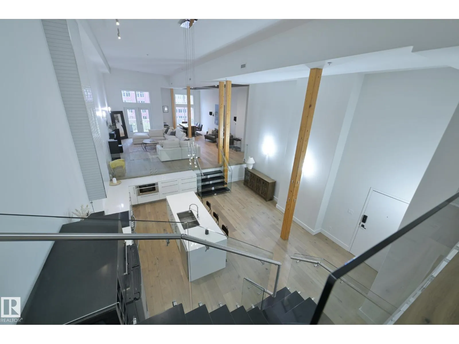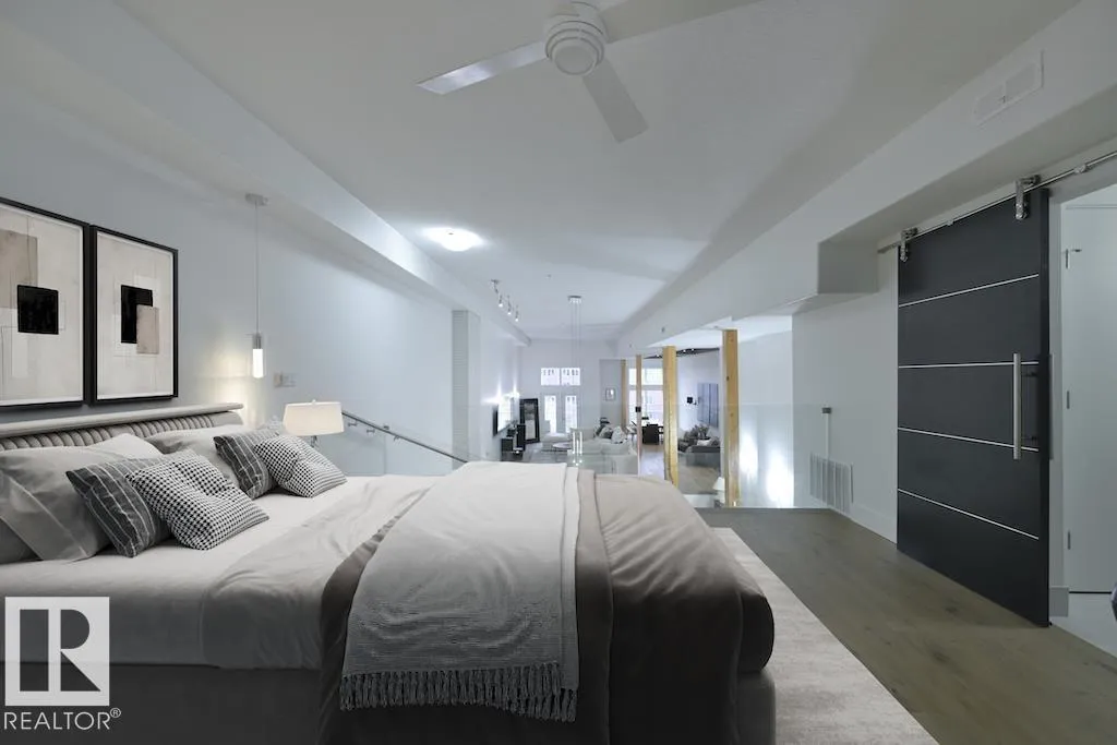 A very rare opportunity to own the PENTHOUSE suite in the sought after Morris Lofts, located in the heart of downtown Edmonton. Like nothing you've seen before, renovated from top to bottom, this home is absolutely spectacular. The bright & airy floor plan is flooding with natural light, hardwood floors, & soaring 24 foot ceilings that will take your breath away upon entry. Every detail of this home is well thought out creating the perfect layout. Offering a large storage room, laundry room, space for an office, pool table or workout space, living & dining space. Kitchen features 8 foot island w/ waterfall quartz countertops, expanding around the exterior allowing for tons of storage & counter space, custom tiled hood fan rising 12 ft, s/s appliances and custom cabinetry. The open glass riser staircase leads you to the luxurious suite with a lrg walk in closet, & tiled en-suite. Enjoy your summer evenings on your covered balcony which offers a view 104th street market & the sunset. (id:27476)
