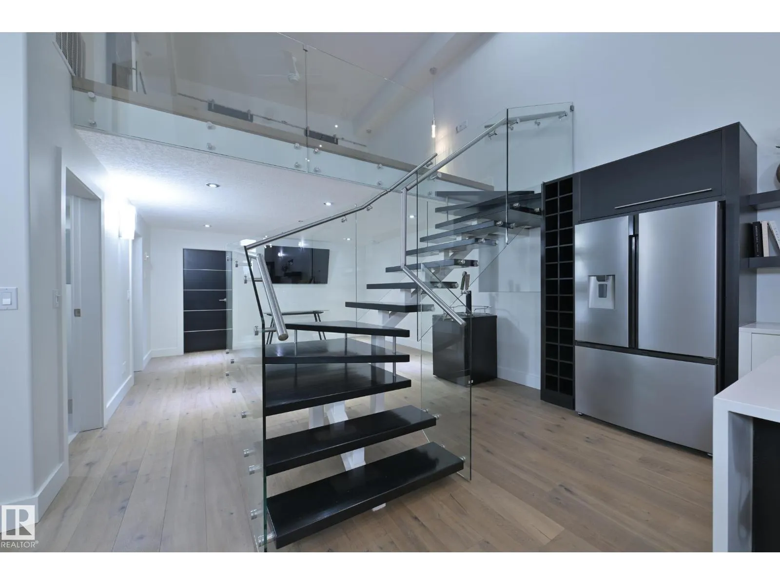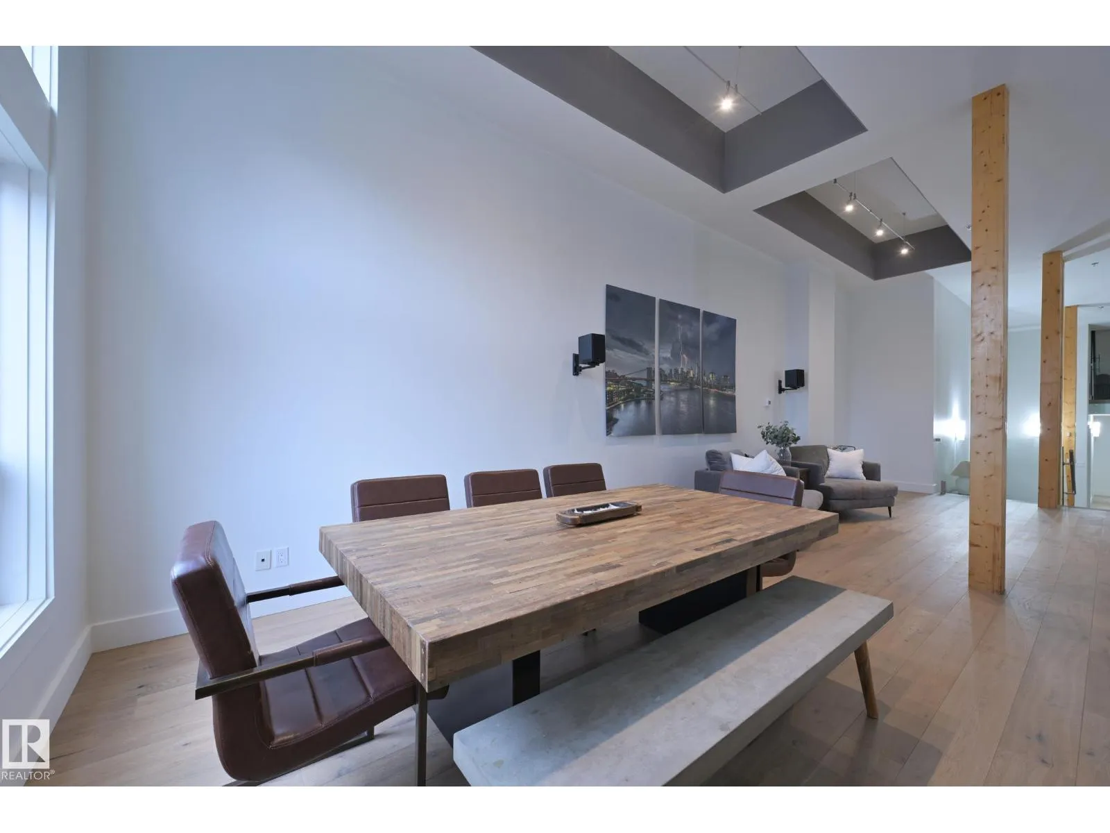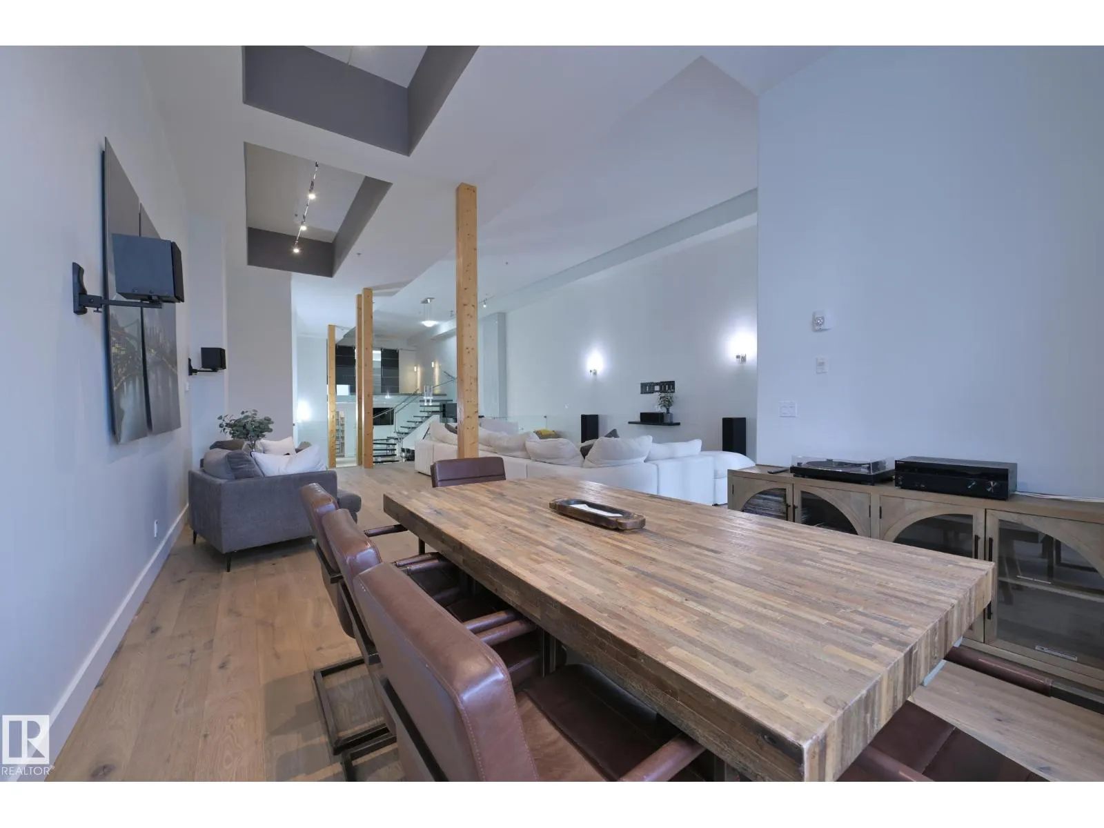 A very rare opportunity to own the PENTHOUSE suite in the sought after Morris Lofts, located in the heart of downtown Edmonton. Like nothing you've seen before, renovated from top to bottom, this home is absolutely spectacular. The bright & airy floor plan is flooding with natural light, hardwood floors, & soaring 24 foot ceilings that will take your breath away upon entry. Every detail of this home is well thought out creating the perfect layout. Offering a large storage room, laundry room, space for an office, pool table or workout space, living & dining space. Kitchen features 8 foot island w/ waterfall quartz countertops, expanding around the exterior allowing for tons of storage & counter space, custom tiled hood fan rising 12 ft, s/s appliances and custom cabinetry. The open glass riser staircase leads you to the luxurious suite with a lrg walk in closet, & tiled en-suite. Enjoy your summer evenings on your covered balcony which offers a view 104th street market & the sunset. (id:27476)