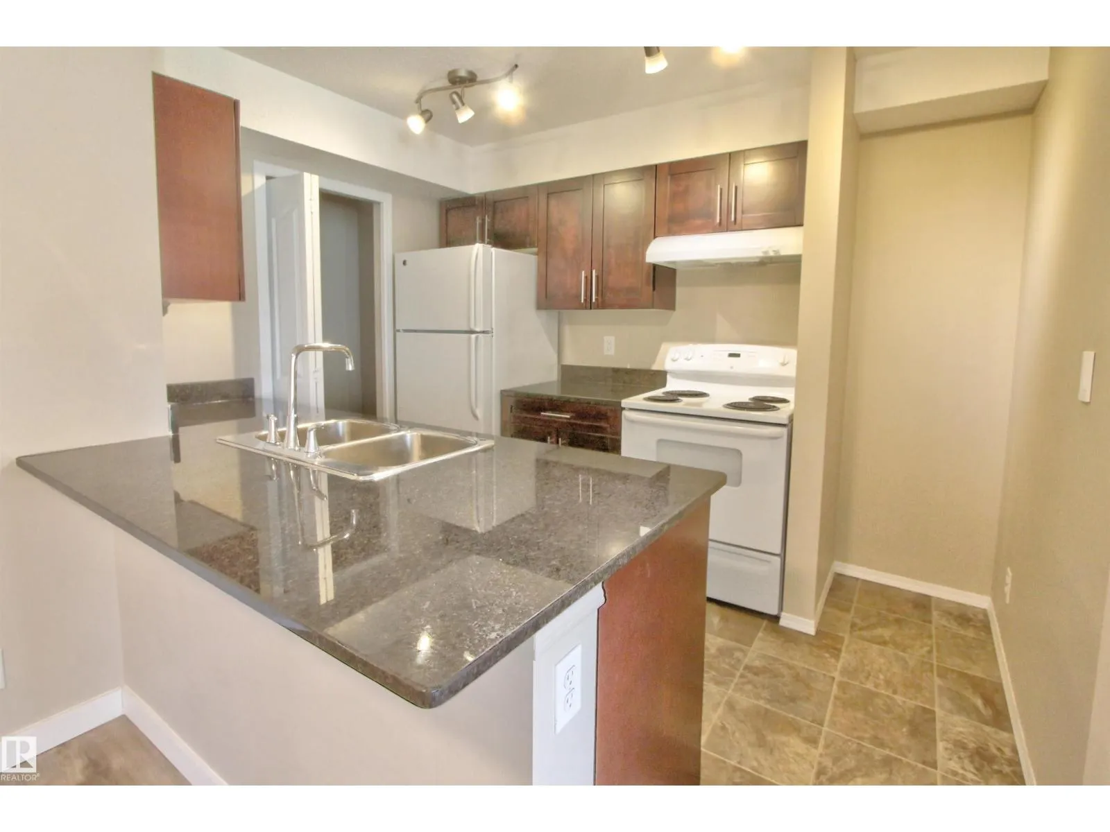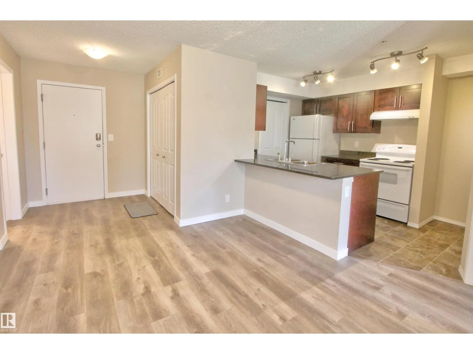 Welcome to this beautifully maintained 2-bedroom, 1-bathroom main floor condo offering comfort, convenience, and exceptional value. This stylish unit features vinyl plank flooring throughout and a modern kitchen with granite countertops, a breakfast bar, and a convenient storage room/pantry. The bright, open-concept living space extends to a private, treed balcony, perfect for relaxing or entertaining outdoors. Enjoy the ease of in-suite laundry, rough-in for air conditioning and the rare bonus of two titled parking stallsâone above ground and one undergroundâplus a secure storage room for added space. Ideally located just steps from Walker Park, schools, and shopping, this home combines modern living with everyday practicality in a fantastic community. Perfect for first-time buyers, downsizers, or investorsâthis one is a must-see! (id:27476)