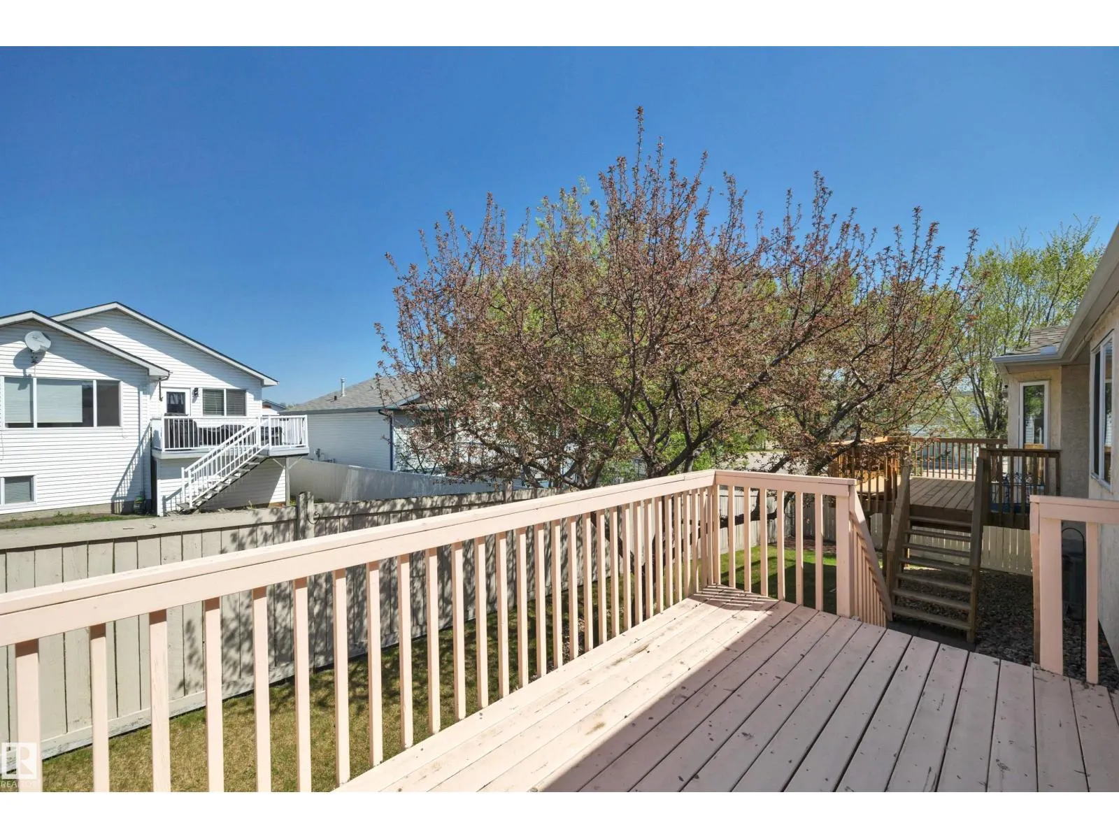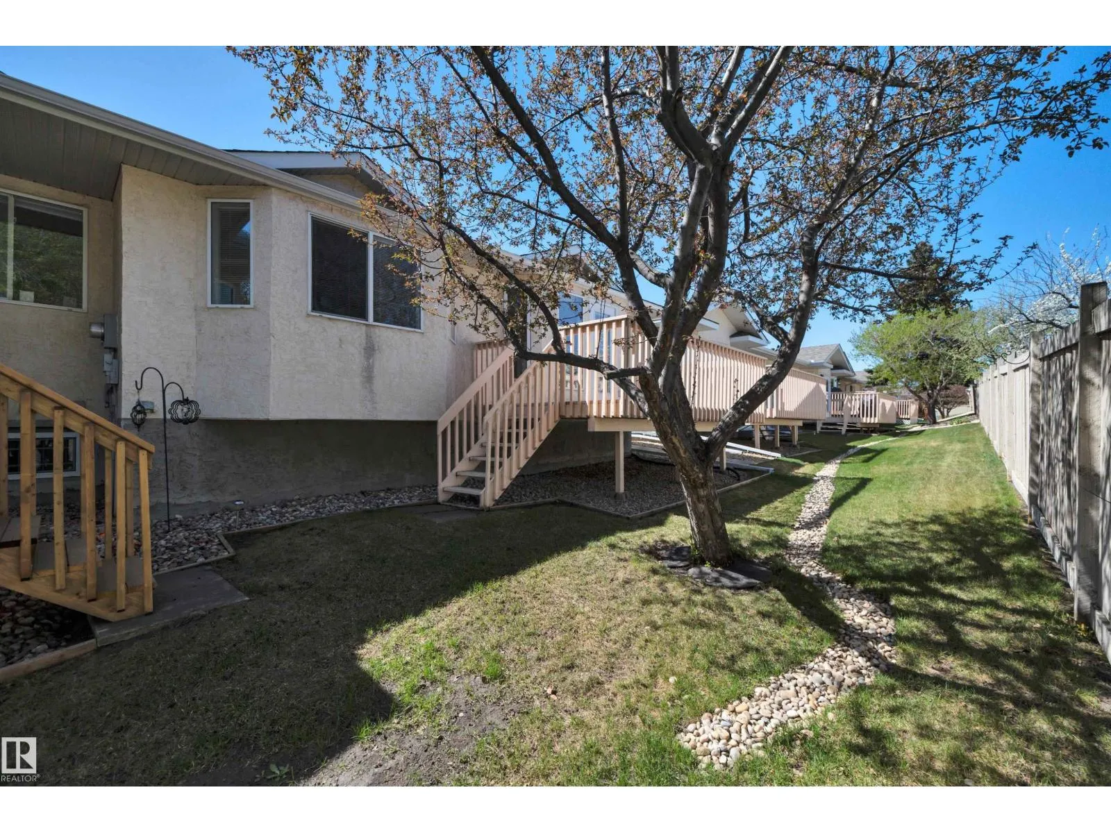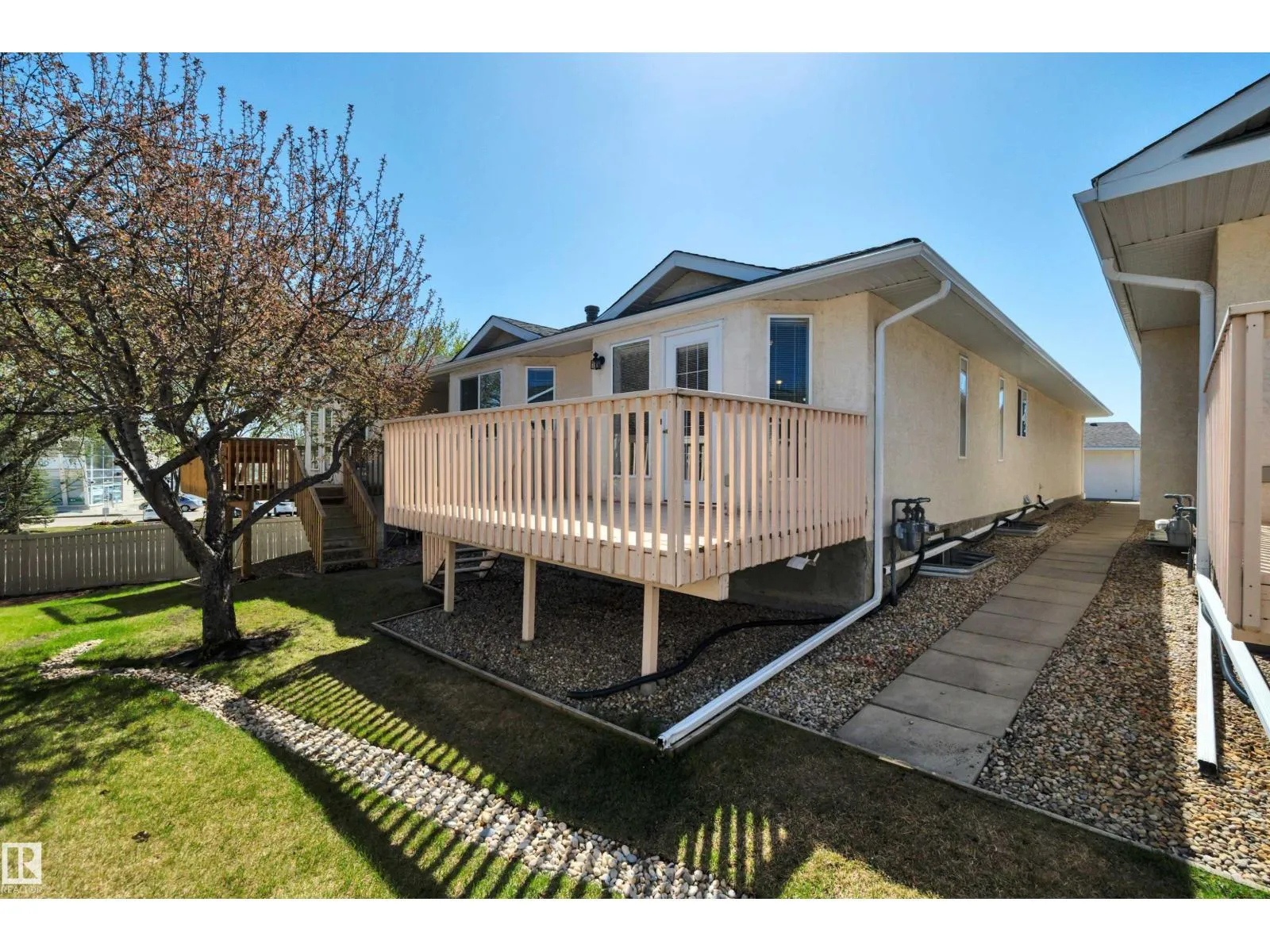 This bright and beautifully maintained half-duplex bungalow with attached double garage is situated in the sought after 55+ adults-only community, Miller Garden Estates. The open concept main floor features all that you need, including a large kitchen with pantry and ample counter space, a dining area, spacious living room, main floor laundry, along with 2 bedrooms and 2 full baths. The rear deck with built-in BBQ line makes entertaining a breeze. Relax in your primary bedroom with bay window, ensuite, and large walk-in closet. The unfinished basement offers a brand new hot water tank and large flex space for storage or large family gatherings. Easy access to the Anthony Henday, public transit, Clareview Recreation Centre, walking paths, and many shops and restaurants. You'll be close to all the action! Pet policy: up to 2 animals under 15 at the shoulder. Current condo fees only $395/mo. (id:27476)