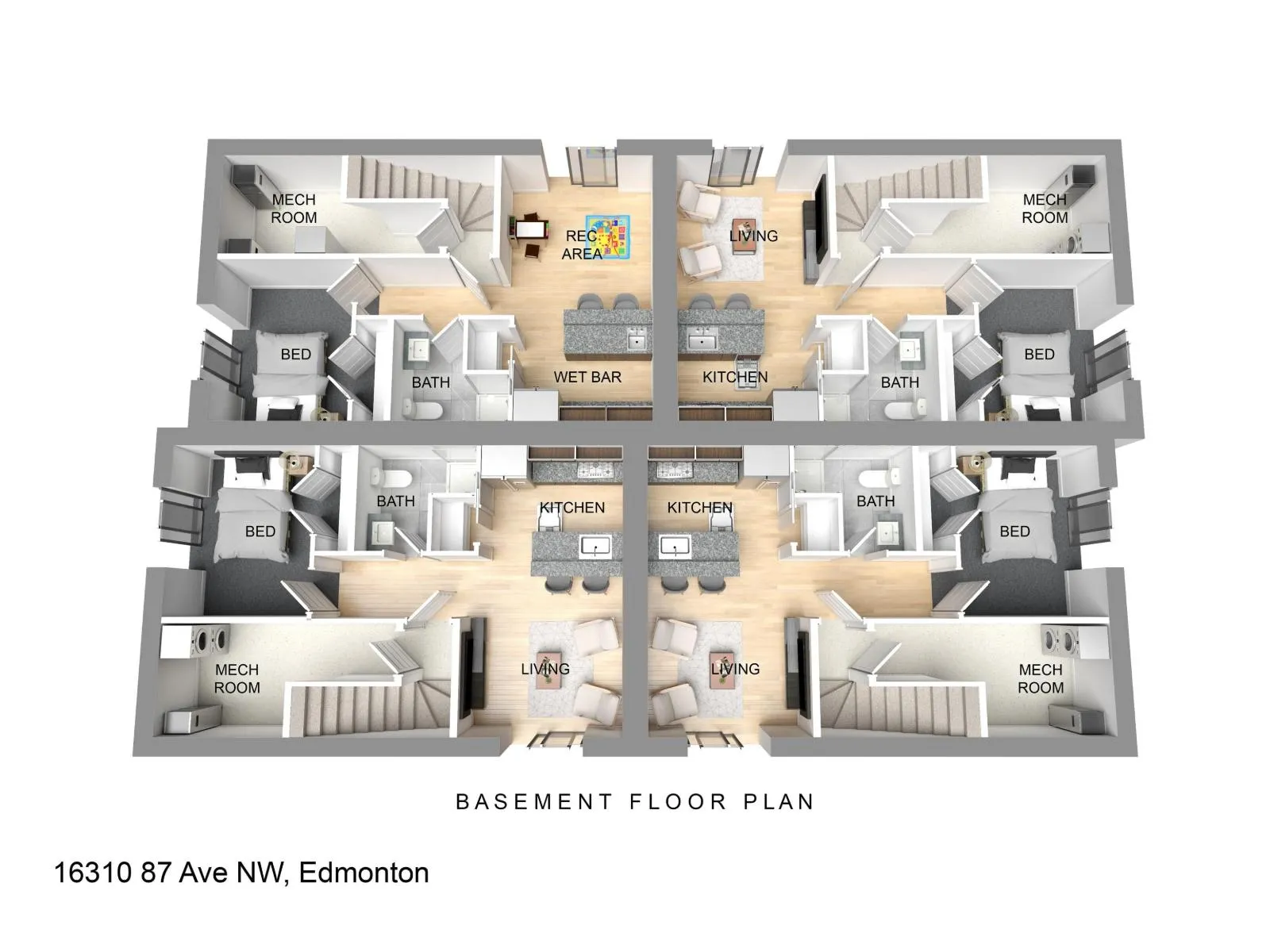 INVESTMENT GROWS FASTER IN A GREAT LOCATION! Own an upcoming new-build 4PLEX with 3 legal basement suites (7 legal doors) in West Edmonton, only 3-min drive to West Edmonton Mall, 5-min walk to Misericordia Hospital & LRT Station, and 10-min walk to Meadowlark Shopping Plaza. Bus stop is right at the front of the property! Close distance to these high-employment hubs and transit services mean STRONG tenant demand and LOW vacancy rates. It offers 7,300+ sq. ft. of refined living space with luxury vinyl on main and lower levels, plush carpet upstairs, and 9-ft ceilings. Open concept living room includes featured wall with a fireplace, kitchens with modern flat-panel cabinetry and quartz counters; baths are finished in sleek tile. Energy-smart design includes triple-pane windows, solar roof vents, 97% high-efficiency furnaces, and electric water heaters. Separate utility meters planned for all suites as a part of CMHC MLI Select requirements. Construction has started; target completion in June 2026. (id:27476)