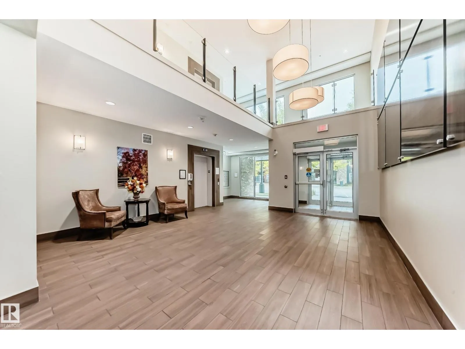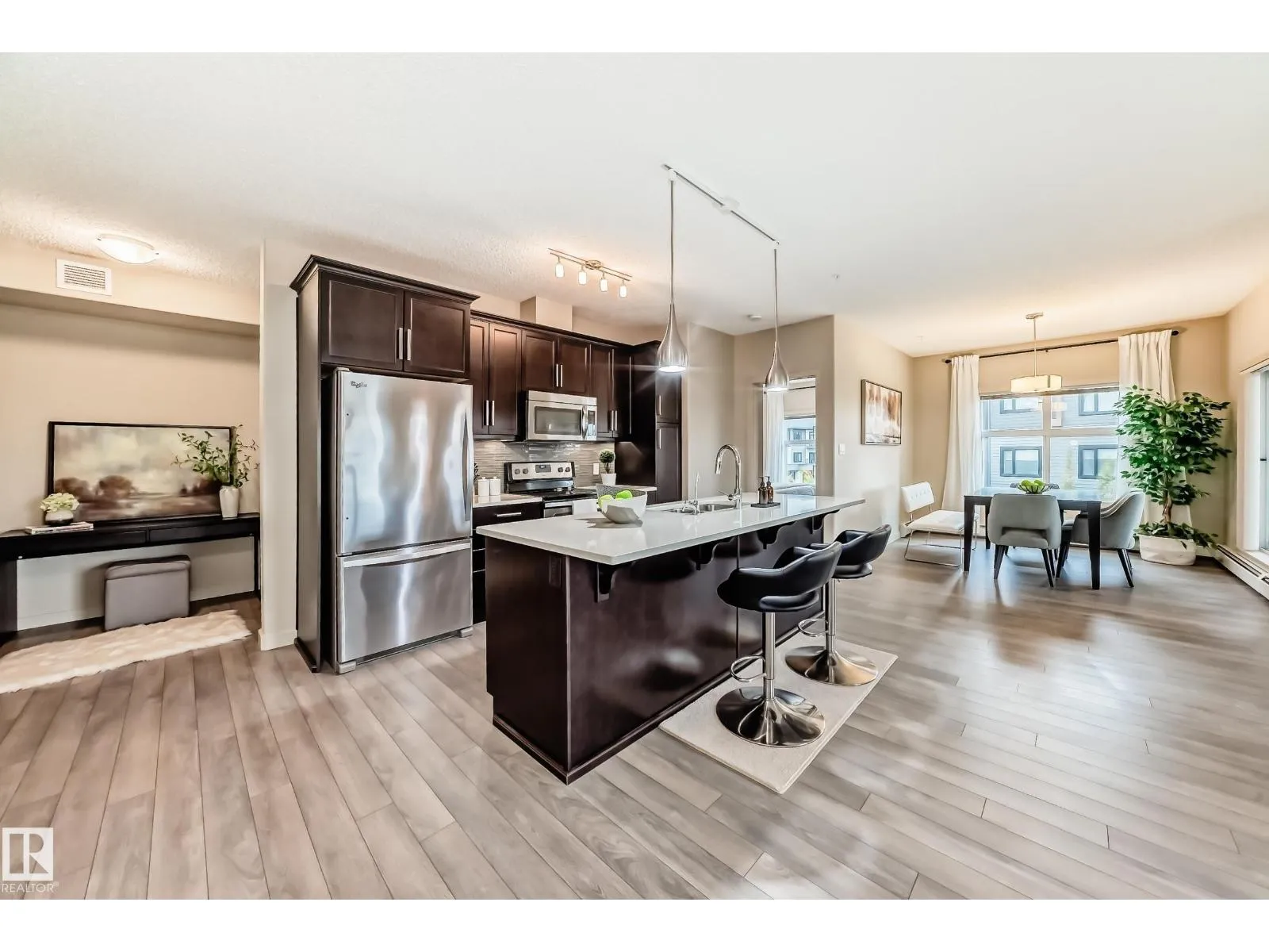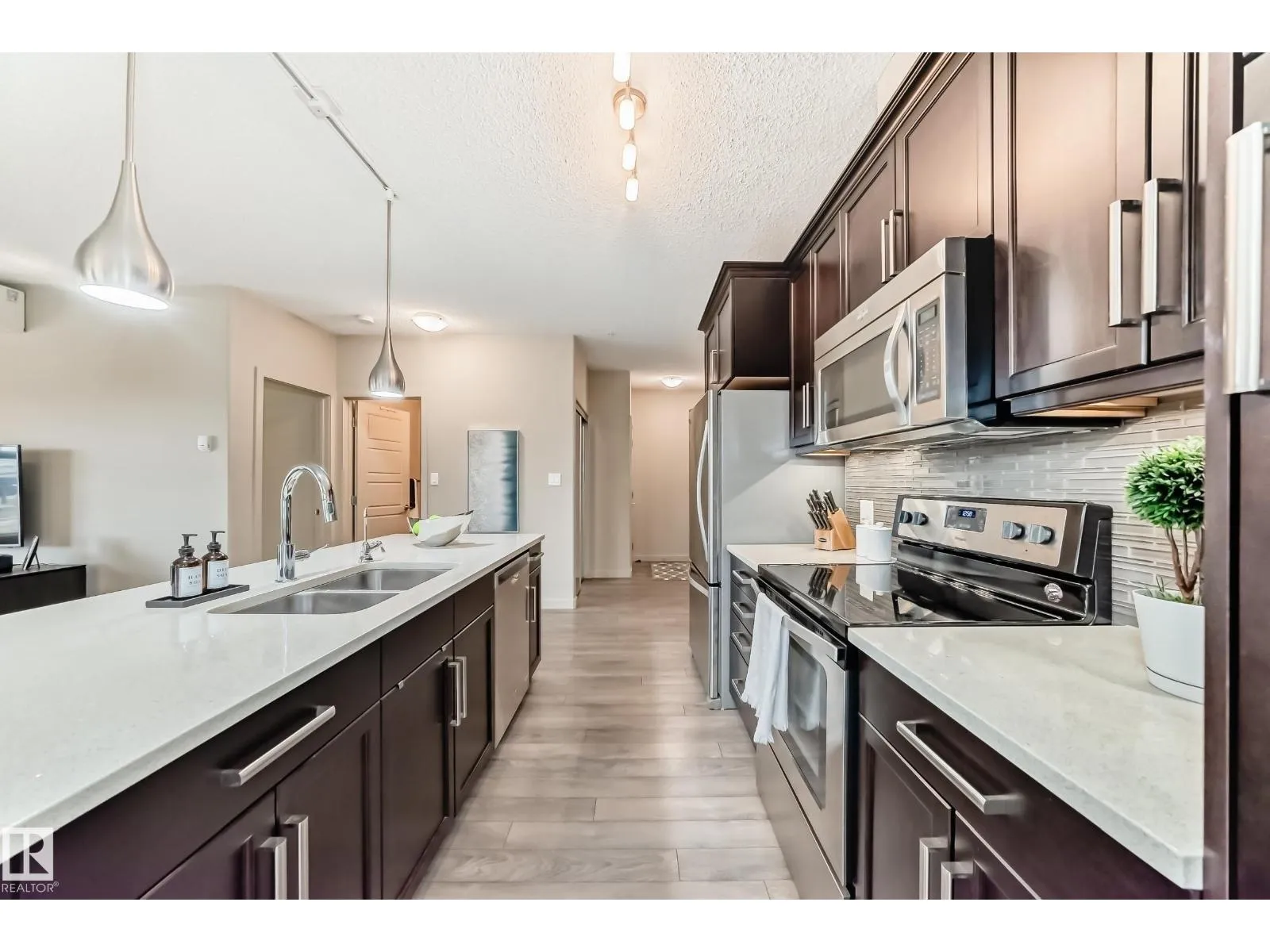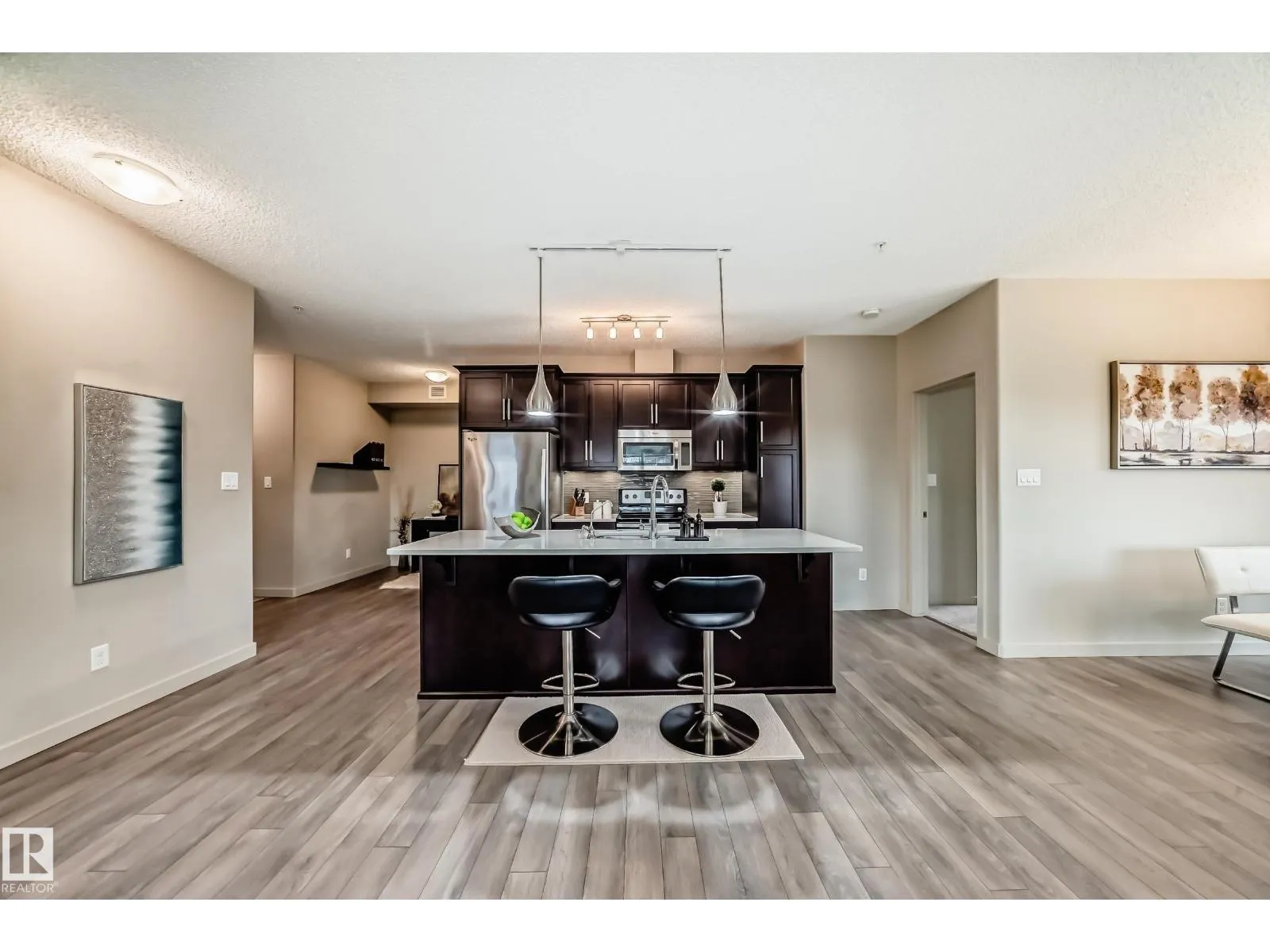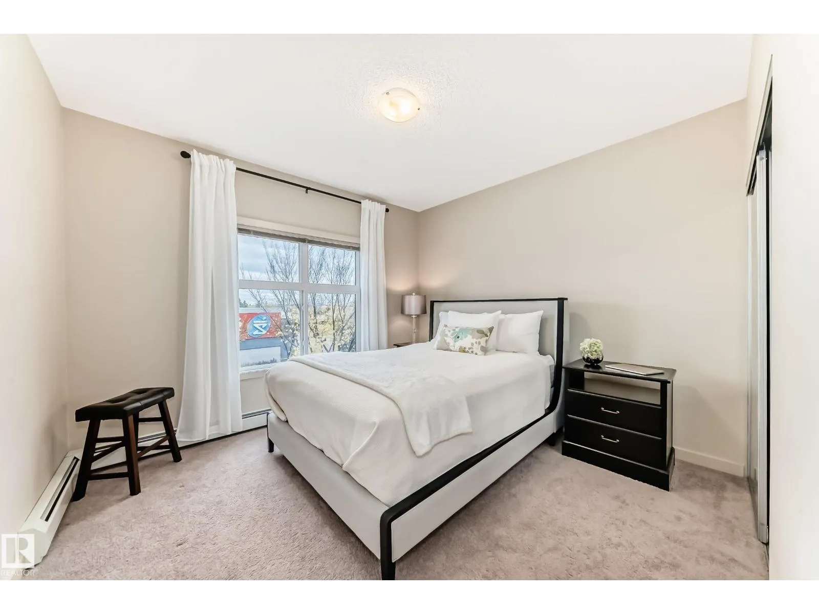 Corner Suite with 2 Beds, 2 Baths + Den, 2 Parkings in Griesbach! Welcome to this impeccably maintained corner unit in one of Edmontonâs most desirable communities. This spacious 2-bedroom, 2-bathroom + den home offers modern finishes throughout. Featuring quartz countertops, bar seating, and an open-concept layout, the kitchen flows into bright living and dining areas with access to a large covered balconyâperfect for relaxing or entertaining. Bedrooms are thoughtfully placed on opposite corners for added privacy. The primary suite includes a walk-through closet and spa-inspired ensuite, while the second bedroom sits next to a full 4-piece bath. Extras include A/C, full-size in-suite laundry, TWO titled parking stalls (one underground, one surface; both located next to entrance and elevator), and a secure storage cage in the heated parkade. Located steps from parks, cafes, restaurants, transit, and scenic walking trails, this home offers the ideal blend of urban convenience and neighborhood charm. (id:27476)