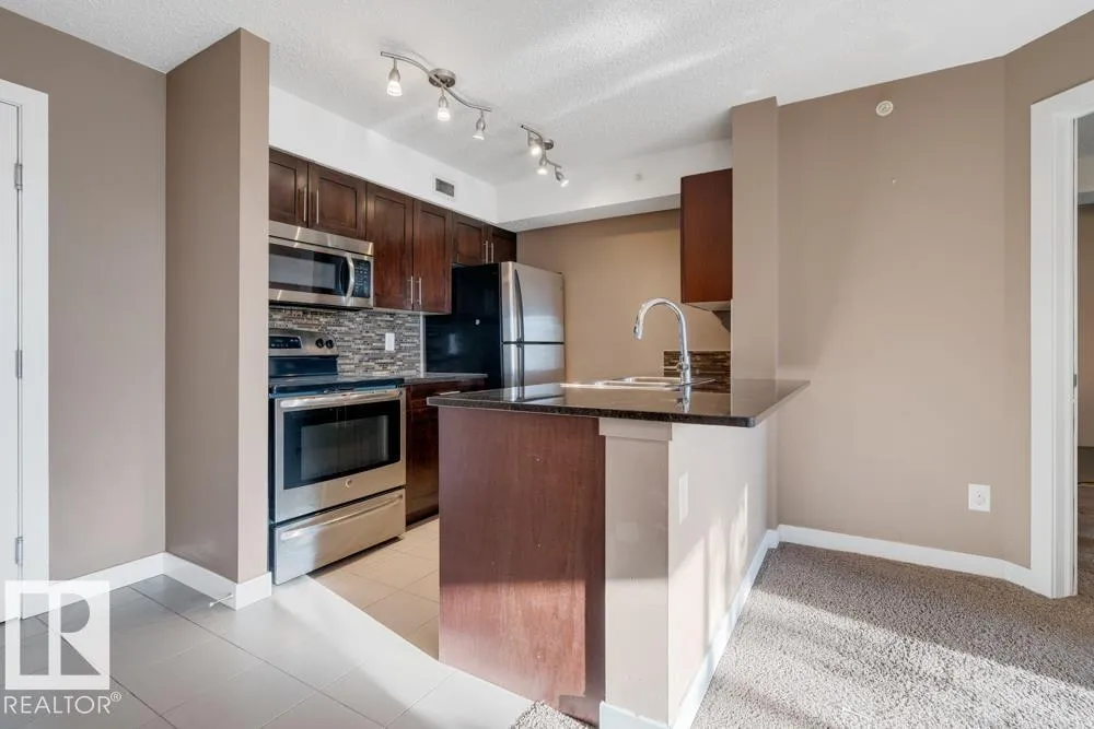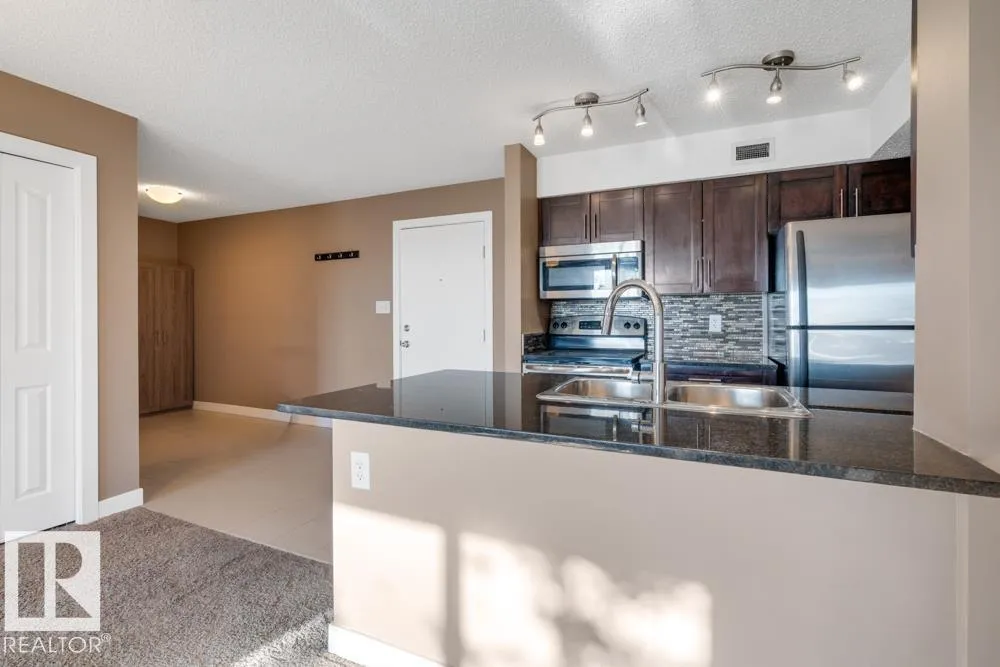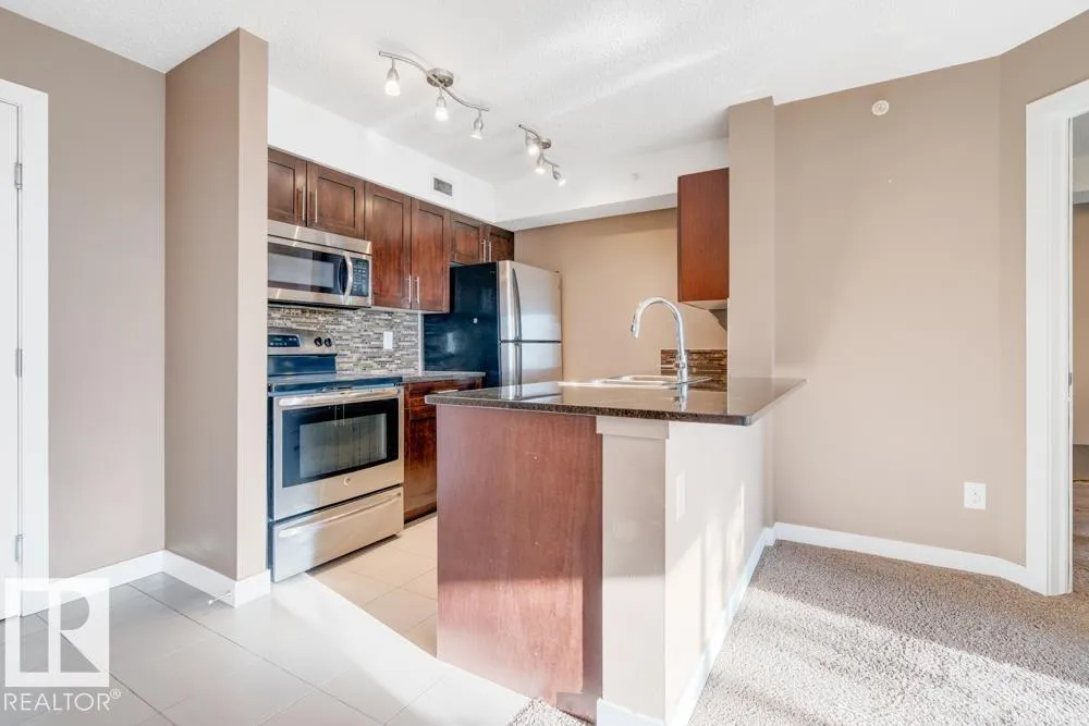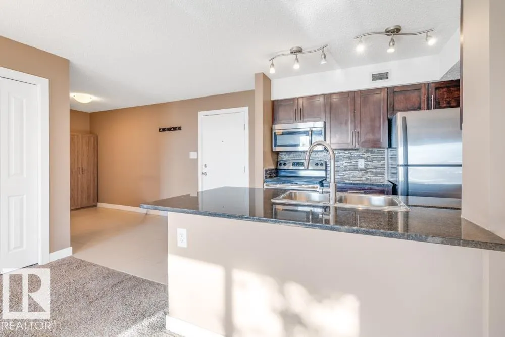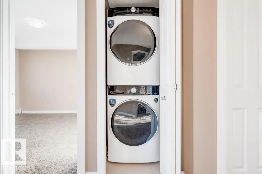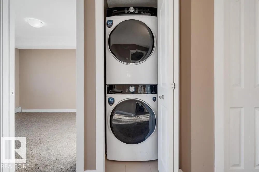 Right in the heart of Heritage Valley Town Centre, this top floor 2 bedroom, 2 bathroom condo features south facing private balcony views, with abundant sunlight, and a elegant look throughout, with lush carpets to walk on and granite countertop surfaces. The primary bedroom is highlighted by a walkthrough closet to ensuite. The large den at the foyer is ideal for office space. Brand new in-suite stacked laundry, upgraded appliances and backsplashes, add to the charm of this unit, coupled with the convenience of heated underground parking and secure storage, as well as assigned additional parking near the entryway- 2 spaces in total! Steps from public transit, restaurants, shopping, medical services, schools, rec centers and more. The building is monitored for peace of mind with security cameras. (id:27476)