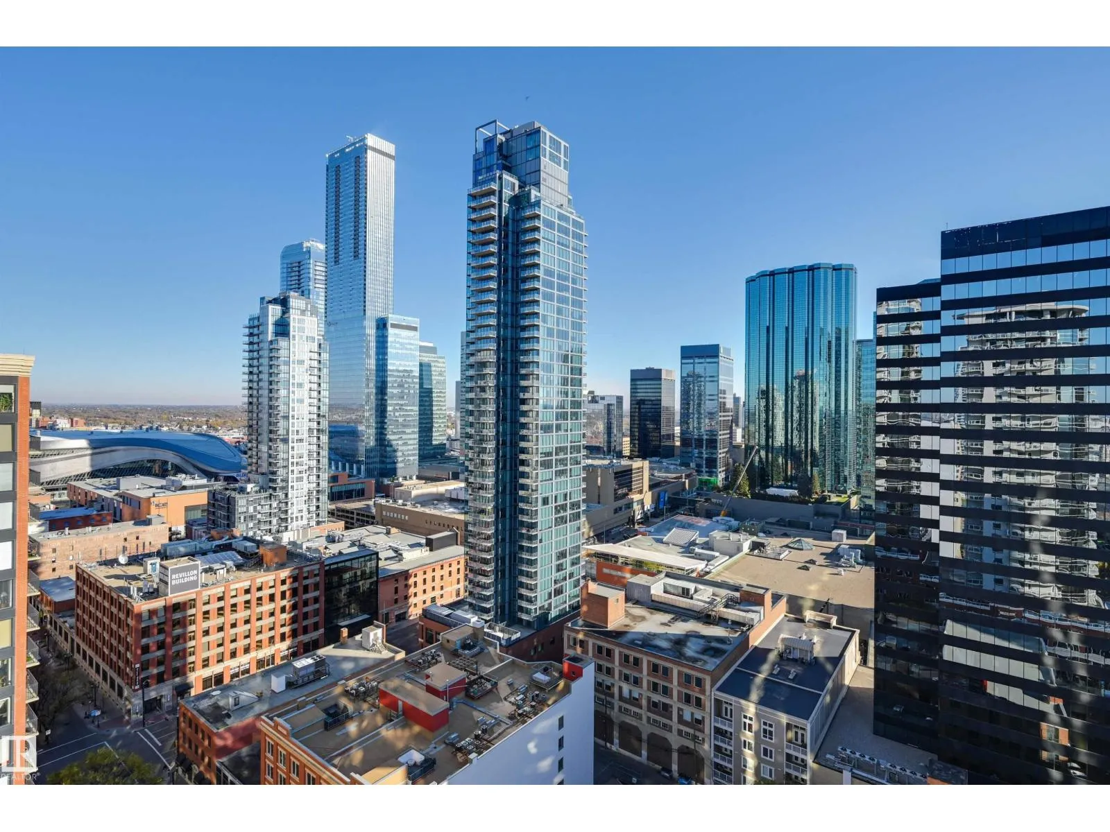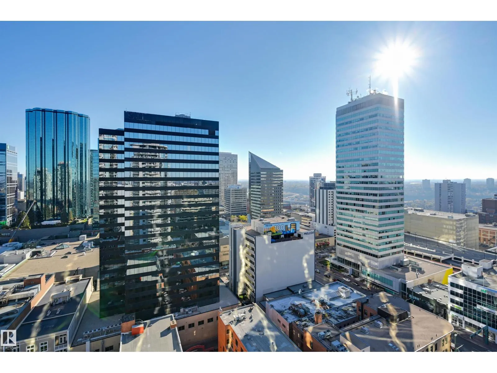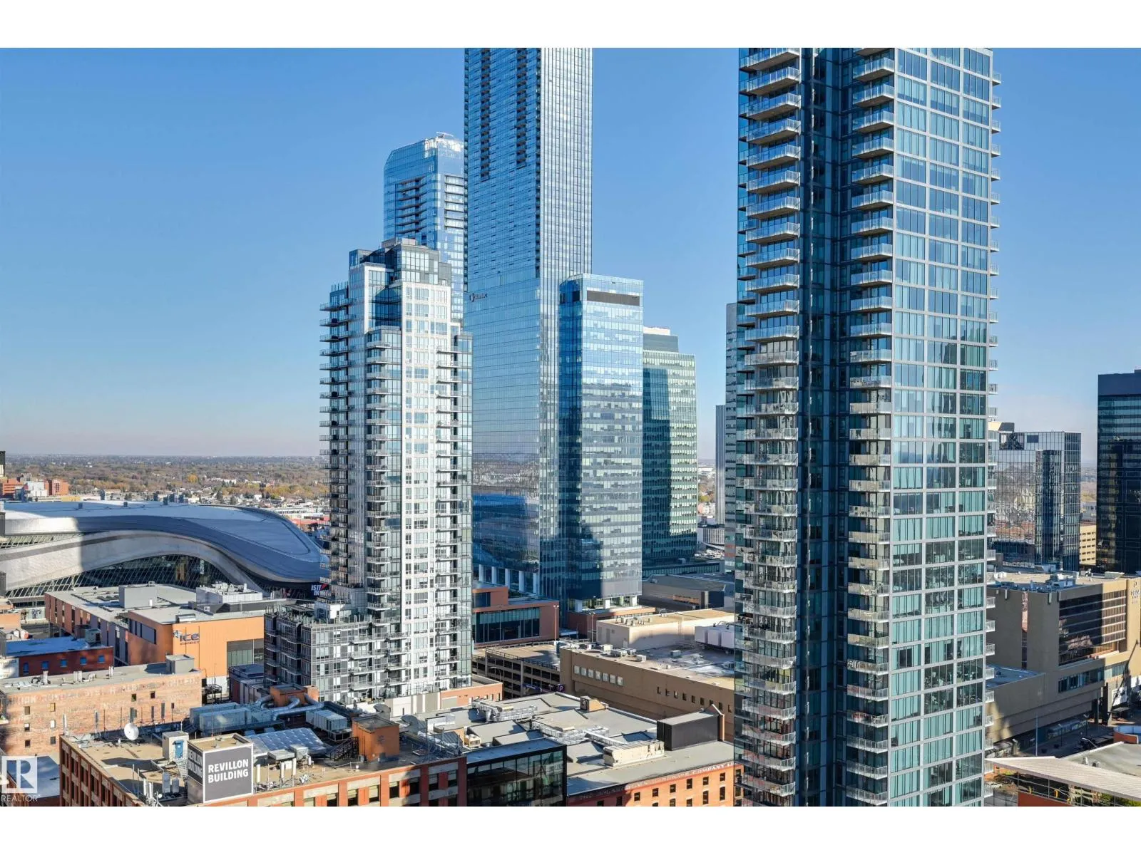 Amazing views from Floor 22, and this is just one great reason to be Downtown!! At days end, reward yourself by sitting on your balcony and taking in the Downtown and Ice District views This home offers much more than a view, as Icon is located perfectly to maximize the downtown experience! Out the front door, and you are in the centre of it. Five minutes walk to Rogers Place and MacEwan Campus, the Alberta Legislature and Govt. Centre is 10 minutes SW, & River Valley are within walking distance. The seasonal D/T Farmers' Market is out your front door. Restaurants in every direction, and LRT across the street will take you to the UofA , Nait, Millwoods, Southside, and Edmonton Int. Airport with one bus transfer! This two-bdrm/bath home offers just under 1,000 sq ft, S/S appliances, island kitchen, recent paint, primary bdrm with ensuite, large in-suite Laundry/Storage room, NG BBQ connection on the balcony, and the titled UNGRD, heated stall. D/T is getting revitalized, move in and enjoy the living. (id:27476)