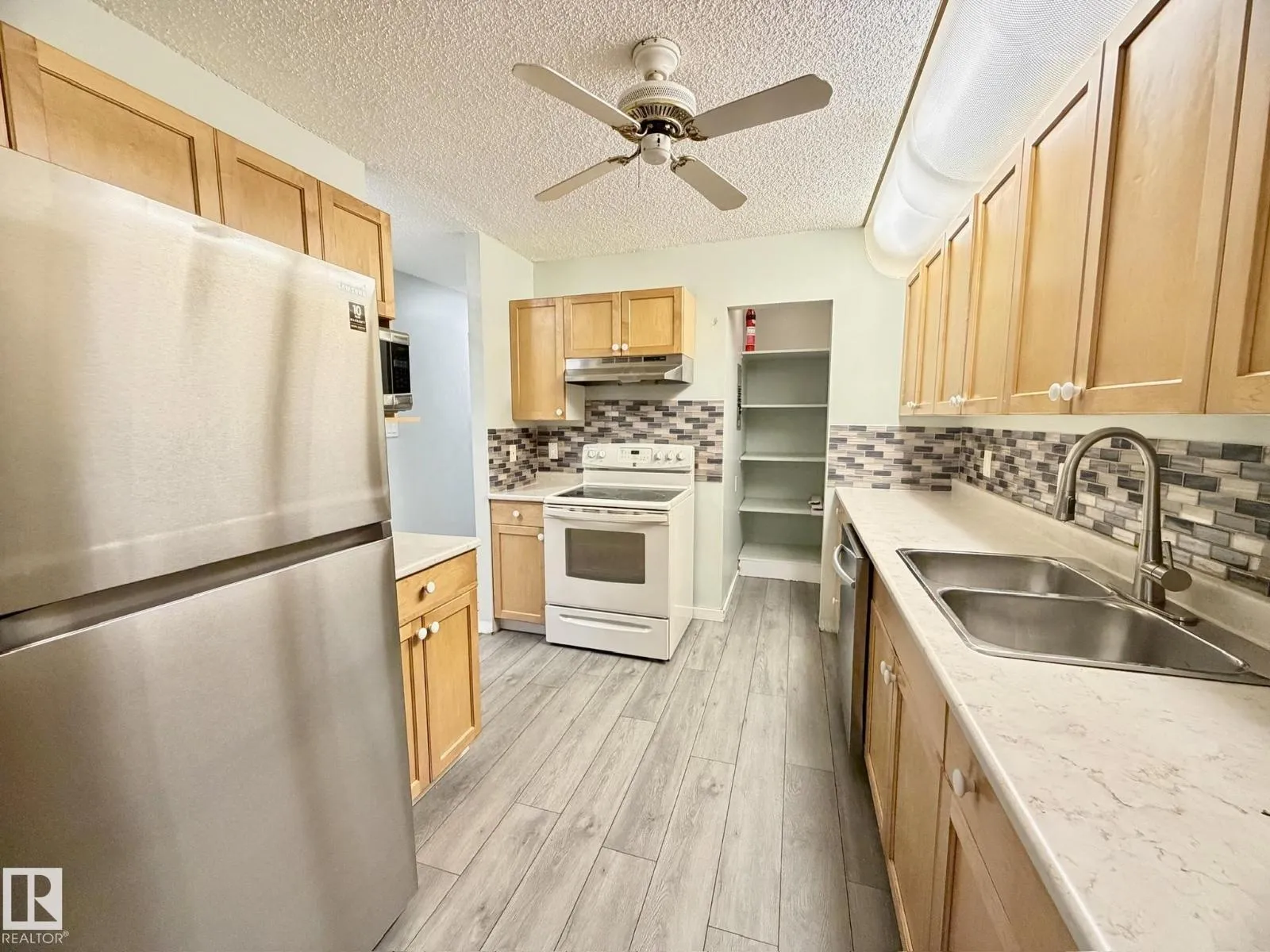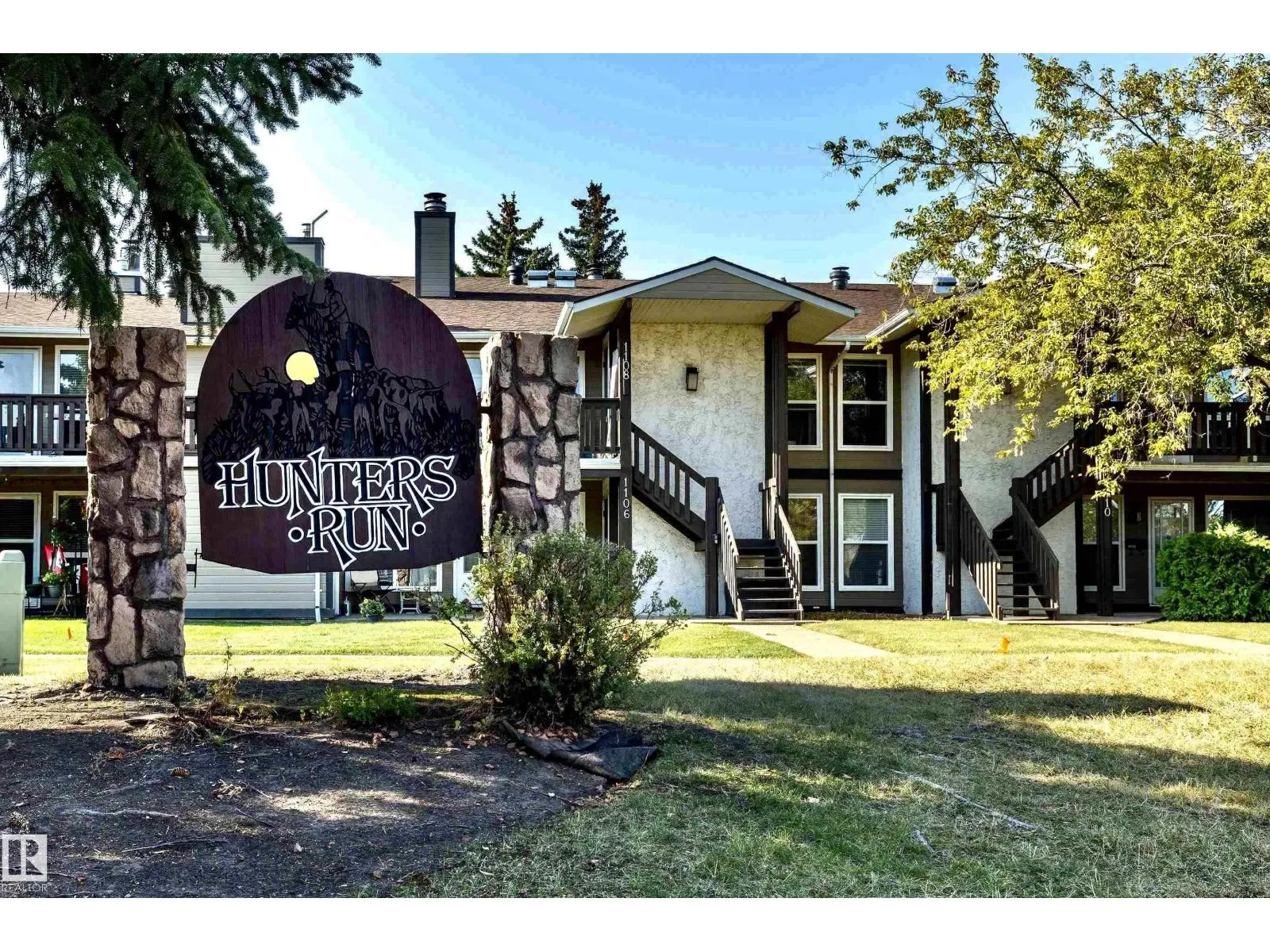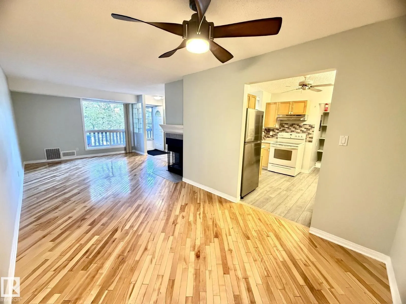 Welcome to this bright & beautifully maintained 2-bedroom carriage-style condo in the desirable community of Skyrattler! Close to parks, schools and the LRT system! Perfectly located in Hunterâs Run, this TOP FLOOR, west-facing unit offers peace, privacy, and loads of natural light. The spacious living and dining areas feature gleaming hardwood floors and a cozy tiled-surround wood fireplace, while the modern kitchen shines with maple cabinets, subway tile backsplash, and new vinyl plank flooring. The massive walk-in pantry adds incredible storage! The large primary bedroom includes a walk-through double closet with wardrobes and private access to the updated 4-piece bath. The second bedroomâwith elegant French doorsâoffers flexibility as a guest room, home office, or studio. Enjoy your private balcony surrounded by mature trees, complete with a huge outdoor storage area. With in-suite laundry, a newer high efficiency furnace, assigned parking, and a pet-friendly policy, this condo is the total package! (id:27476)