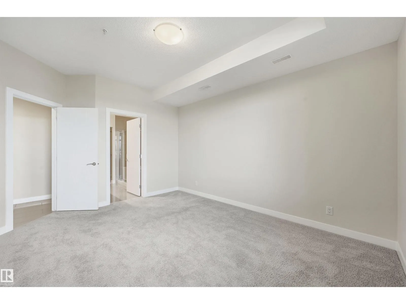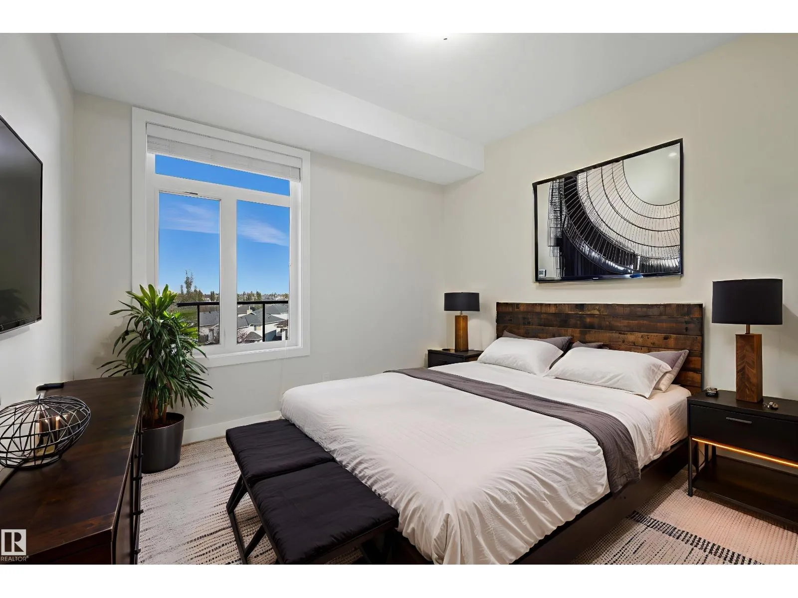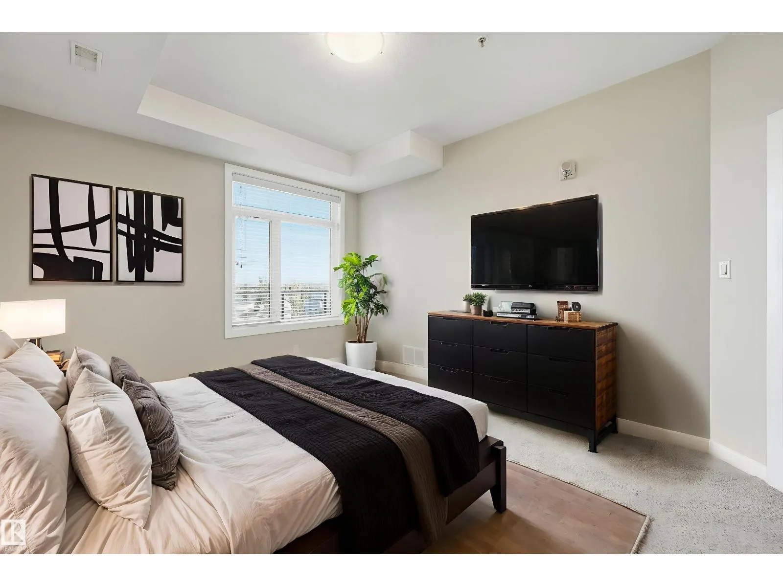 Experience luxury living at Brass III The Leger in the desirable Riverbend. This top-floor unit offers city views, showcasing craftsmanship & a well functioning floorplan. The bright, open layout features 9 ft ceilings, engineered hardwood, granite countertops, S/S appliances, maple shaker cabinets & an island w/eating bar. Living area will accommodate most furniture arrangements. Bedrooms are on opposite ends for privacy. The spacious primary suite includes a walk-in closet w/built-ins and a 4pc ensuite w/soaker tub & glass shower. 2nd bedroom for guest stays or home office/hobby studio. 3pc bathroom w/matching finishing palette. Enjoy the balcony for evening bbqs, central A/C, in-suite laundry. Double tandem underground parking stalls w/storage. Well managed complex w/healthy reserve fund. Pet-friendly & ideally located near Terwillegar Rec Centre, schools, parks & all servicing amenities. This residence combines elegance, comfort & convenience in one of Edmontonâs most sought-after communities. (id:27476)