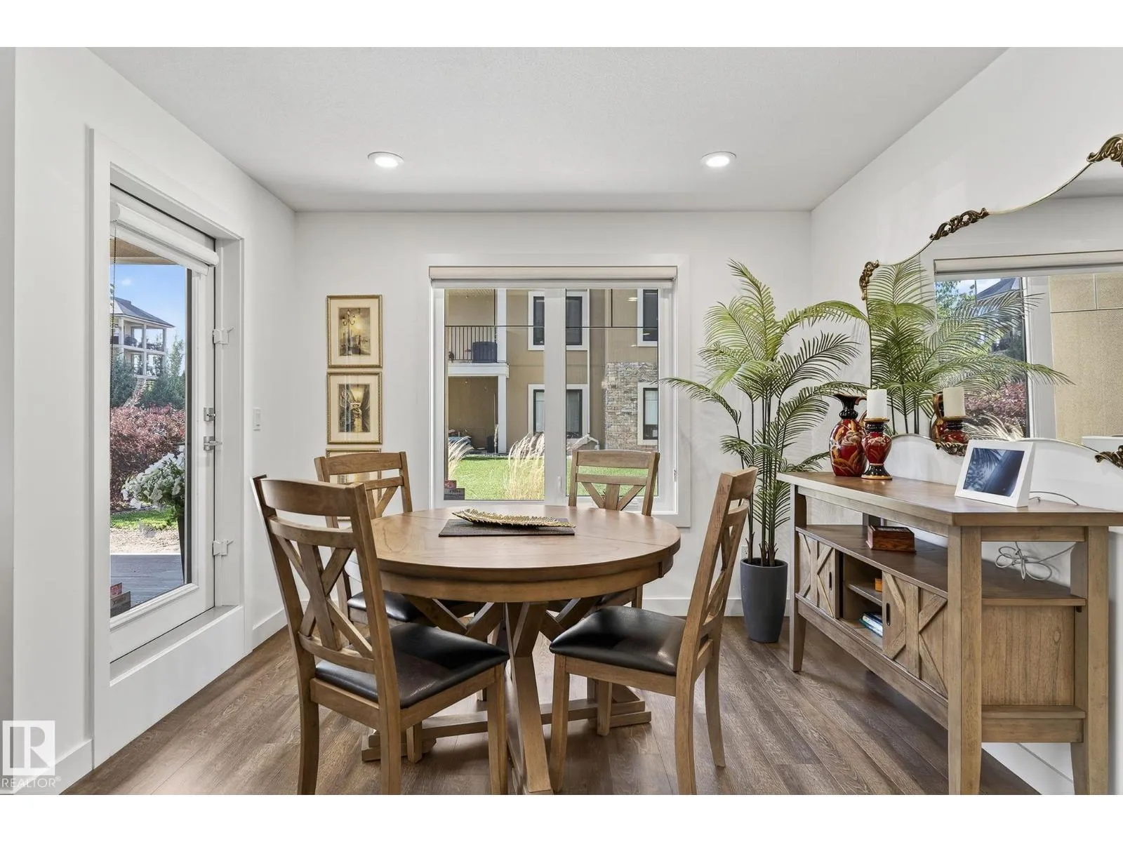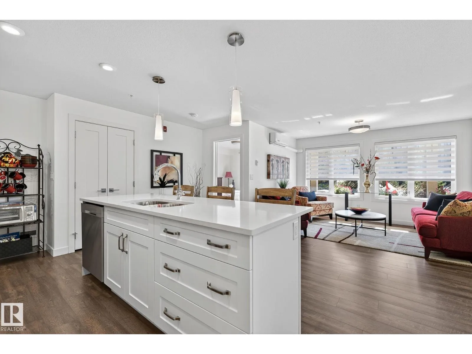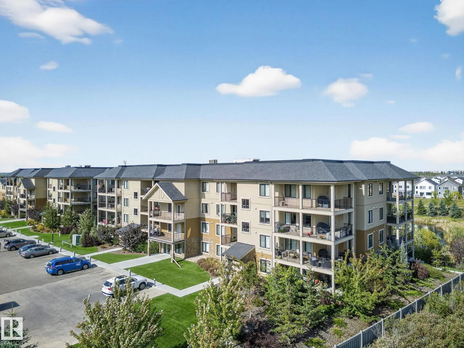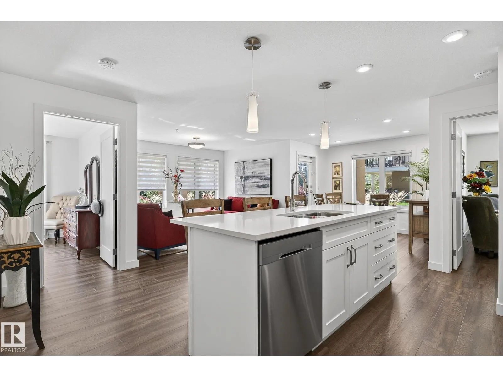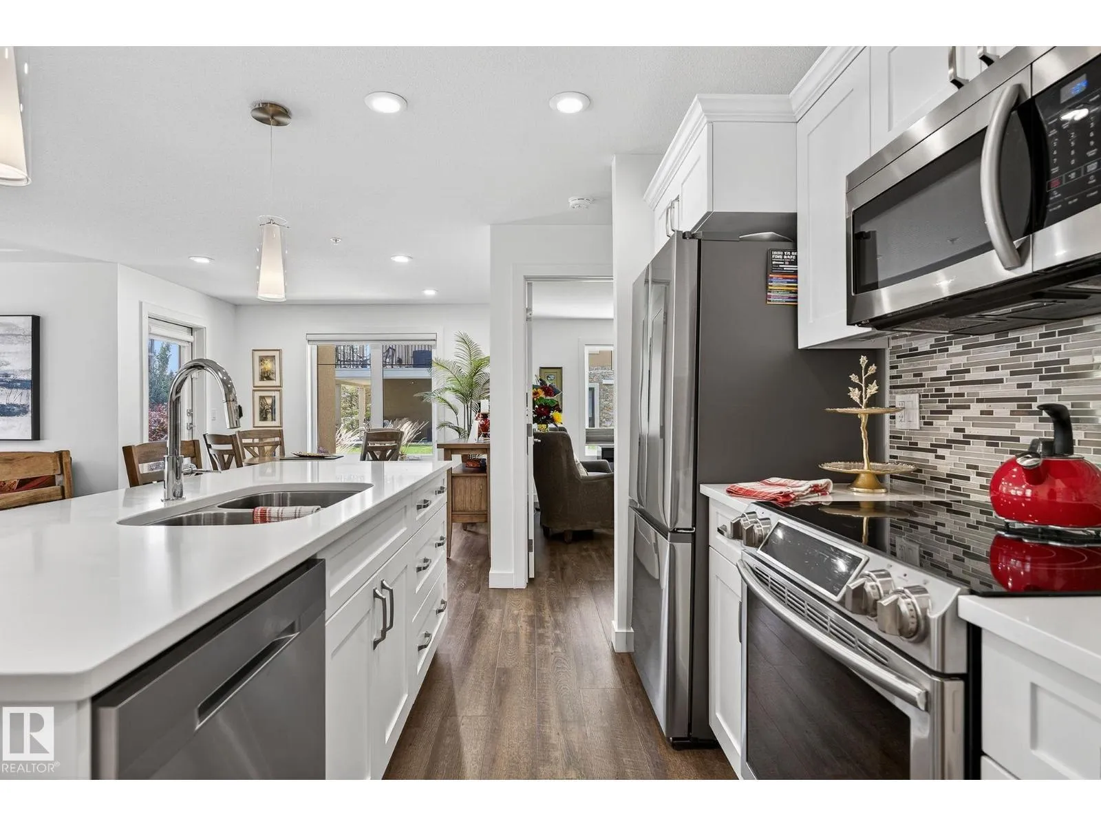 Welcome to this beautifully appointed main floor unit in a well-managed, 18+ condominium complex, offering peaceful pond views and upscale finishes throughout. Step inside to find luxury vinyl plank flooring and cozy in-floor heating. The modern white kitchen features Quartz countertops with large pantry and opens to a bright, spacious living area enhanced by custom window coverings. 2 generously sized bedrooms, 2 full bathrooms, wrap around private corner patio, heated underground parking, and a titled storage unit located on the 4th floor, this home checks all the boxes. Ideally located just steps from Movati Athletic, airport, Windermere golf course, Currents shopping, restaurants, and all other amenities, this is low-maintenance living at its finest! (id:27476)