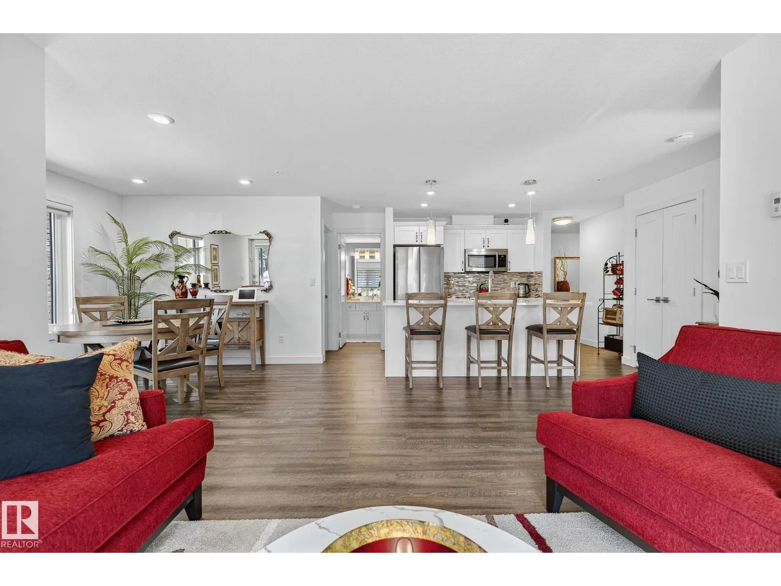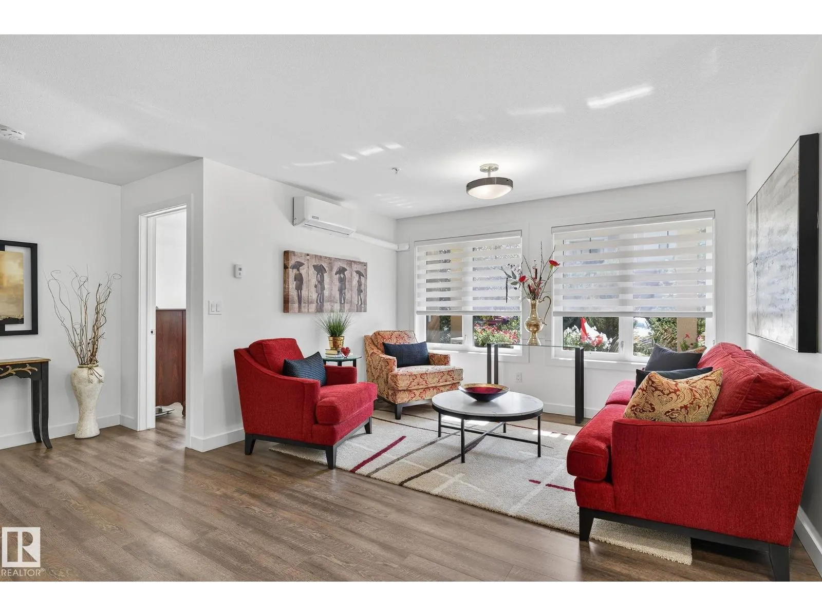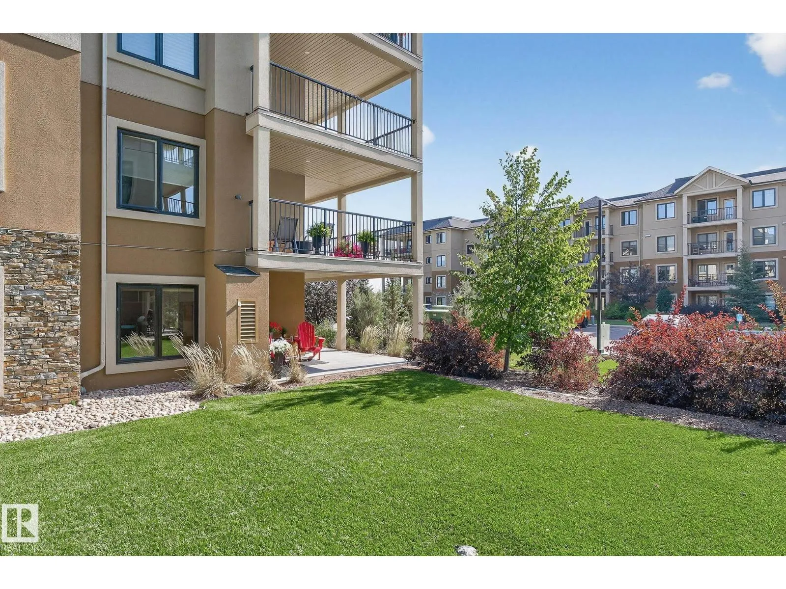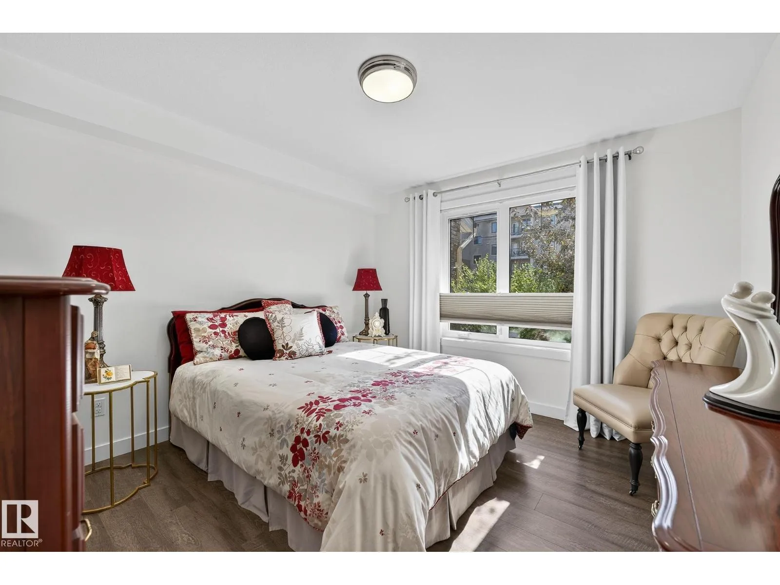 Welcome to this beautifully appointed main floor unit in a well-managed, 18+ condominium complex, offering peaceful pond views and upscale finishes throughout. Step inside to find luxury vinyl plank flooring and cozy in-floor heating. The modern white kitchen features Quartz countertops with large pantry and opens to a bright, spacious living area enhanced by custom window coverings. 2 generously sized bedrooms, 2 full bathrooms, wrap around private corner patio, heated underground parking, and a titled storage unit located on the 4th floor, this home checks all the boxes. Ideally located just steps from Movati Athletic, airport, Windermere golf course, Currents shopping, restaurants, and all other amenities, this is low-maintenance living at its finest! (id:27476)