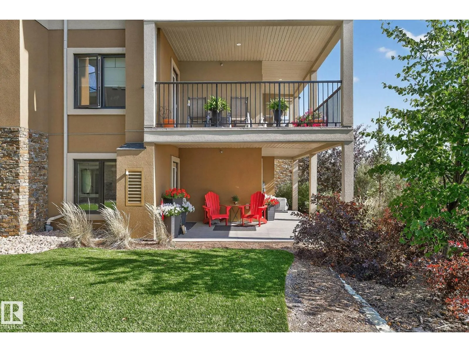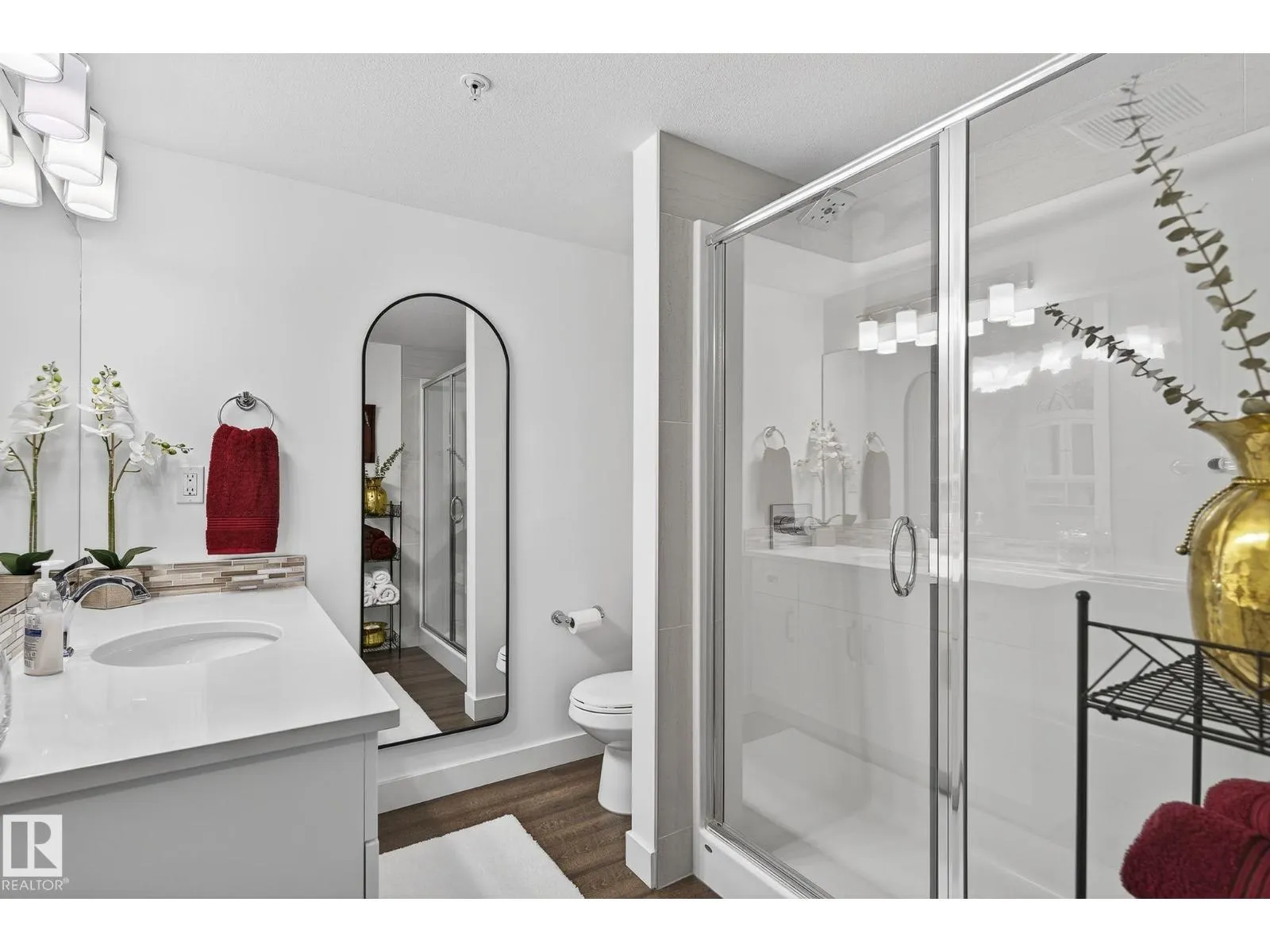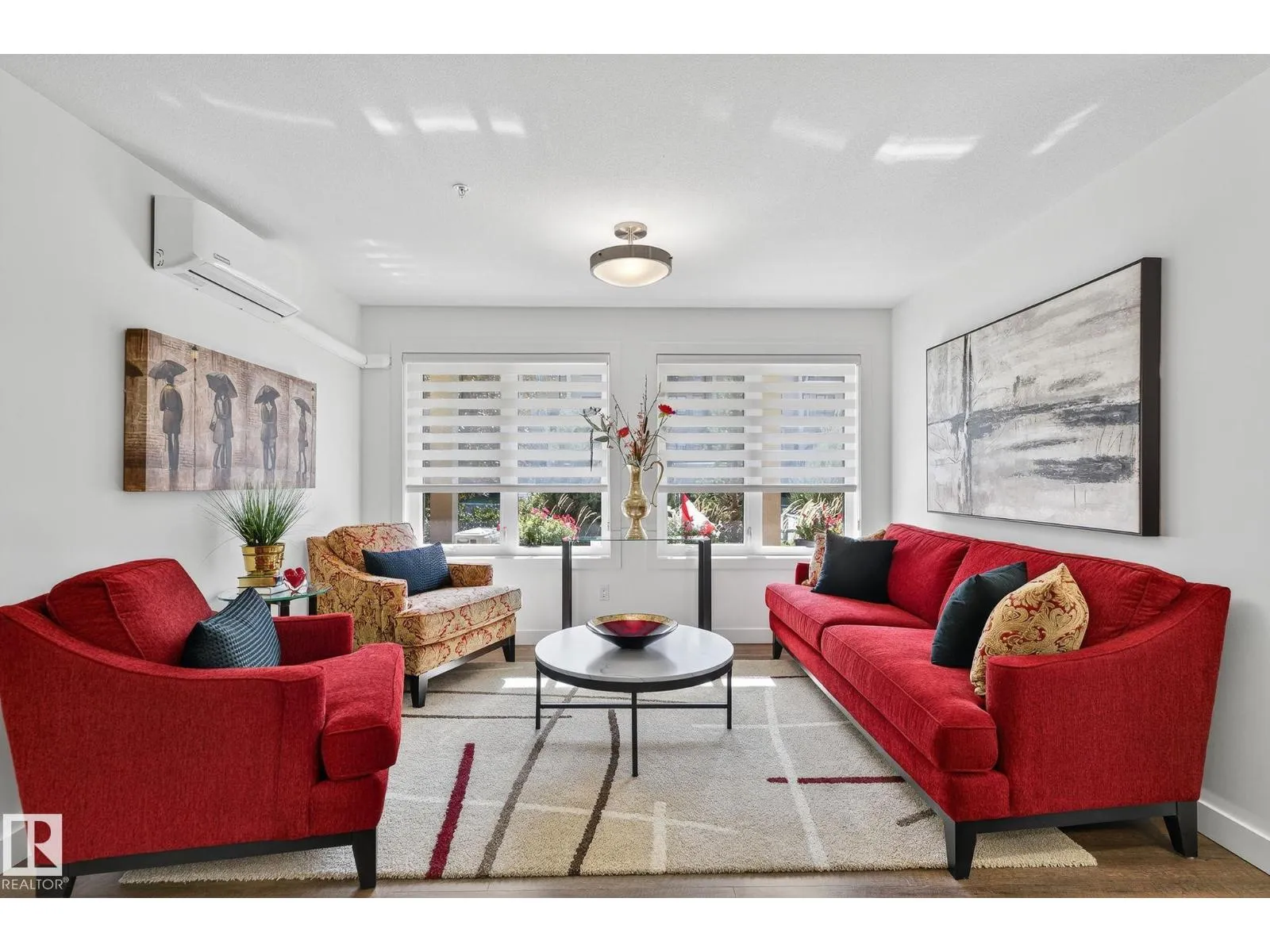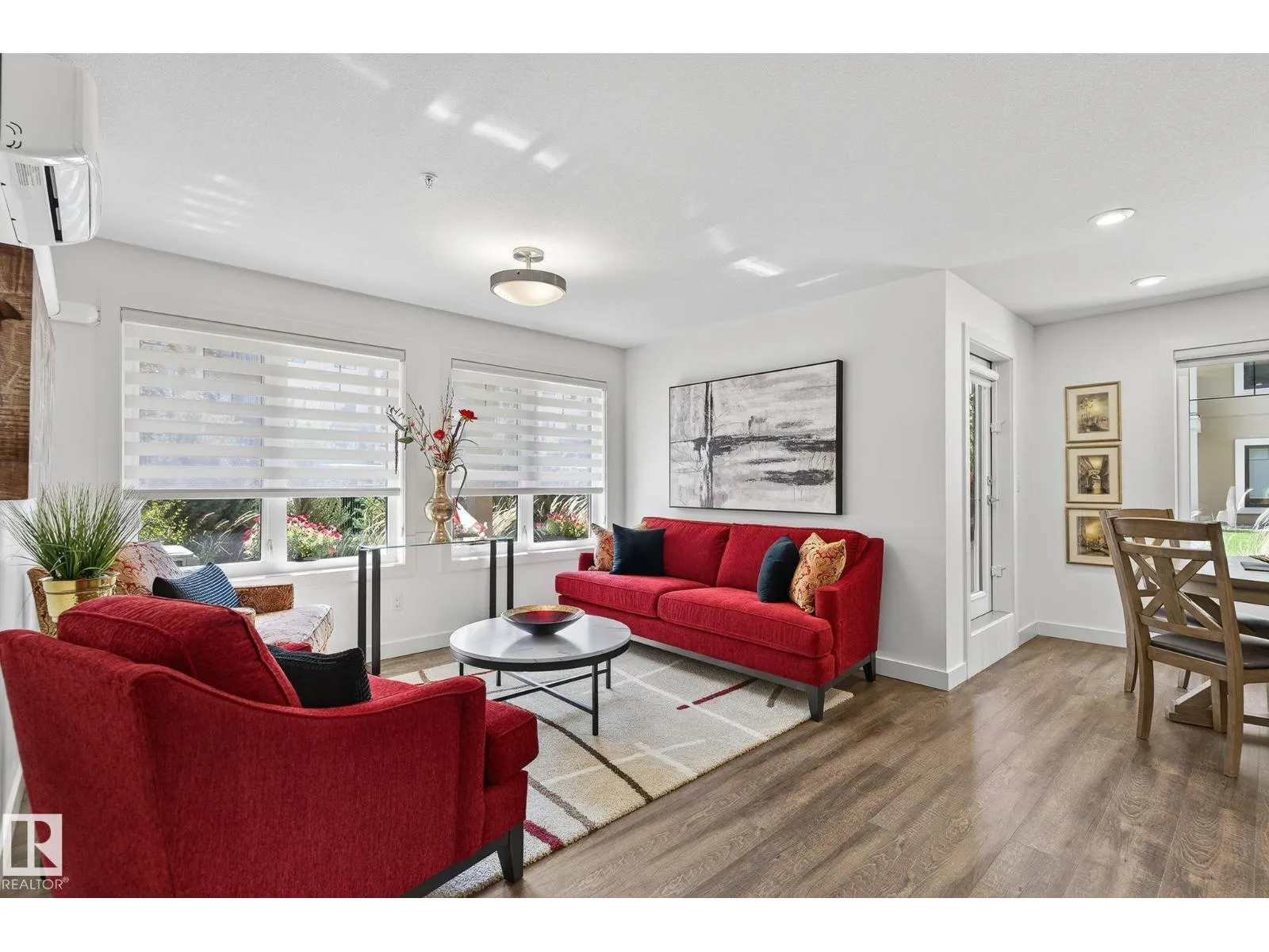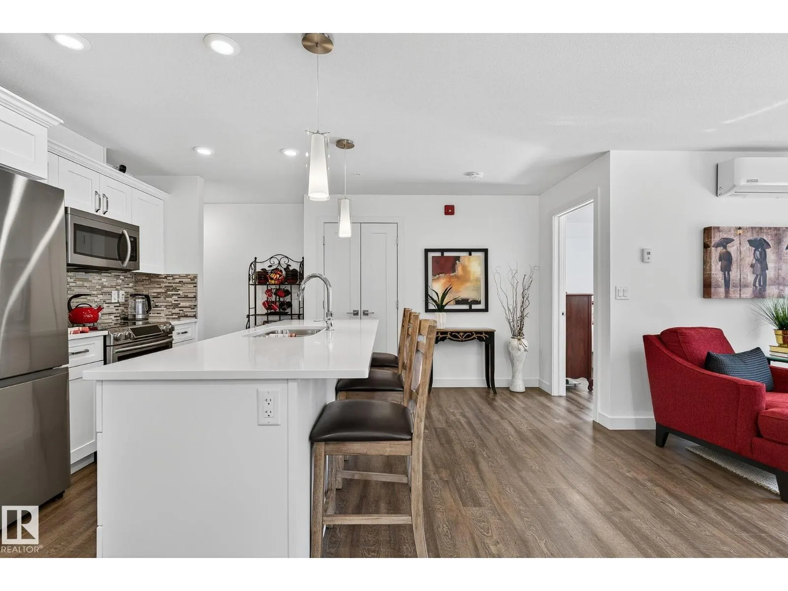 Welcome to this beautifully appointed main floor unit in a well-managed, 18+ condominium complex, offering peaceful pond views and upscale finishes throughout. Step inside to find luxury vinyl plank flooring and cozy in-floor heating. The modern white kitchen features Quartz countertops with large pantry and opens to a bright, spacious living area enhanced by custom window coverings. 2 generously sized bedrooms, 2 full bathrooms, wrap around private corner patio, heated underground parking, and a titled storage unit located on the 4th floor, this home checks all the boxes. Ideally located just steps from Movati Athletic, airport, Windermere golf course, Currents shopping, restaurants, and all other amenities, this is low-maintenance living at its finest! (id:27476)