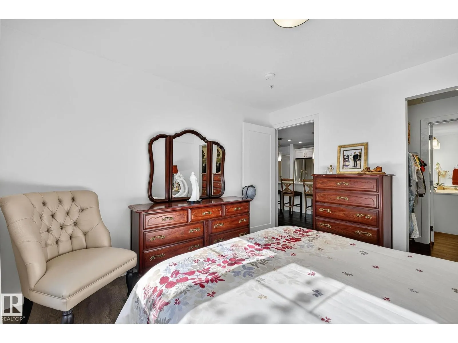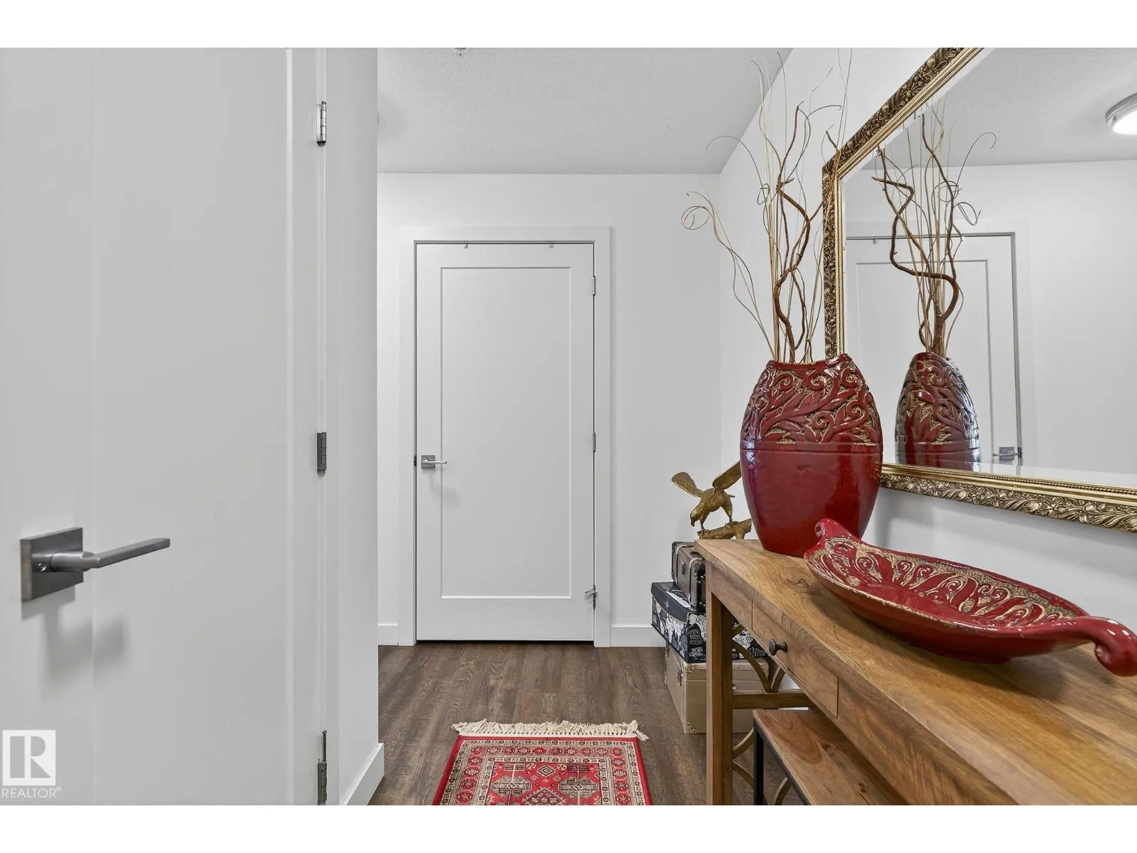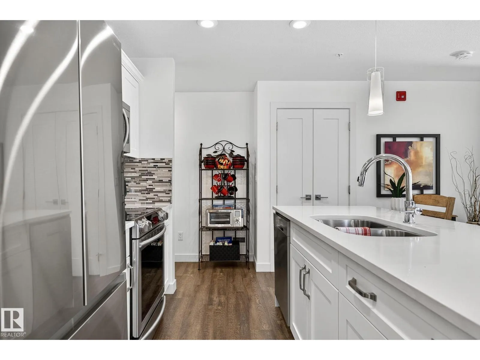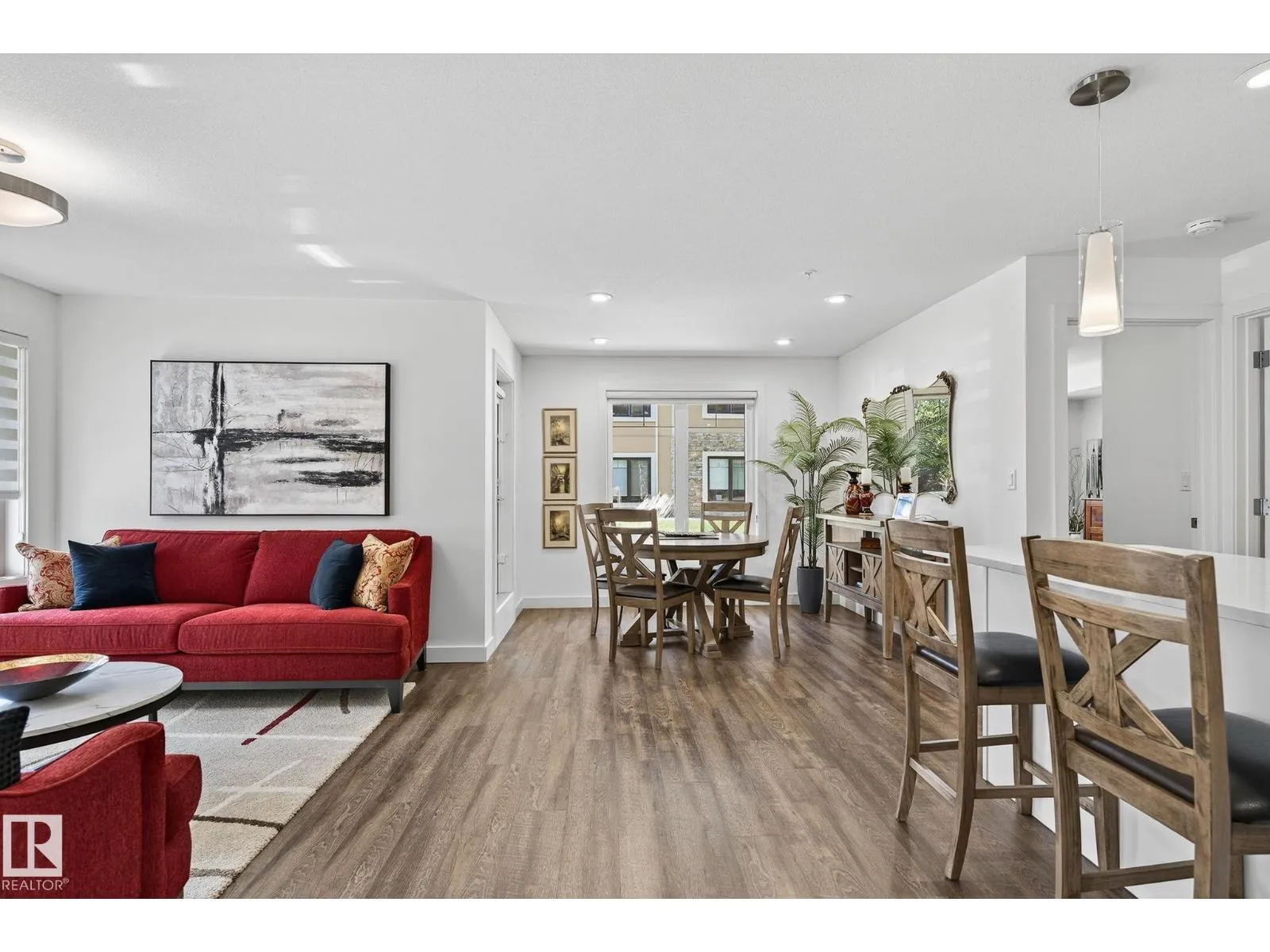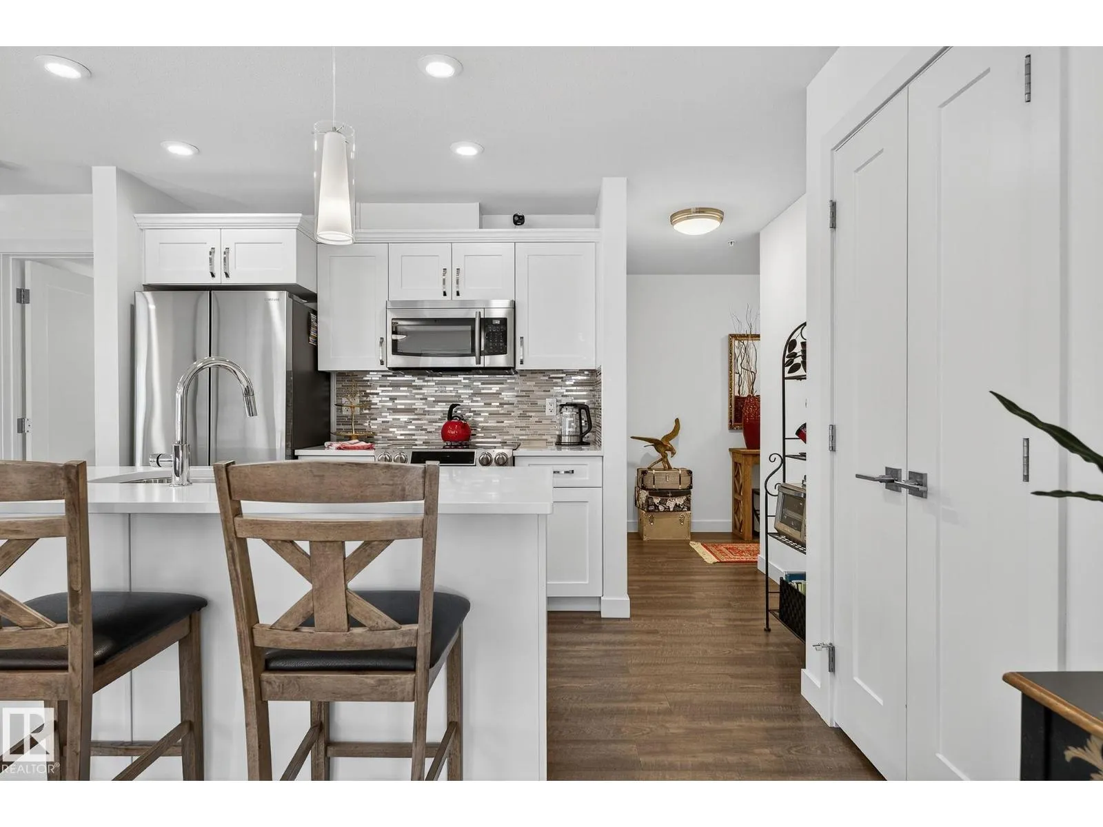 Welcome to this beautifully appointed main floor unit in a well-managed, 18+ condominium complex, offering peaceful pond views and upscale finishes throughout. Step inside to find luxury vinyl plank flooring and cozy in-floor heating. The modern white kitchen features Quartz countertops with large pantry and opens to a bright, spacious living area enhanced by custom window coverings. 2 generously sized bedrooms, 2 full bathrooms, wrap around private corner patio, heated underground parking, and a titled storage unit located on the 4th floor, this home checks all the boxes. Ideally located just steps from Movati Athletic, airport, Windermere golf course, Currents shopping, restaurants, and all other amenities, this is low-maintenance living at its finest! (id:27476)