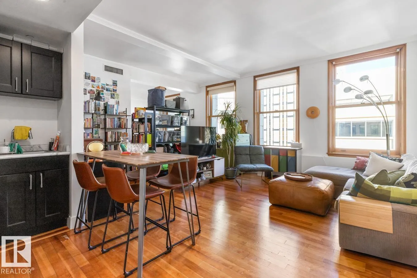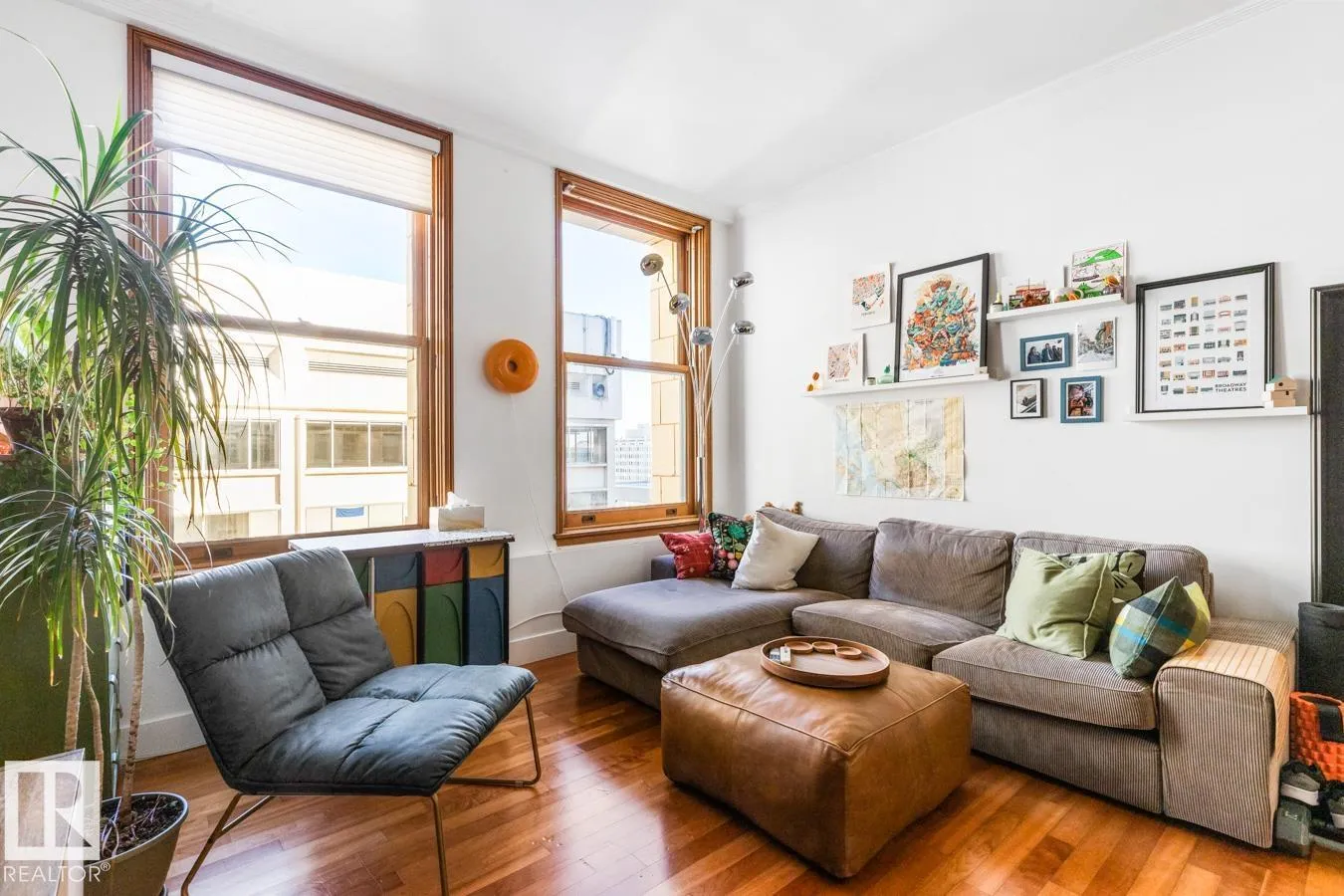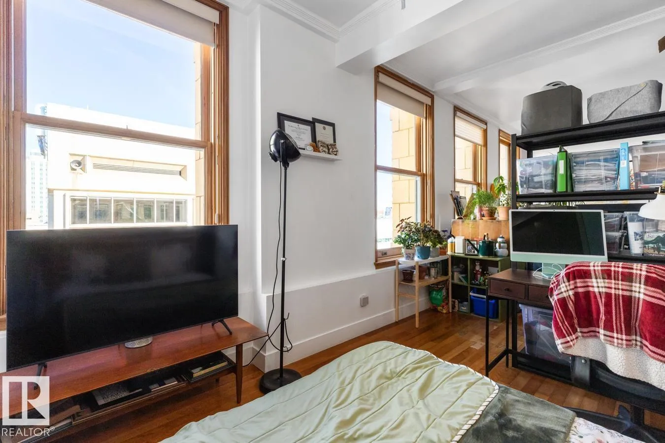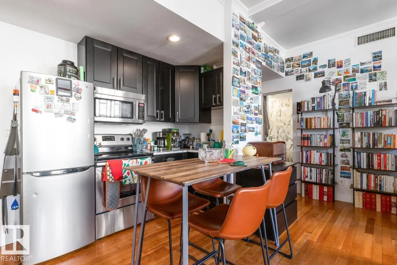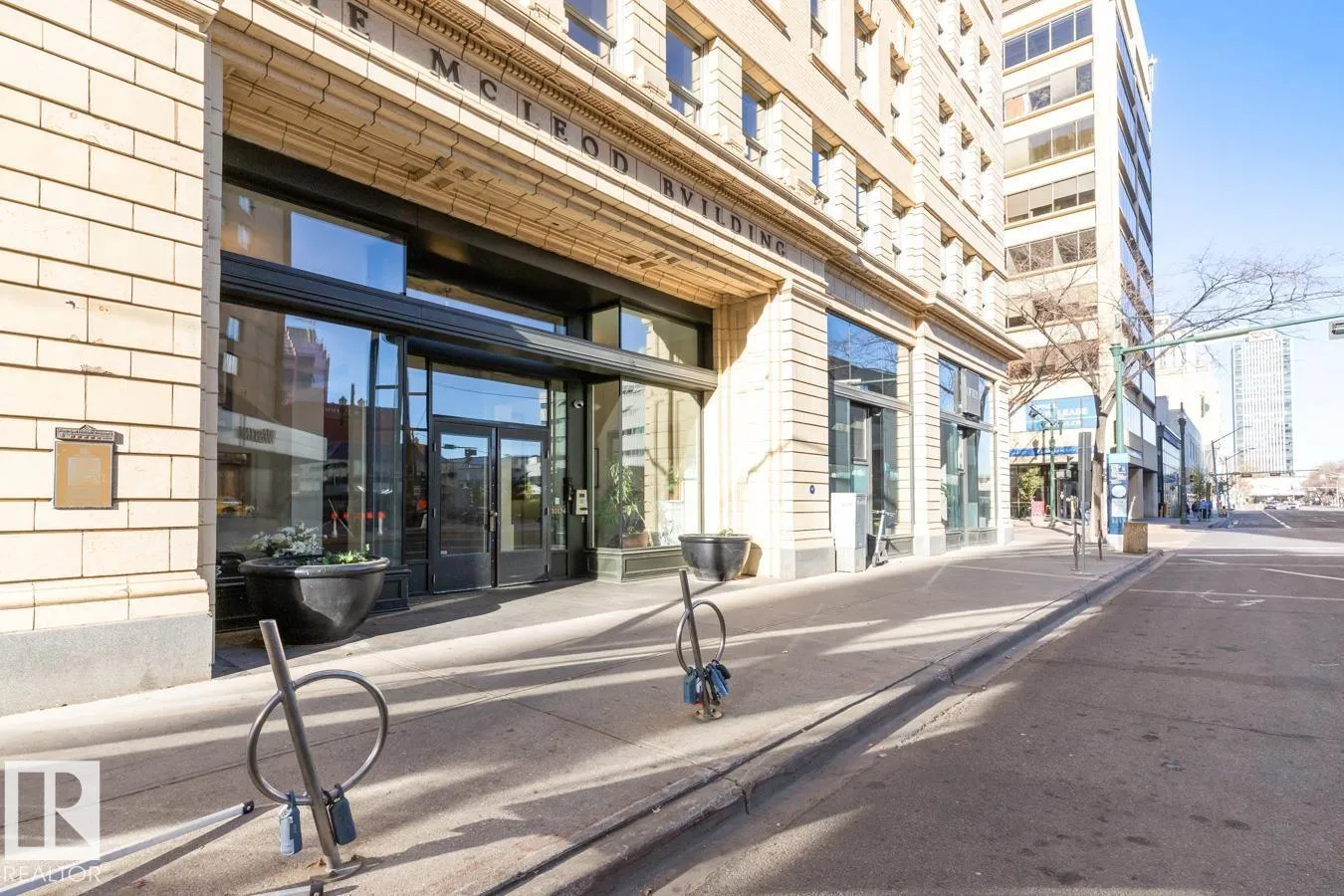 Fabulous top floor loft in the Stunning McLeod Building! Located in the heart of Downtown surrounded by wonderful restaurants, shopping, the Stanley A. Milner library, walking distance to Rogers Place, Sir Winston Churchill Square, the Art Gallery of Alberta plus easy access to public transportation and LRT. The open style floor plan offers beautiful finishes throughout including solid hardwood floors, crown moulding, and a modern style kitchen with stainless steel appliances. The living room and sleeping area are just the right size with large windows allowing for loads of natural light. This well maintained building has a convenient laundry facility and bike storage area. The original lobby has elegant finishes including marble throughout. A great opportunity as a primary or rental residence! (id:27476)